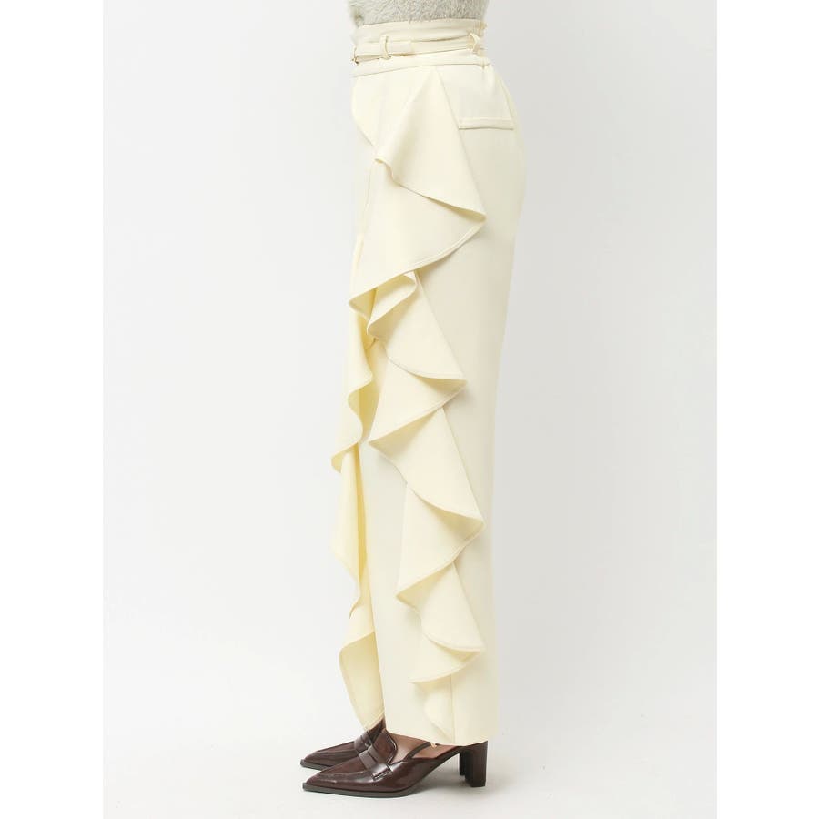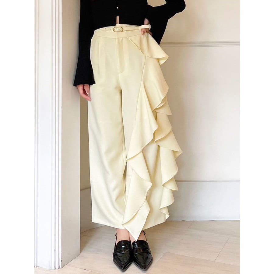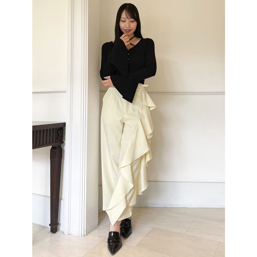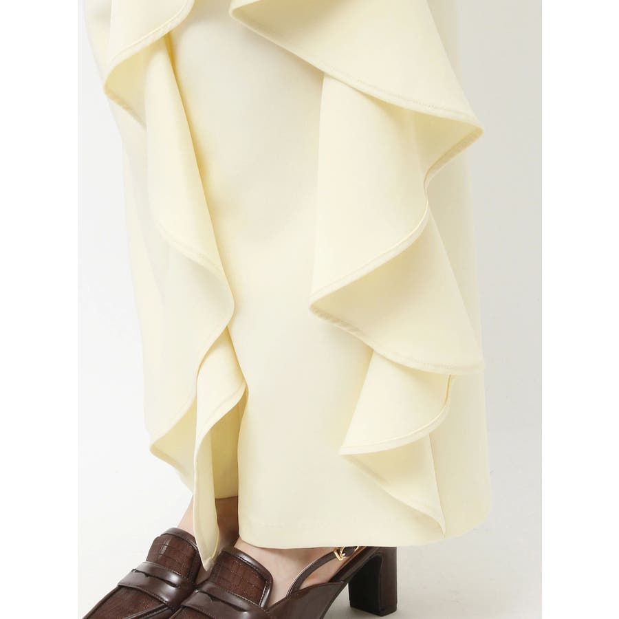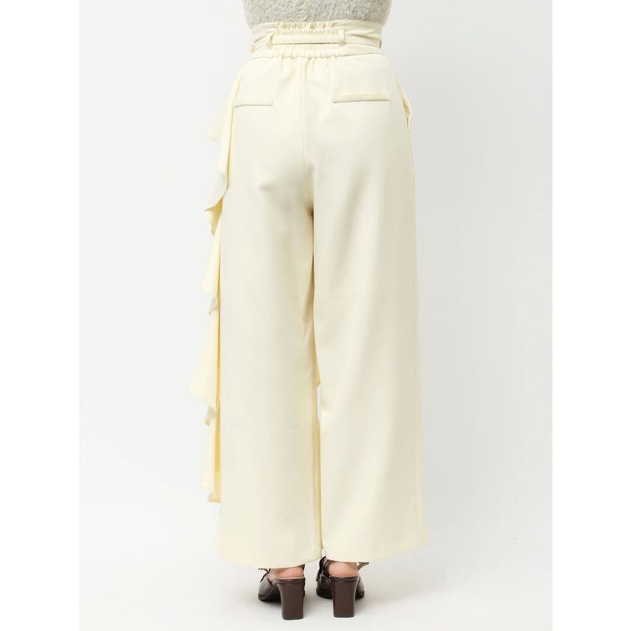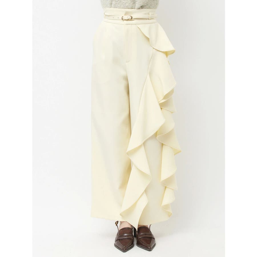【商品】大き目のフリルが躍動感を呼ぶワイドボトムス。腰から大き目のフリルを入れ込んでおり動く度にダイナミックなシルエットがポイント。さらっとした生地感でフェミニンなスタイルのワンポイントにお勧めです。【スタイリング】リボンブラウスに合わせてクラシカルな印象に。カーデアンサンブルなどとも相性が良く、素材に不得意がないのがポイントです。