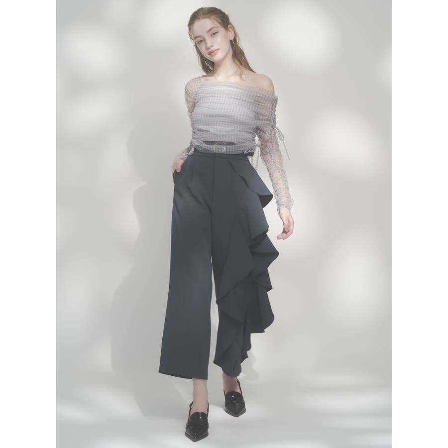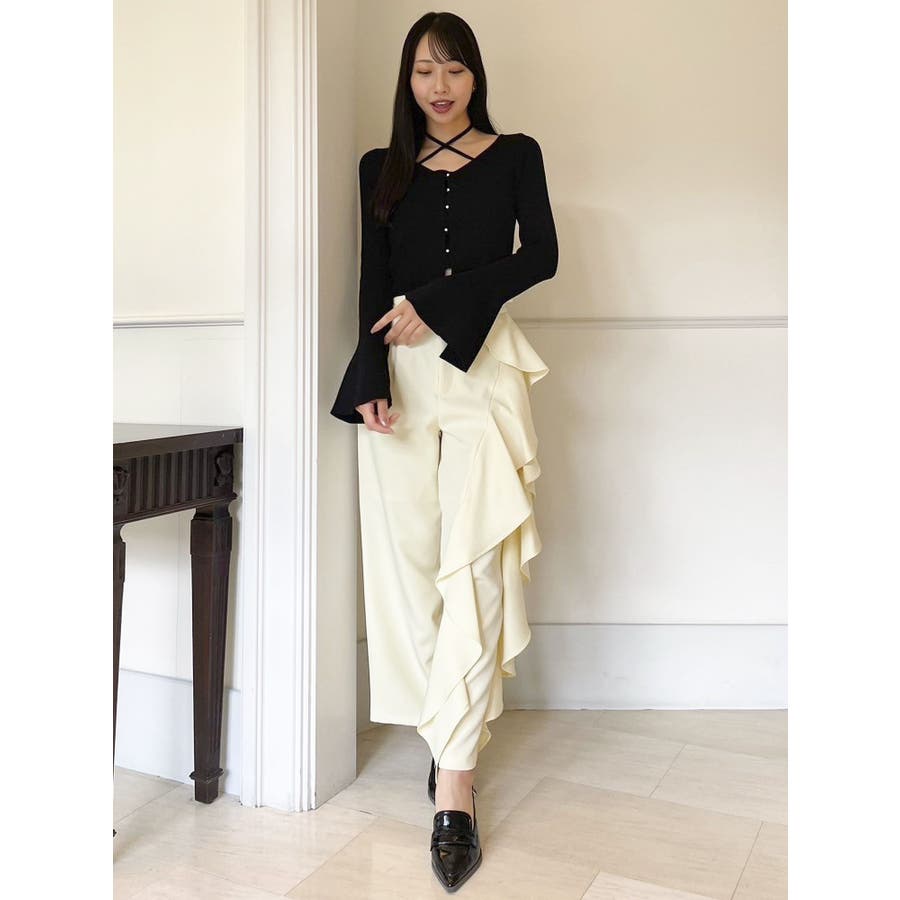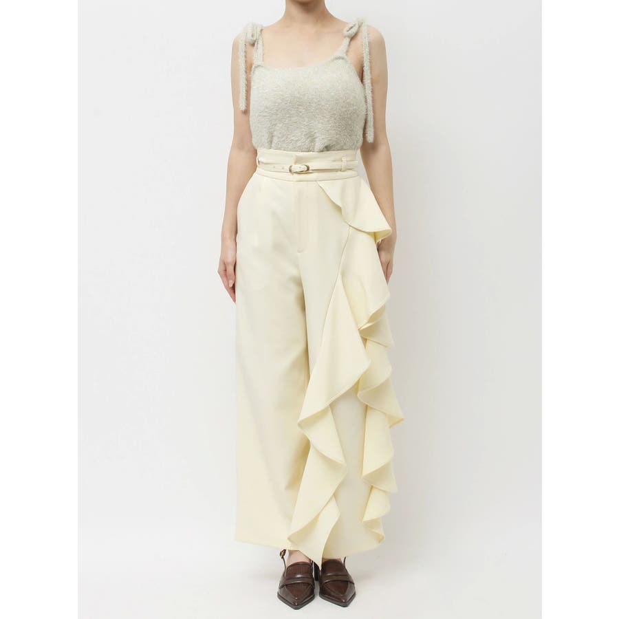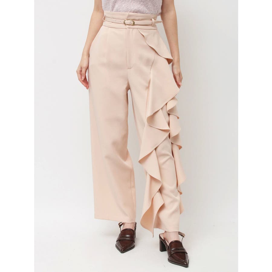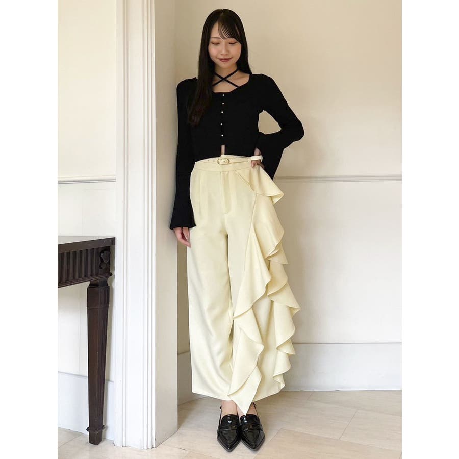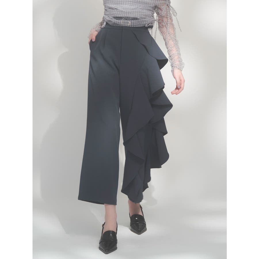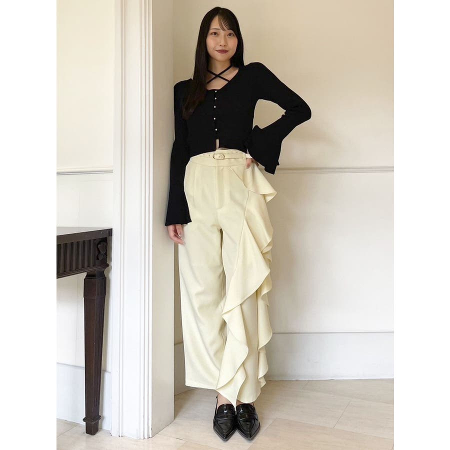 【商品】大き目のフリルが躍動感を呼ぶワイドボトムス。腰から大き目のフリルを入れ込んでおり動く度にダイナミックなシルエットがポイント。さらっとした生地感でフェミニンなスタイルのワンポイントにお勧めです。【スタイリング】リボンブラウスに合わせてクラシカルな印象に。カーデアンサンブルなどとも相性が良く、素材に不得意がないのがポイントです。
