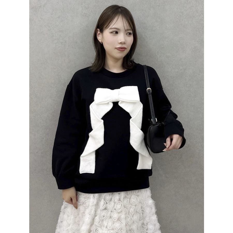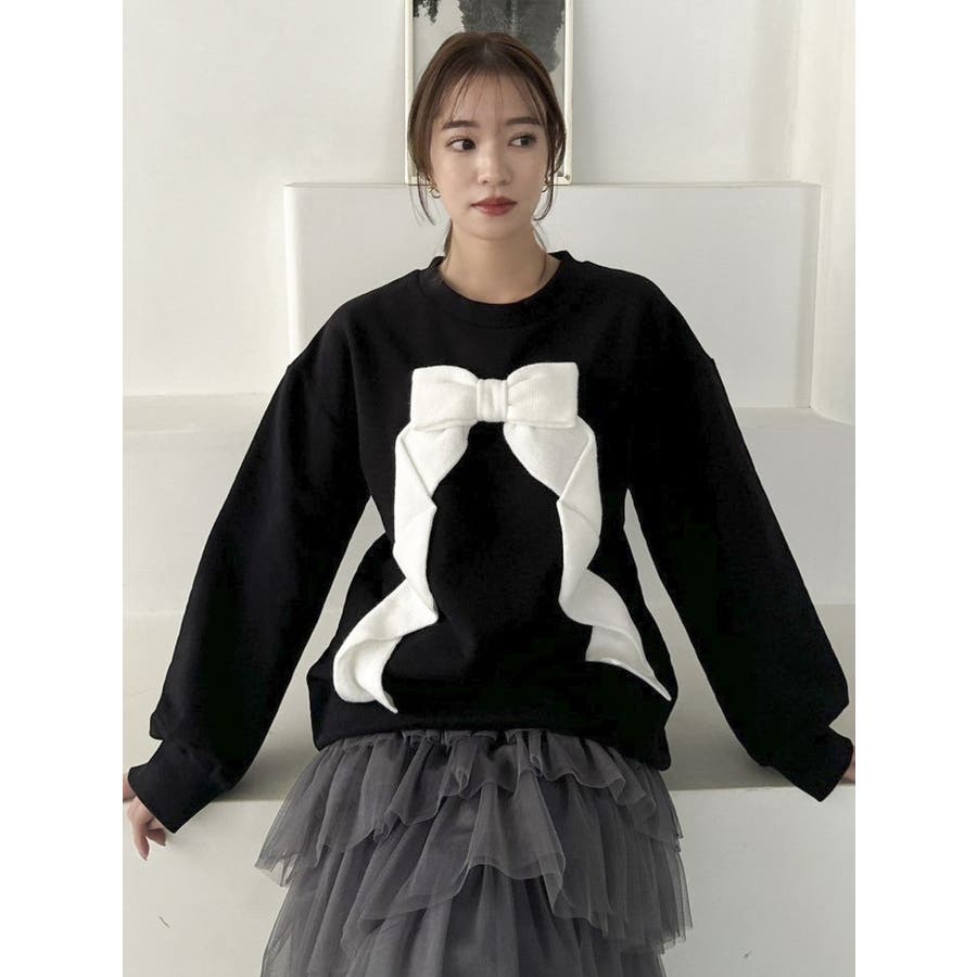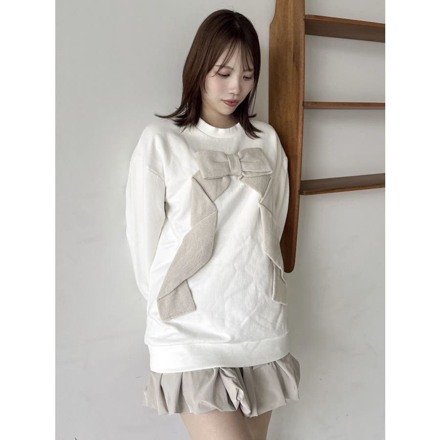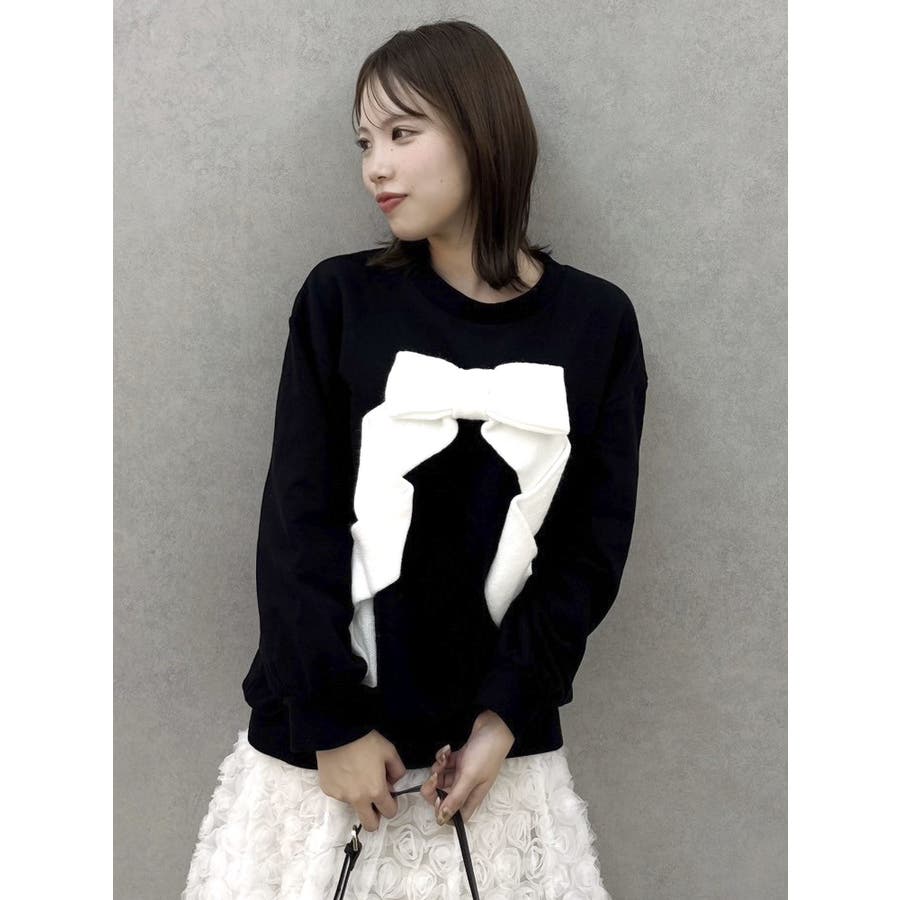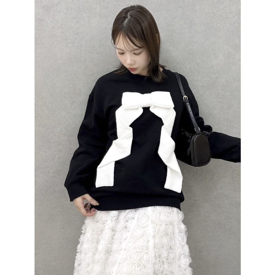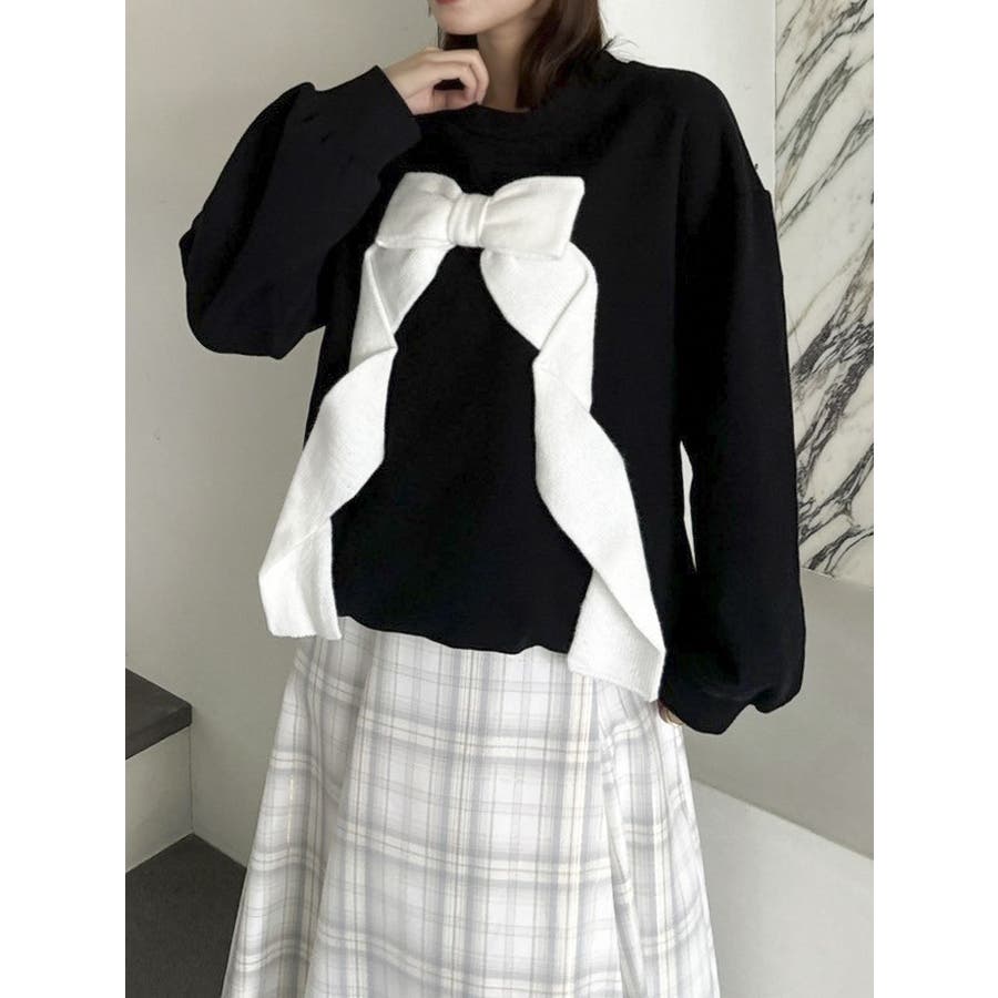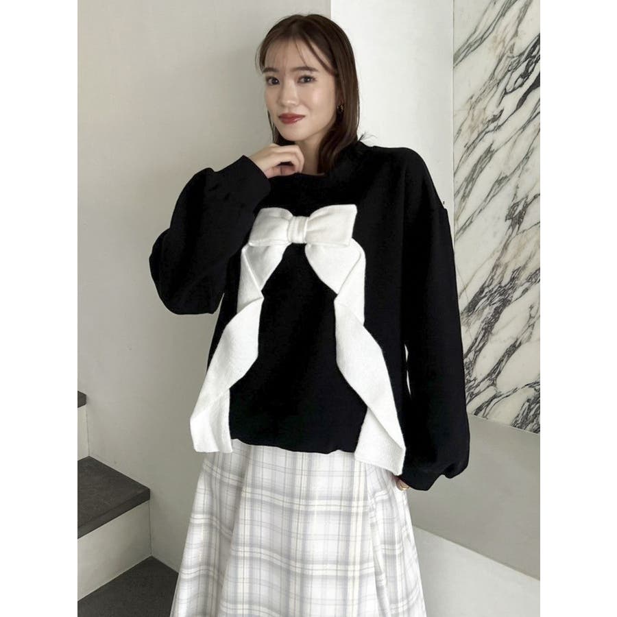 【商品】トレンドのリボンディテールを大胆にニットで表現した遊び心あふれる1枚。ボディは裏起毛のカットソー素材を使用することで、立体感のある構築的なシルエットを実現しながら保温性もプラスさせました。モノトーンなカラバリで大人っぽく韓国ライクな装いに。【スタイリング】ショートボトムスをちらみせさせたスタイリングが今っぽくおすすめ。シャツをレイヤードさせたり、ソックスやタイツを合わせたりすると甘さが抑えられ、プレッピームードなスタイリングにも昇華します。