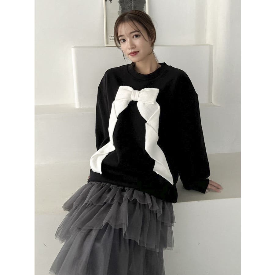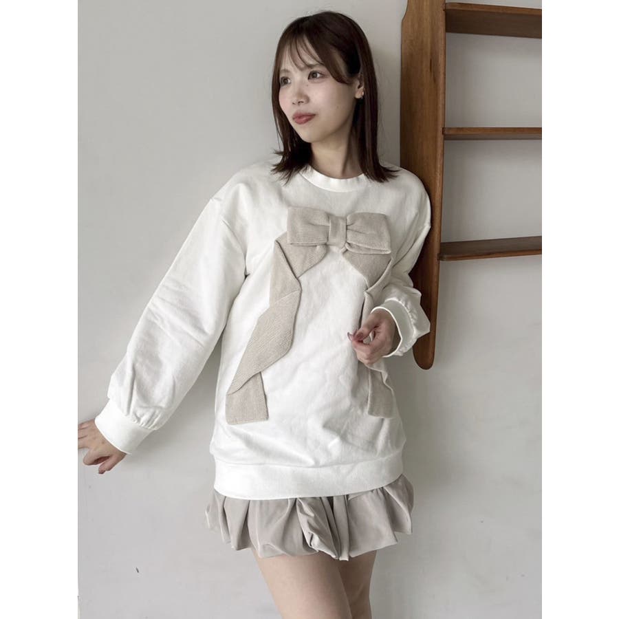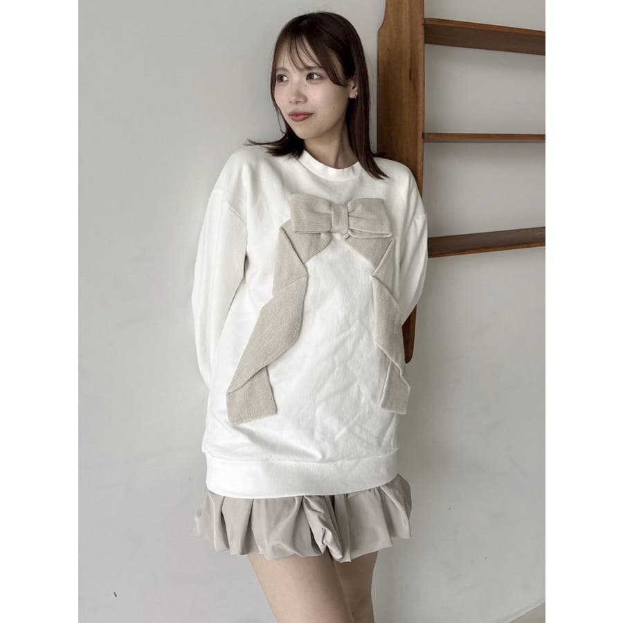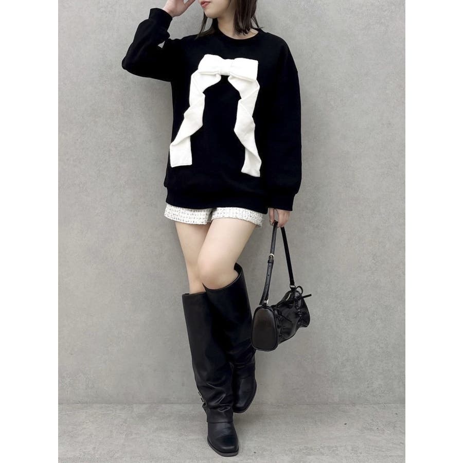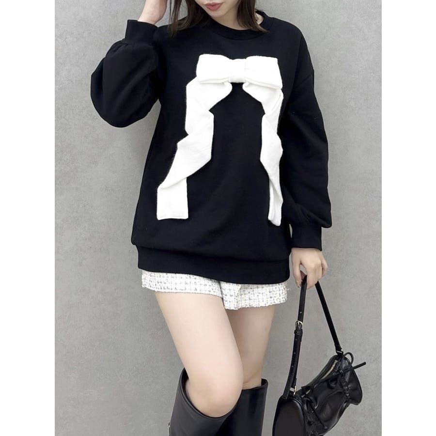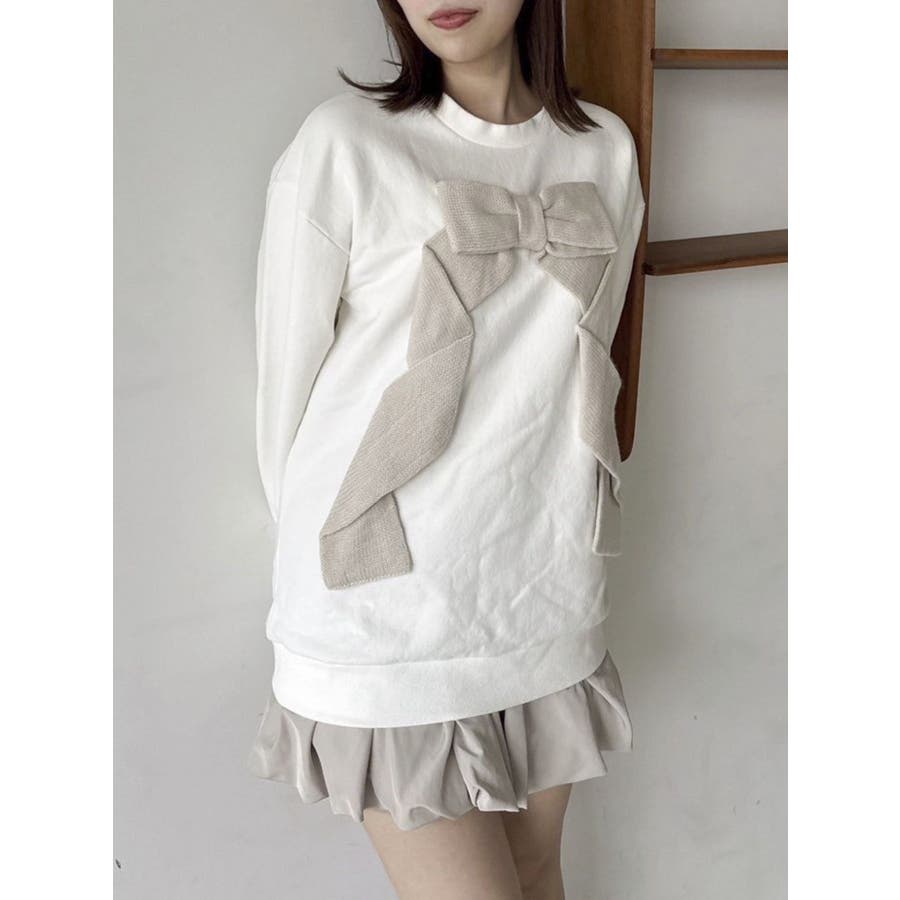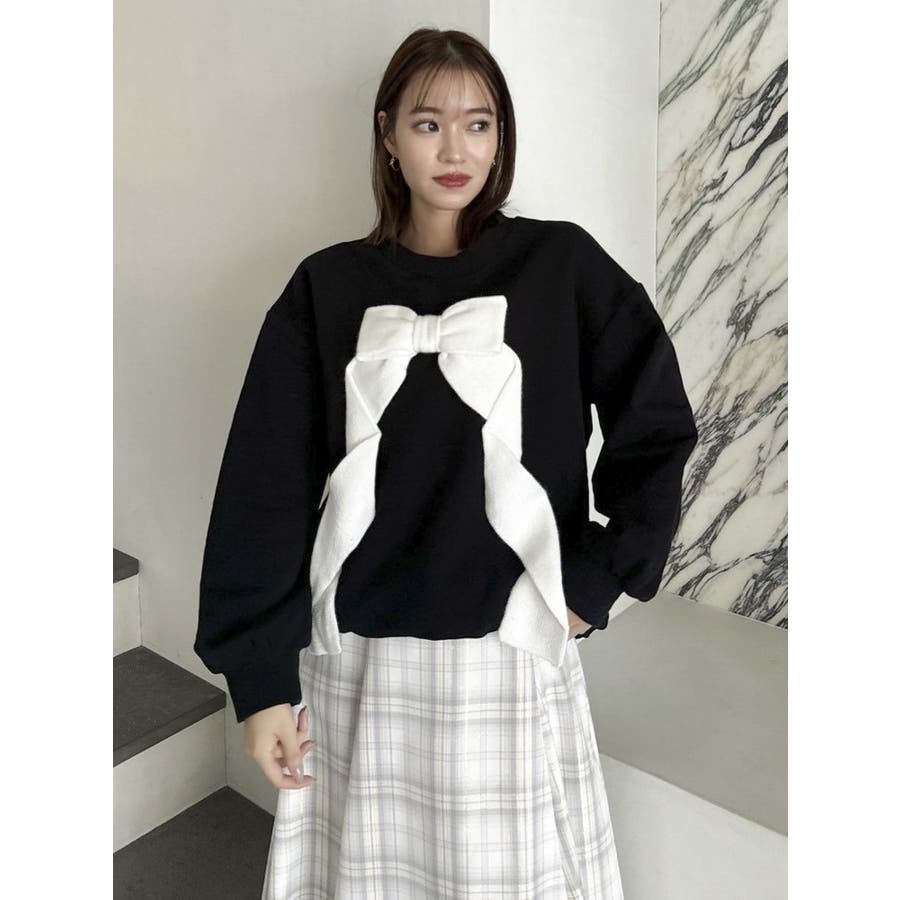 【商品】トレンドのリボンディテールを大胆にニットで表現した遊び心あふれる1枚。ボディは裏起毛のカットソー素材を使用することで、立体感のある構築的なシルエットを実現しながら保温性もプラスさせました。モノトーンなカラバリで大人っぽく韓国ライクな装いに。【スタイリング】ショートボトムスをちらみせさせたスタイリングが今っぽくおすすめ。シャツをレイヤードさせたり、ソックスやタイツを合わせたりすると甘さが抑えられ、プレッピームードなスタイリングにも昇華します。