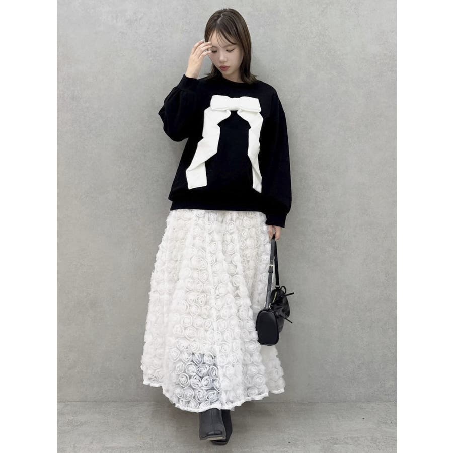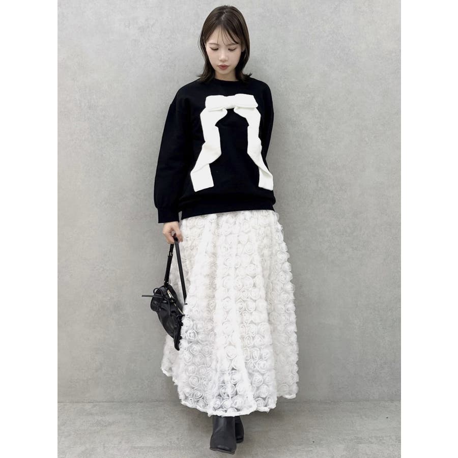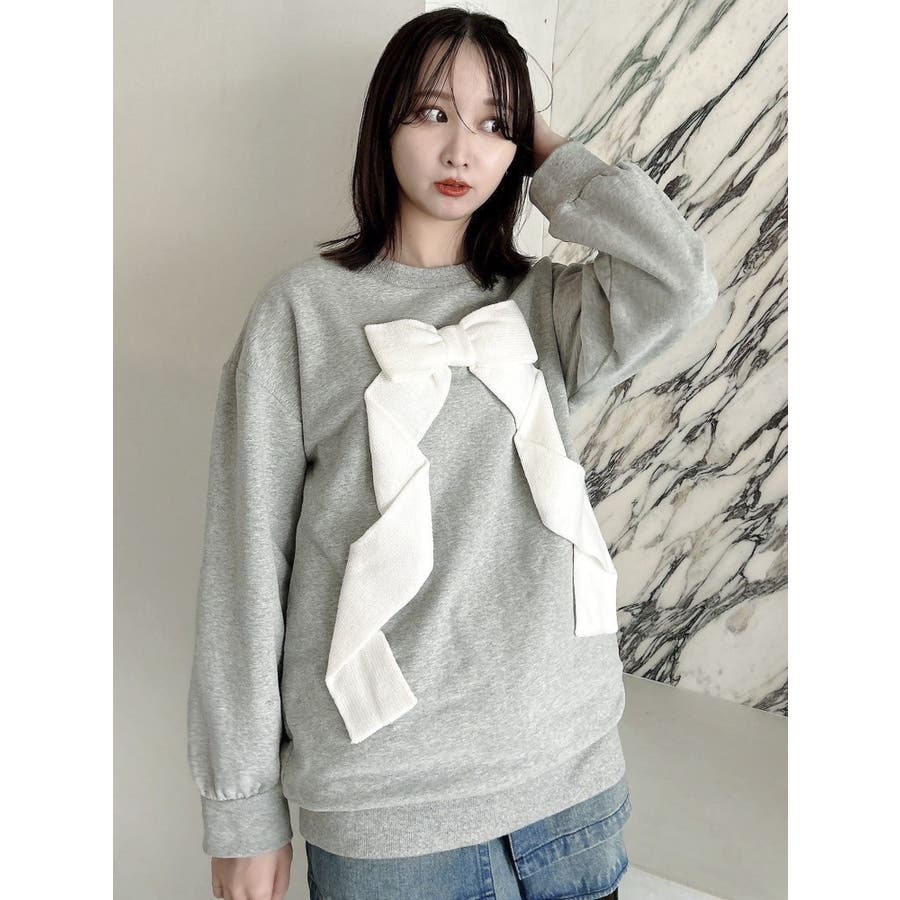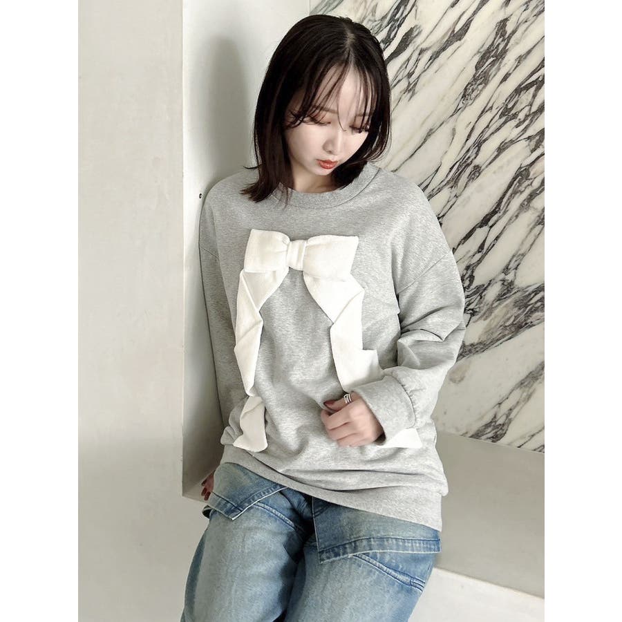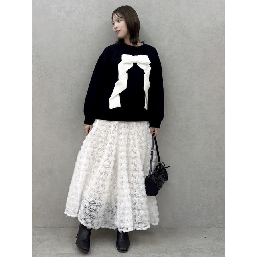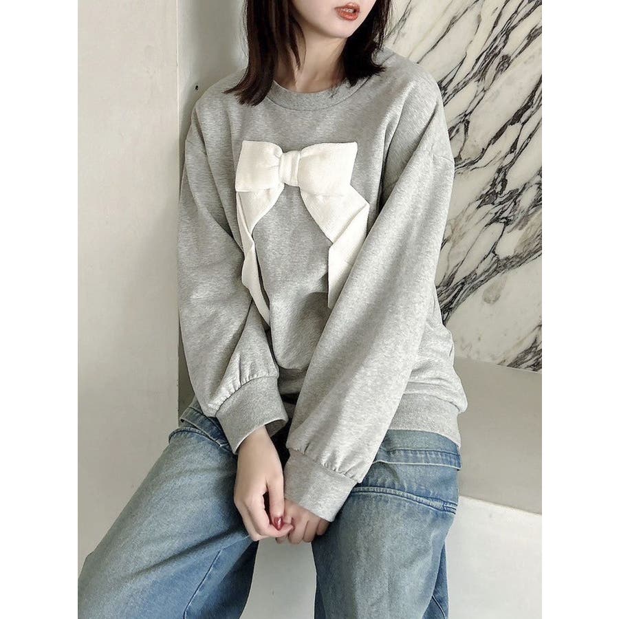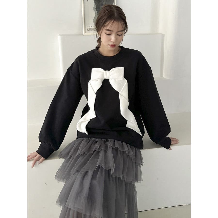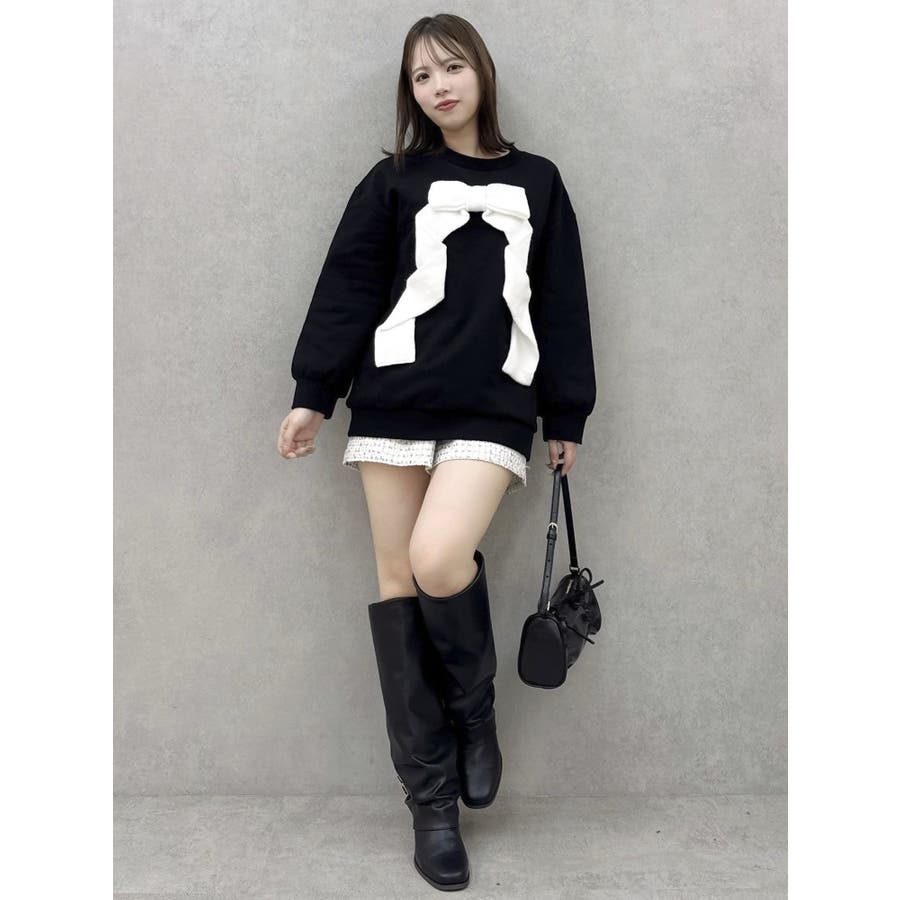 【商品】トレンドのリボンディテールを大胆にニットで表現した遊び心あふれる1枚。ボディは裏起毛のカットソー素材を使用することで、立体感のある構築的なシルエットを実現しながら保温性もプラスさせました。モノトーンなカラバリで大人っぽく韓国ライクな装いに。【スタイリング】ショートボトムスをちらみせさせたスタイリングが今っぽくおすすめ。シャツをレイヤードさせたり、ソックスやタイツを合わせたりすると甘さが抑えられ、プレッピームードなスタイリングにも昇華します。