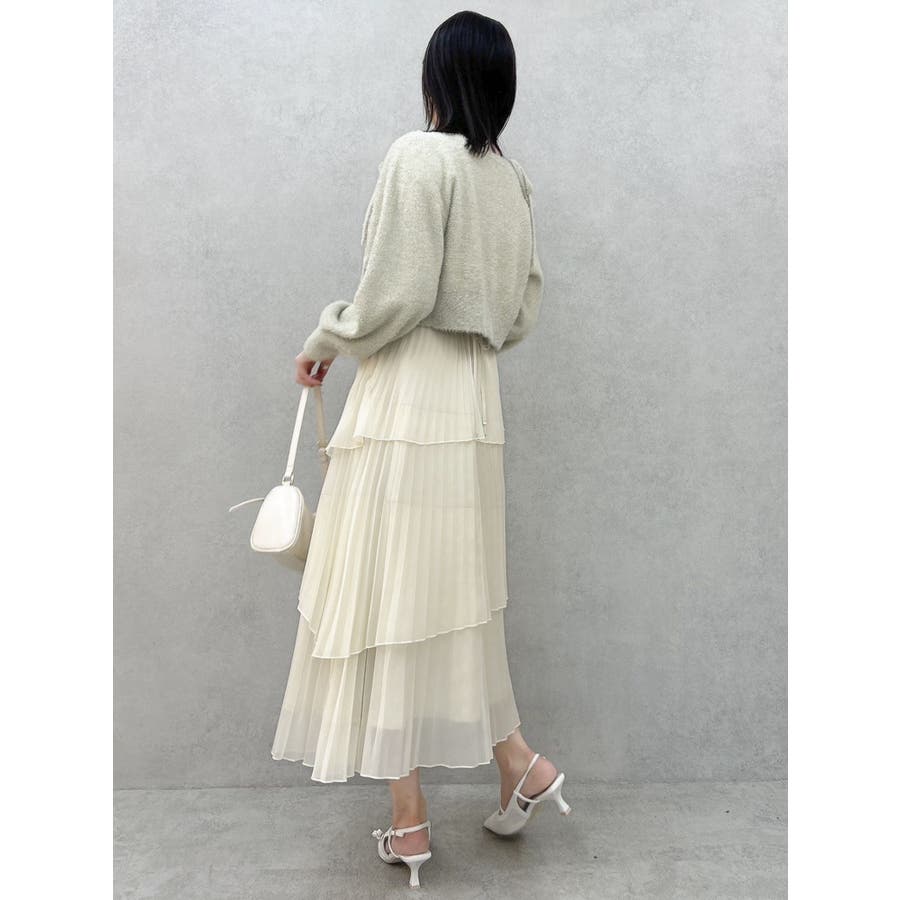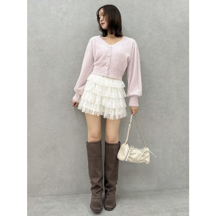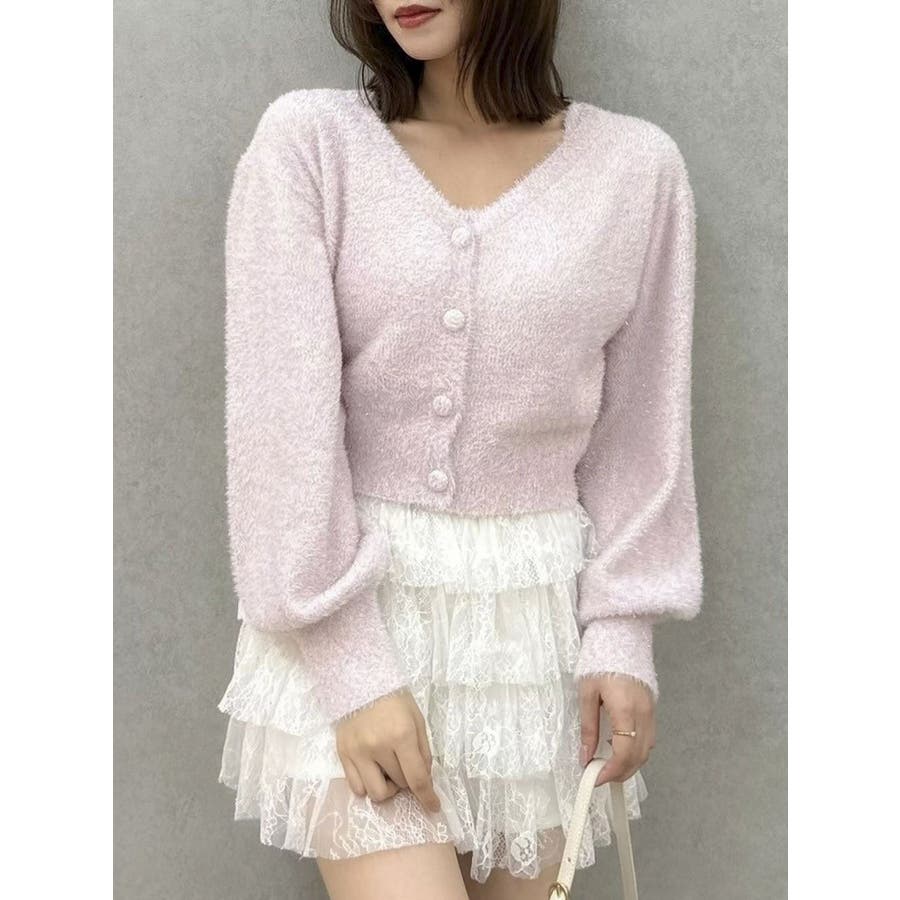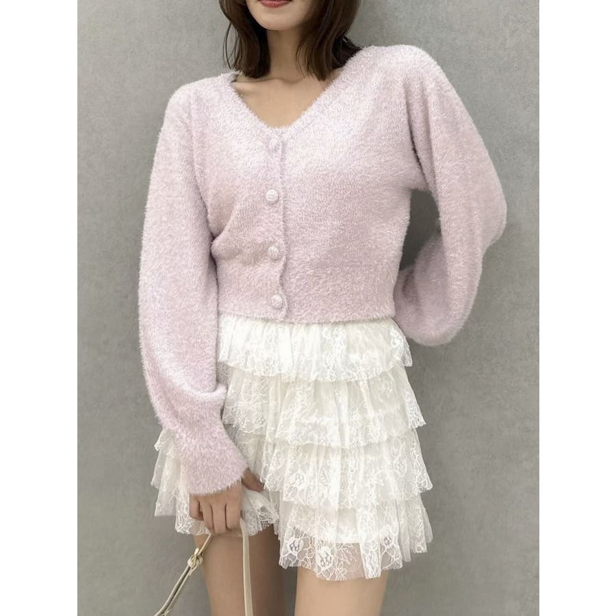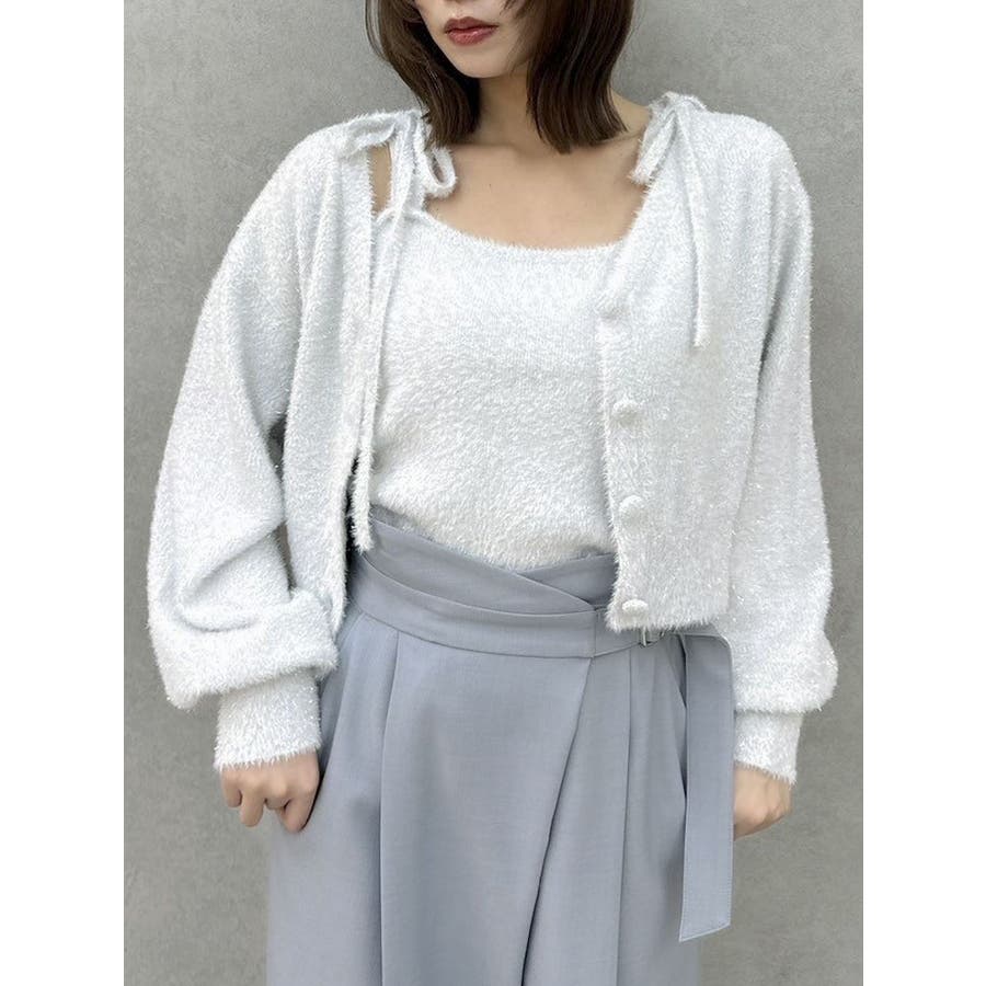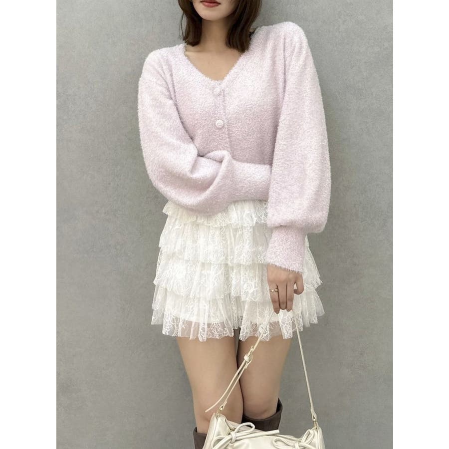 【商品】柔らかな毛足の糸を使ってフェミニンに仕上げ、1枚で主役級の華やかさをプラスします。ショート丈なので、手軽に羽織りやすくしわにもなりづらいので持ち運びにもおすすめ。温かみのある雰囲気を演出します。【スタイリング】同素材キャミで着こなすアンサンブルスタイル合わせがおすすめです。ワンピースに羽織ったりと着方も多彩です。