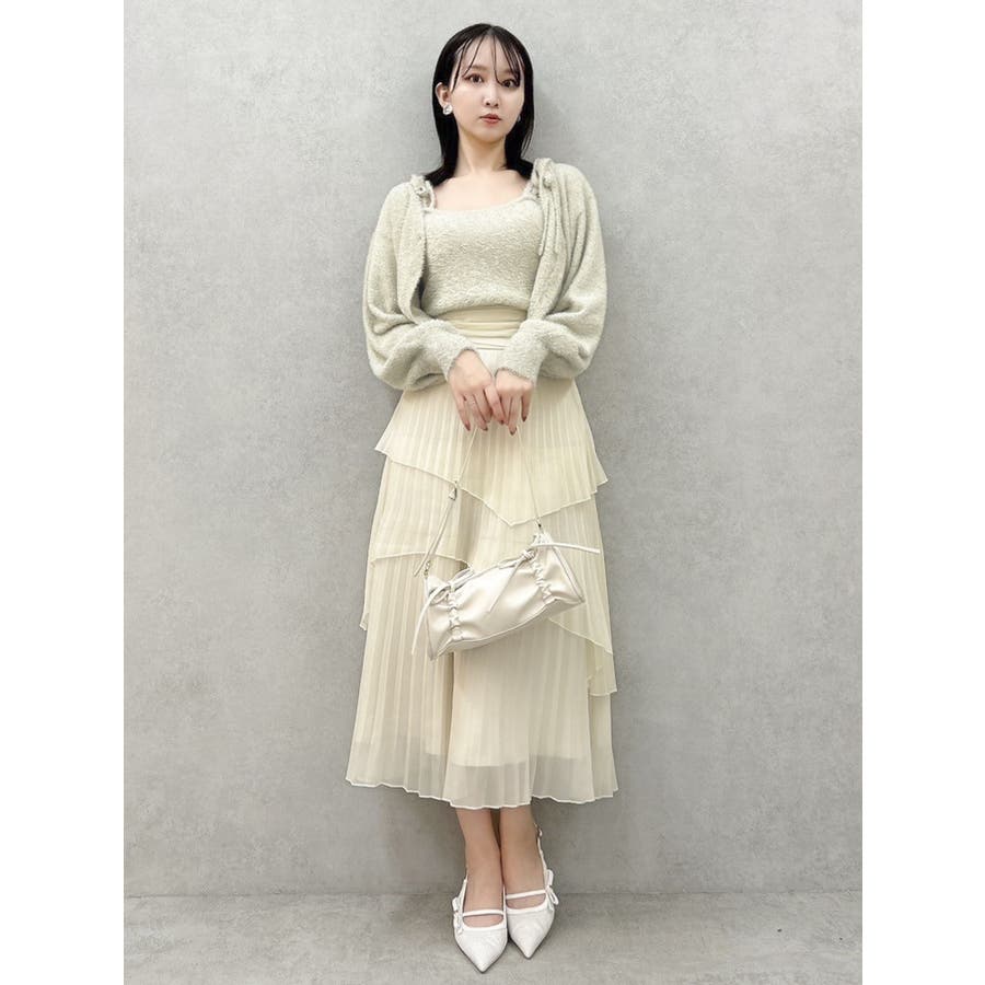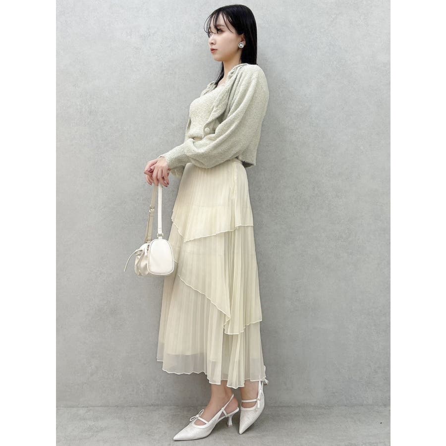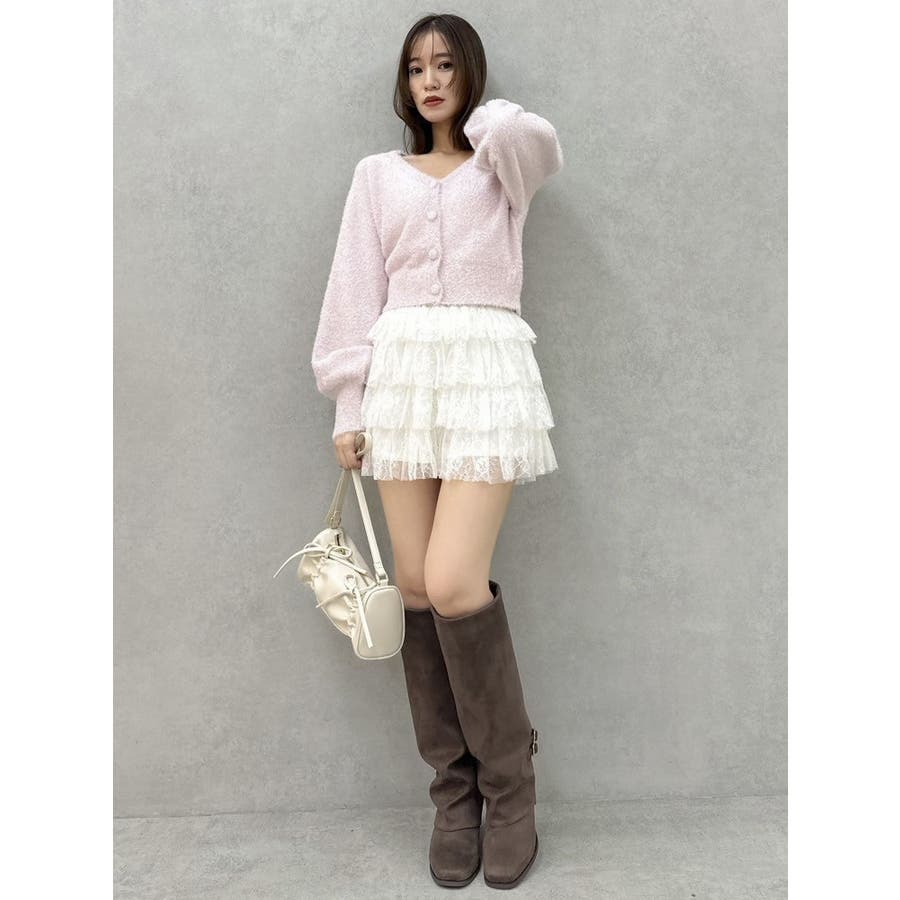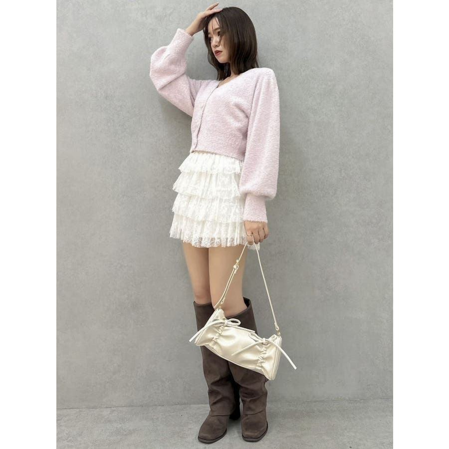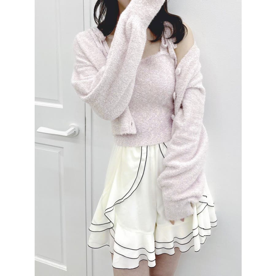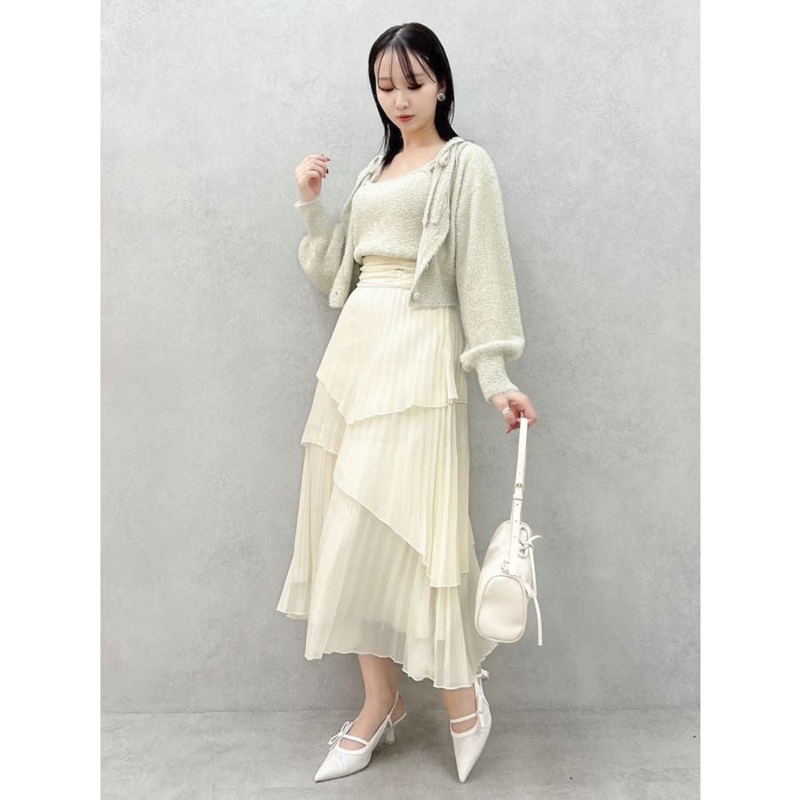 【商品】柔らかな毛足の糸を使ってフェミニンに仕上げ、1枚で主役級の華やかさをプラスします。ショート丈なので、手軽に羽織りやすくしわにもなりづらいので持ち運びにもおすすめ。温かみのある雰囲気を演出します。【スタイリング】同素材キャミで着こなすアンサンブルスタイル合わせがおすすめです。ワンピースに羽織ったりと着方も多彩です。