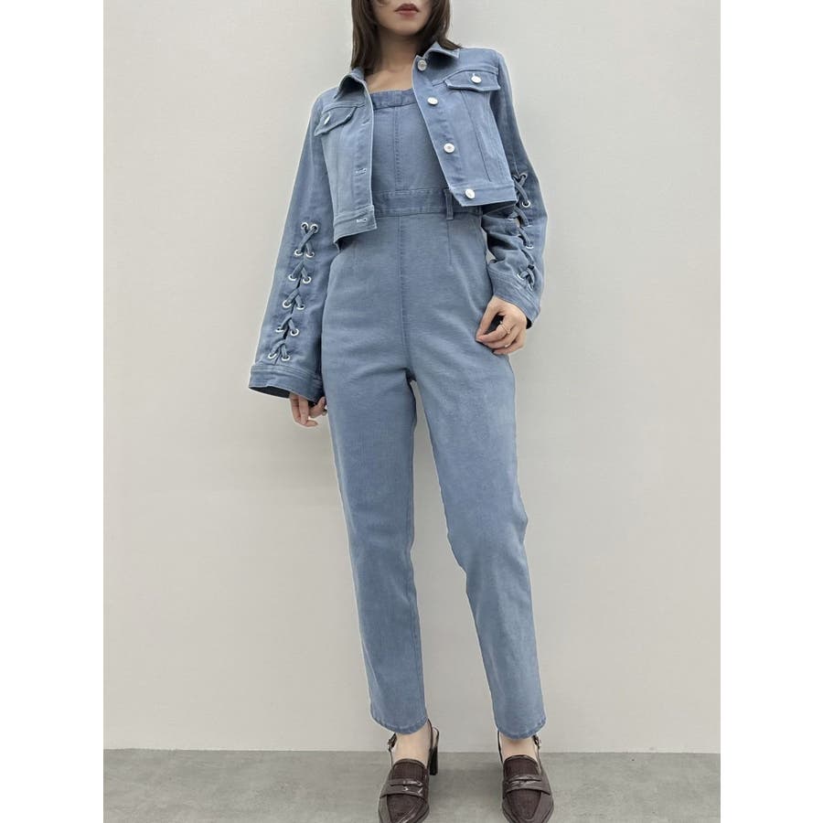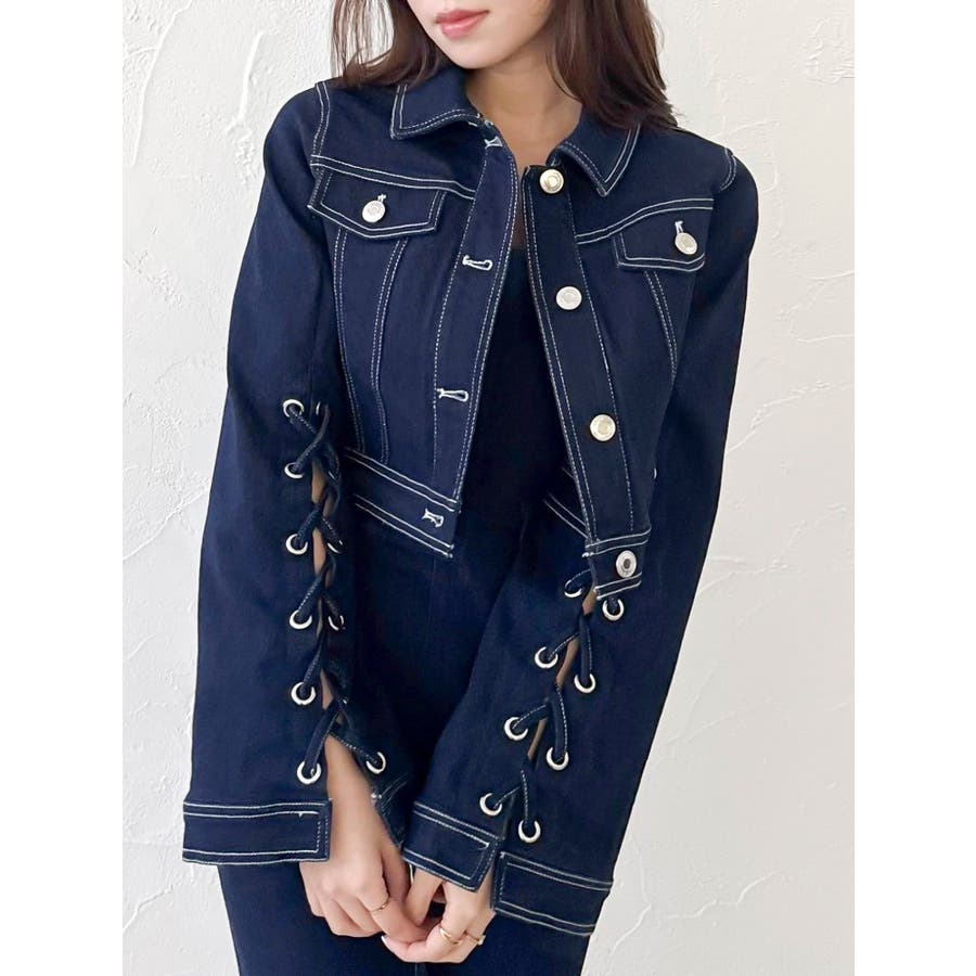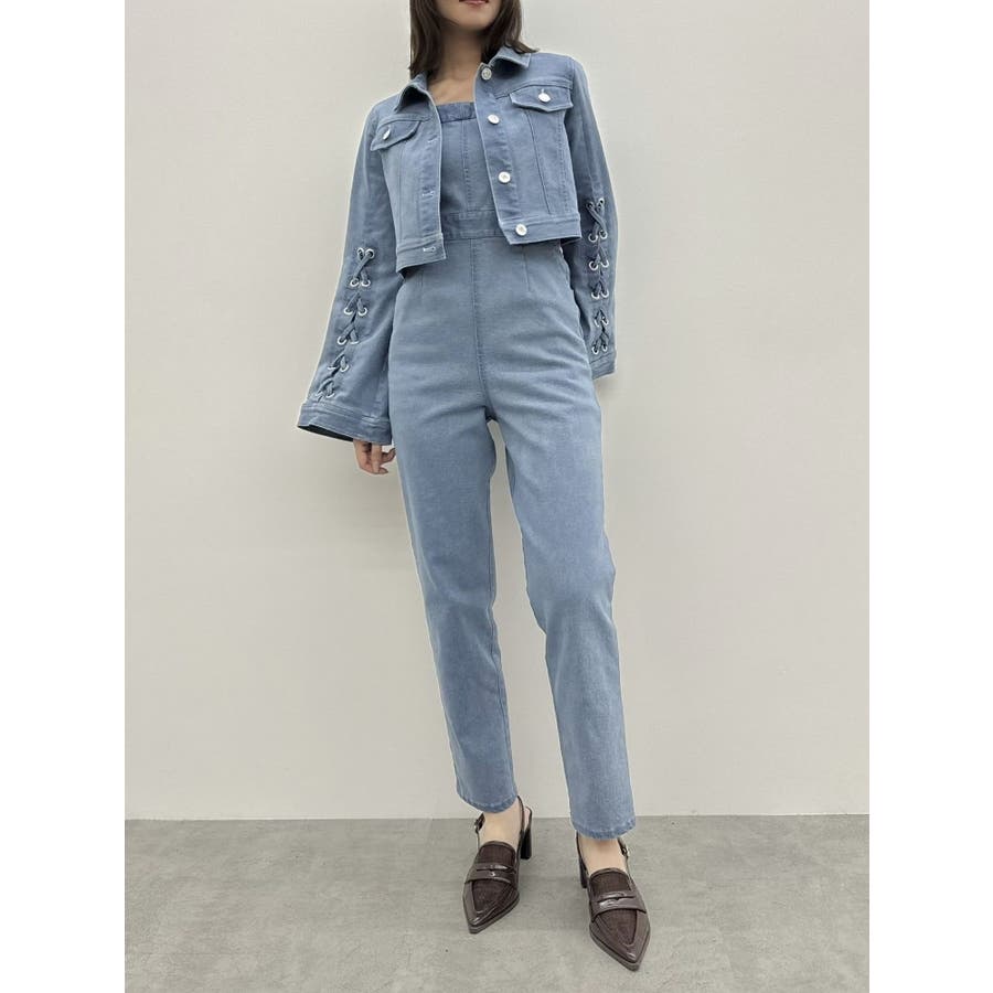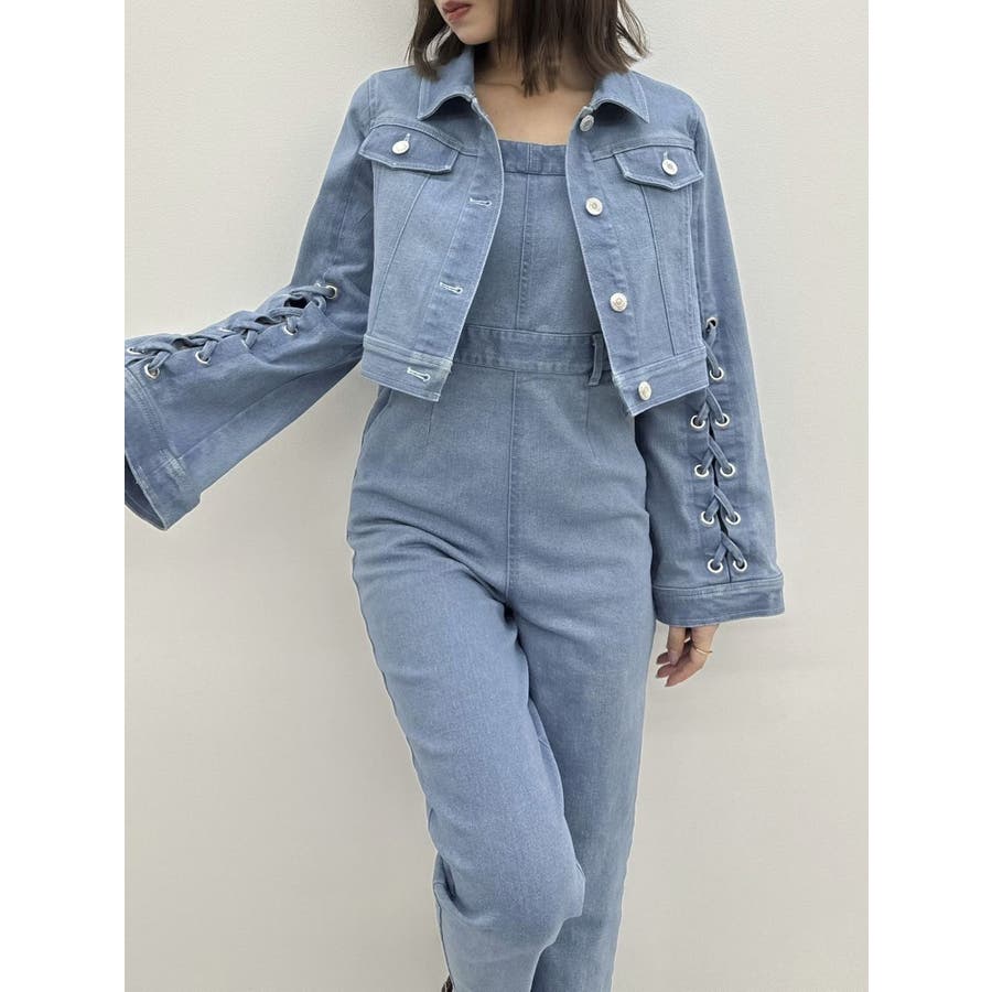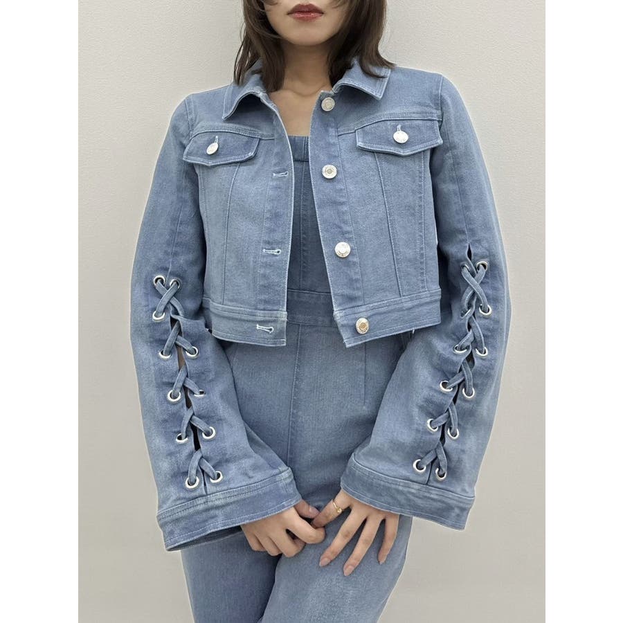【商品】※量産時、袖のレースアップ部分の裾にスリットが入ります。クロップド丈でスタイルアップを約束するジャケット。短丈は存在感が強くなりすぎるのを防いでくれるのでインナーアイテムを引き立ててくれます。柔らかさのあるデニム生地を使用しており、体に優しくフィットします。【スタイリング】同素材のサロペットを合わせてSETUPスタイルに。また袖のレースアップがポイントなので、シンプルなアイテムを合わせてバランスをとるのもおすすめです。