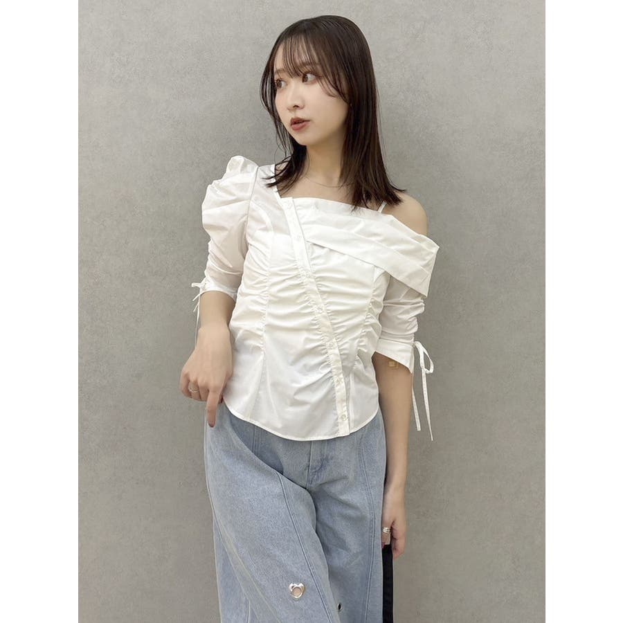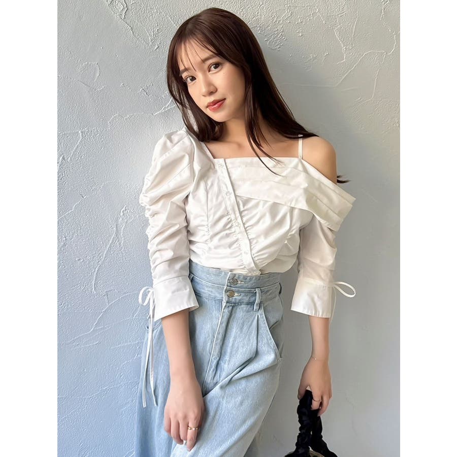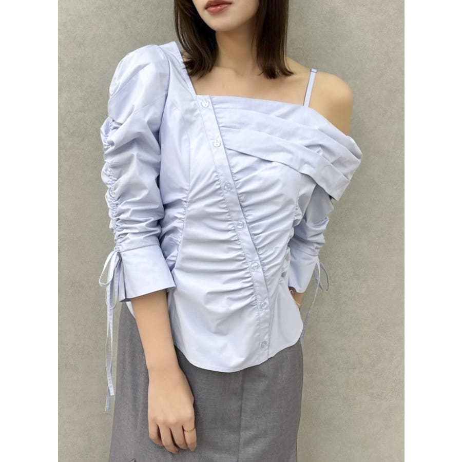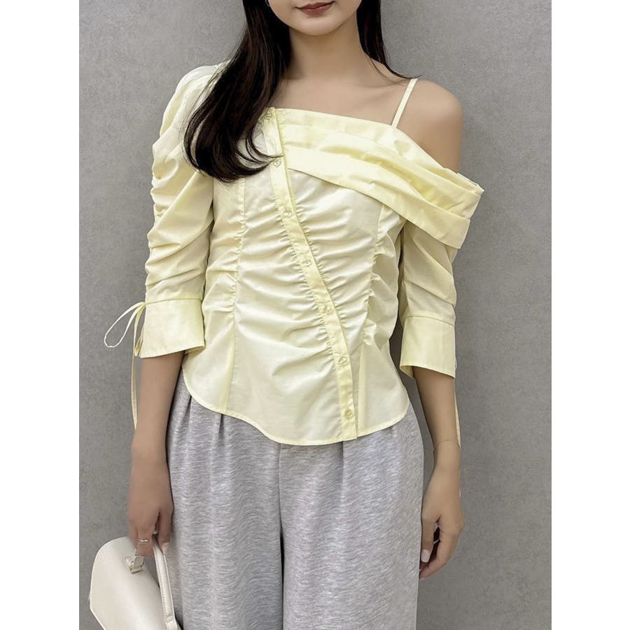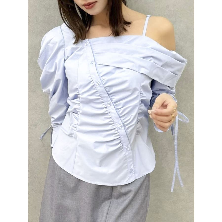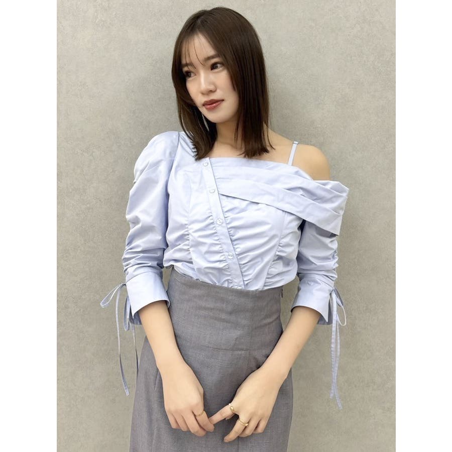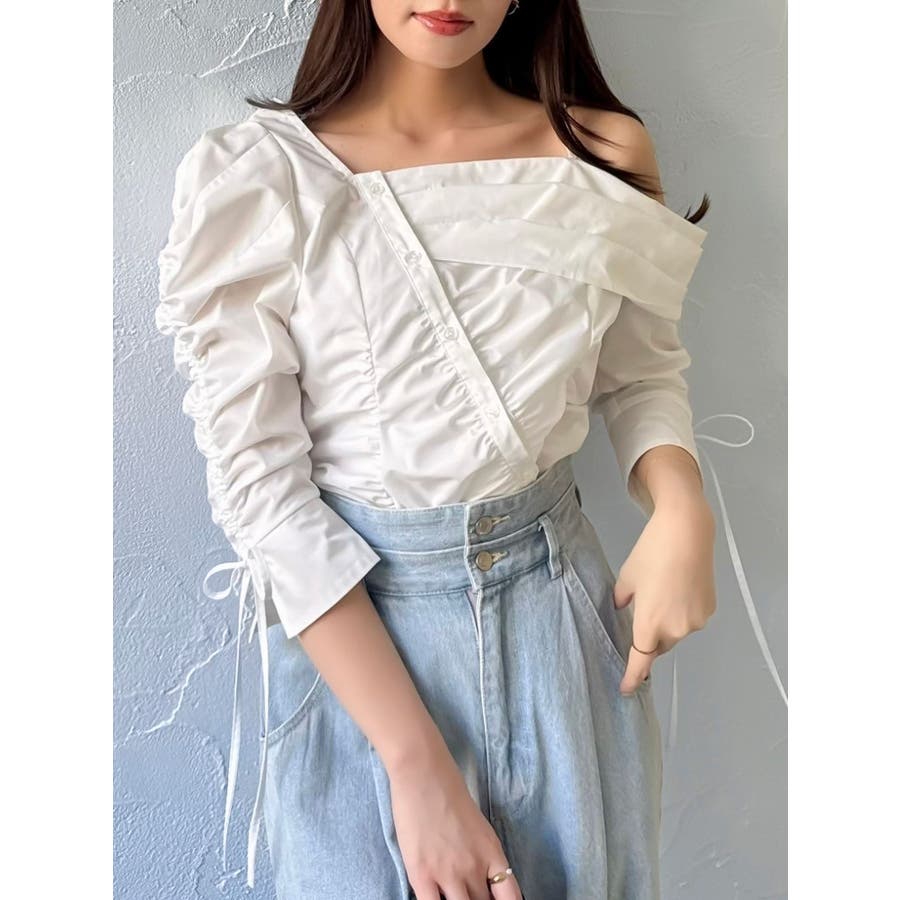 【商品】他にはない遊び心のあるアシンメトリーなデザインが存在感を発揮するブラウス。部分的なオフショルダーで程よく肌見せさせ、女性らしい抜け感を加えました。コーデに1枚取り入れるだけで他と差をつける高感度な装いに昇華します。 【スタイリング】ウエストは、ペプラム調になっているので、アウトでアンニュイに着用するのが今っぽくおすすめ。パンツやキャップ合わせでスポーティMIXなコーデから、プリーツ系スカート合わせでプレッピーMIXコーデにも高相性です。 ※実際にお届けする商品と仕様やサイズが異なる場合がございます。 また生産の都合上、お届け時期が前後する場合がございます。