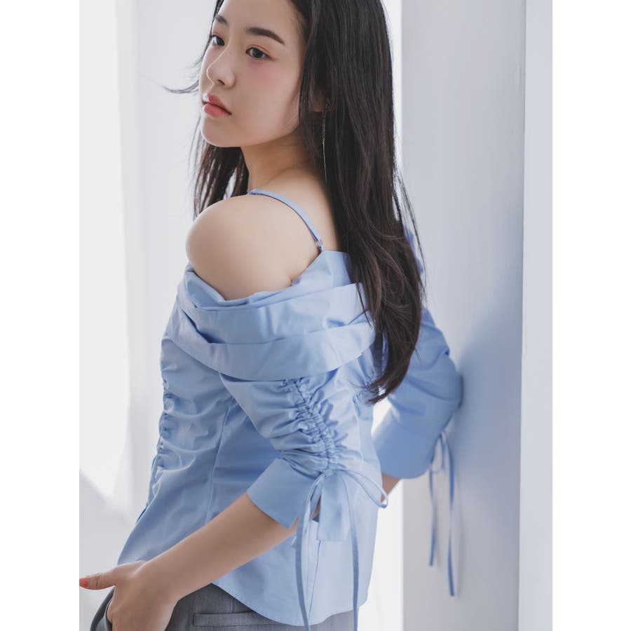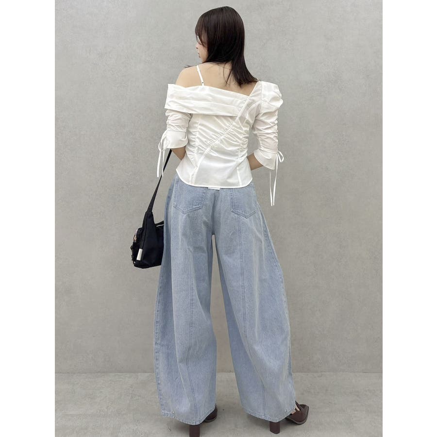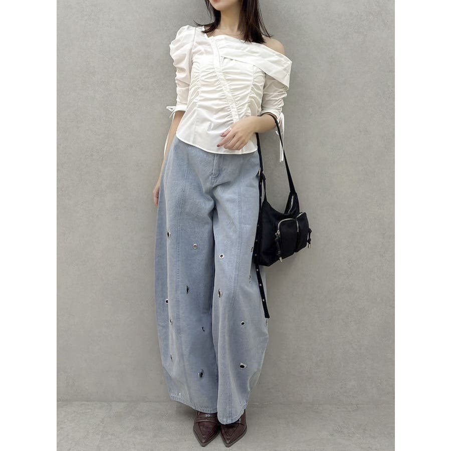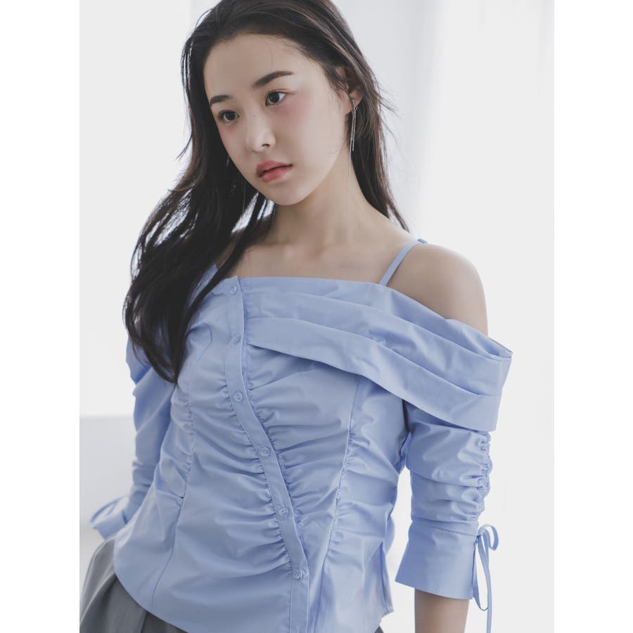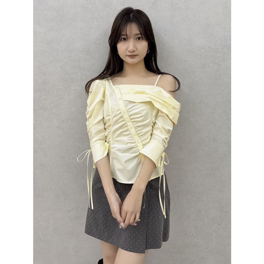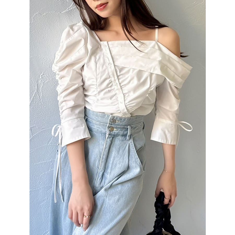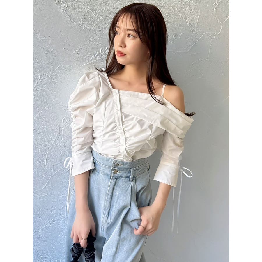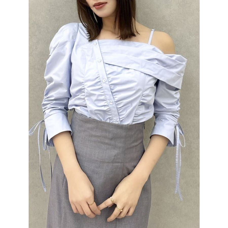 【商品】他にはない遊び心のあるアシンメトリーなデザインが存在感を発揮するブラウス。部分的なオフショルダーで程よく肌見せさせ、女性らしい抜け感を加えました。コーデに1枚取り入れるだけで他と差をつける高感度な装いに昇華します。 【スタイリング】ウエストは、ペプラム調になっているので、アウトでアンニュイに着用するのが今っぽくおすすめ。パンツやキャップ合わせでスポーティMIXなコーデから、プリーツ系スカート合わせでプレッピーMIXコーデにも高相性です。 ※実際にお届けする商品と仕様やサイズが異なる場合がございます。 また生産の都合上、お届け時期が前後する場合がございます。
