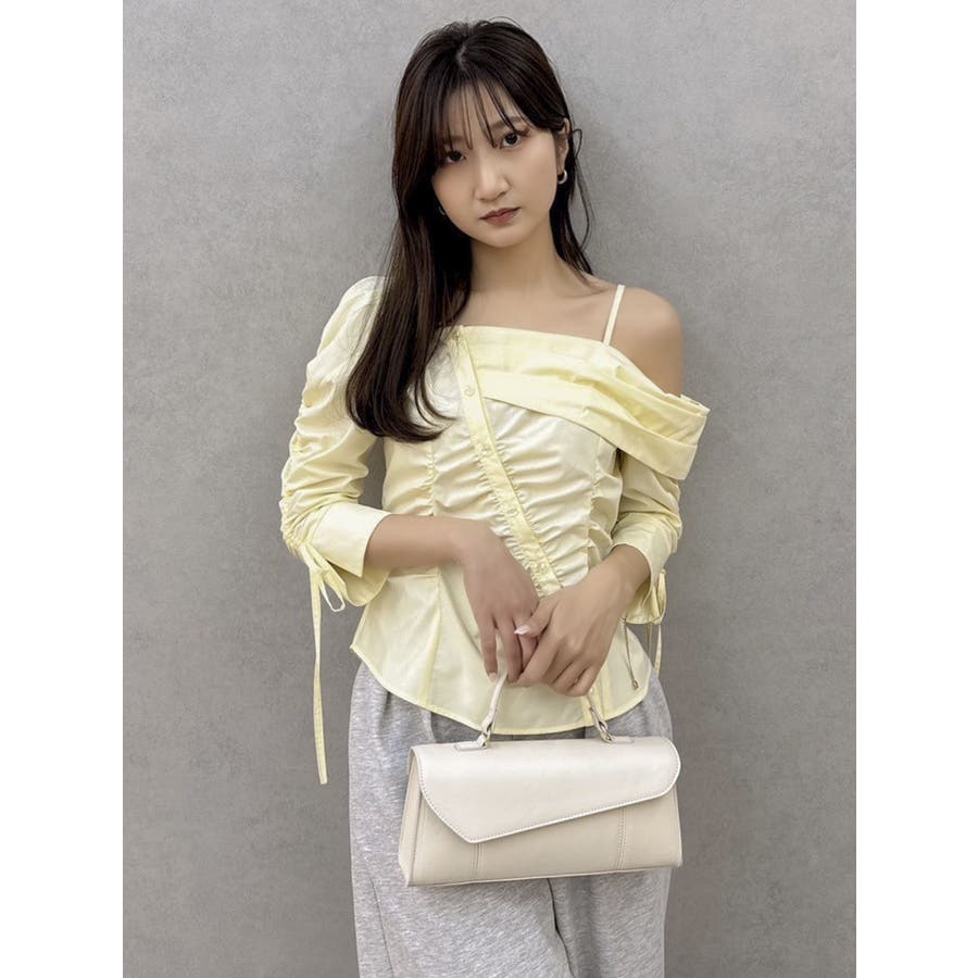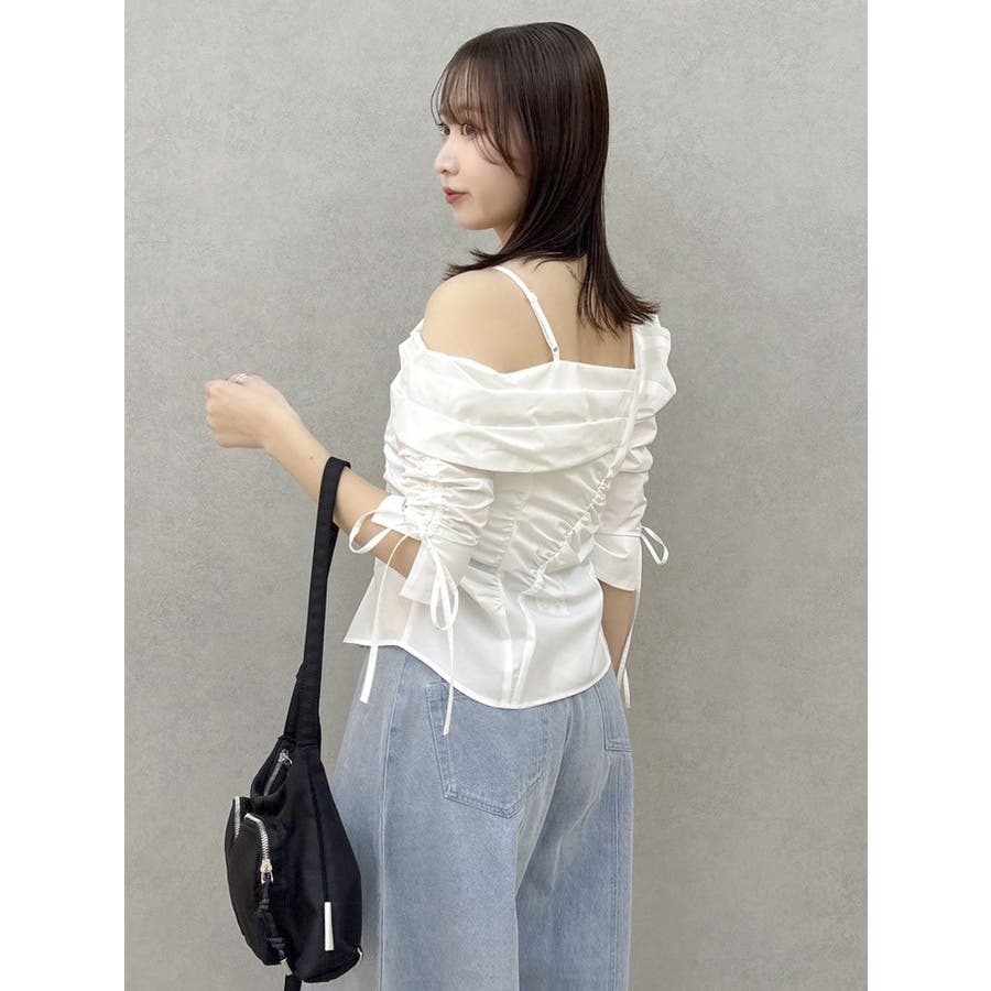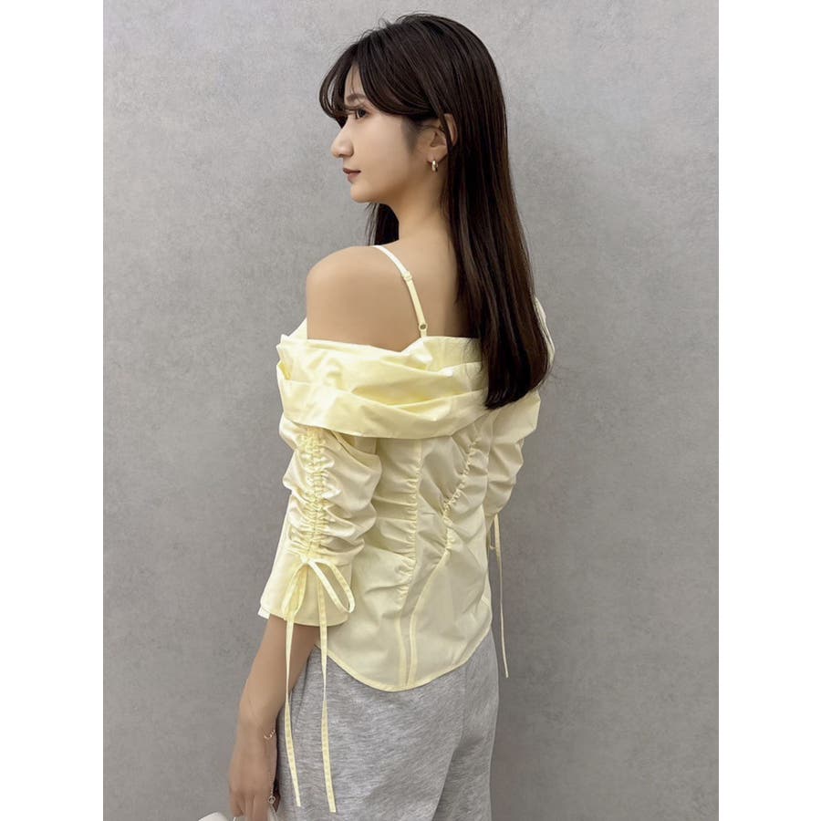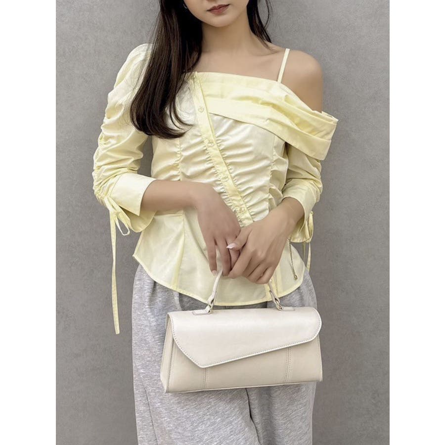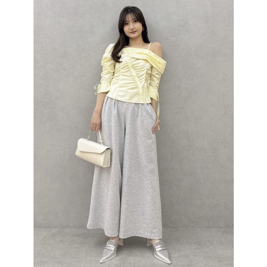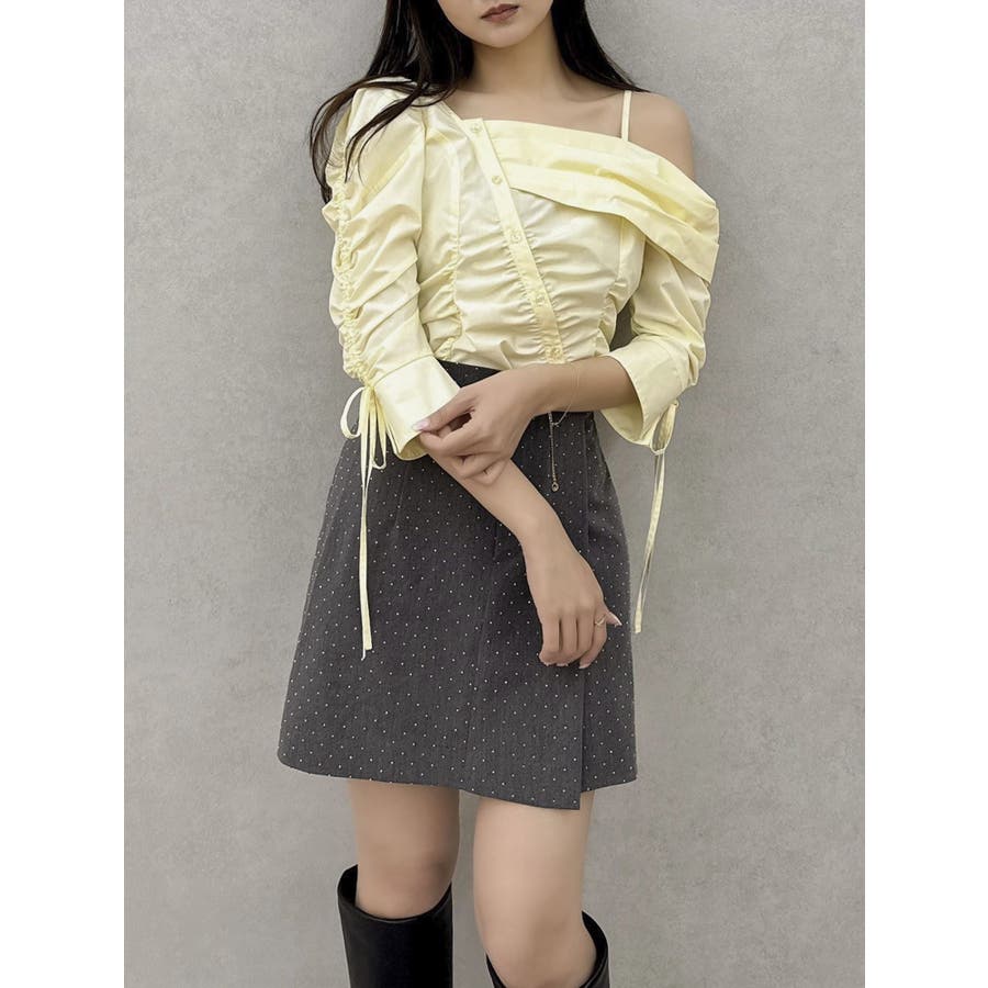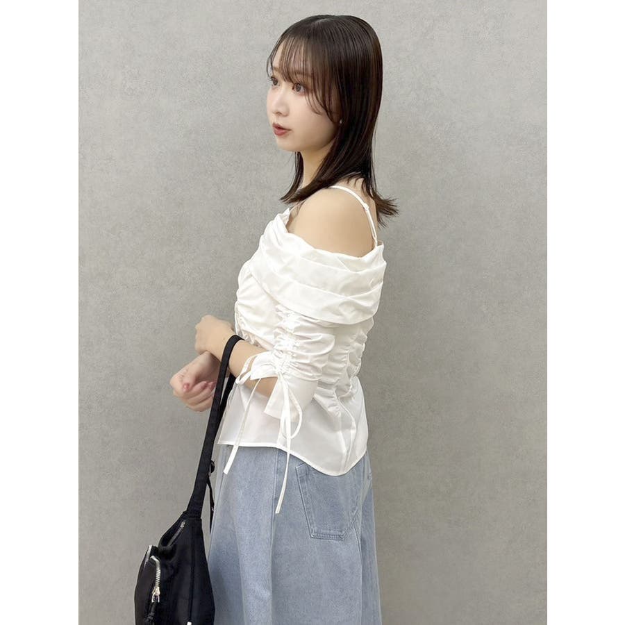 【商品】他にはない遊び心のあるアシンメトリーなデザインが存在感を発揮するブラウス。部分的なオフショルダーで程よく肌見せさせ、女性らしい抜け感を加えました。コーデに1枚取り入れるだけで他と差をつける高感度な装いに昇華します。 【スタイリング】ウエストは、ペプラム調になっているので、アウトでアンニュイに着用するのが今っぽくおすすめ。パンツやキャップ合わせでスポーティMIXなコーデから、プリーツ系スカート合わせでプレッピーMIXコーデにも高相性です。 ※実際にお届けする商品と仕様やサイズが異なる場合がございます。 また生産の都合上、お届け時期が前後する場合がございます。