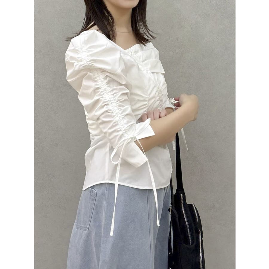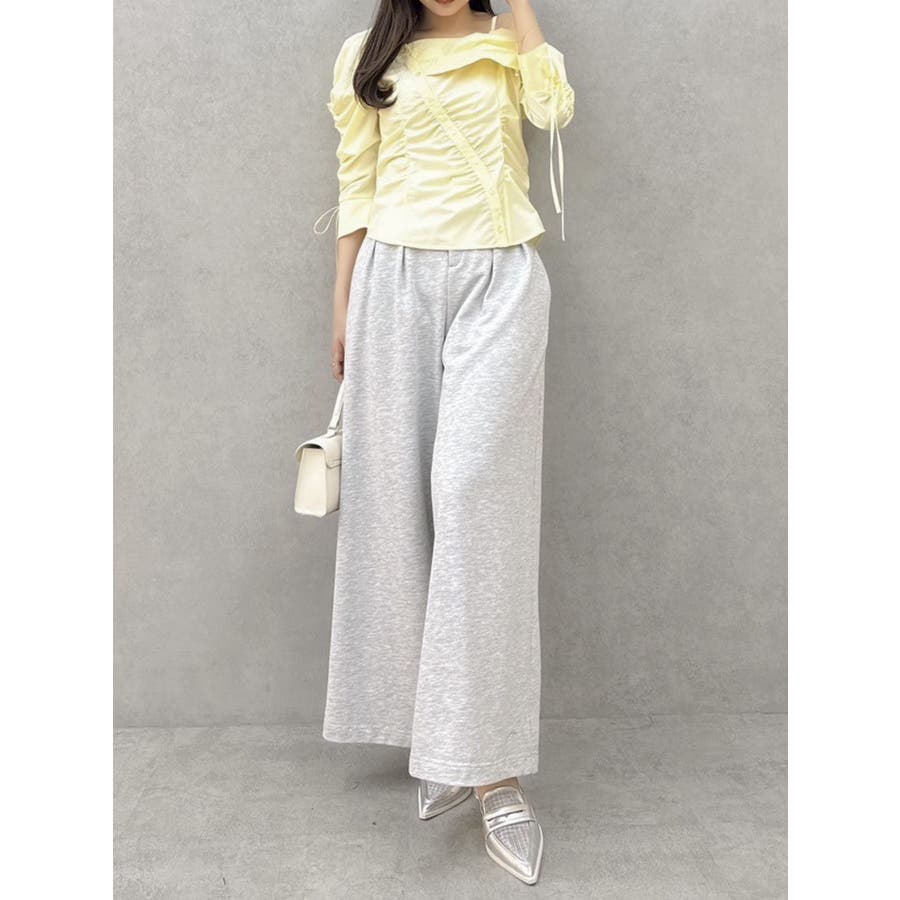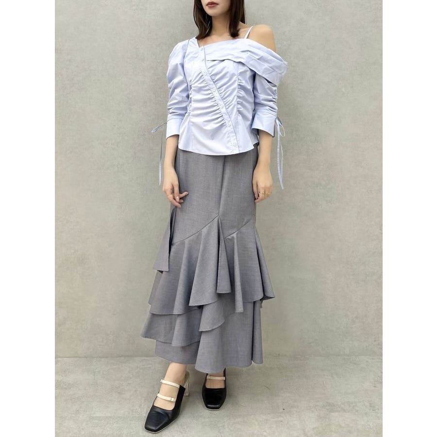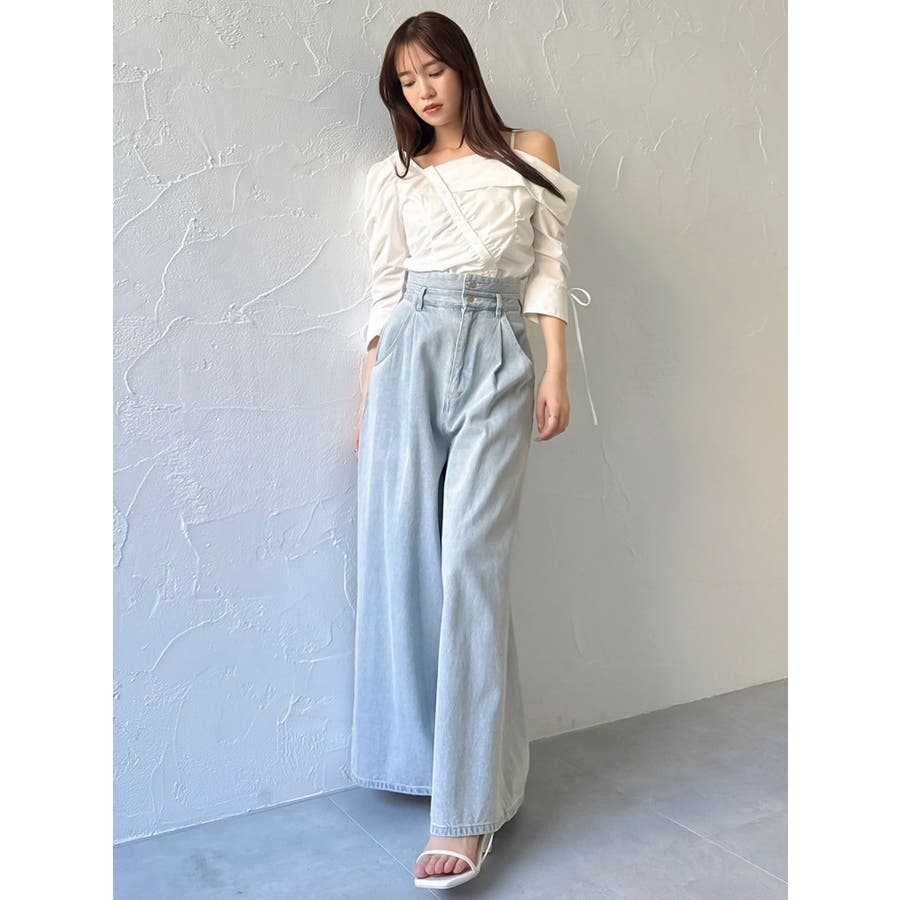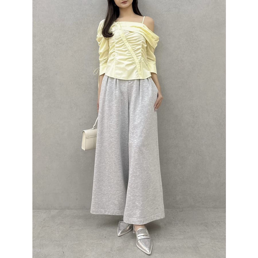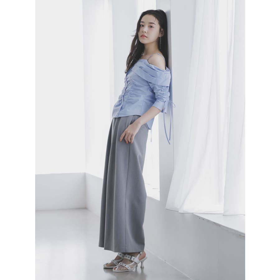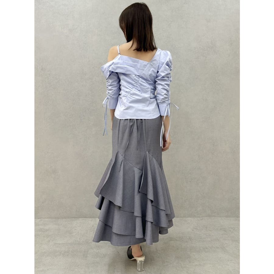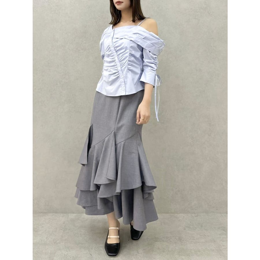 【商品】他にはない遊び心のあるアシンメトリーなデザインが存在感を発揮するブラウス。部分的なオフショルダーで程よく肌見せさせ、女性らしい抜け感を加えました。コーデに1枚取り入れるだけで他と差をつける高感度な装いに昇華します。 【スタイリング】ウエストは、ペプラム調になっているので、アウトでアンニュイに着用するのが今っぽくおすすめ。パンツやキャップ合わせでスポーティMIXなコーデから、プリーツ系スカート合わせでプレッピーMIXコーデにも高相性です。 ※実際にお届けする商品と仕様やサイズが異なる場合がございます。 また生産の都合上、お届け時期が前後する場合がございます。