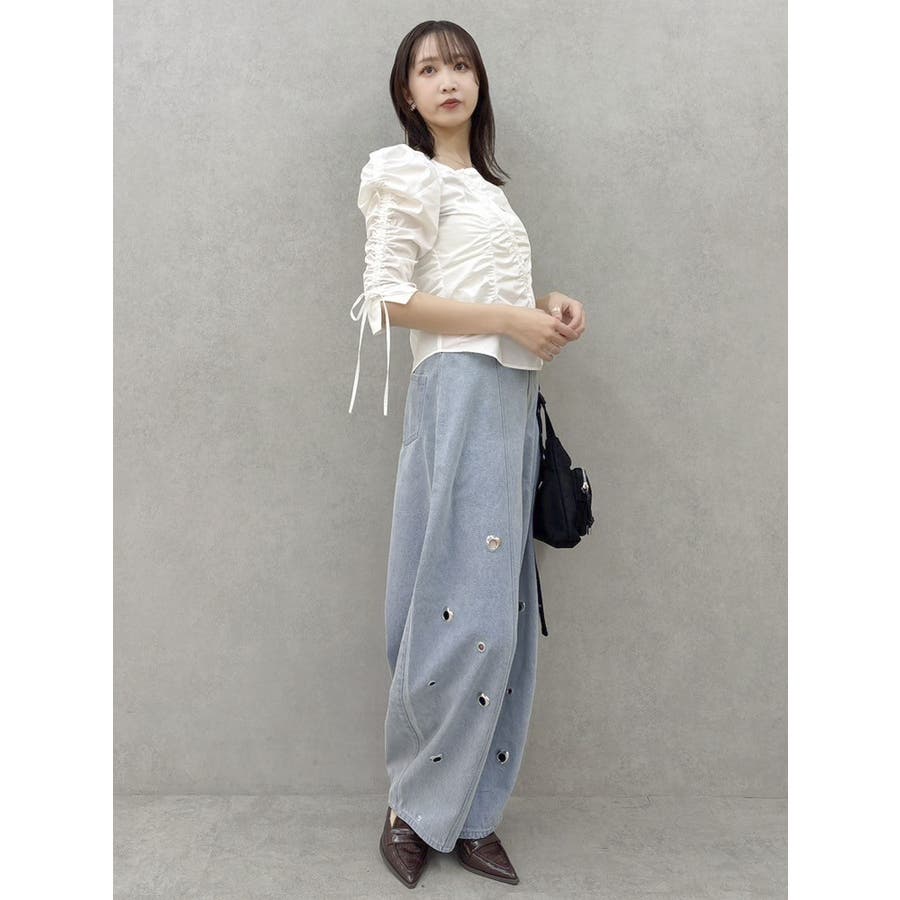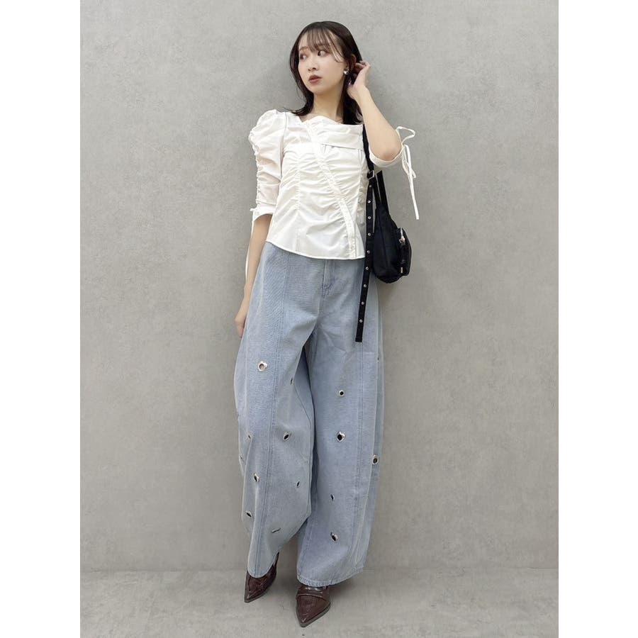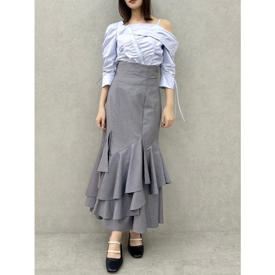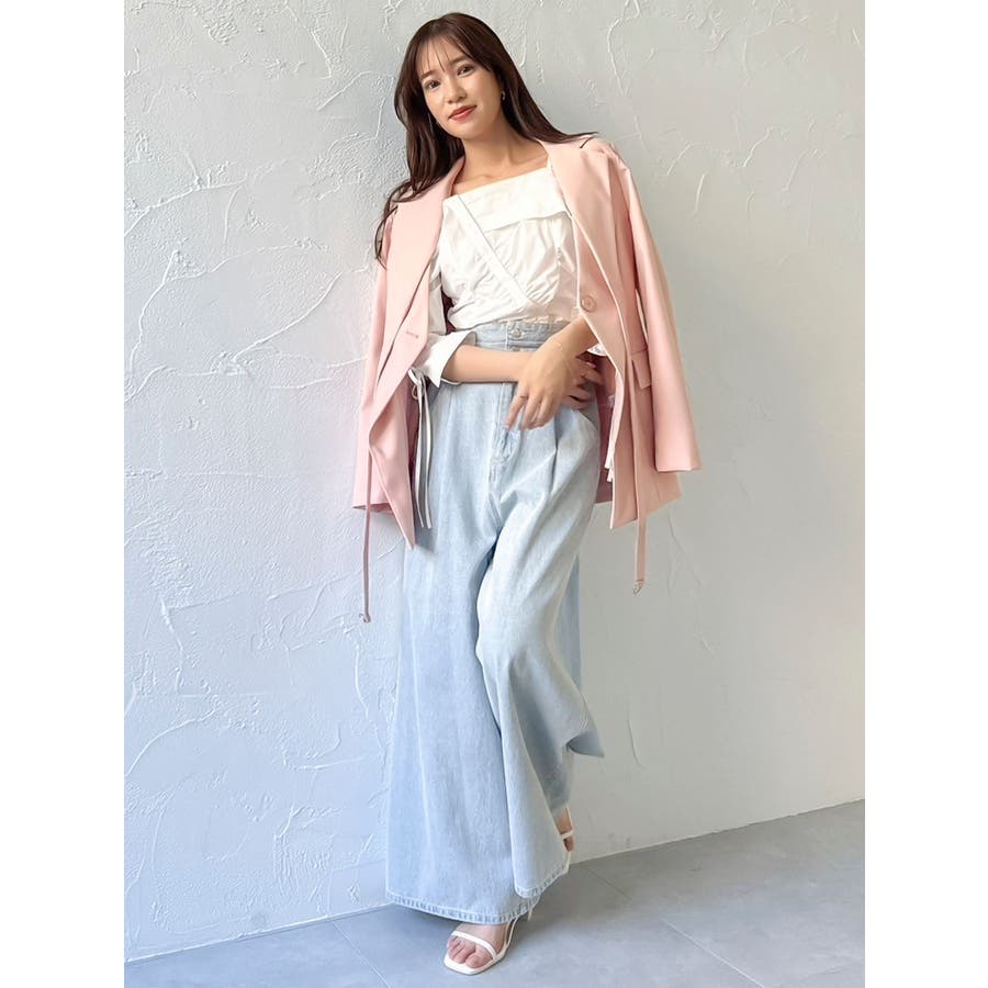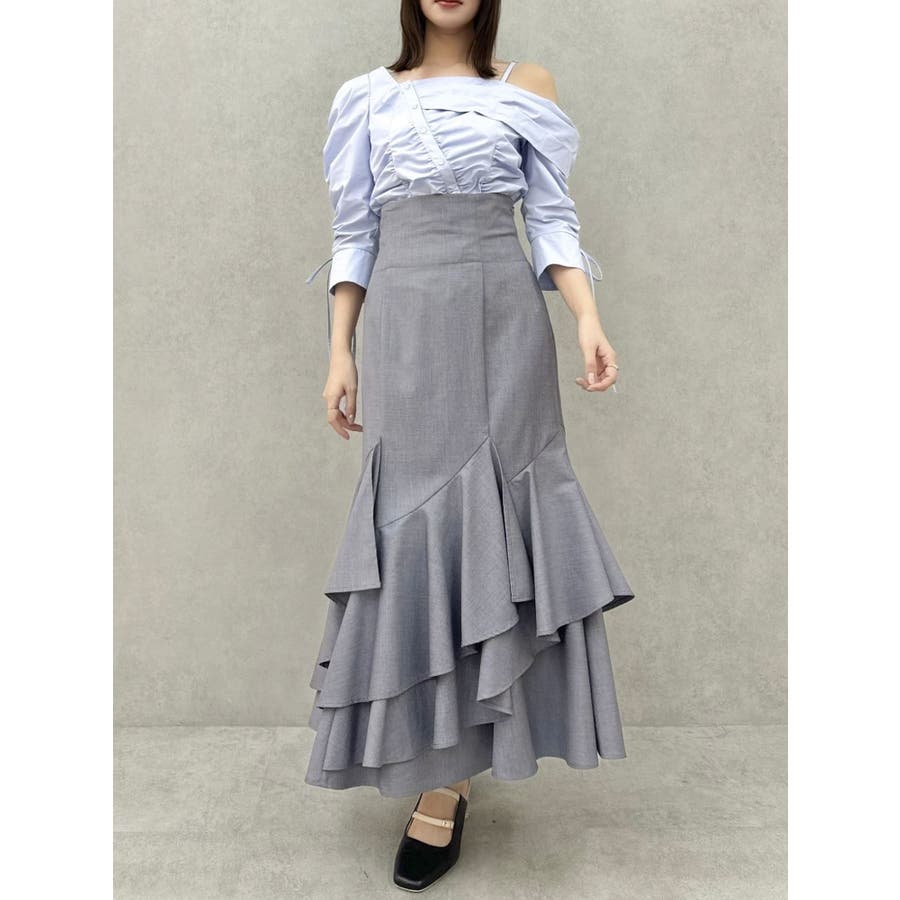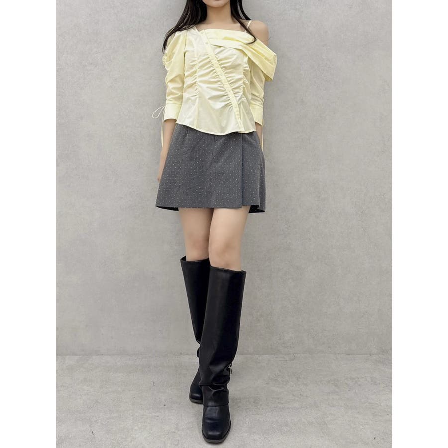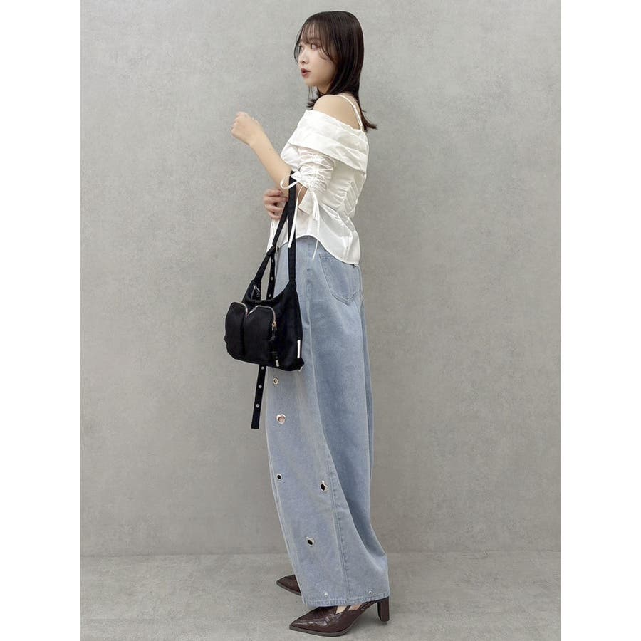【商品】他にはない遊び心のあるアシンメトリーなデザインが存在感を発揮するブラウス。部分的なオフショルダーで程よく肌見せさせ、女性らしい抜け感を加えました。コーデに1枚取り入れるだけで他と差をつける高感度な装いに昇華します。 【スタイリング】ウエストは、ペプラム調になっているので、アウトでアンニュイに着用するのが今っぽくおすすめ。パンツやキャップ合わせでスポーティMIXなコーデから、プリーツ系スカート合わせでプレッピーMIXコーデにも高相性です。 ※実際にお届けする商品と仕様やサイズが異なる場合がございます。 また生産の都合上、お届け時期が前後する場合がございます。