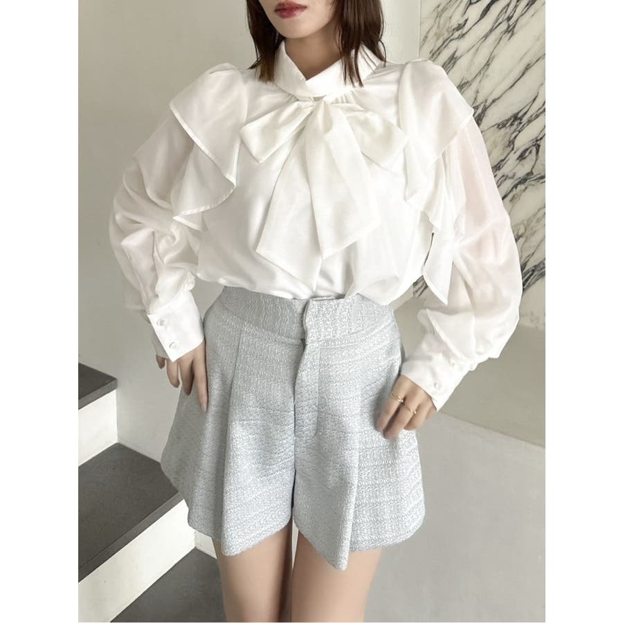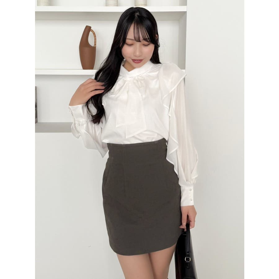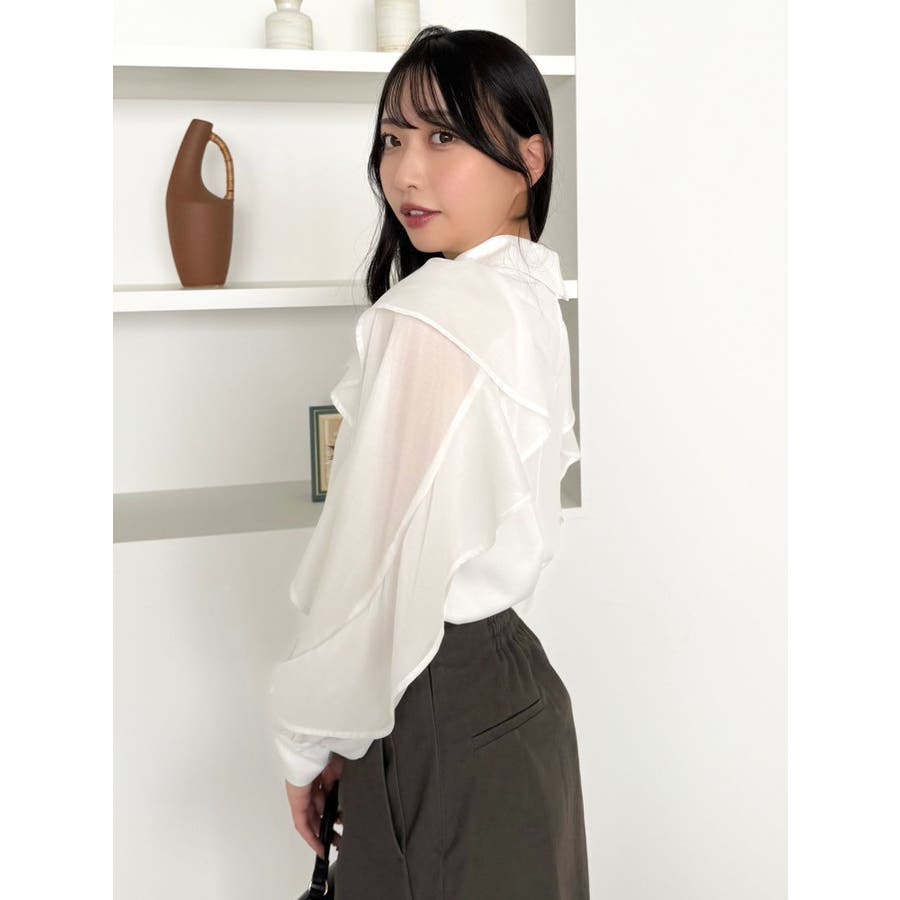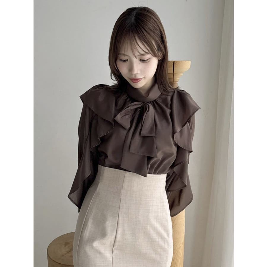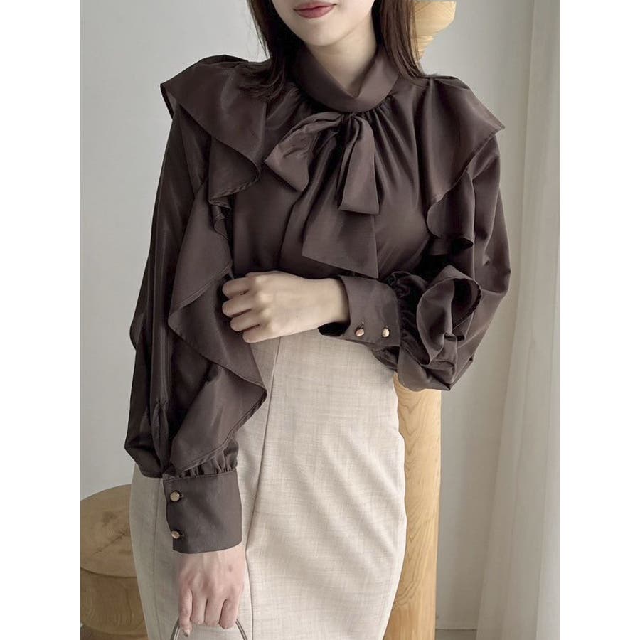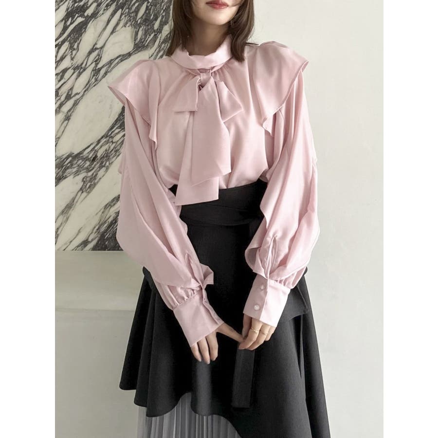 【商品】落ち感のある生地を使用してエレガントさを表現。大き目のラッフルフリルが躍動感を感じさせフェミニンムードを高めてくれます。リボンはボタンで取り外し可能です。タイレスでも楽しめる2WAYタイプです。サイズ感も圧迫感がなく、体型に左右されず着れるのも嬉しいポイントです。【スタイリング】リボン部分を取り外して、スカーフをアレンジして巻いたりなど、リボンレス以外にもアレンジが効くのが特徴です。