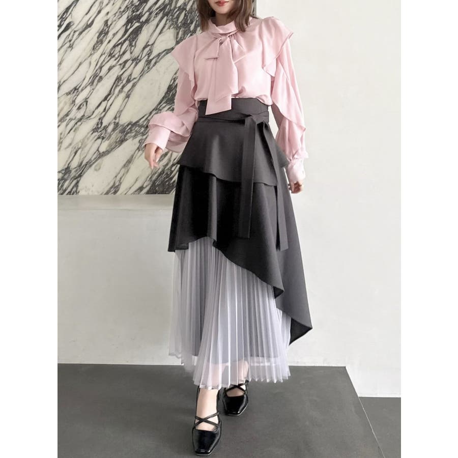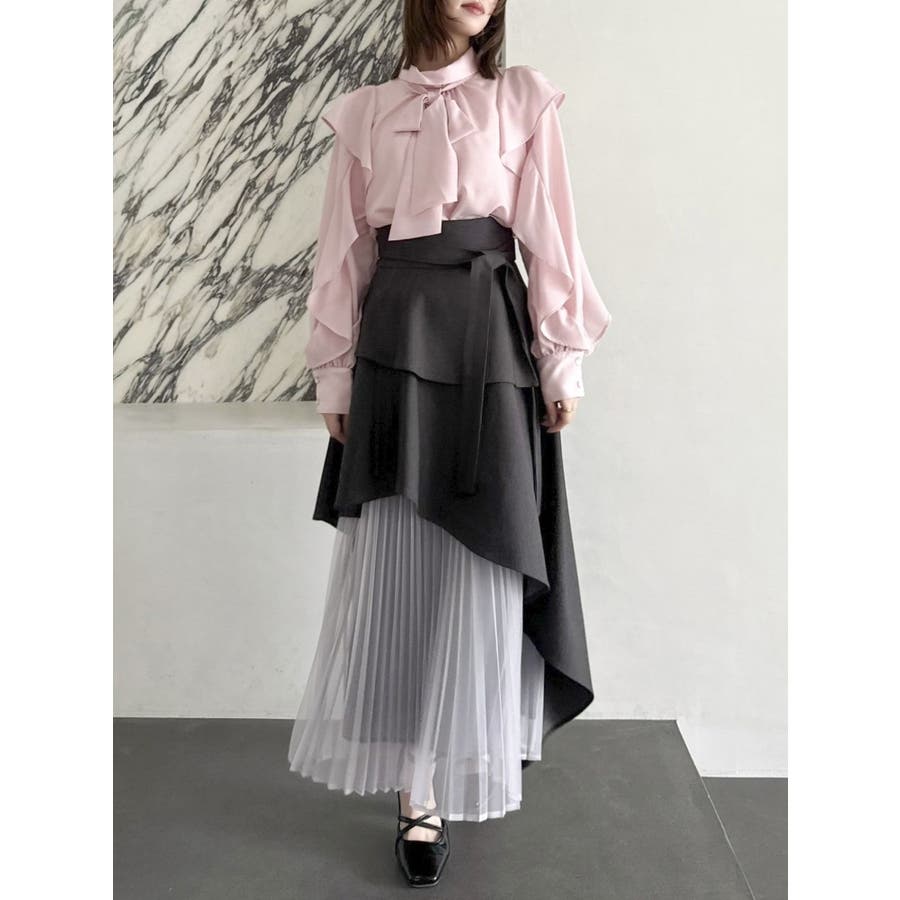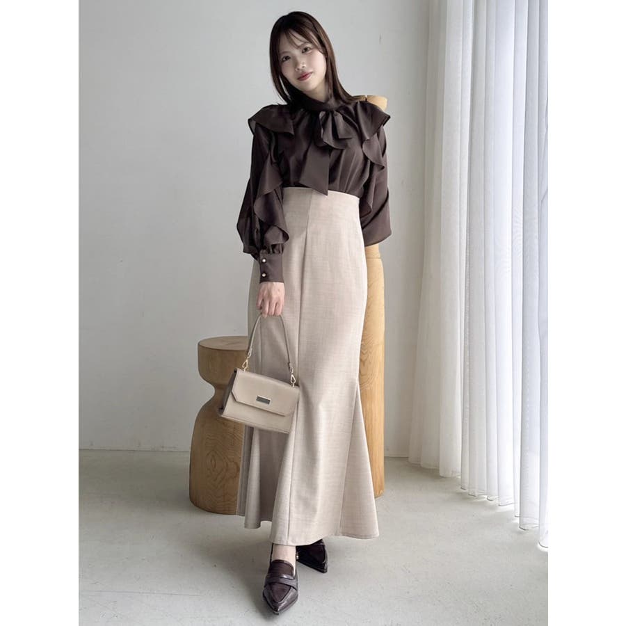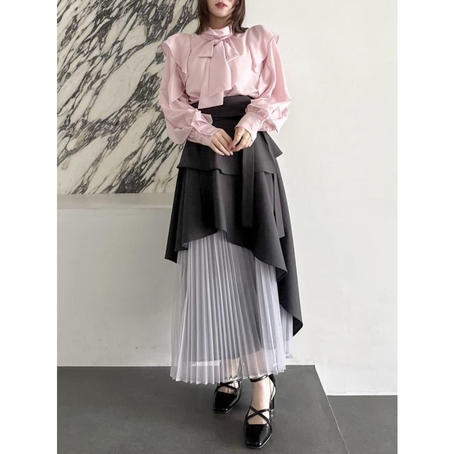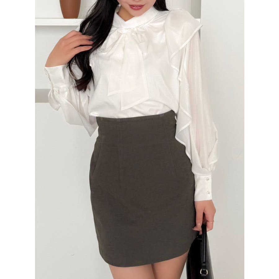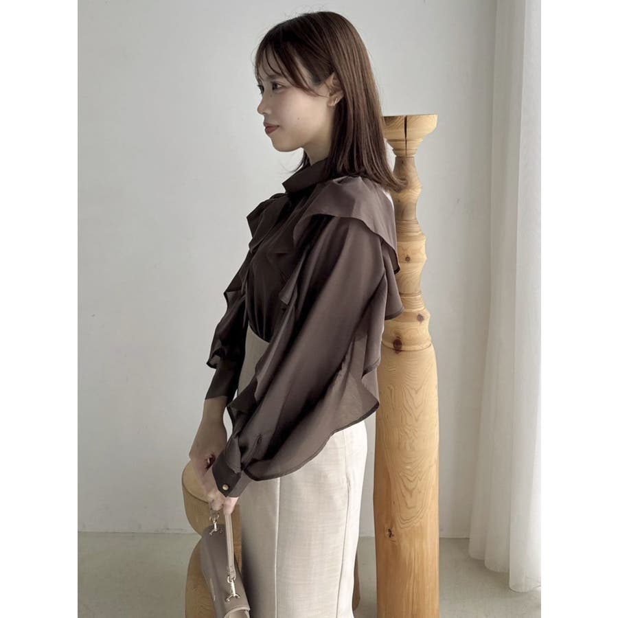 【商品】落ち感のある生地を使用してエレガントさを表現。大き目のラッフルフリルが躍動感を感じさせフェミニンムードを高めてくれます。リボンはボタンで取り外し可能です。タイレスでも楽しめる2WAYタイプです。サイズ感も圧迫感がなく、体型に左右されず着れるのも嬉しいポイントです。【スタイリング】リボン部分を取り外して、スカーフをアレンジして巻いたりなど、リボンレス以外にもアレンジが効くのが特徴です。