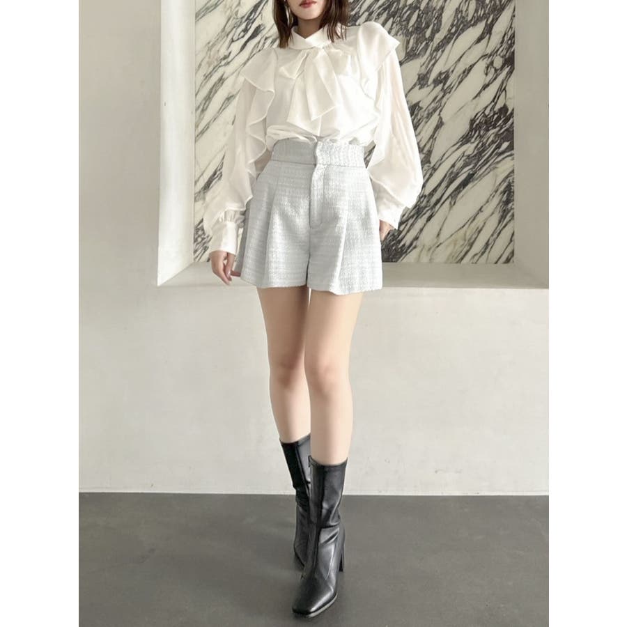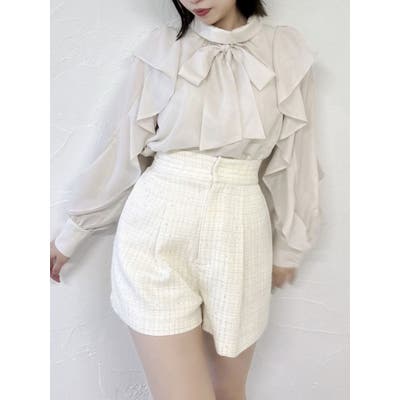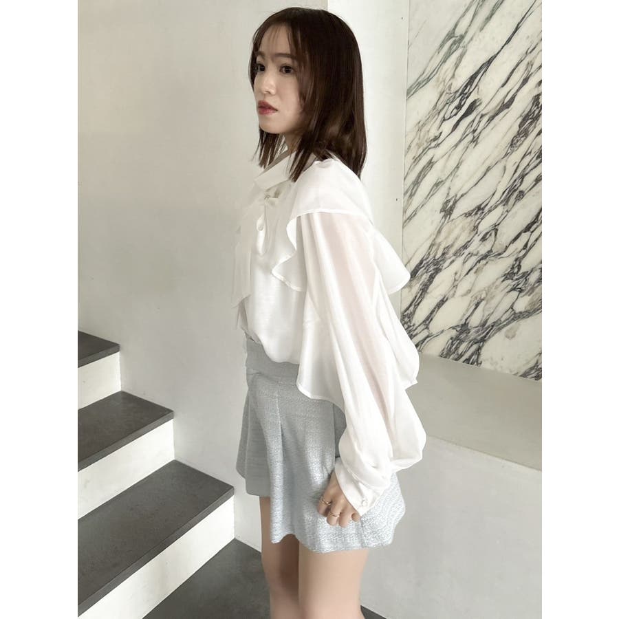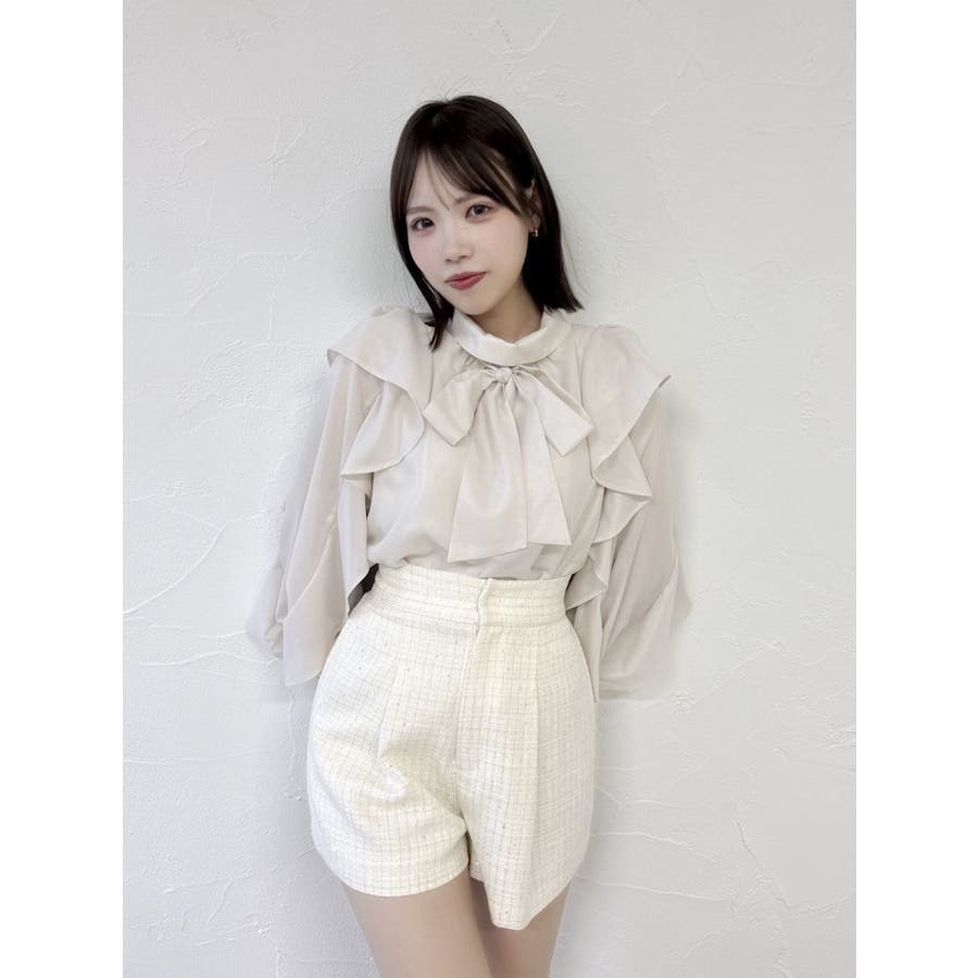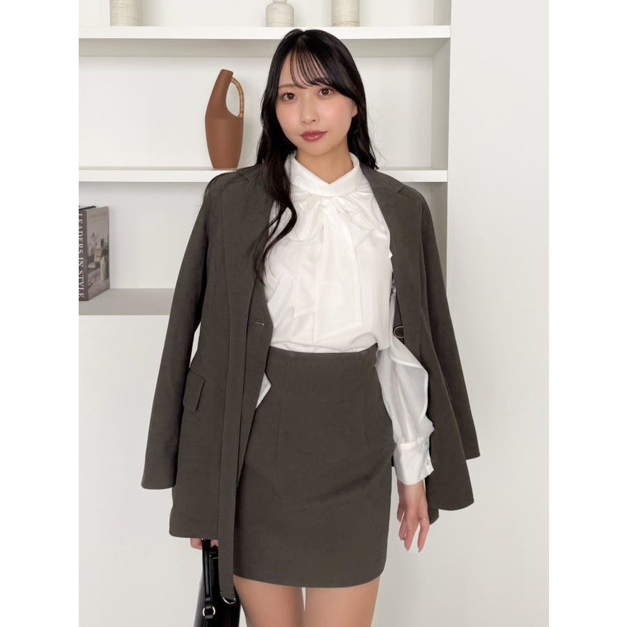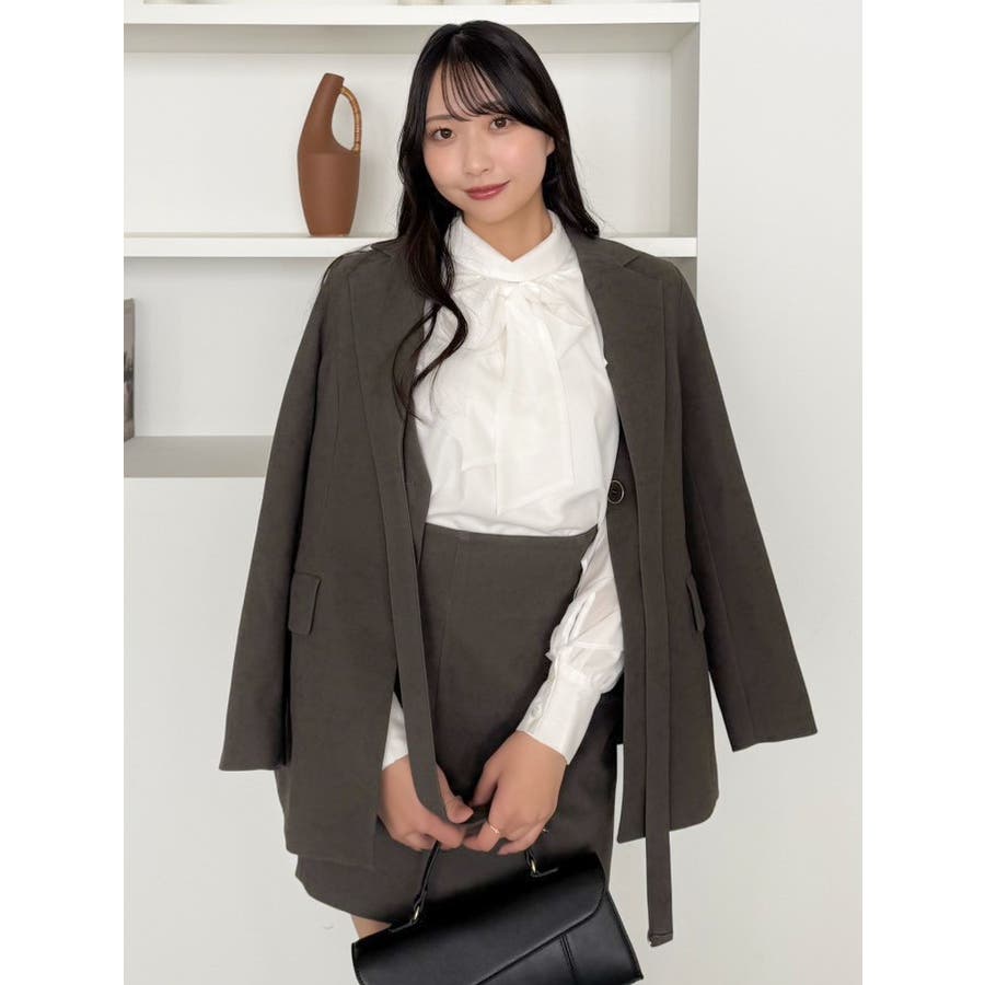 【商品】落ち感のある生地を使用してエレガントさを表現。大き目のラッフルフリルが躍動感を感じさせフェミニンムードを高めてくれます。リボンはボタンで取り外し可能です。タイレスでも楽しめる2WAYタイプです。サイズ感も圧迫感がなく、体型に左右されず着れるのも嬉しいポイントです。【スタイリング】リボン部分を取り外して、スカーフをアレンジして巻いたりなど、リボンレス以外にもアレンジが効くのが特徴です。