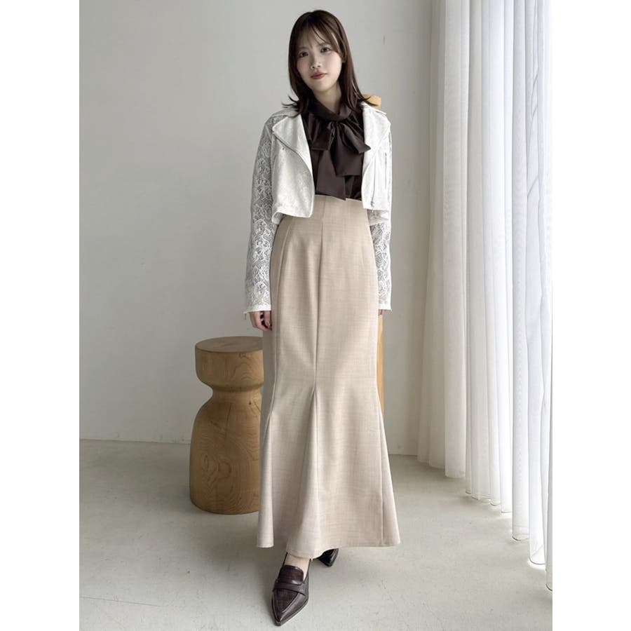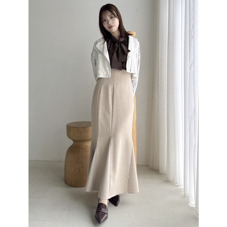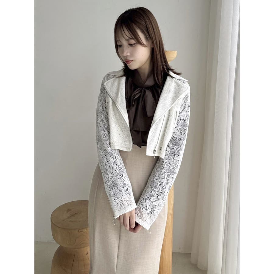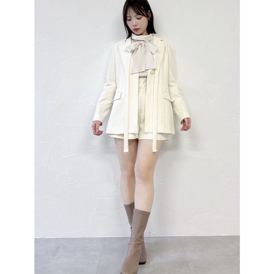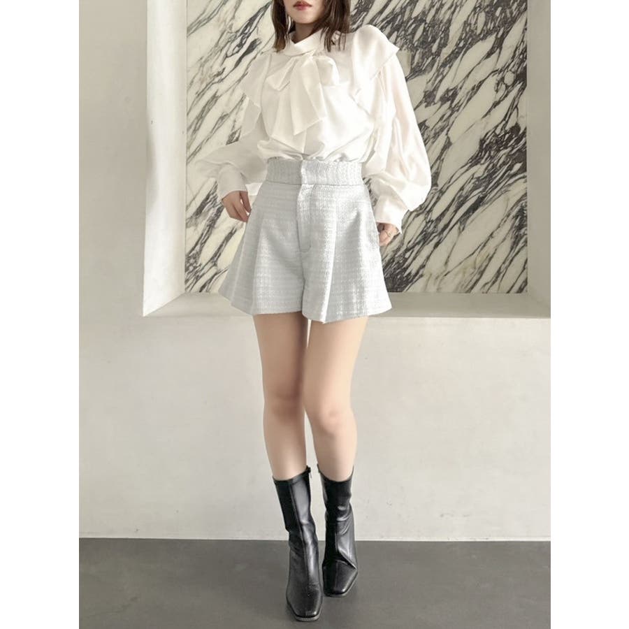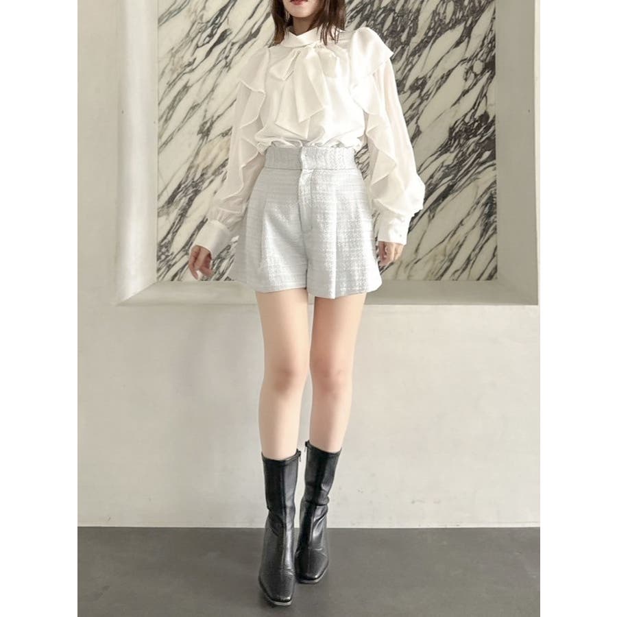 【商品】落ち感のある生地を使用してエレガントさを表現。大き目のラッフルフリルが躍動感を感じさせフェミニンムードを高めてくれます。リボンはボタンで取り外し可能です。タイレスでも楽しめる2WAYタイプです。サイズ感も圧迫感がなく、体型に左右されず着れるのも嬉しいポイントです。【スタイリング】リボン部分を取り外して、スカーフをアレンジして巻いたりなど、リボンレス以外にもアレンジが効くのが特徴です。