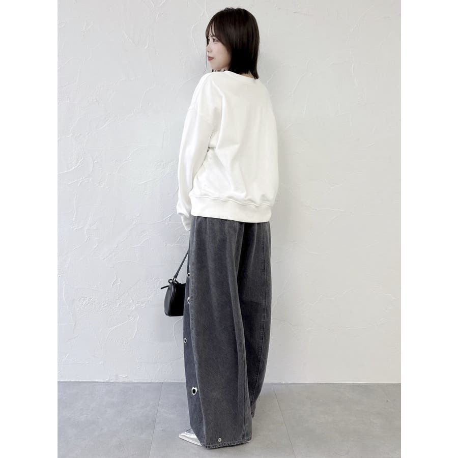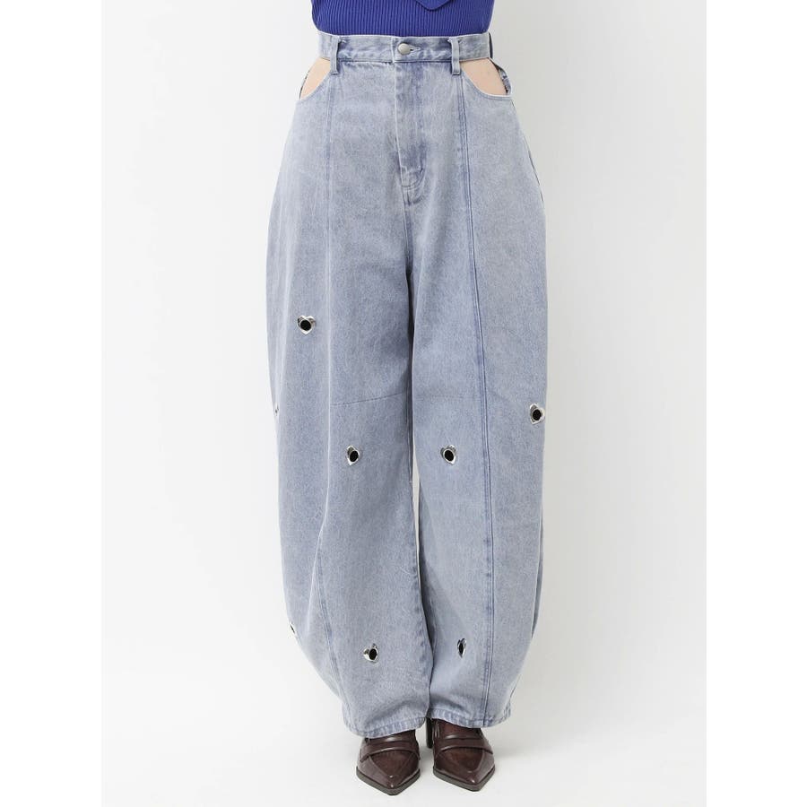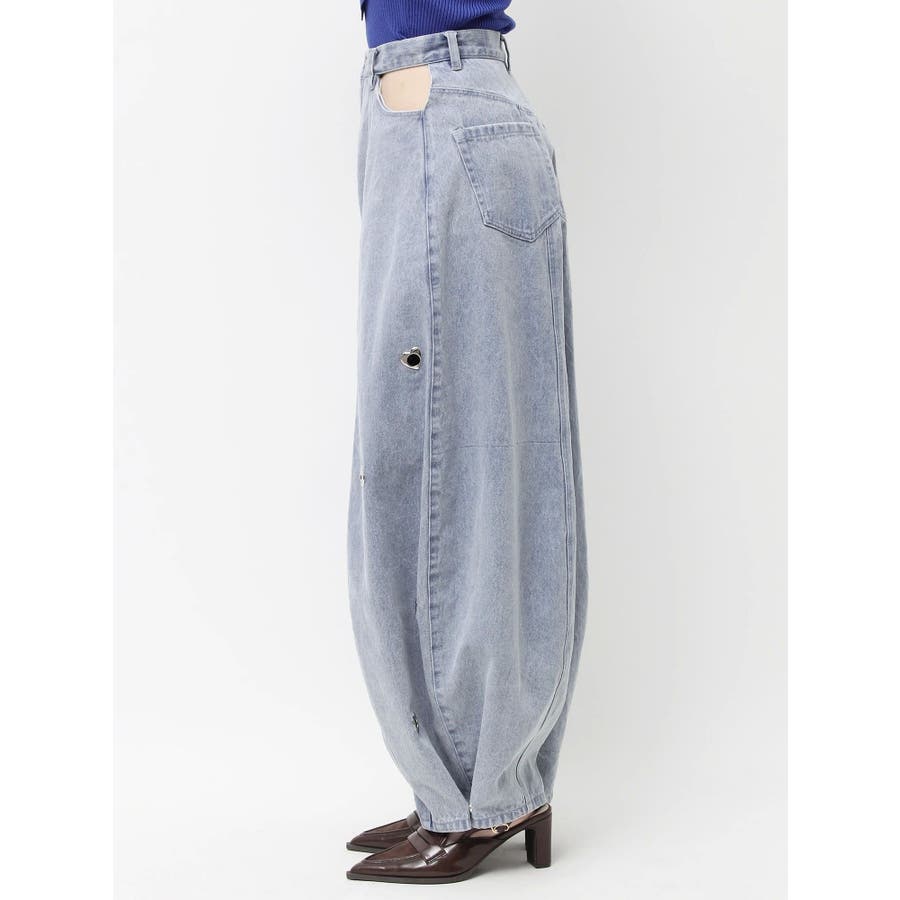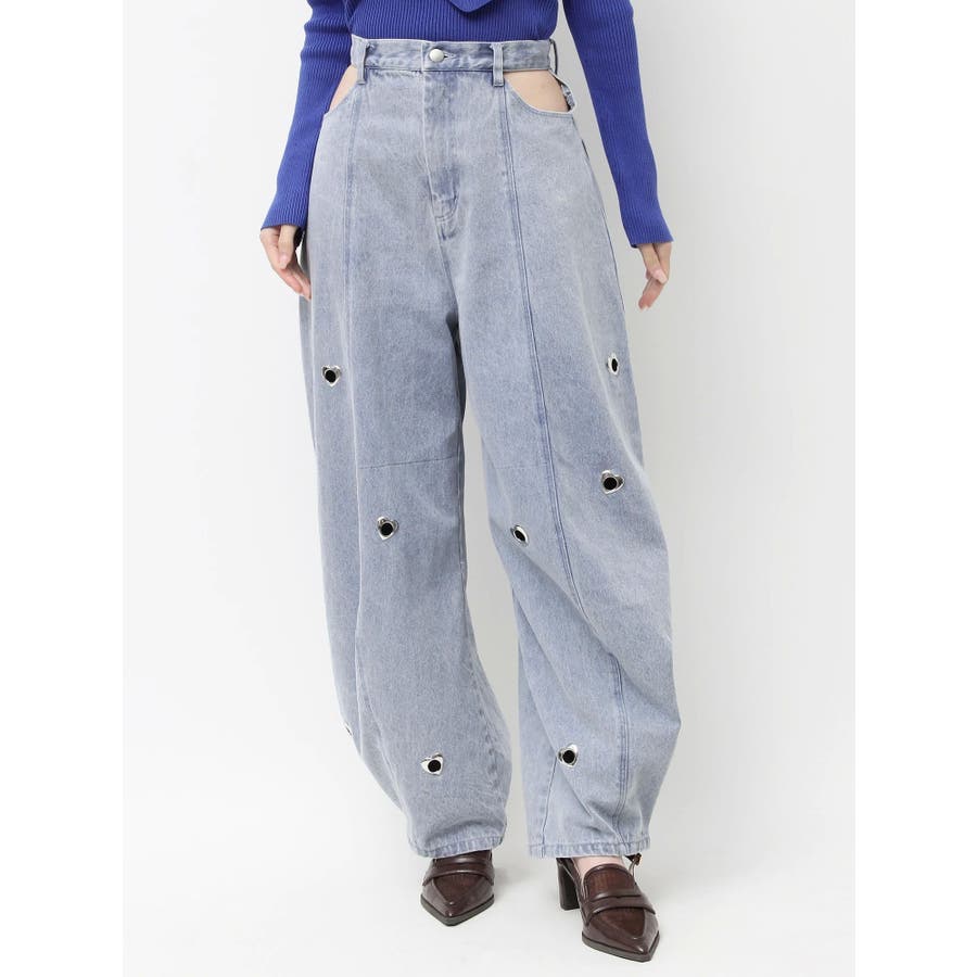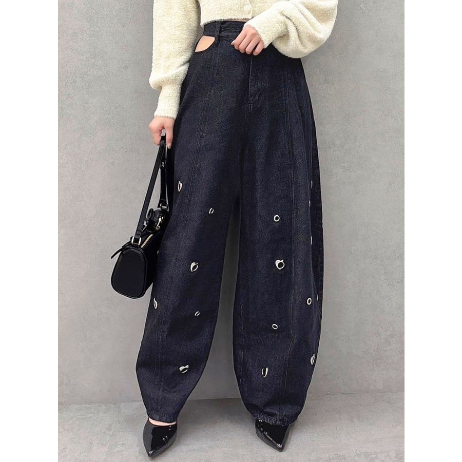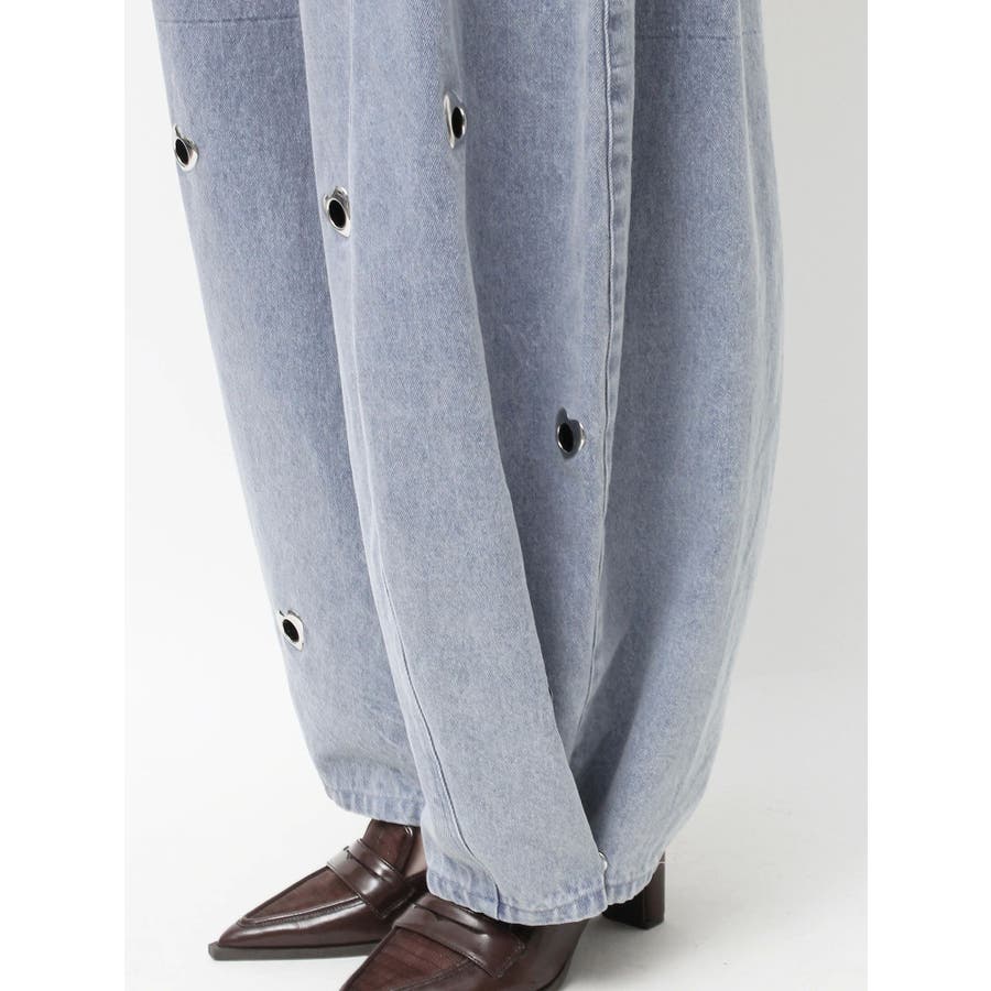 ※量産時、はと目の個数が増えます。※詳細画像が正規の商品となります。【商品】腰回りに開きを作り、抜け感を作って着やせポイントを作ります。カービーな弧を描く立体的なワイドストレートシルエットに仕上げたデザインで、メンズサイズをベルトでぎゅっと穿くのとはまた違った、女性らしいニュアンスのあるシルエットが魅力。裾のスナップは取り外し可能でカーブ具合を調整できるようになっております。はとめのデザインが遊び心をプラス。【スタイリング】コンパクトアイテムとの組み合わせがおすすめです。肌を出したアイテムを合わせると女性らしさを際立たせてフェミニンに。ルーズなオーバーシャツ合わせなどもこなれた印象になります。