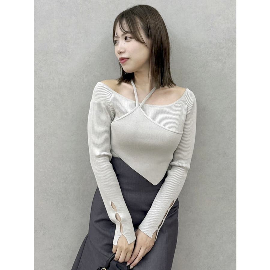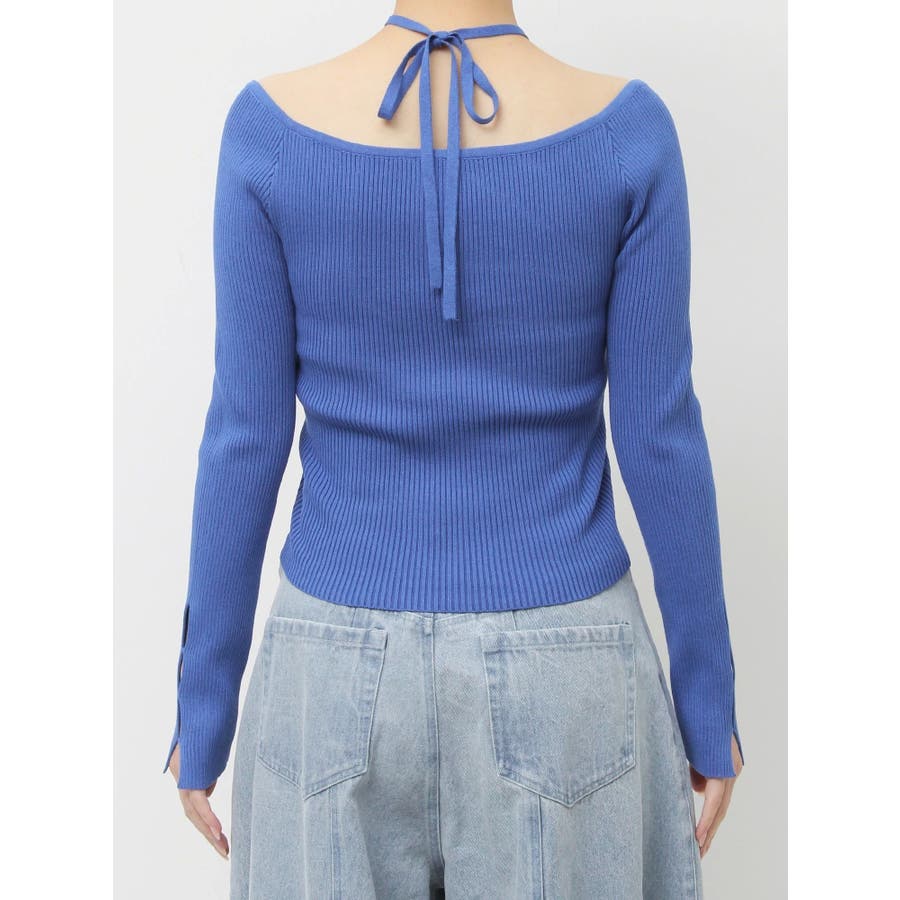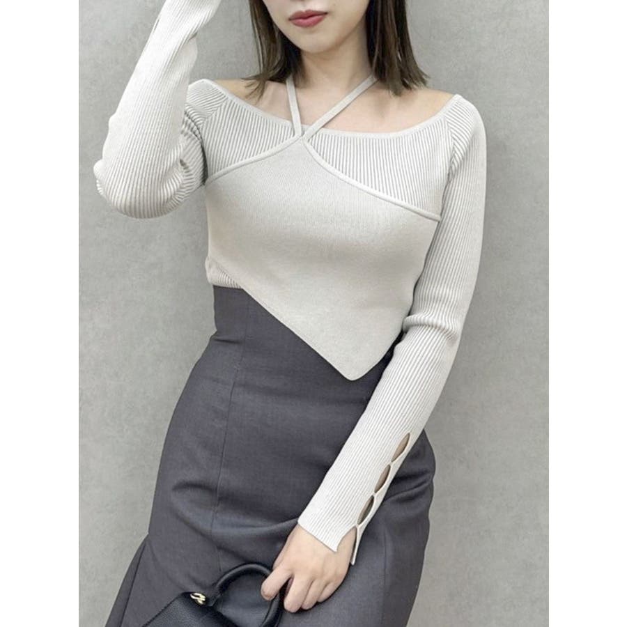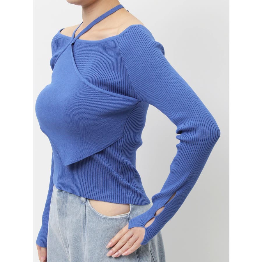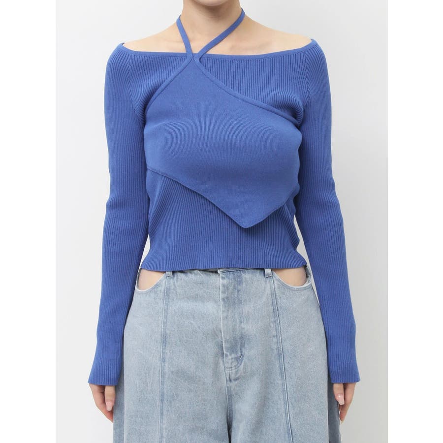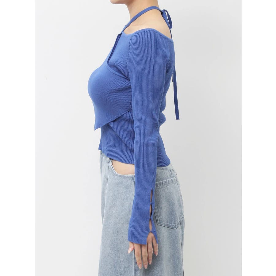 【商品】レイヤードしたデザインでシャープさを演出。身頃部分はリブ編みでボディラインをコンパクトに仕上げます。細目のストラップでネックラインはシャープに見せて華奢見えを叶えます。【スタイリング】デニムパンツを合わせたアウトスタイリングがおすすめ。内側のリブ部分をInしてタイトにまとめて着るとすっきりします。