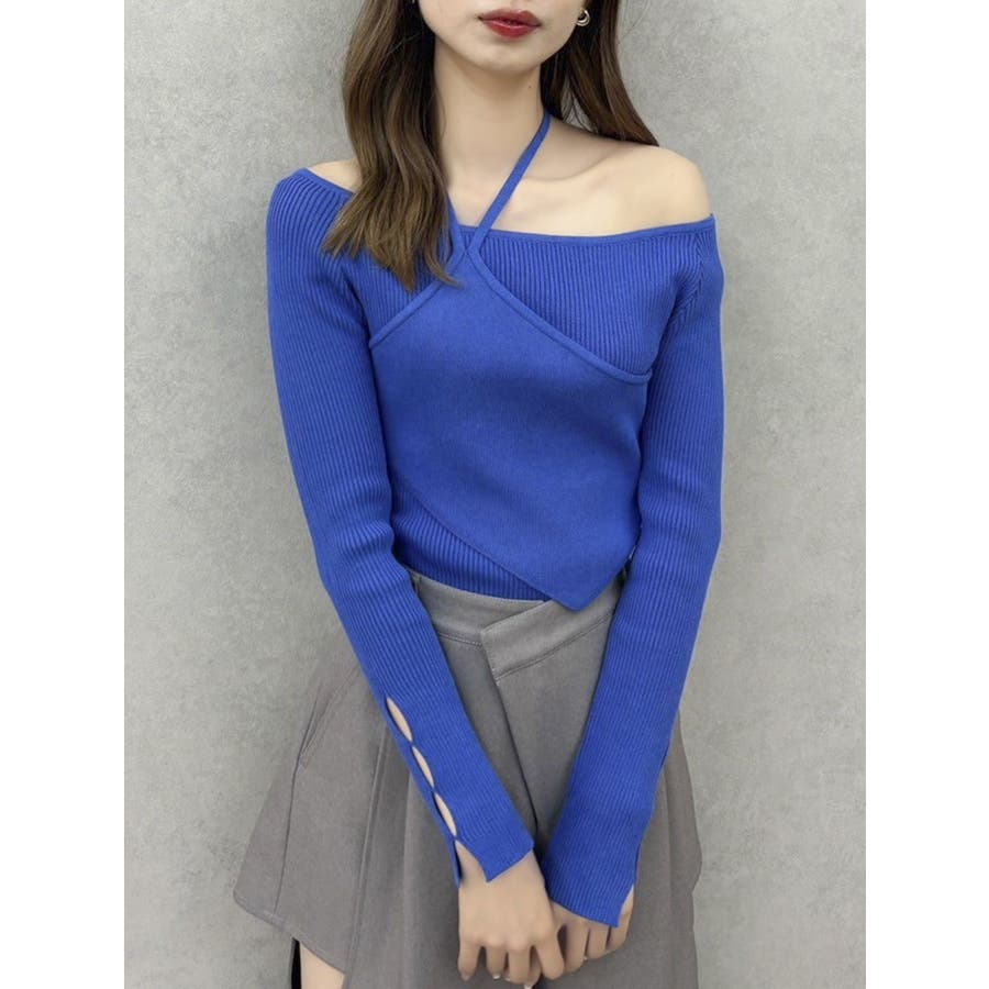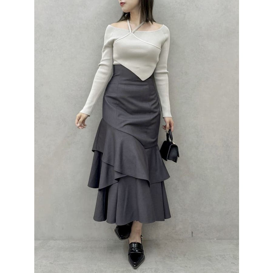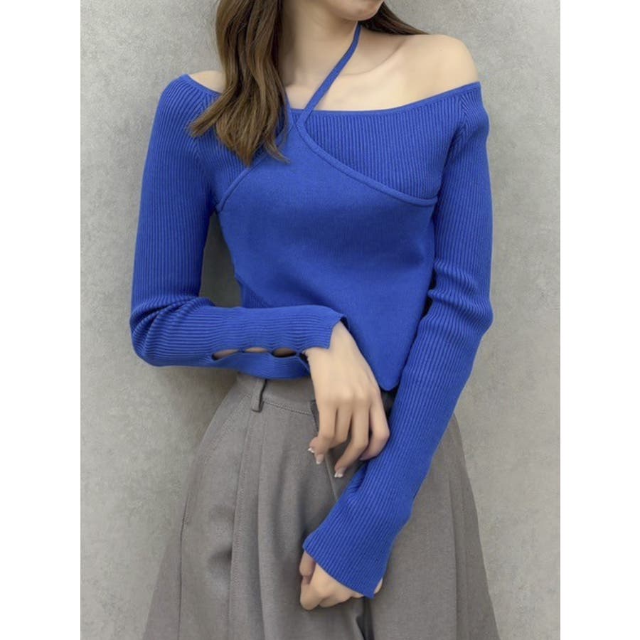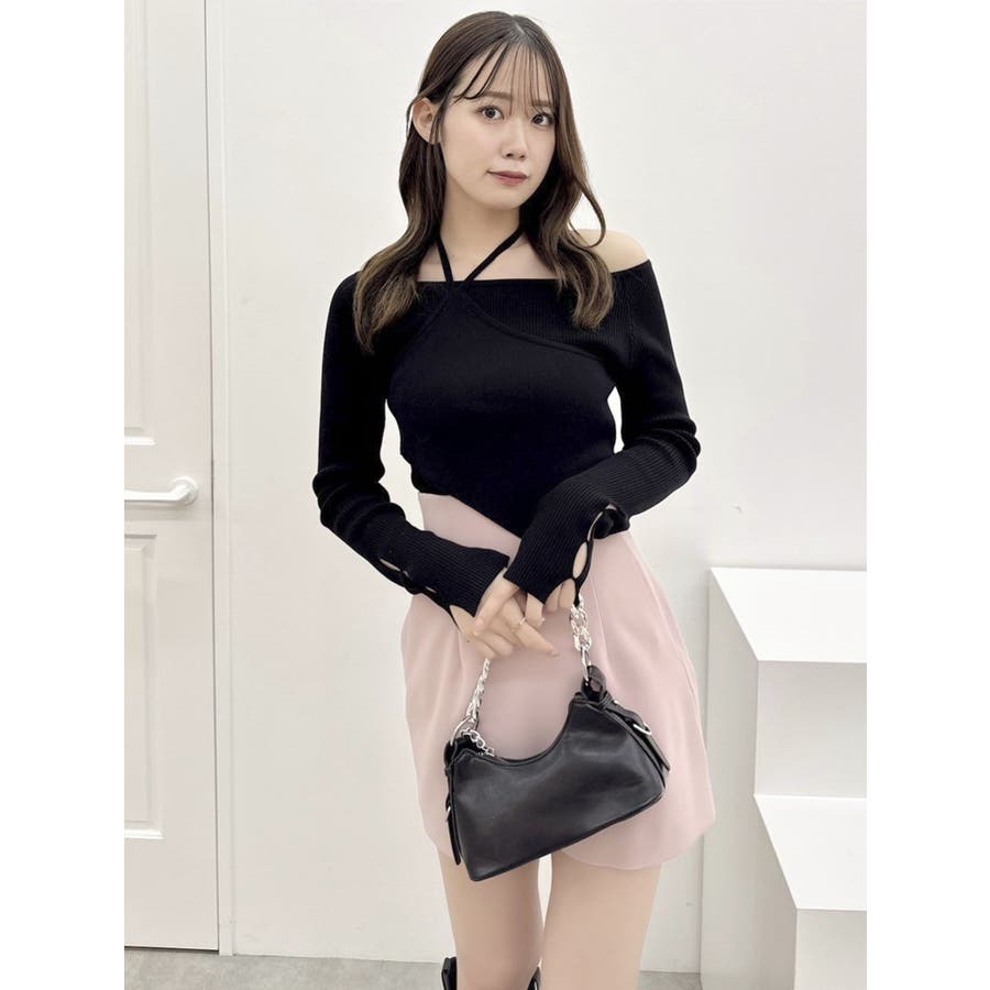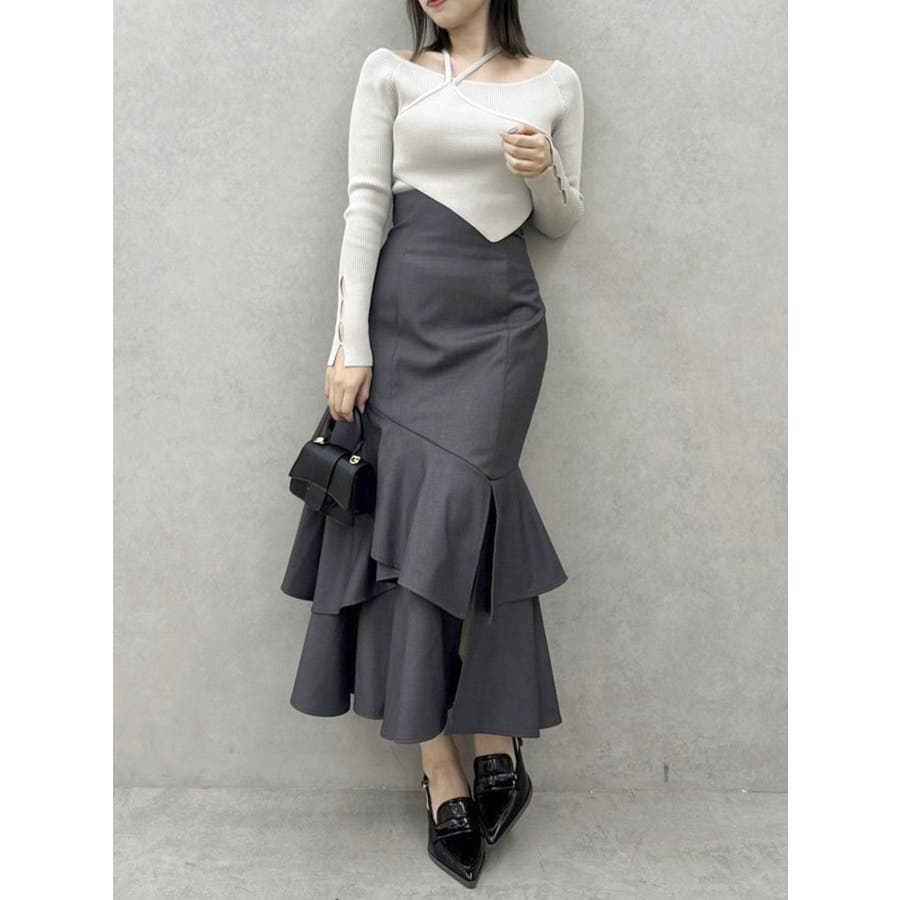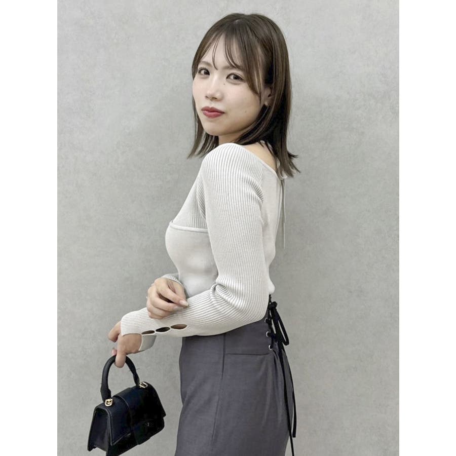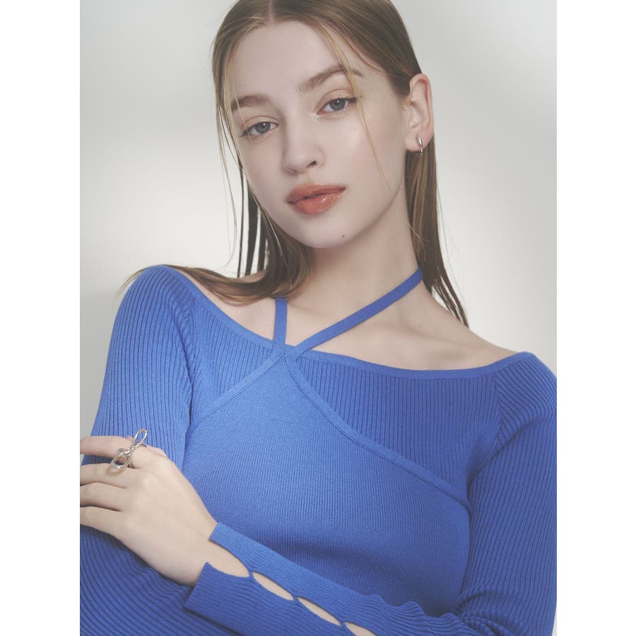 【商品】レイヤードしたデザインでシャープさを演出。身頃部分はリブ編みでボディラインをコンパクトに仕上げます。細目のストラップでネックラインはシャープに見せて華奢見えを叶えます。【スタイリング】デニムパンツを合わせたアウトスタイリングがおすすめ。内側のリブ部分をInしてタイトにまとめて着るとすっきりします。