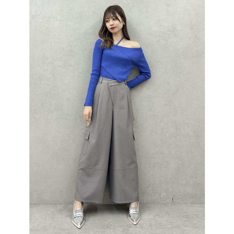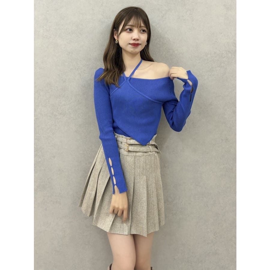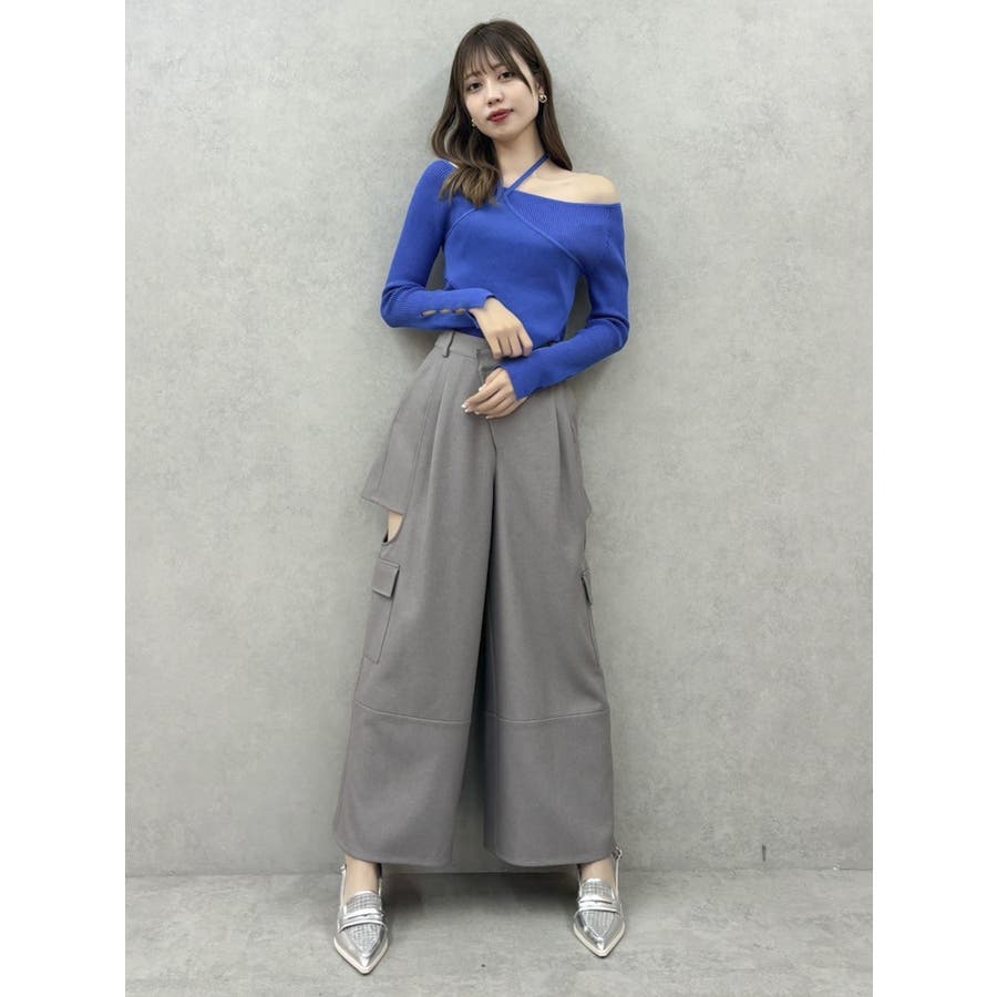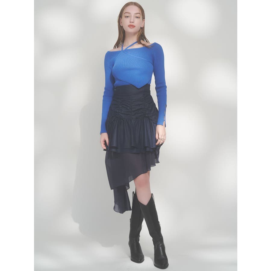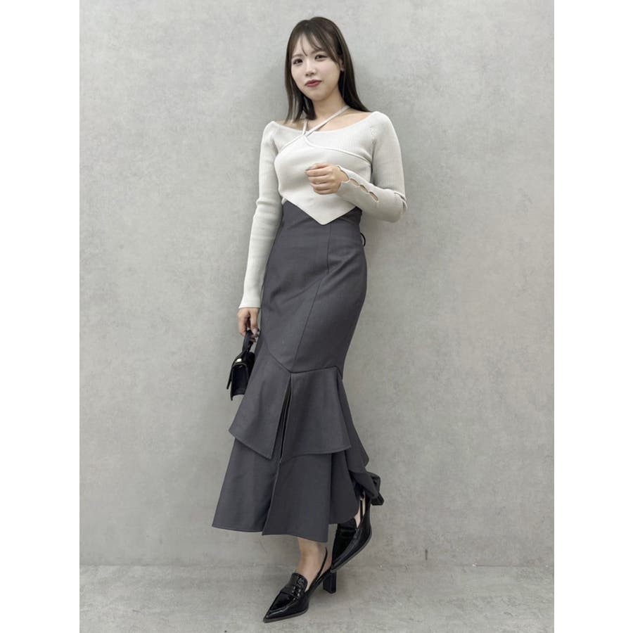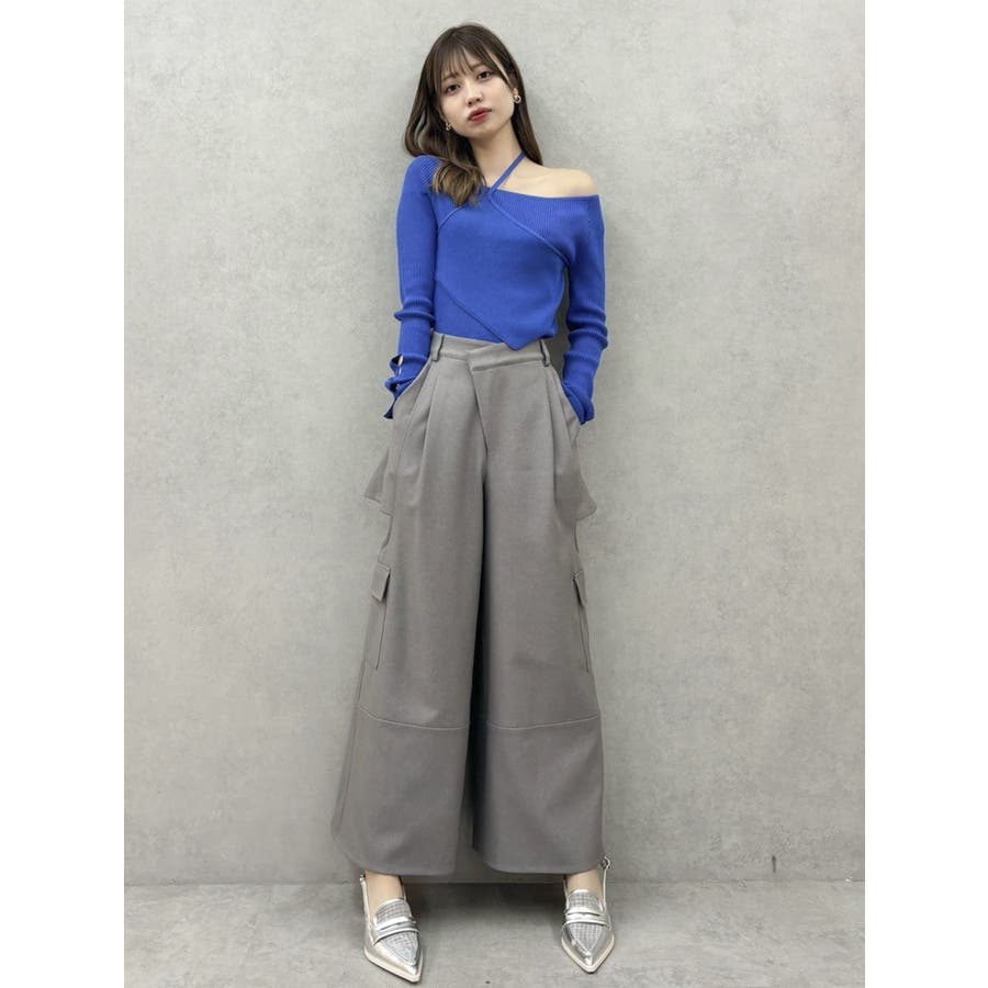【商品】レイヤードしたデザインでシャープさを演出。身頃部分はリブ編みでボディラインをコンパクトに仕上げます。細目のストラップでネックラインはシャープに見せて華奢見えを叶えます。【スタイリング】デニムパンツを合わせたアウトスタイリングがおすすめ。内側のリブ部分をInしてタイトにまとめて着るとすっきりします。
