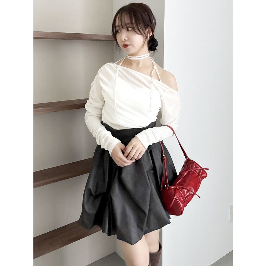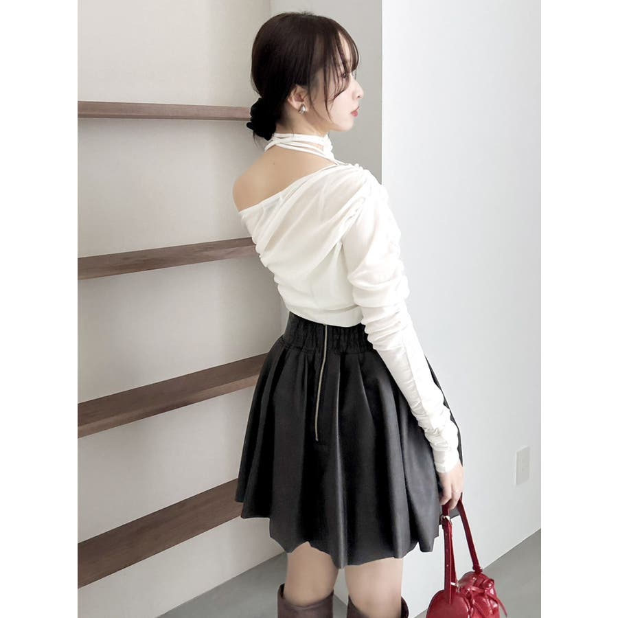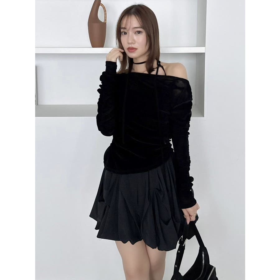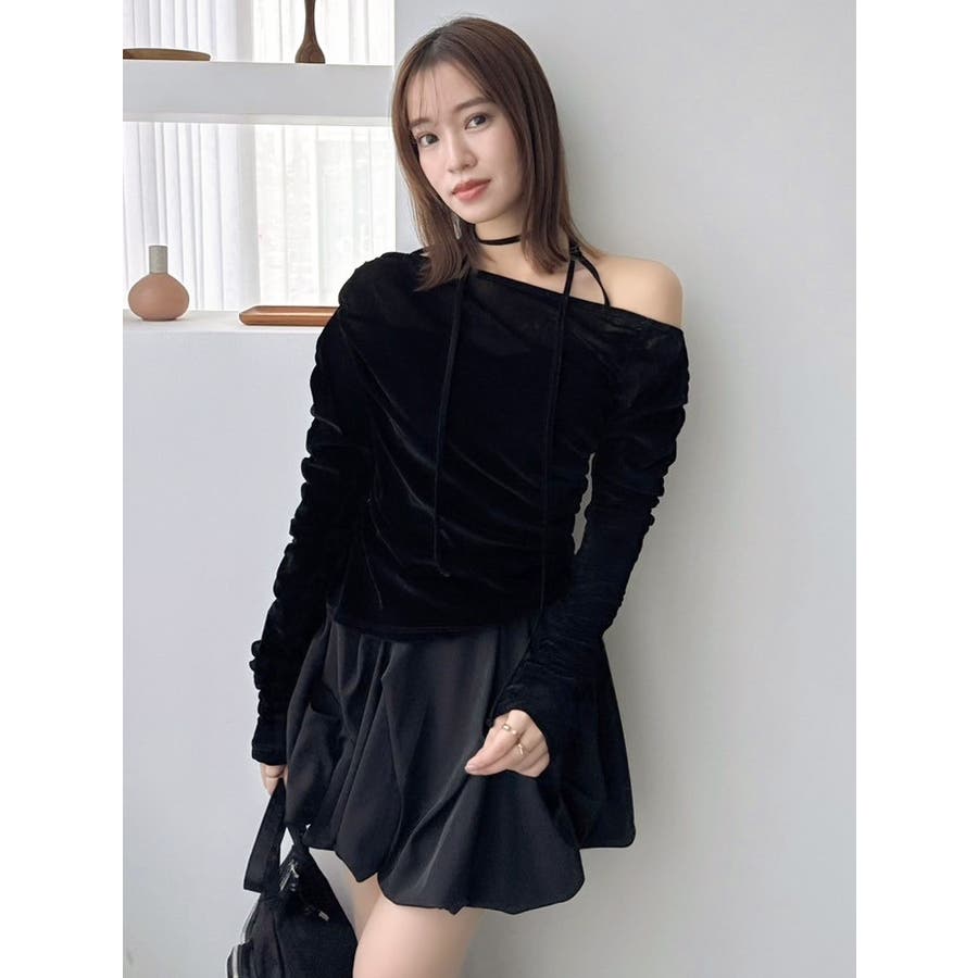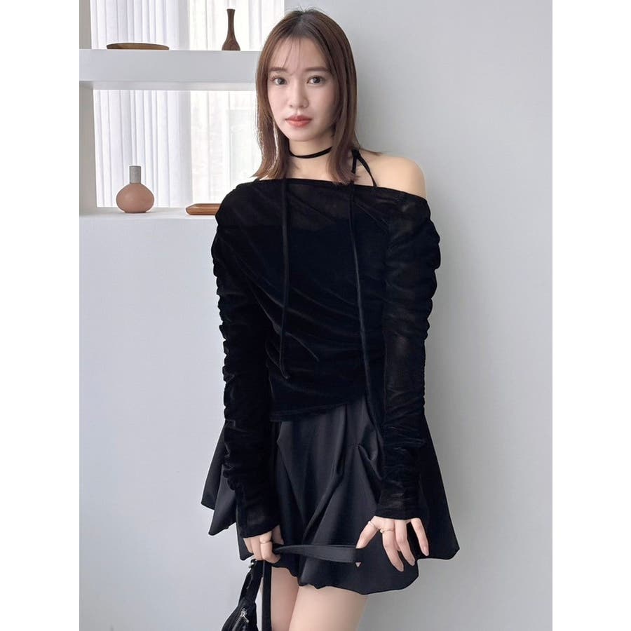 【商品】アシンメトリーなギャザーが効いたトレンド感度の高いデザイントップス。チュールにベロアをボンディングした素材を使用し、程よい温もりもありながら内側をチュールにすることで春まで着れる軽やかな肌触りが特徴です。 【スタイリング】チョーカーは韓国ライクに左側で結ぶか、結ばず前にたらすのがおすすめです。裾はボトムスにインアウト両方可能。ミニやIラインスカートにインでフェミニンコーデはもちろん、デニムパンツにアウトでヘルシーな着こなしも楽しめます。