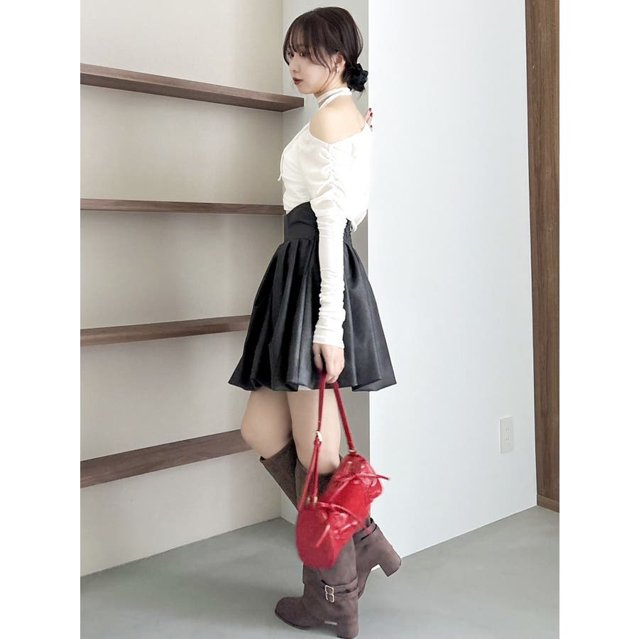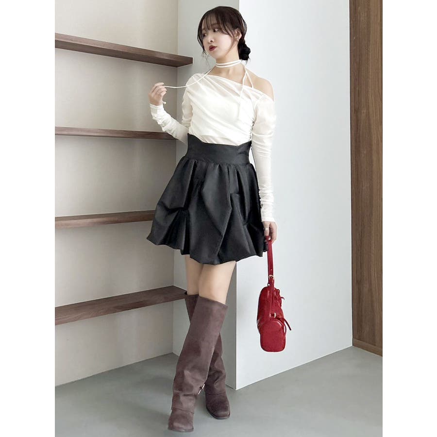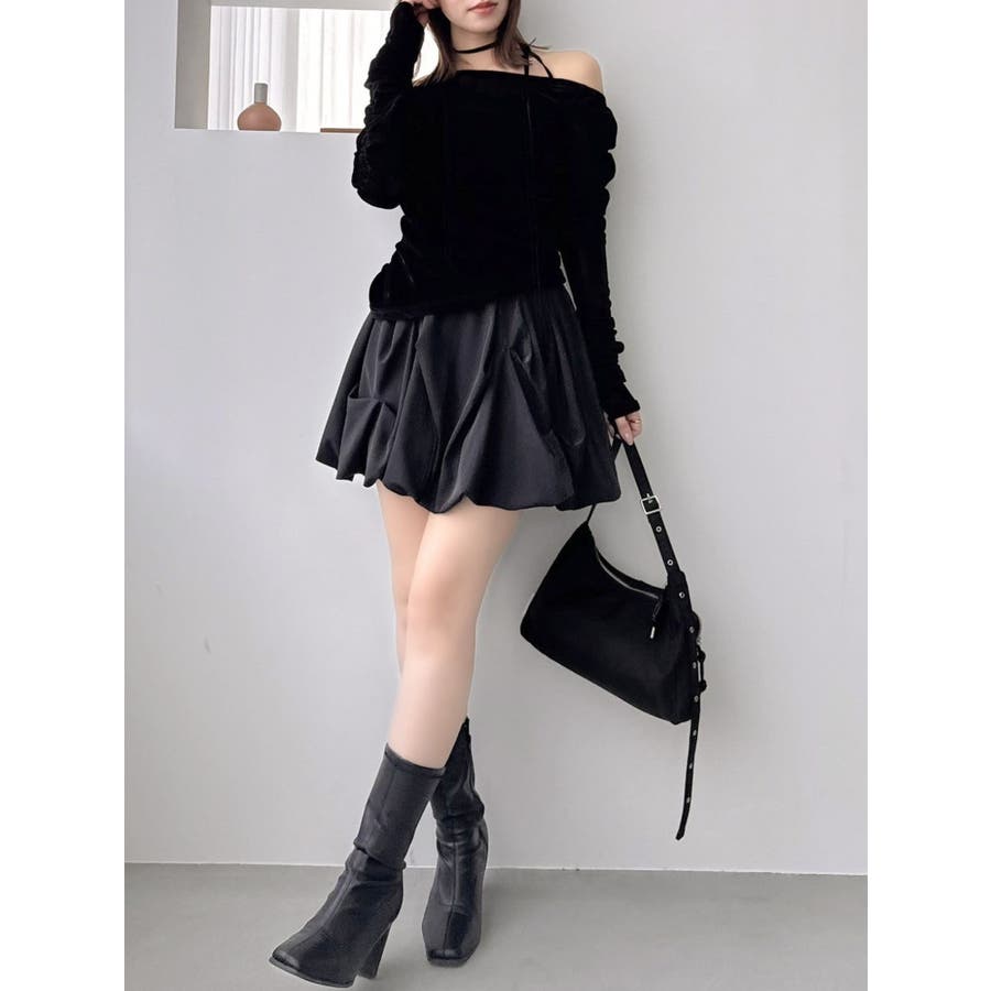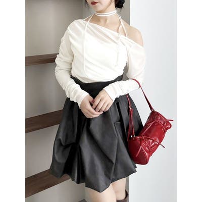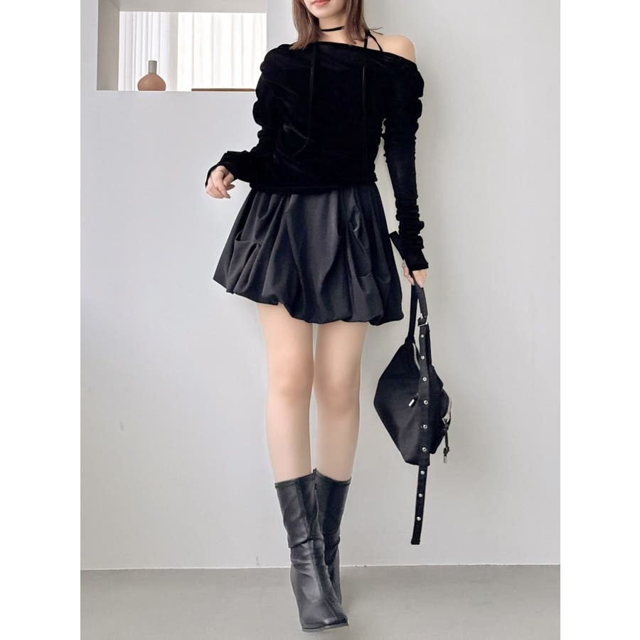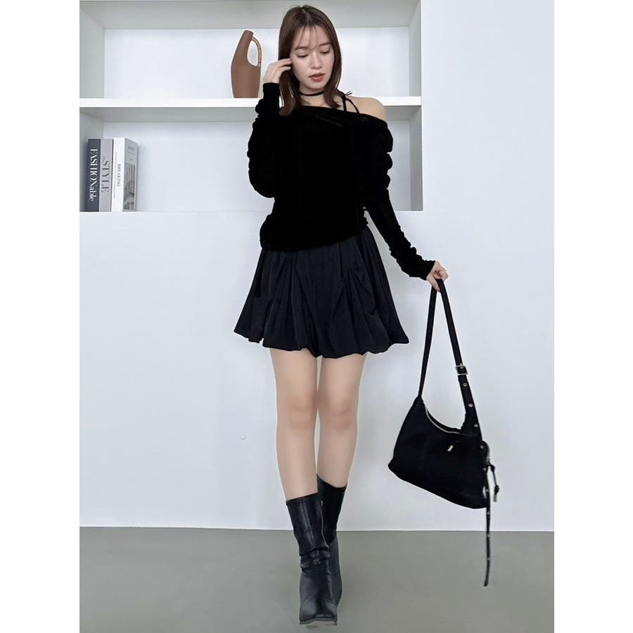 【商品】アシンメトリーなギャザーが効いたトレンド感度の高いデザイントップス。チュールにベロアをボンディングした素材を使用し、程よい温もりもありながら内側をチュールにすることで春まで着れる軽やかな肌触りが特徴です。 【スタイリング】チョーカーは韓国ライクに左側で結ぶか、結ばず前にたらすのがおすすめです。裾はボトムスにインアウト両方可能。ミニやIラインスカートにインでフェミニンコーデはもちろん、デニムパンツにアウトでヘルシーな着こなしも楽しめます。