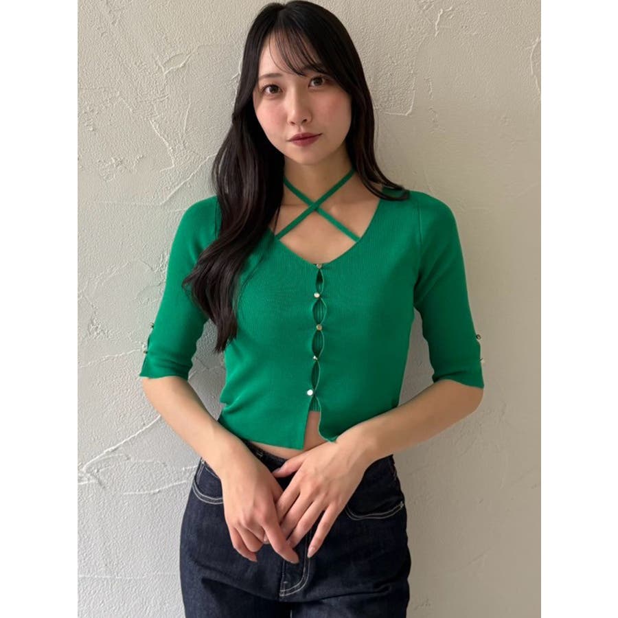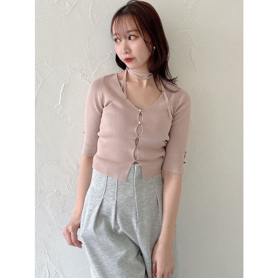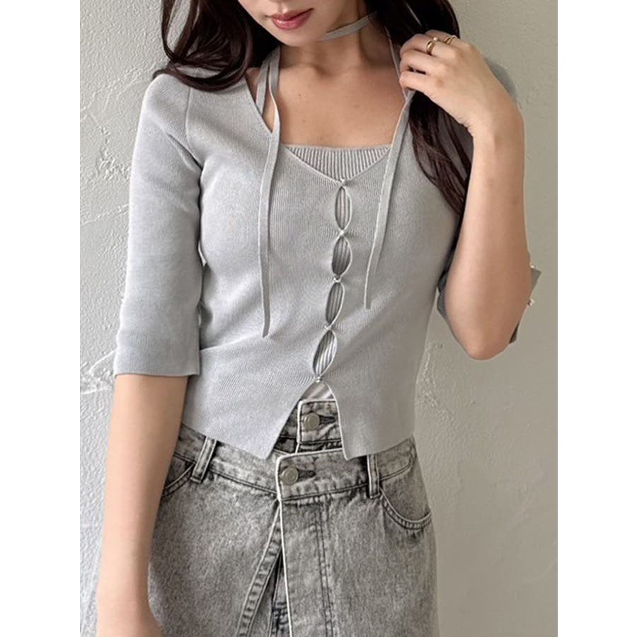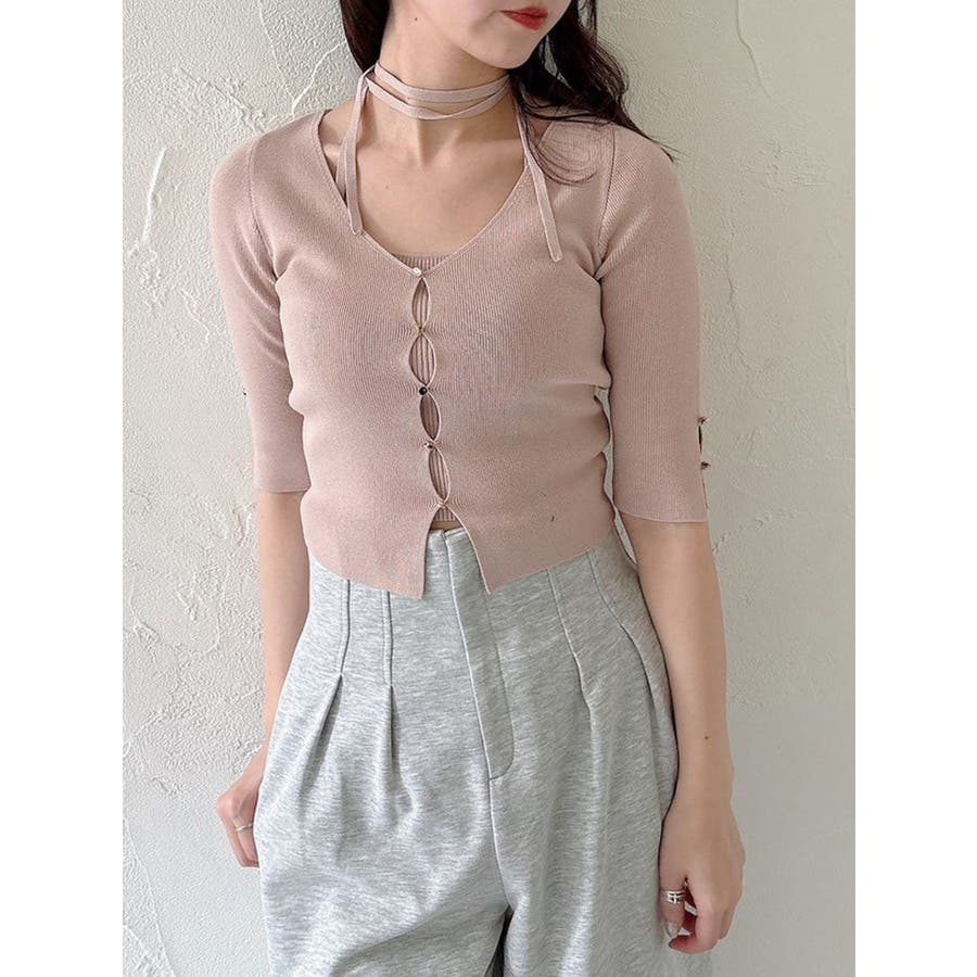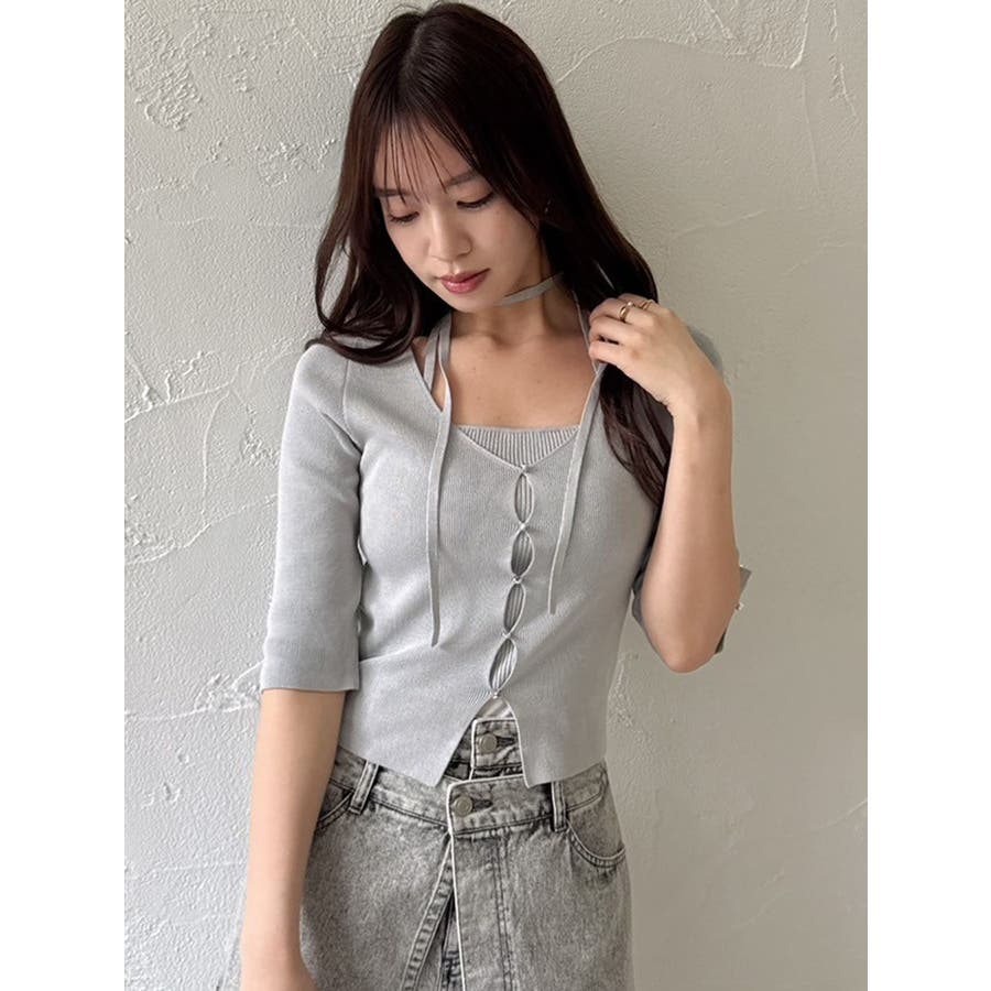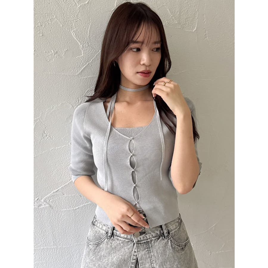 【商品】フロントのチョーカーデザインが一癖放つアイテム。カーデの中にキャミソールを着ているような1枚で手軽にレイヤードスタイルが叶います。表と中で編地を変えており、さりげなさを演出。どんなアイテムにも万能にマッチするのが特徴です。【スタイリング】ボリュームスカート合わせでフェミニンにまとめたり、パンツスタイル合わせでクールなスタイリングにも組み合わせ可能です。