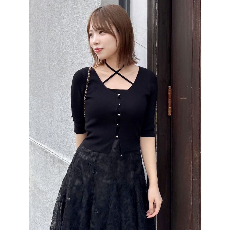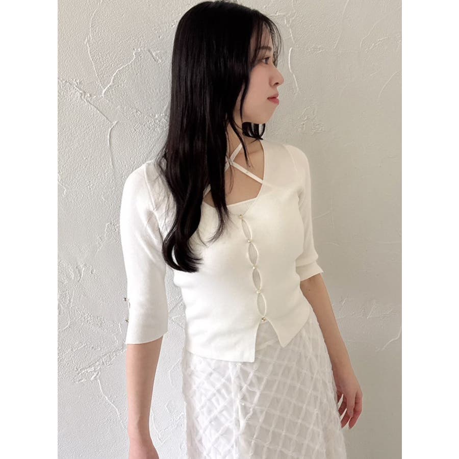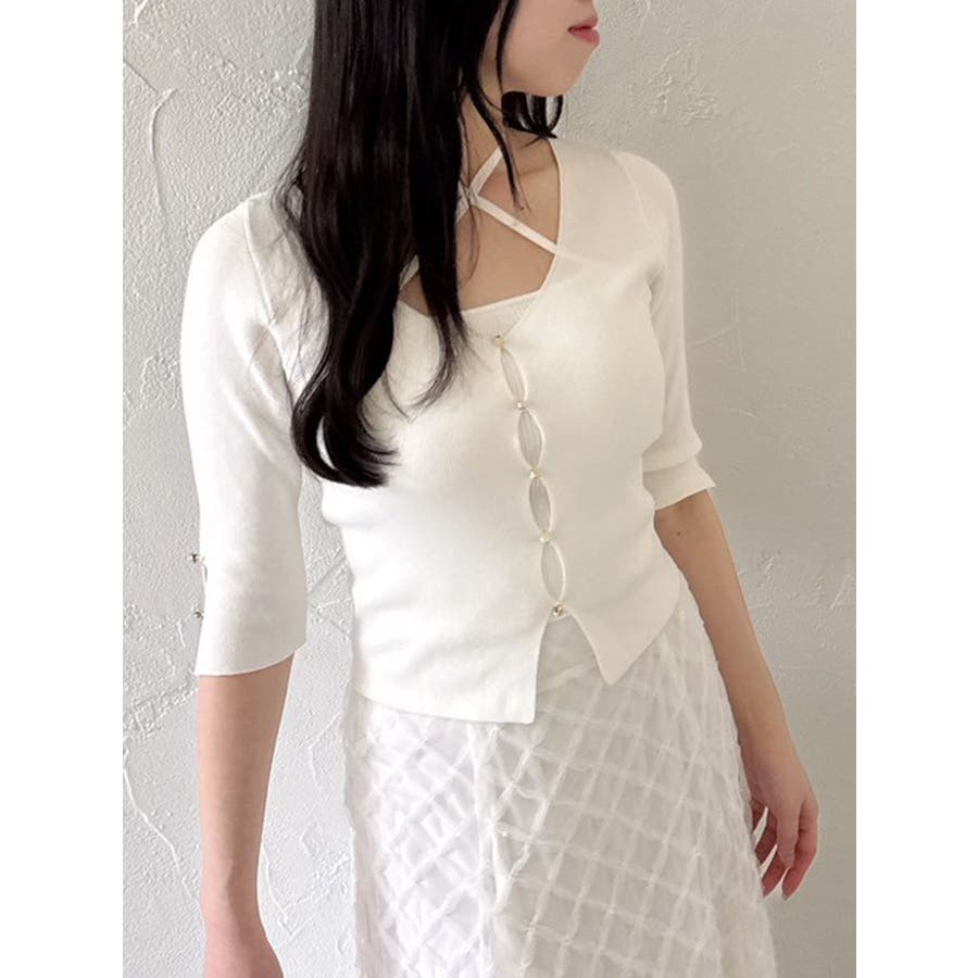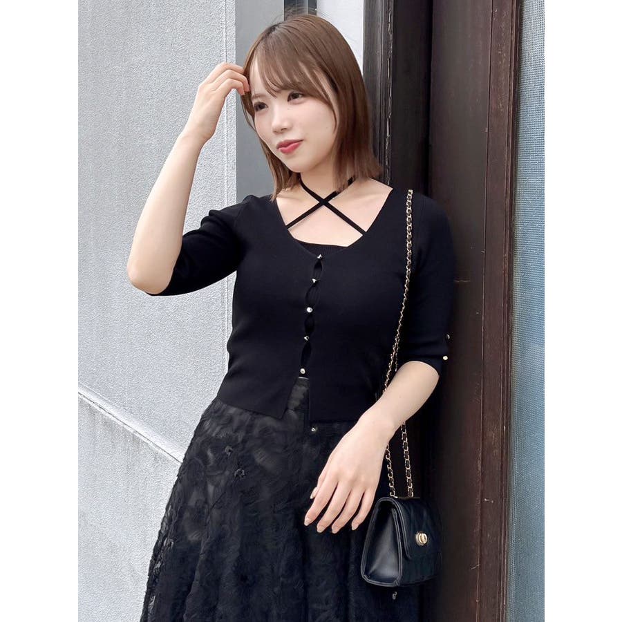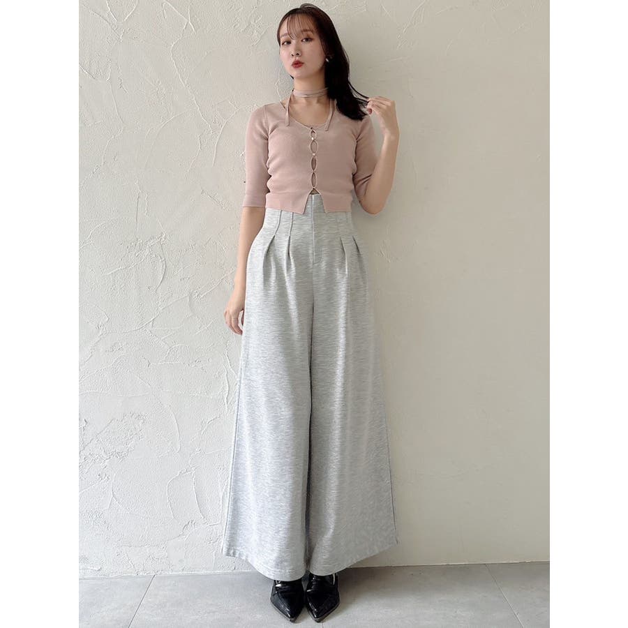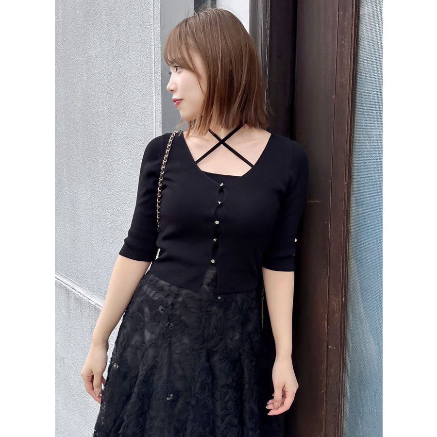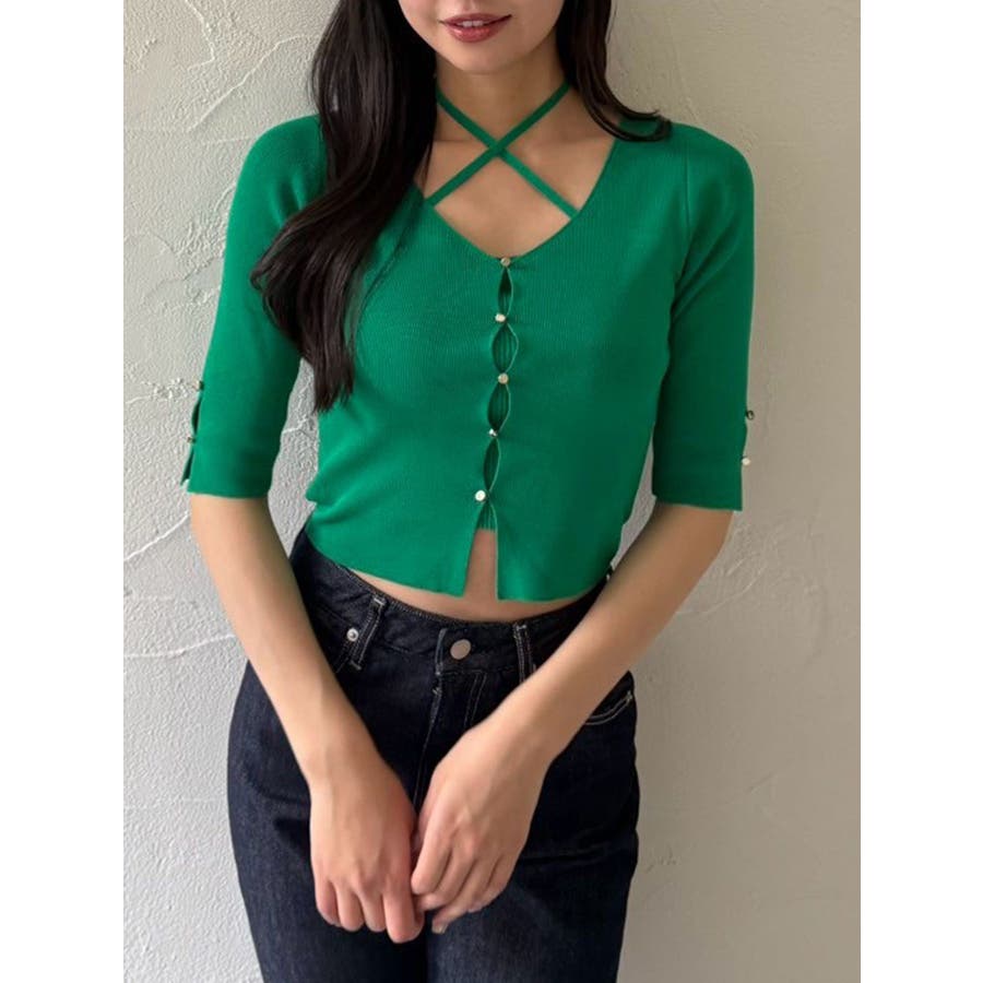 【商品】フロントのチョーカーデザインが一癖放つアイテム。カーデの中にキャミソールを着ているような1枚で手軽にレイヤードスタイルが叶います。表と中で編地を変えており、さりげなさを演出。どんなアイテムにも万能にマッチするのが特徴です。【スタイリング】ボリュームスカート合わせでフェミニンにまとめたり、パンツスタイル合わせでクールなスタイリングにも組み合わせ可能です。