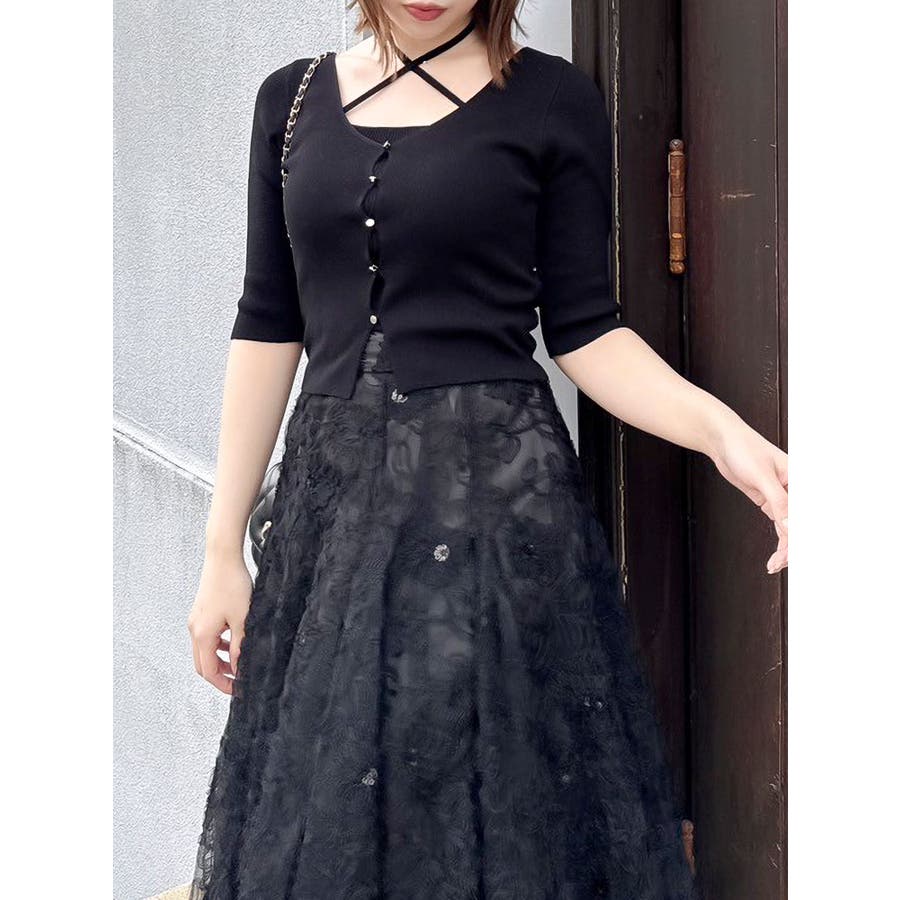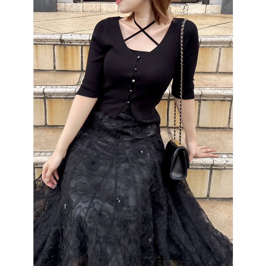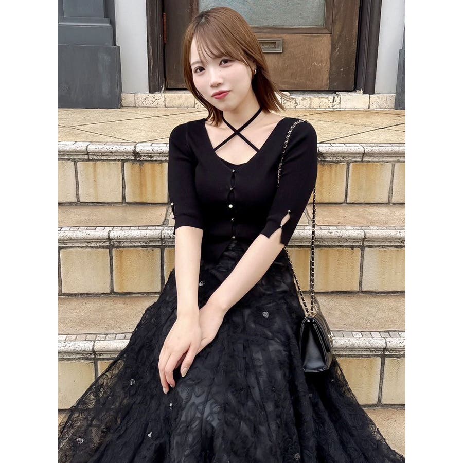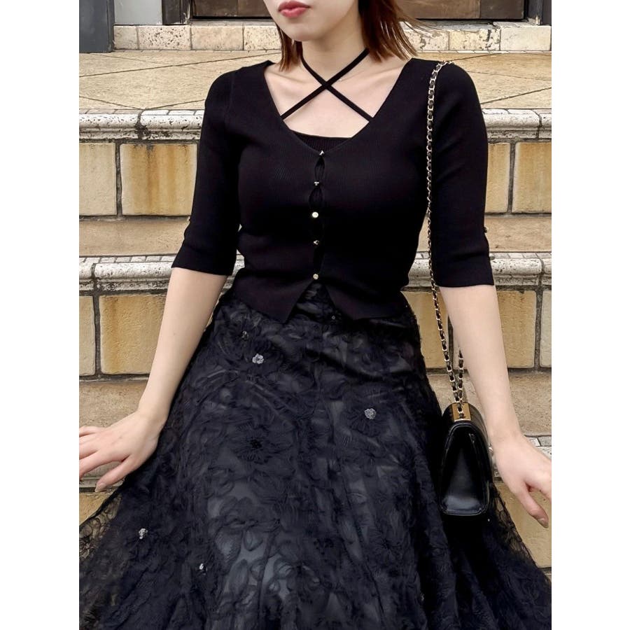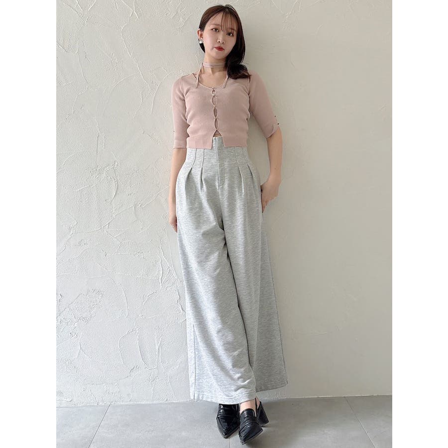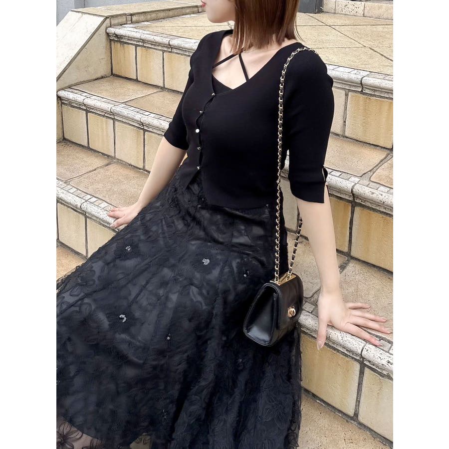 【商品】フロントのチョーカーデザインが一癖放つアイテム。カーデの中にキャミソールを着ているような1枚で手軽にレイヤードスタイルが叶います。表と中で編地を変えており、さりげなさを演出。どんなアイテムにも万能にマッチするのが特徴です。【スタイリング】ボリュームスカート合わせでフェミニンにまとめたり、パンツスタイル合わせでクールなスタイリングにも組み合わせ可能です。