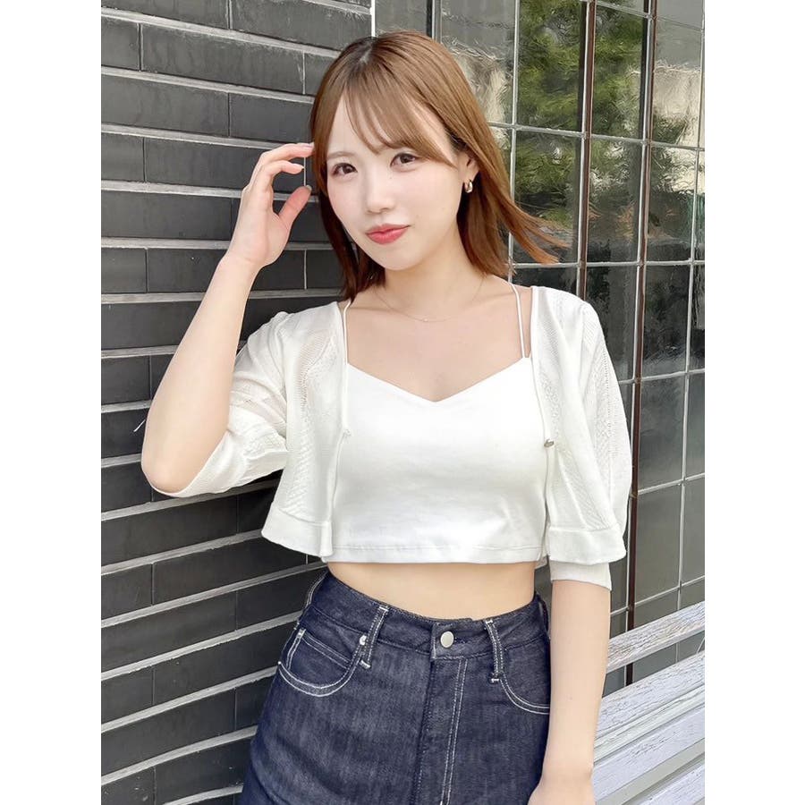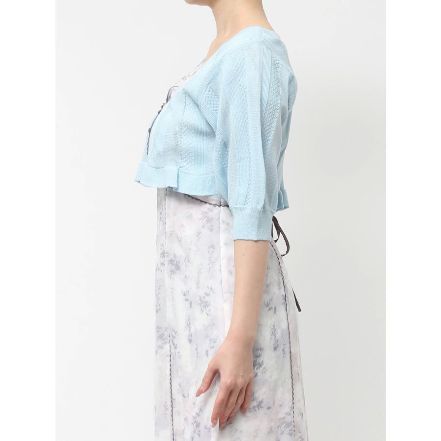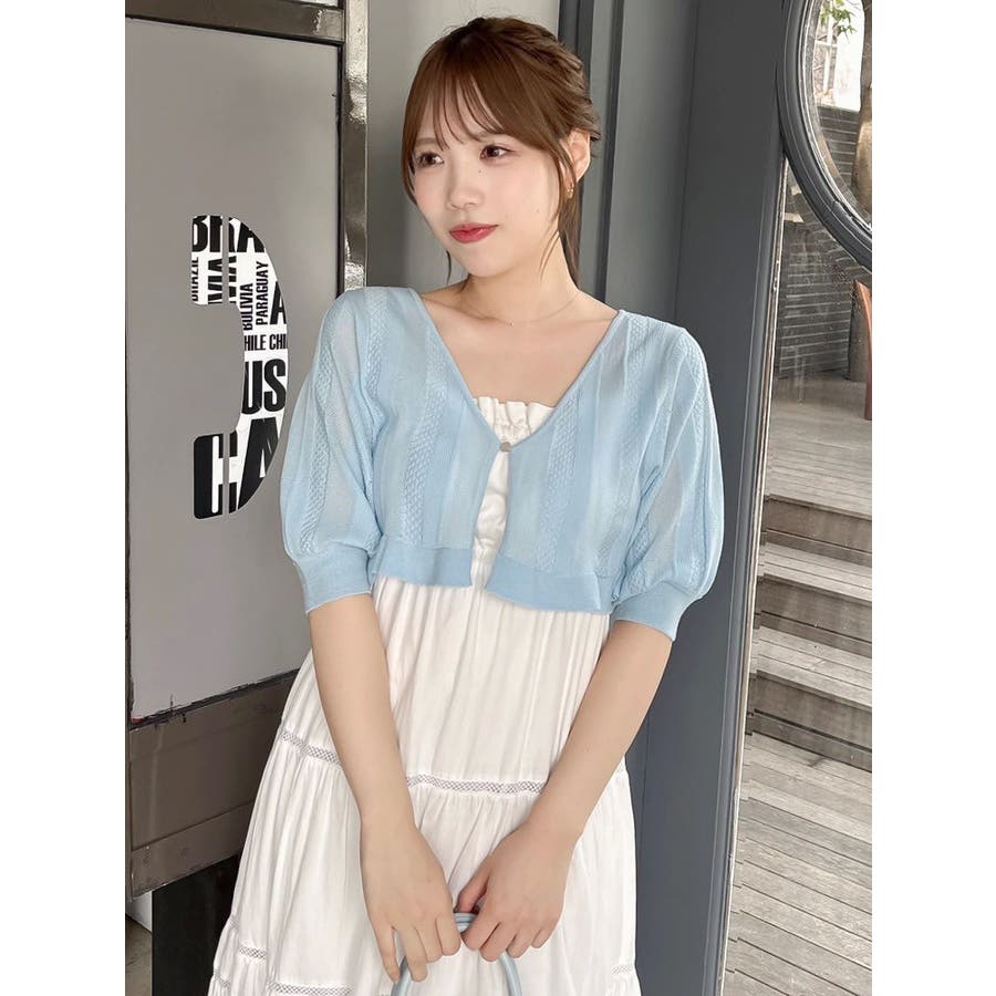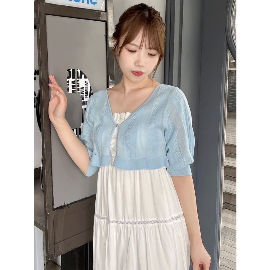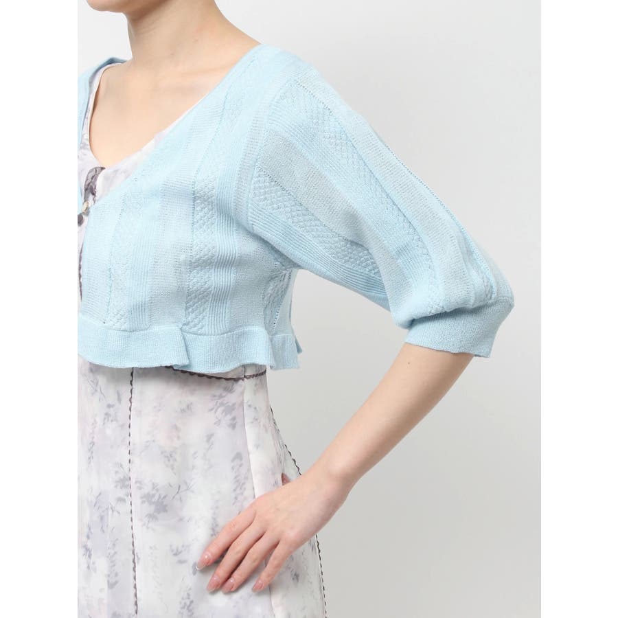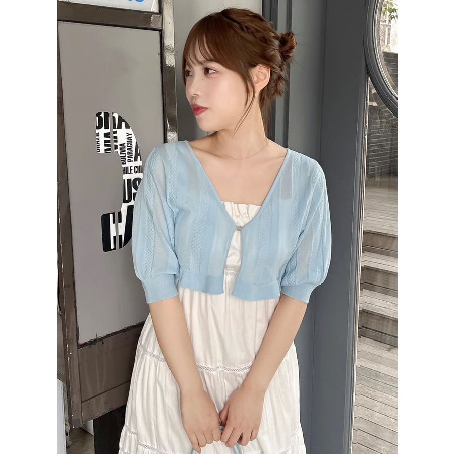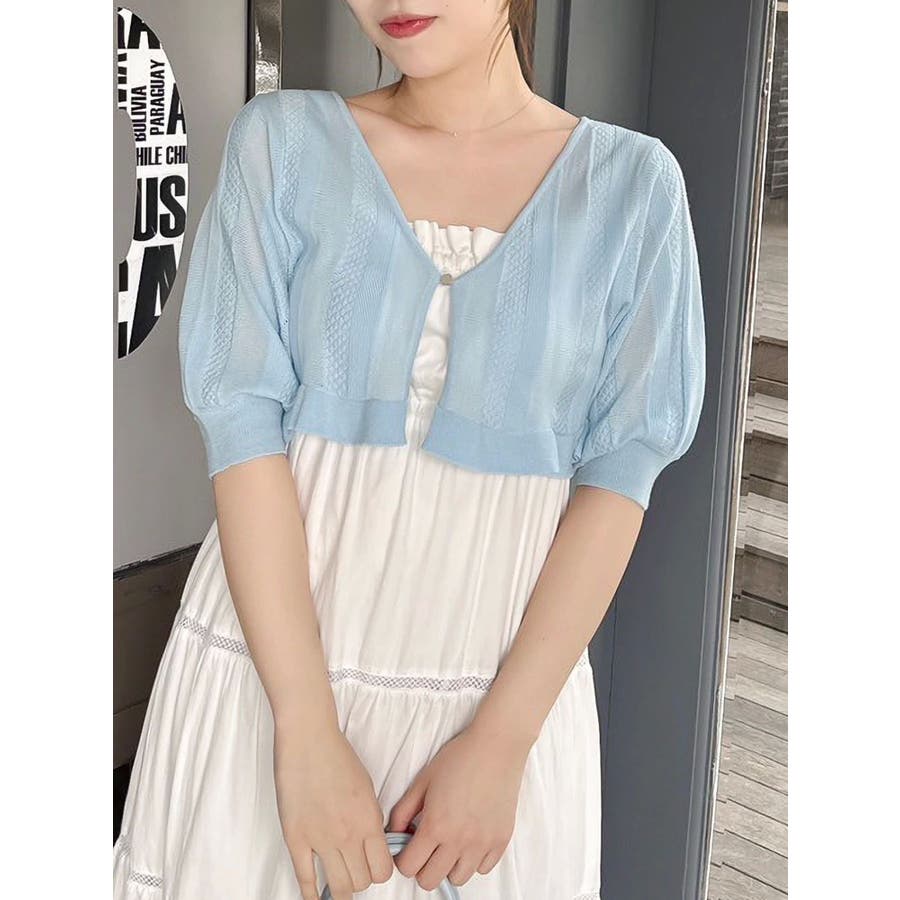 【商品】袖周りがコンパクトにフィットしたデザイン。ノースリーブアイテムとの組み合わせが最適です。シアー素材の糸で編み上げ且つほのかにキラリと光る糸を使用しているので暑苦しさのない所が特徴です。【スタイリング】コルセットワンピースなど切り替え位置が高めのアイテムにお勧めです。袖なしモノに合わせて日よけや露出の軽減に。