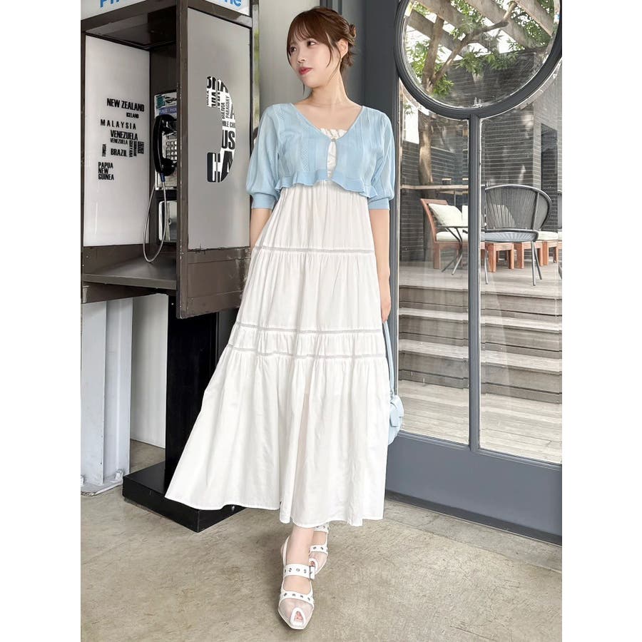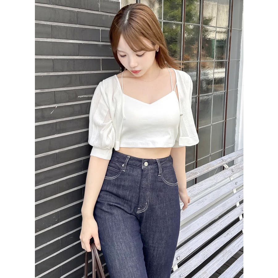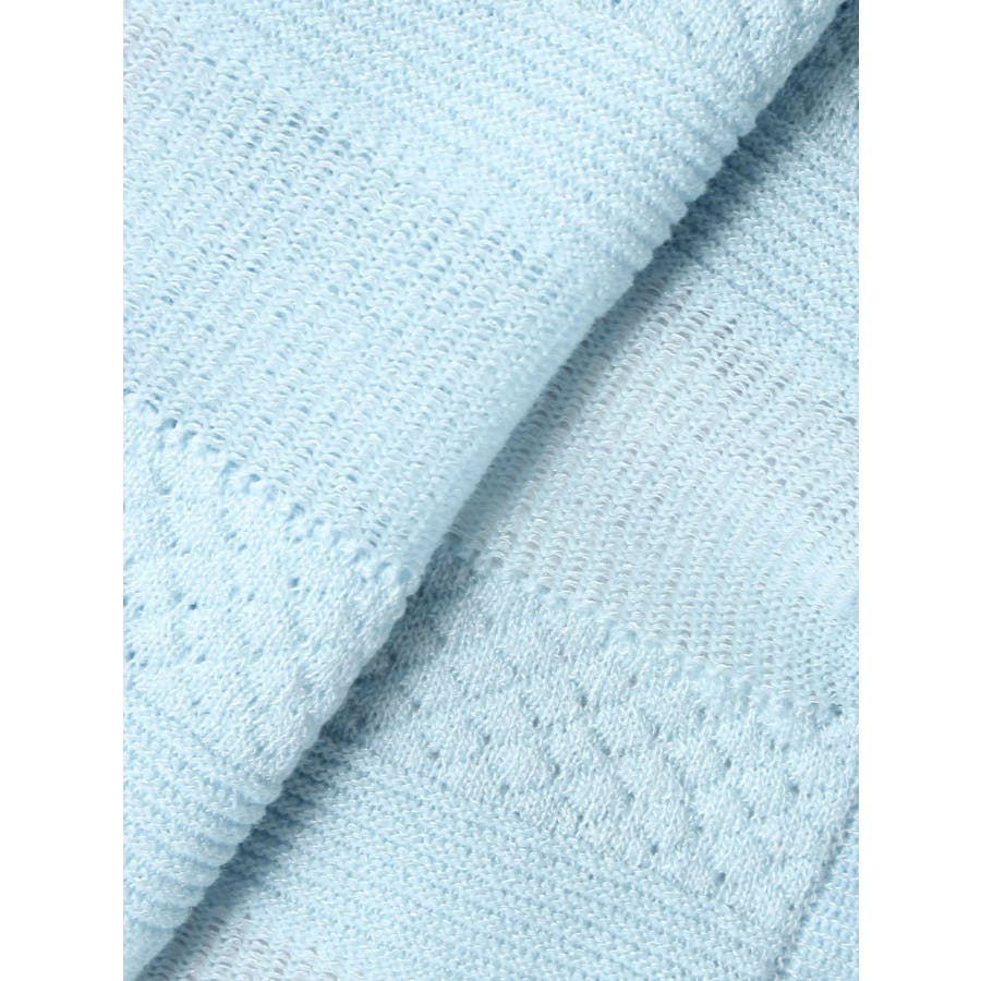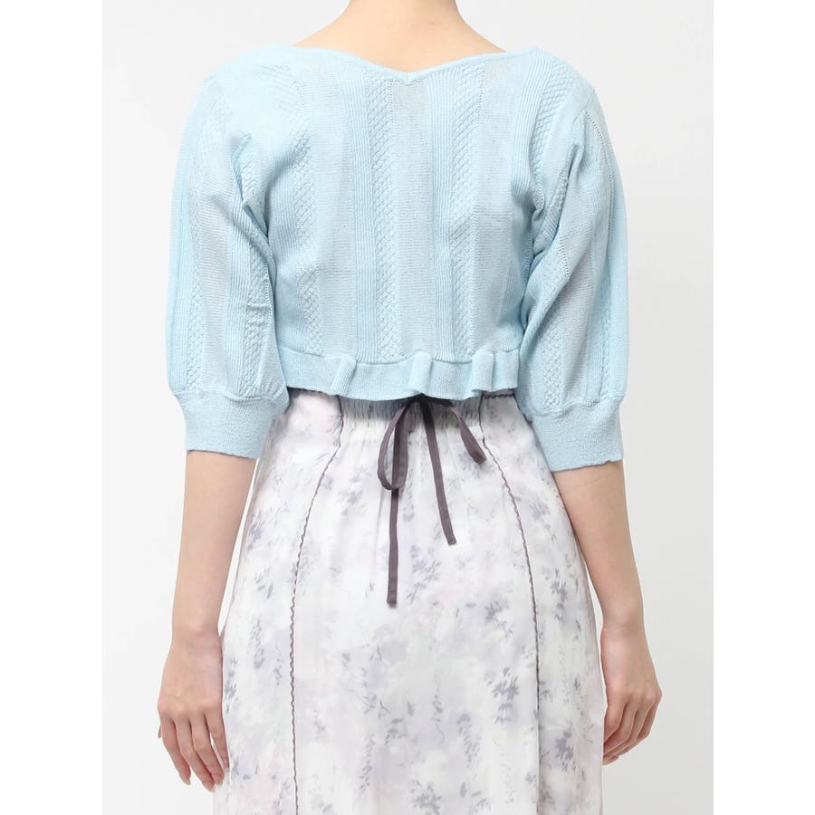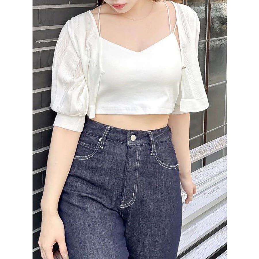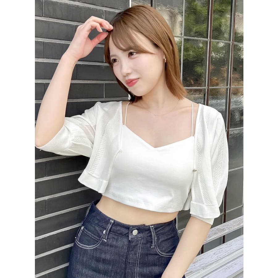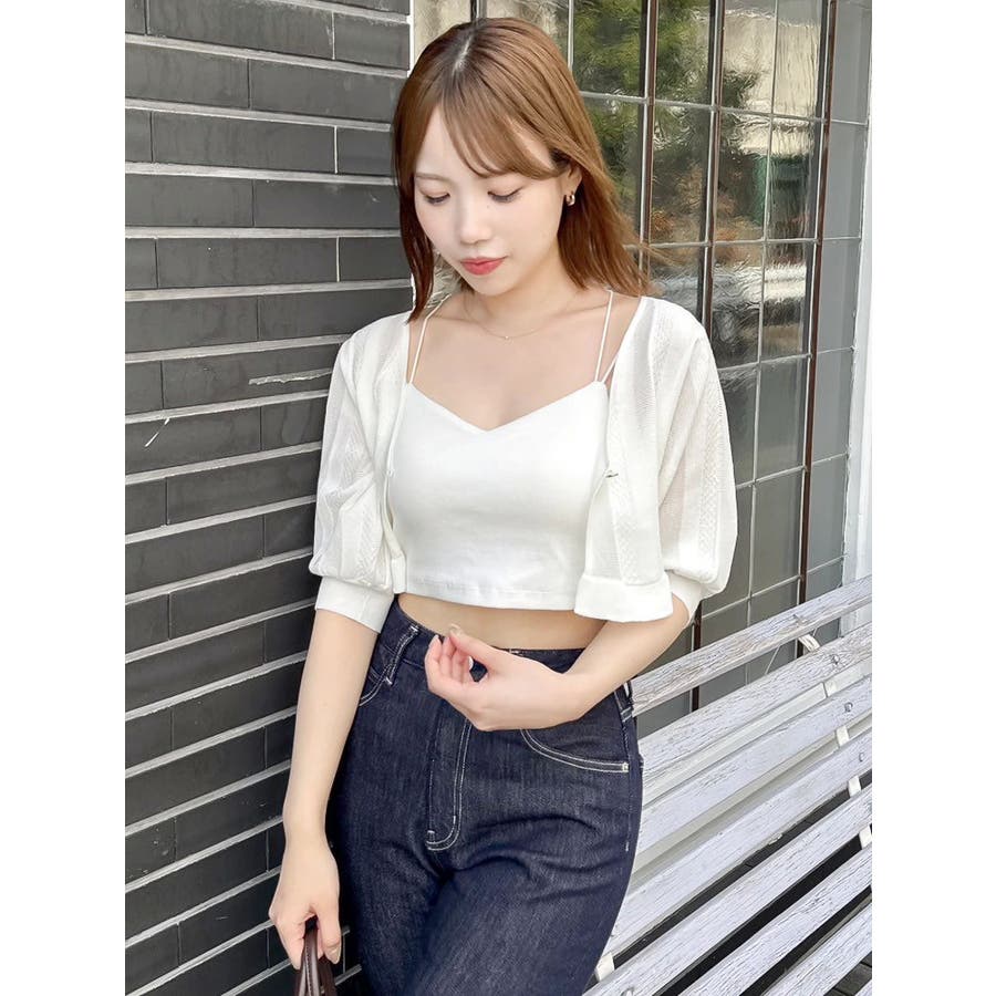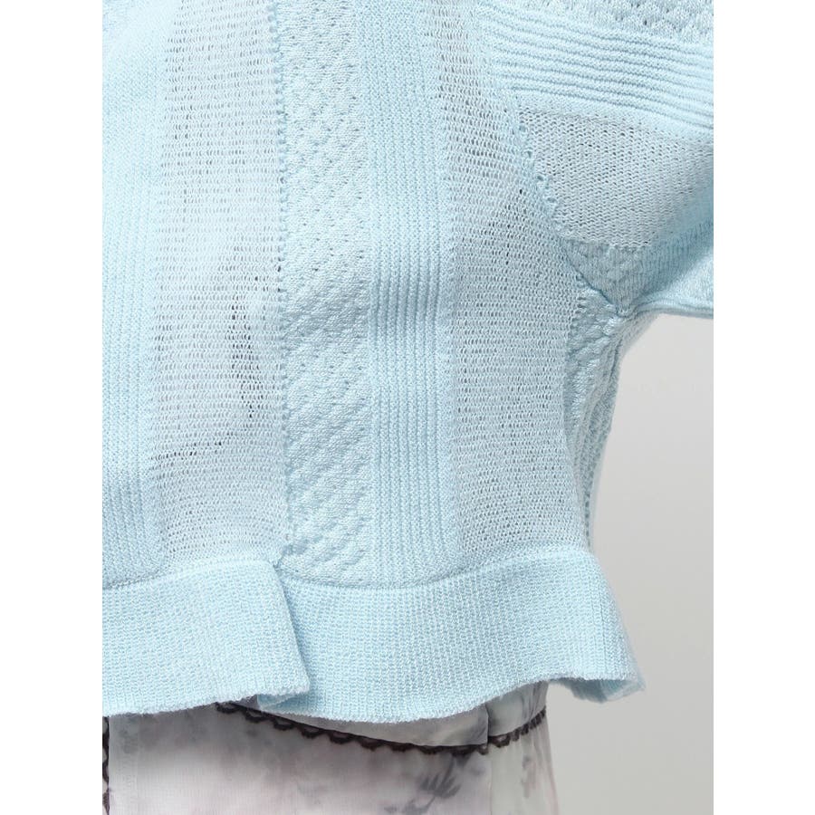 【商品】袖周りがコンパクトにフィットしたデザイン。ノースリーブアイテムとの組み合わせが最適です。シアー素材の糸で編み上げ且つほのかにキラリと光る糸を使用しているので暑苦しさのない所が特徴です。【スタイリング】コルセットワンピースなど切り替え位置が高めのアイテムにお勧めです。袖なしモノに合わせて日よけや露出の軽減に。