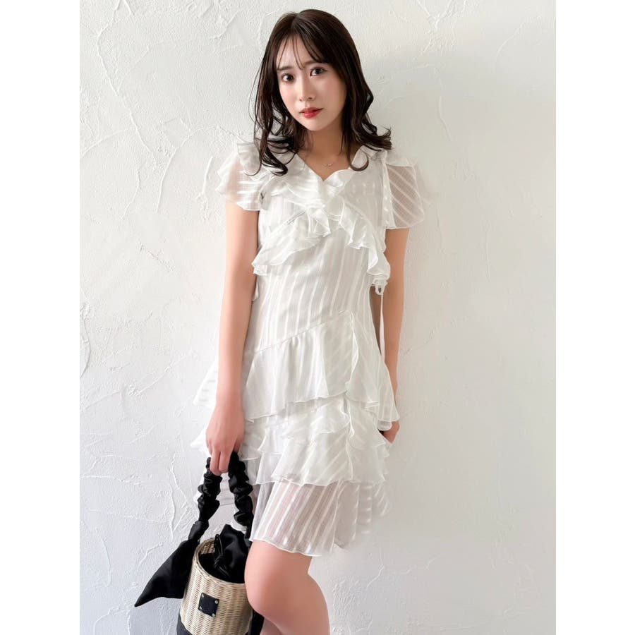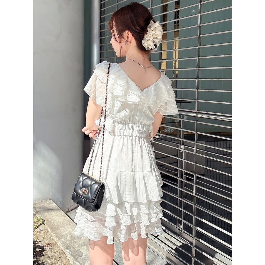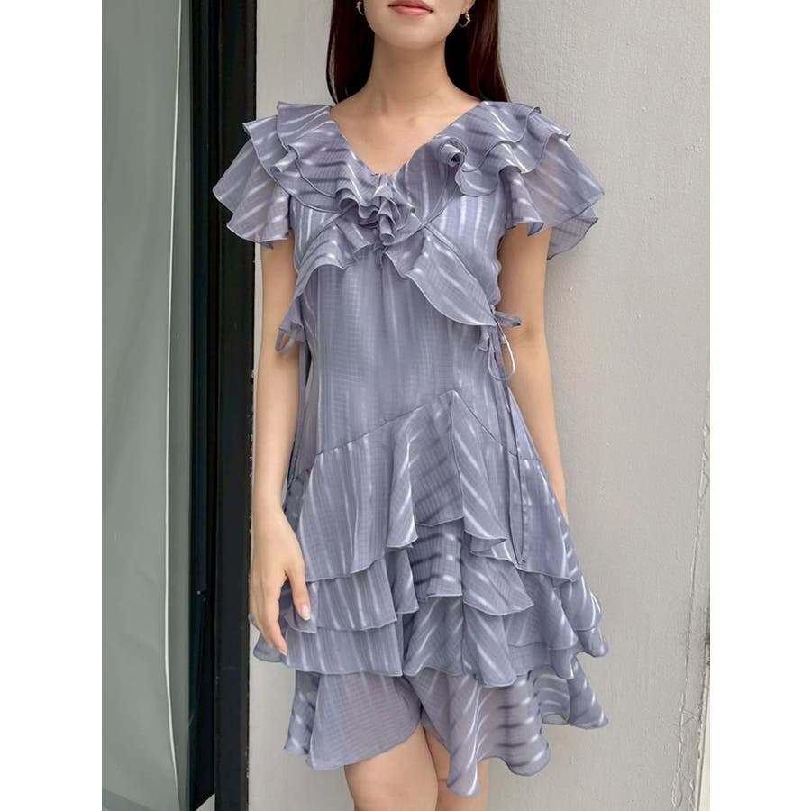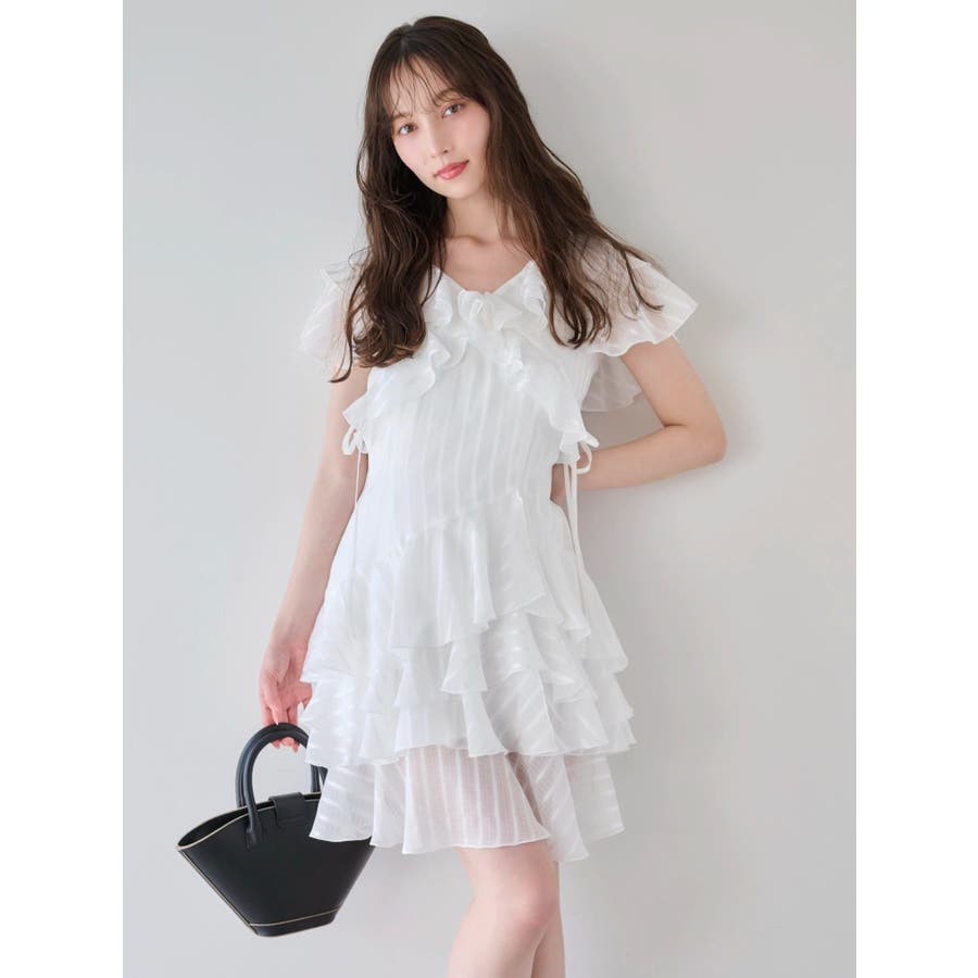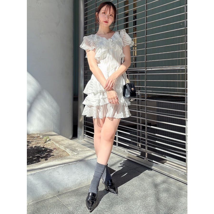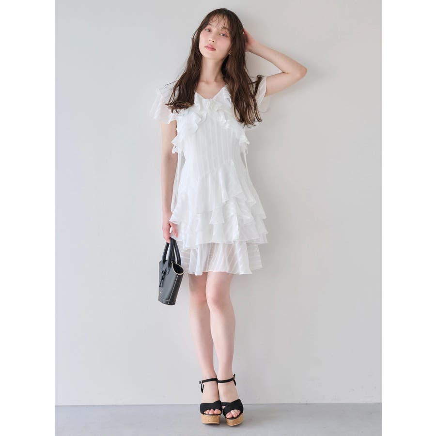 \大人気のワンピースがミニ丈になりました!/>>ロング丈はこちらから<<【アイテム】 ロマンティックなラッフルティアードデザインを取り入れつつ、軽やかで遊び心のあるシルエットに仕上げました。 艶と透け感のある素材が、歩くたびにふんわりと揺れて女性らしさを引き立てます。 袖のフリルが肩まわりをやさしくカバーし、Vネック×フロントリボンで甘さと抜け感を両立。 かわいいミニの丈感が、よりアクティブでフレッシュな印象を演出してくれます。 【スタイリング】 ショート丈ジャケットを羽織れば、華やかさを残しつつ大人っぽい印象に。 ライダースを合わせて甘さを程よく引き締めた、辛口フェミニンな着こなしもおすすめです。 カーディガンを合わせれば、可愛らしくやわらかな雰囲気に仕上がります。---------------------------------------------------- 気になるアイテムはお気に入り登録がおすすめ 入荷情報やラスト1点、お得なプライスダウンの情報をいち早くお届け! ぜひご登録ください◎ ---------------------------------------------------- ※実際にお届けする商品と仕様やサイズが異なる場合がございます。 また生産の都合上、お届け時期が前後する場合がございます。 ★STAFFInstagramもチェック