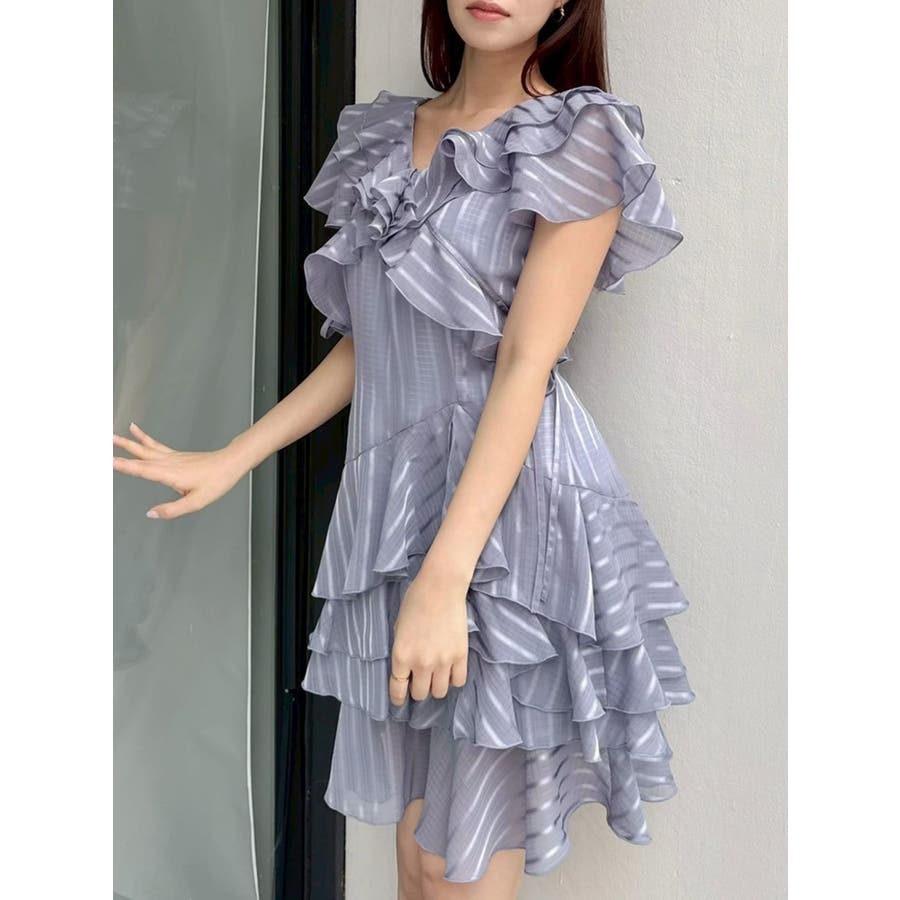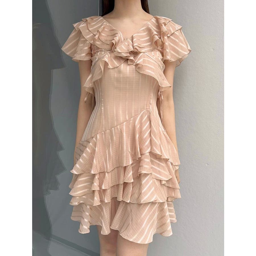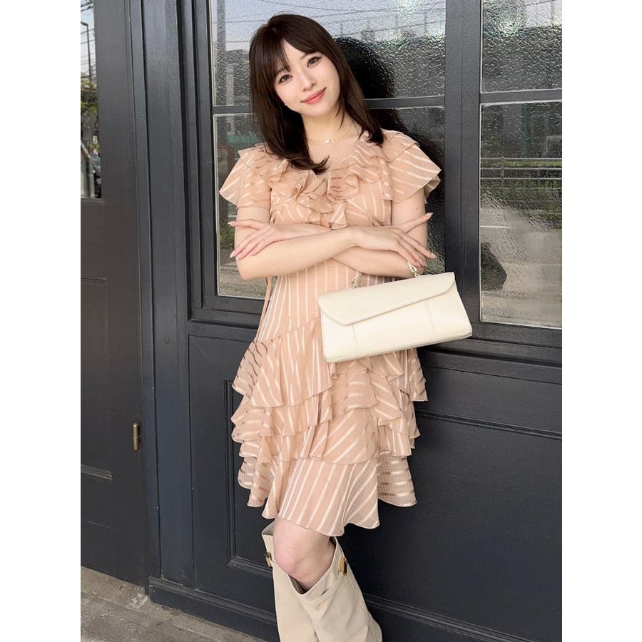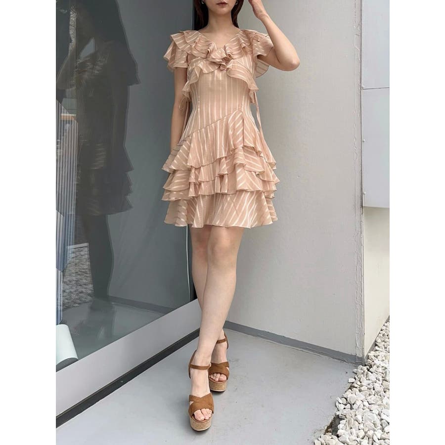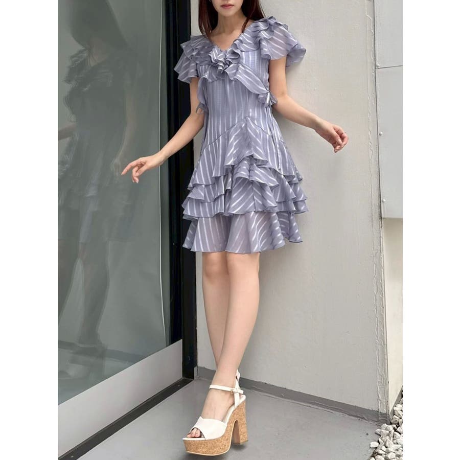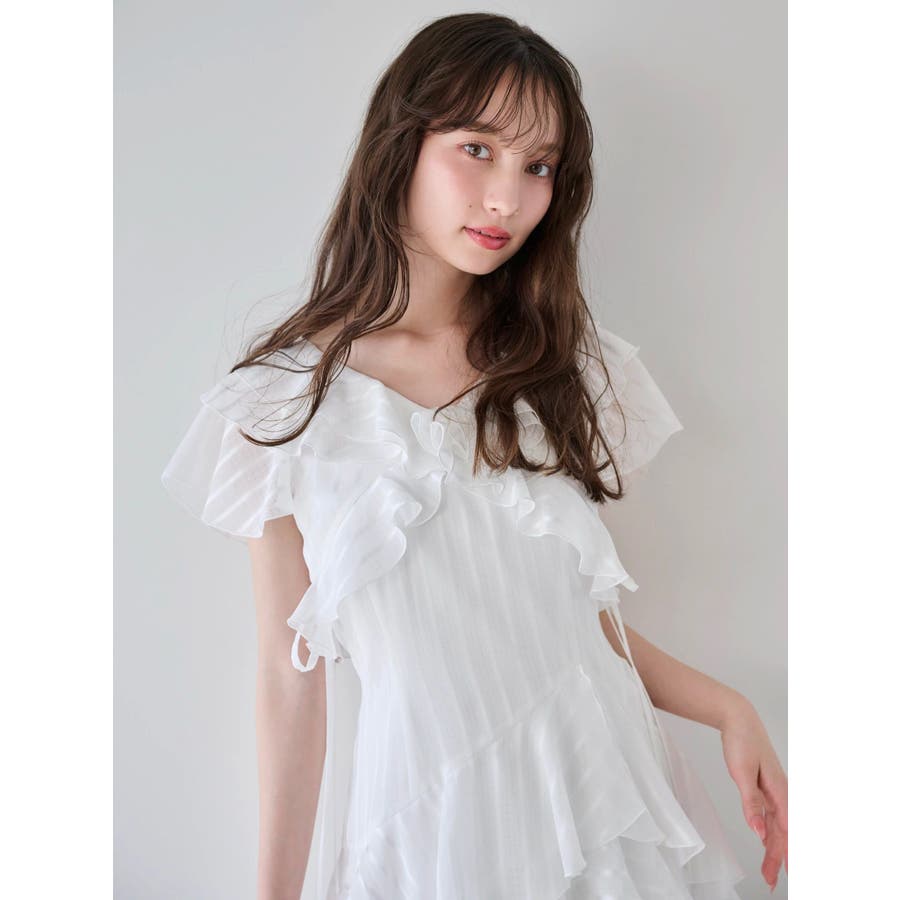 \大人気のワンピースがミニ丈になりました!/>>ロング丈はこちらから<<【アイテム】 ロマンティックなラッフルティアードデザインを取り入れつつ、軽やかで遊び心のあるシルエットに仕上げました。 艶と透け感のある素材が、歩くたびにふんわりと揺れて女性らしさを引き立てます。 袖のフリルが肩まわりをやさしくカバーし、Vネック×フロントリボンで甘さと抜け感を両立。 かわいいミニの丈感が、よりアクティブでフレッシュな印象を演出してくれます。 【スタイリング】 ショート丈ジャケットを羽織れば、華やかさを残しつつ大人っぽい印象に。 ライダースを合わせて甘さを程よく引き締めた、辛口フェミニンな着こなしもおすすめです。 カーディガンを合わせれば、可愛らしくやわらかな雰囲気に仕上がります。---------------------------------------------------- 気になるアイテムはお気に入り登録がおすすめ 入荷情報やラスト1点、お得なプライスダウンの情報をいち早くお届け! ぜひご登録ください◎ ---------------------------------------------------- ※実際にお届けする商品と仕様やサイズが異なる場合がございます。 また生産の都合上、お届け時期が前後する場合がございます。 ★STAFFInstagramもチェック