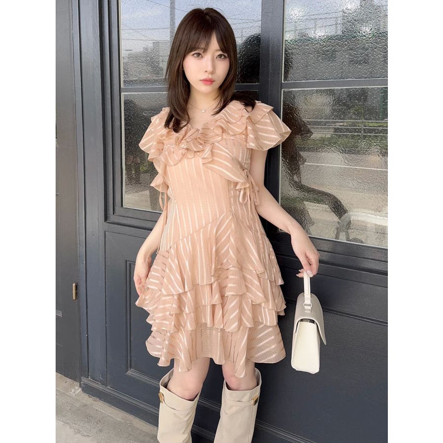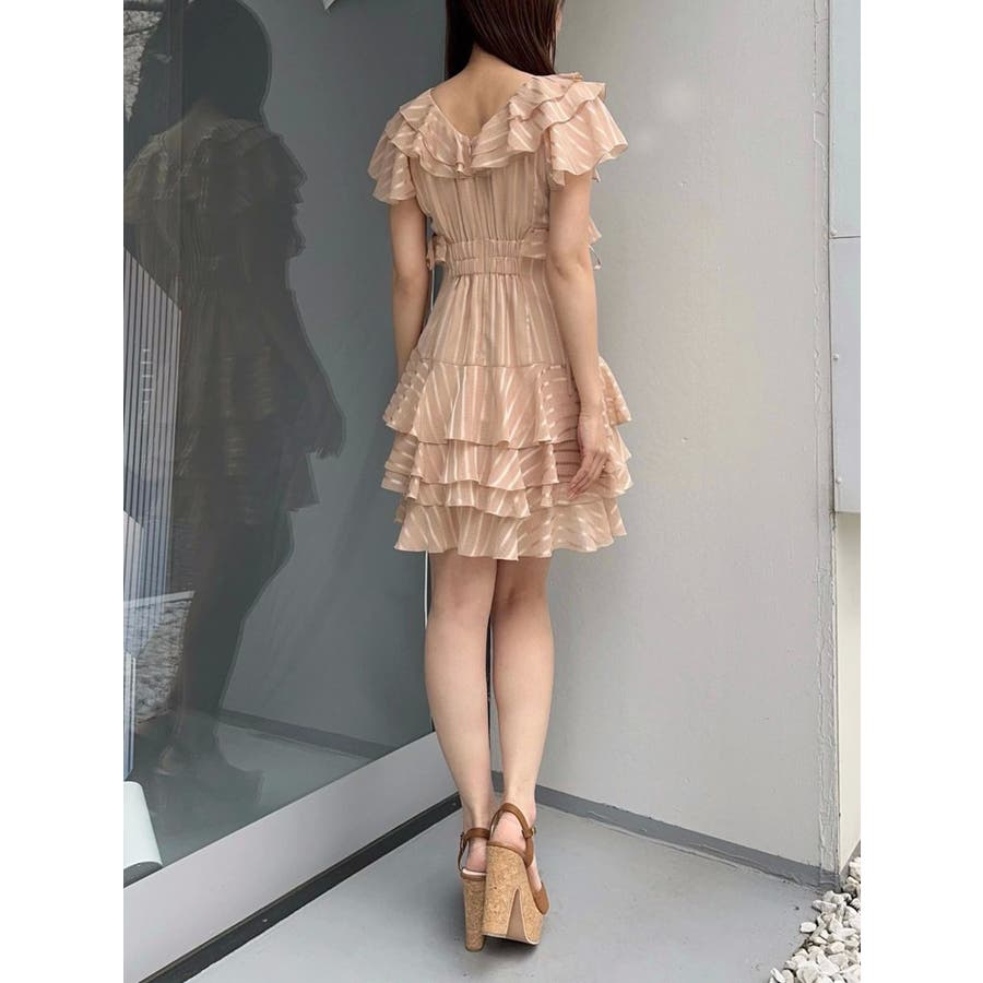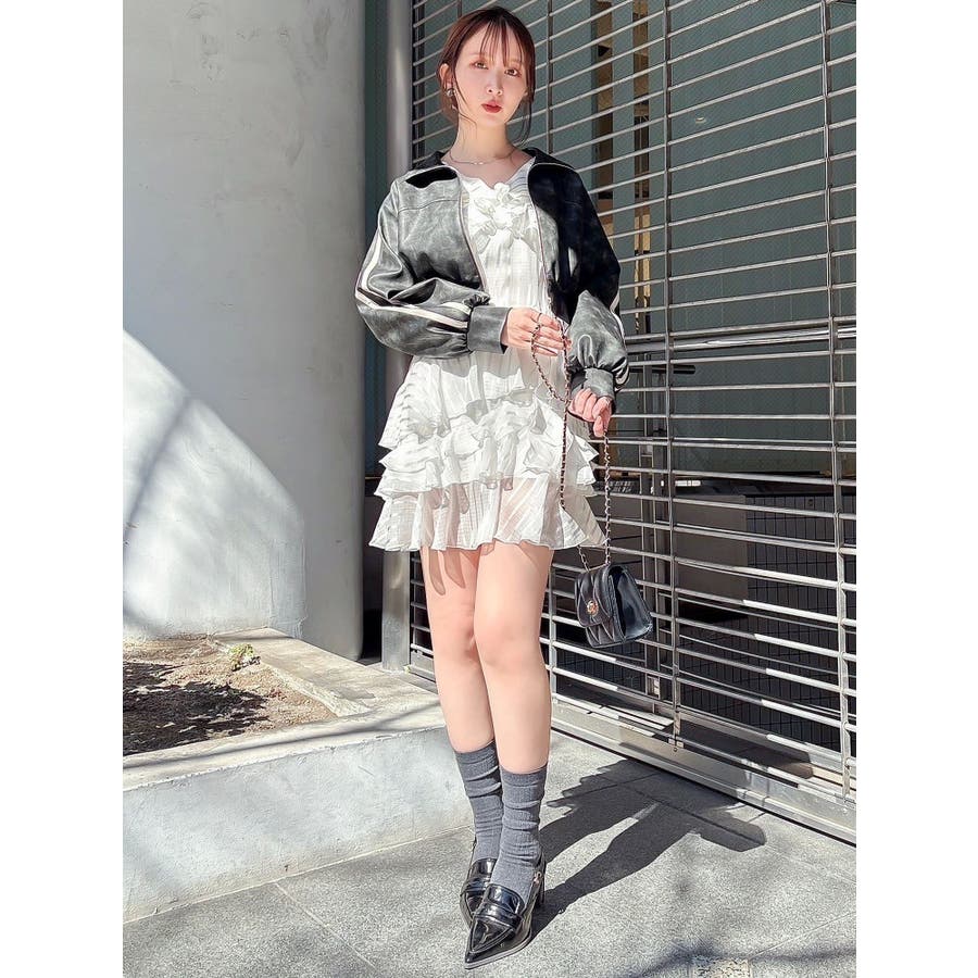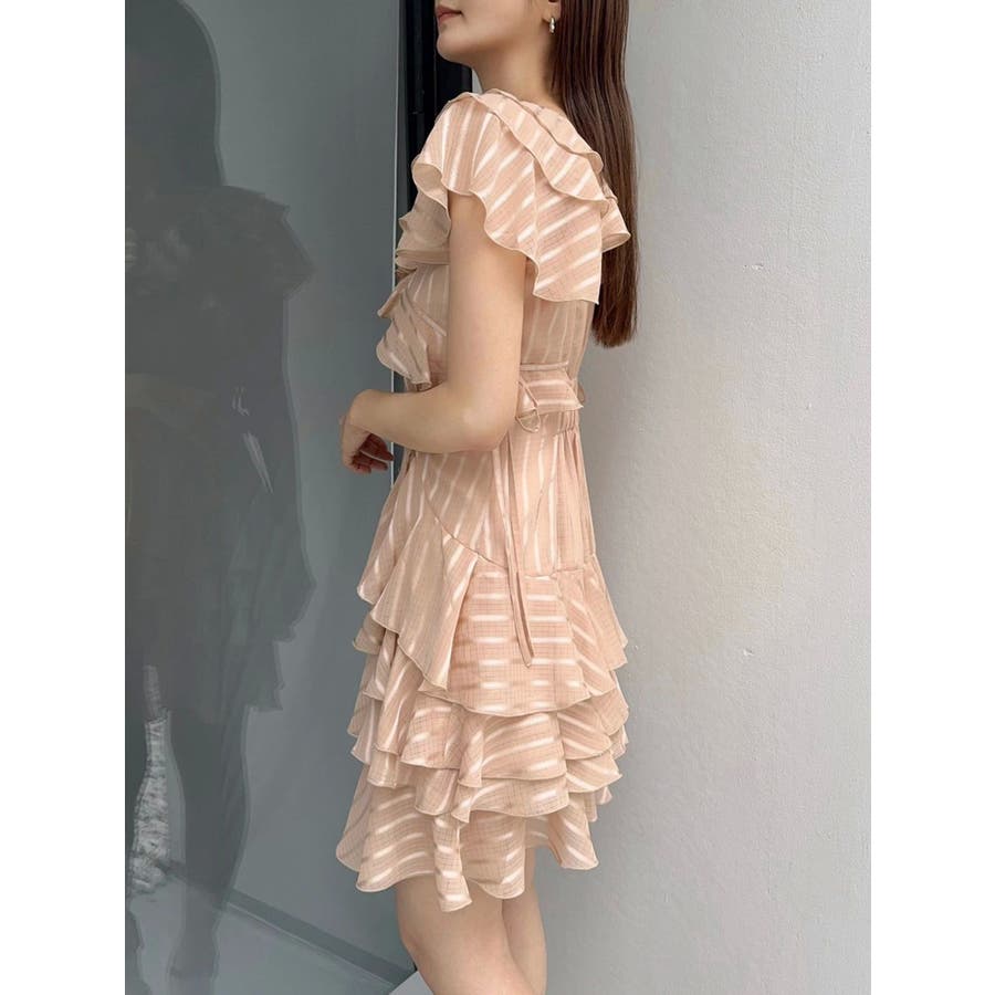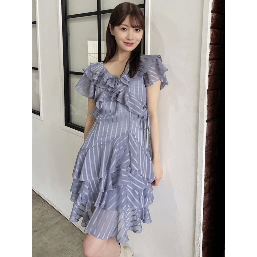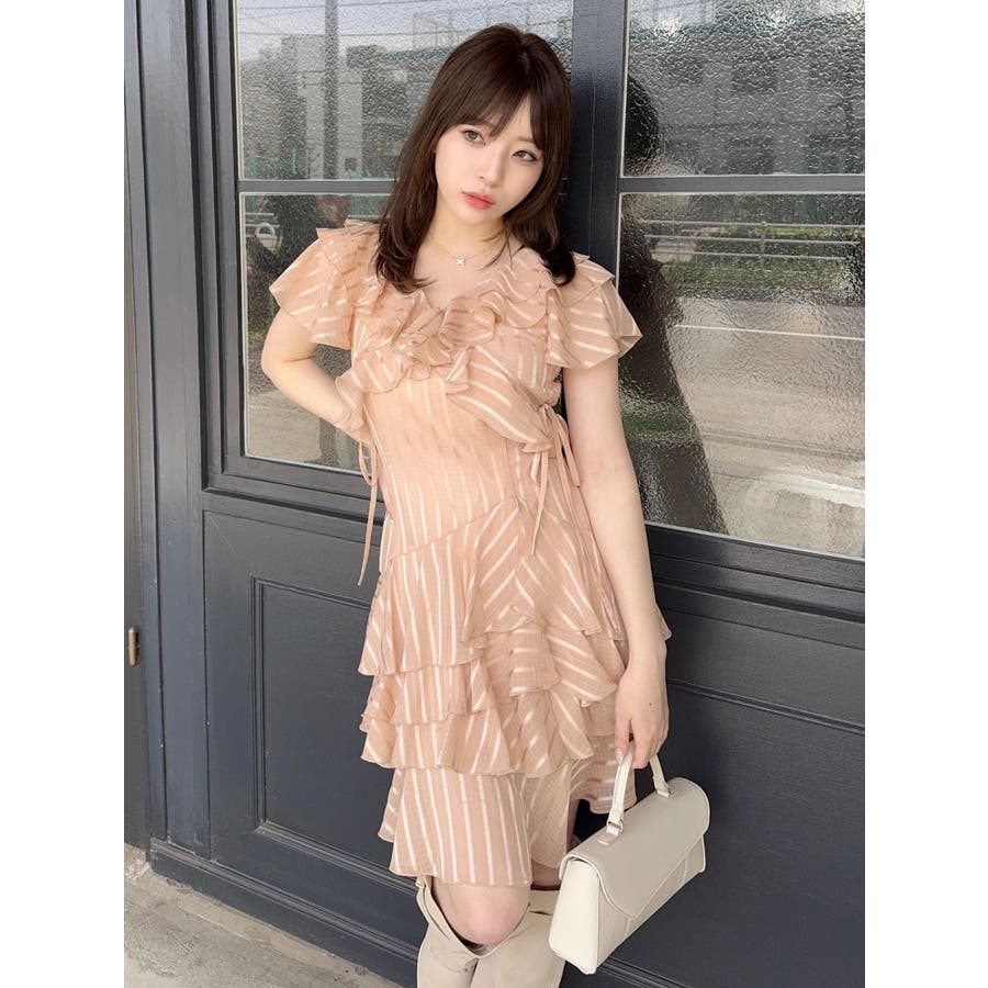 \大人気のワンピースがミニ丈になりました!/>>ロング丈はこちらから<<【アイテム】 ロマンティックなラッフルティアードデザインを取り入れつつ、軽やかで遊び心のあるシルエットに仕上げました。 艶と透け感のある素材が、歩くたびにふんわりと揺れて女性らしさを引き立てます。 袖のフリルが肩まわりをやさしくカバーし、Vネック×フロントリボンで甘さと抜け感を両立。 かわいいミニの丈感が、よりアクティブでフレッシュな印象を演出してくれます。 【スタイリング】 ショート丈ジャケットを羽織れば、華やかさを残しつつ大人っぽい印象に。 ライダースを合わせて甘さを程よく引き締めた、辛口フェミニンな着こなしもおすすめです。 カーディガンを合わせれば、可愛らしくやわらかな雰囲気に仕上がります。---------------------------------------------------- 気になるアイテムはお気に入り登録がおすすめ 入荷情報やラスト1点、お得なプライスダウンの情報をいち早くお届け! ぜひご登録ください◎ ---------------------------------------------------- ※実際にお届けする商品と仕様やサイズが異なる場合がございます。 また生産の都合上、お届け時期が前後する場合がございます。 ★STAFFInstagramもチェック