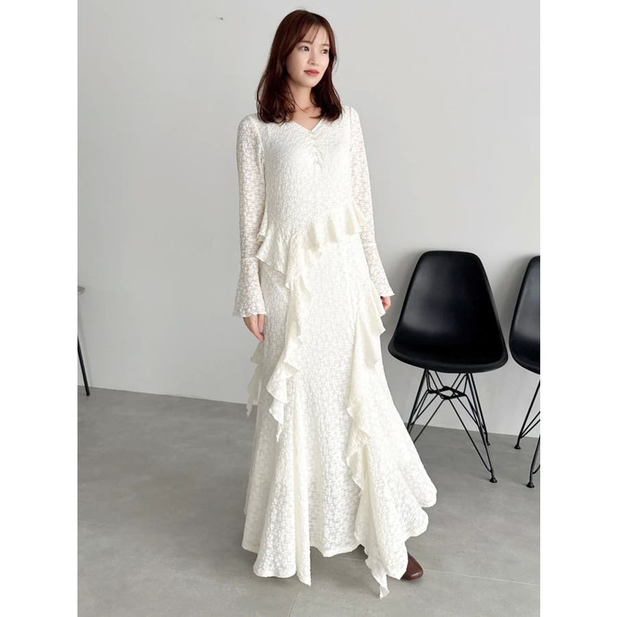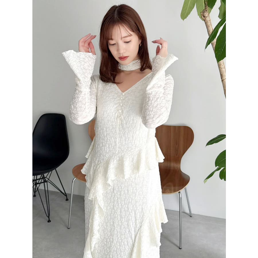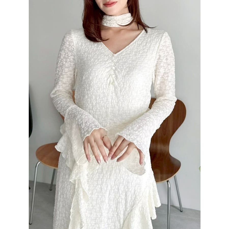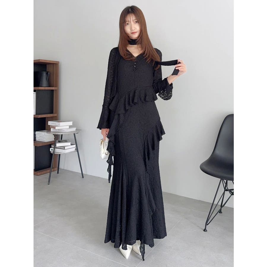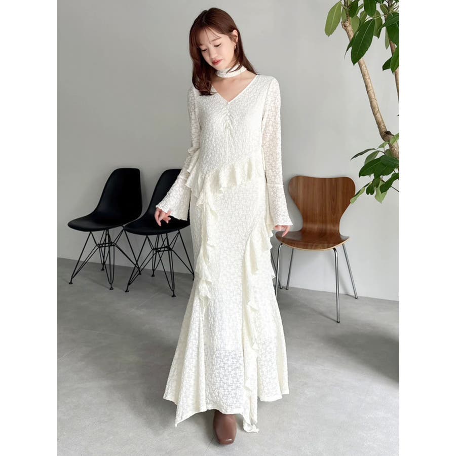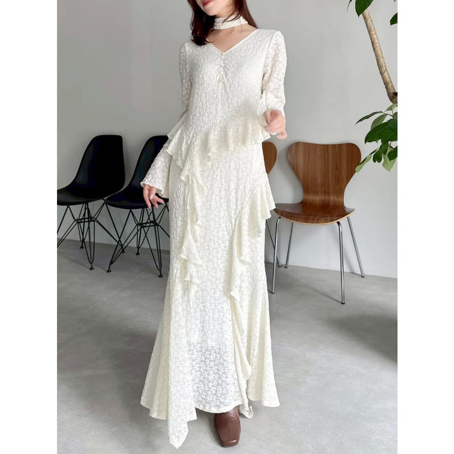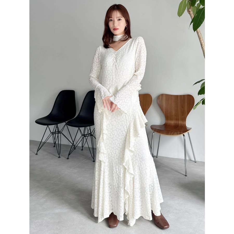 【商品】立体的な動きと繊細な素材感が魅力のワンピース。身頃全体に使用されたシュリンクレースは、柔らかく伸縮性があり、女性らしい優美なシルエットを引き立てます。ウエストの斜めのフリルが視線を縦に流し、細く見える効果があります。裾に向かって贅沢に用尺を使ったフレアラインが歩くたびに美しく揺れ、ドラマティックな存在感を放ちます。セットの同素材ネック紐もコーディネートに立体感をプラス。結び方次第で表情を変えられるのも魅力です。【スタイリング】1枚で華やかに決まる主役級アイテム。足元には、シャープな印象のショートブーツやヒールを合わせることで、裾の揺れ感を引き立てながら全体をすっきりとまとめてくれます。肌寒い季節にはロングコートを羽織ると、ドラマティックなフリルディテールがちらりと覗き、レイヤードスタイルも上品に仕上がります。※実際にお届けする商品と仕様やサイズが異なる場合がございます。また生産の都合上、お届け時期が前後する場合がございます。【商品特徴】透け感:なし伸縮性:あり生地の厚さ:普通サイズ感:普通裏地:ありポケット:なしファスナー:なし