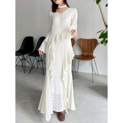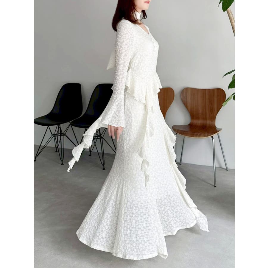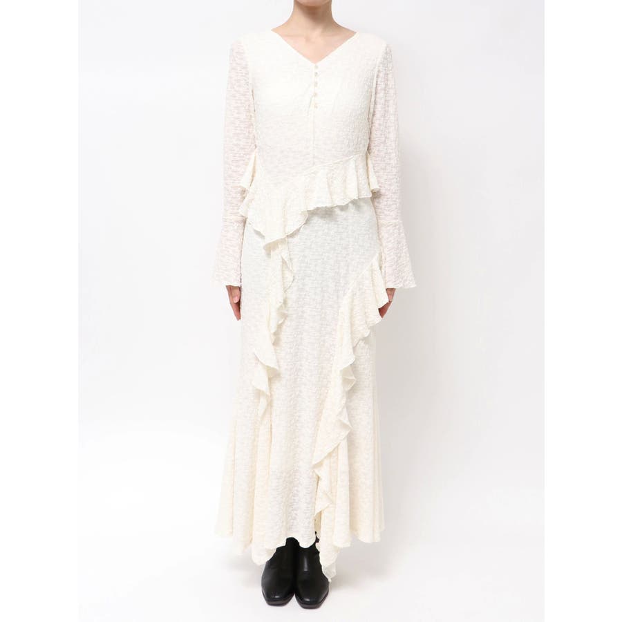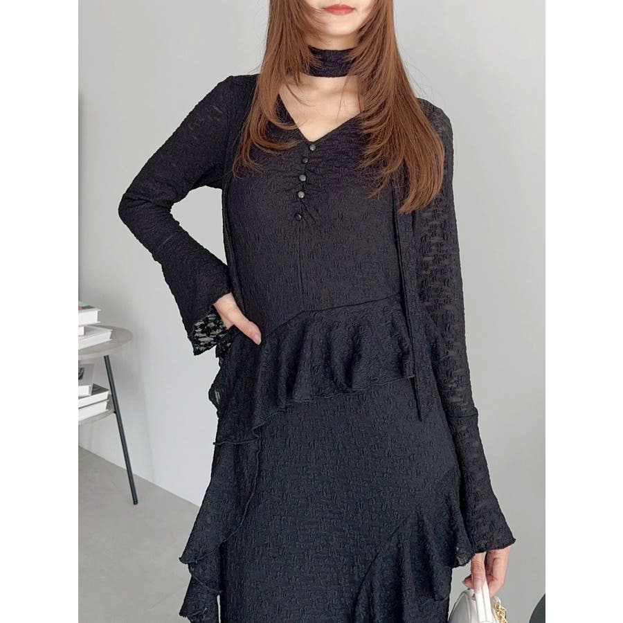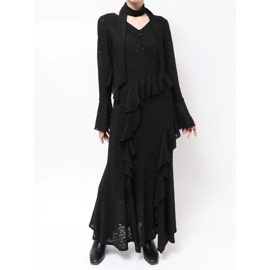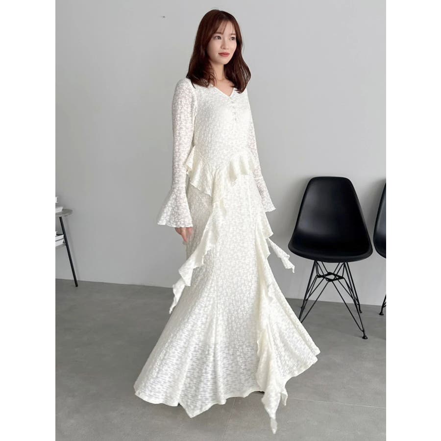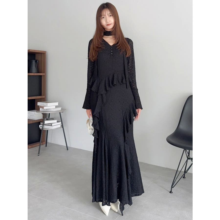 【商品】立体的な動きと繊細な素材感が魅力のワンピース。身頃全体に使用されたシュリンクレースは、柔らかく伸縮性があり、女性らしい優美なシルエットを引き立てます。ウエストの斜めのフリルが視線を縦に流し、細く見える効果があります。裾に向かって贅沢に用尺を使ったフレアラインが歩くたびに美しく揺れ、ドラマティックな存在感を放ちます。セットの同素材ネック紐もコーディネートに立体感をプラス。結び方次第で表情を変えられるのも魅力です。【スタイリング】1枚で華やかに決まる主役級アイテム。足元には、シャープな印象のショートブーツやヒールを合わせることで、裾の揺れ感を引き立てながら全体をすっきりとまとめてくれます。肌寒い季節にはロングコートを羽織ると、ドラマティックなフリルディテールがちらりと覗き、レイヤードスタイルも上品に仕上がります。※実際にお届けする商品と仕様やサイズが異なる場合がございます。また生産の都合上、お届け時期が前後する場合がございます。【商品特徴】透け感:なし伸縮性:あり生地の厚さ:普通サイズ感:普通裏地:ありポケット:なしファスナー:なし
