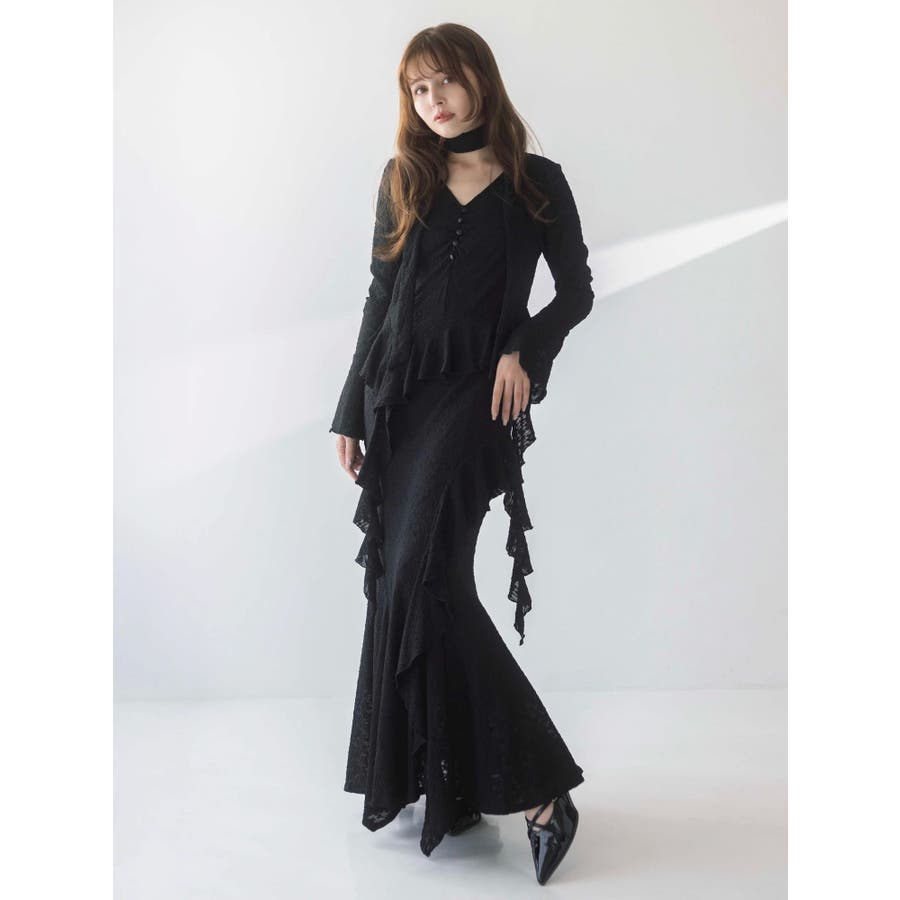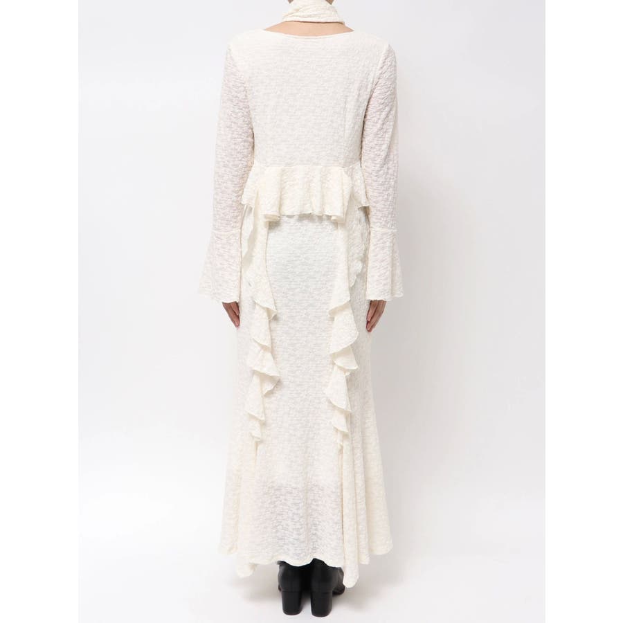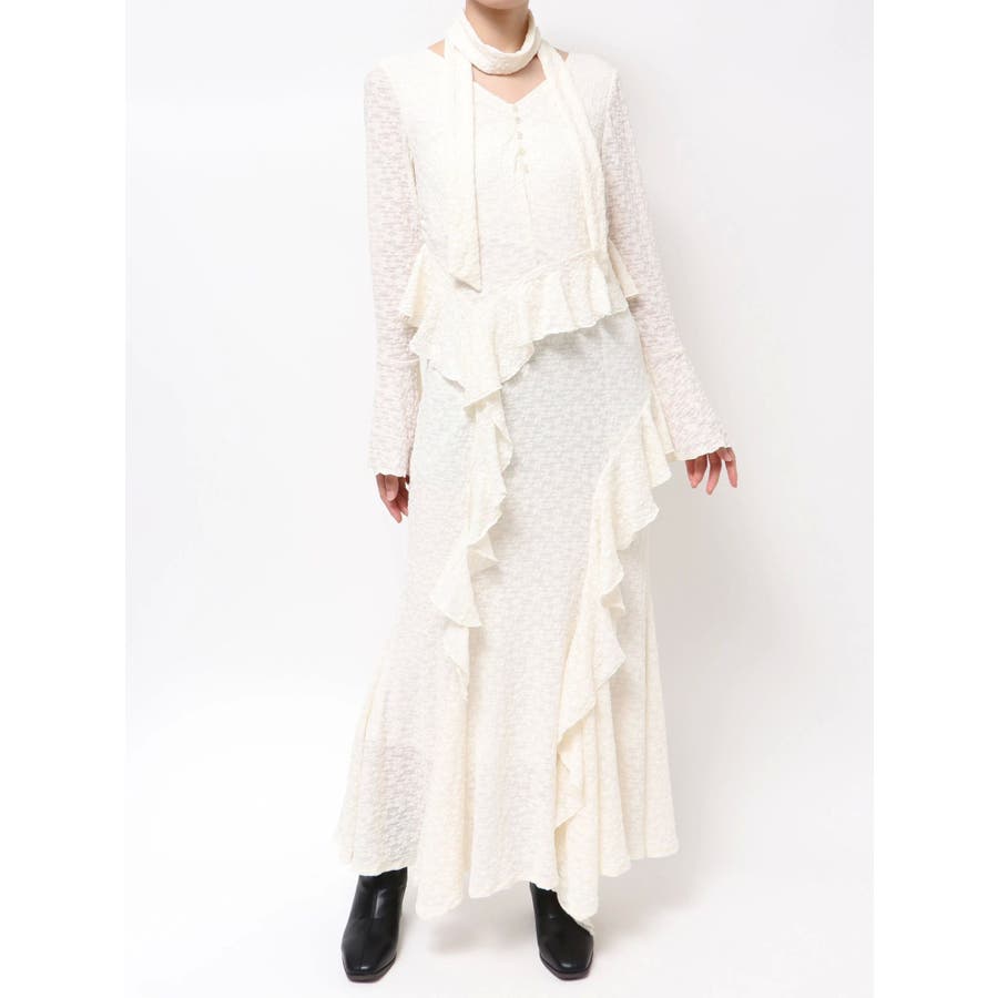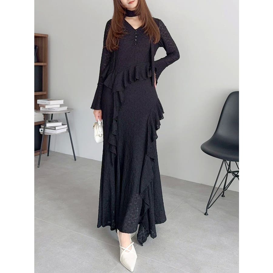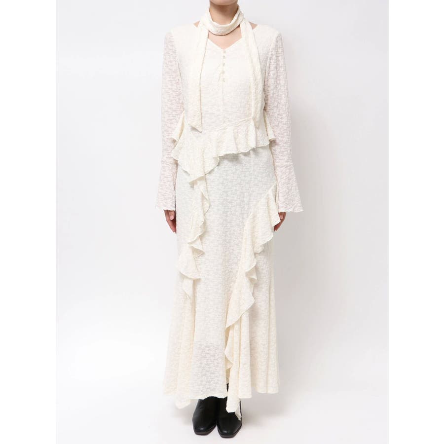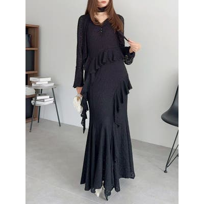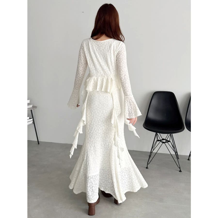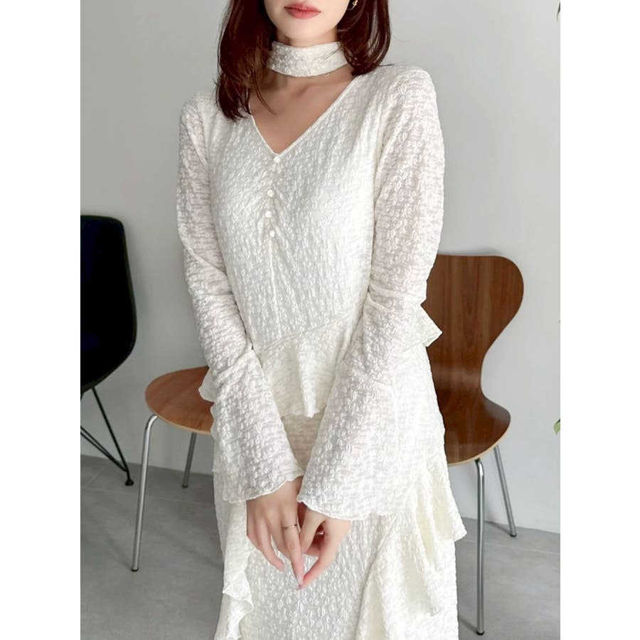 【商品】立体的な動きと繊細な素材感が魅力のワンピース。身頃全体に使用されたシュリンクレースは、柔らかく伸縮性があり、女性らしい優美なシルエットを引き立てます。ウエストの斜めのフリルが視線を縦に流し、細く見える効果があります。裾に向かって贅沢に用尺を使ったフレアラインが歩くたびに美しく揺れ、ドラマティックな存在感を放ちます。セットの同素材ネック紐もコーディネートに立体感をプラス。結び方次第で表情を変えられるのも魅力です。【スタイリング】1枚で華やかに決まる主役級アイテム。足元には、シャープな印象のショートブーツやヒールを合わせることで、裾の揺れ感を引き立てながら全体をすっきりとまとめてくれます。肌寒い季節にはロングコートを羽織ると、ドラマティックなフリルディテールがちらりと覗き、レイヤードスタイルも上品に仕上がります。※実際にお届けする商品と仕様やサイズが異なる場合がございます。また生産の都合上、お届け時期が前後する場合がございます。【商品特徴】透け感:なし伸縮性:あり生地の厚さ:普通サイズ感:普通裏地:ありポケット:なしファスナー:なし