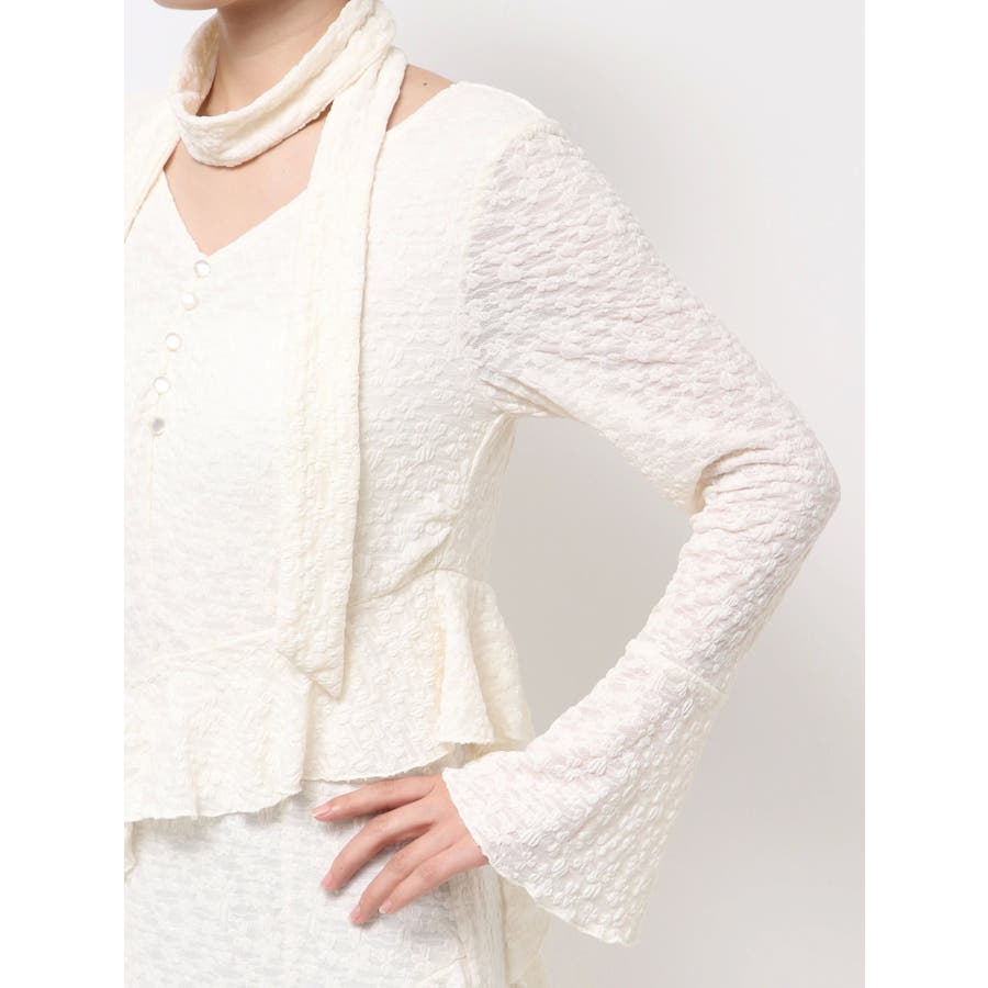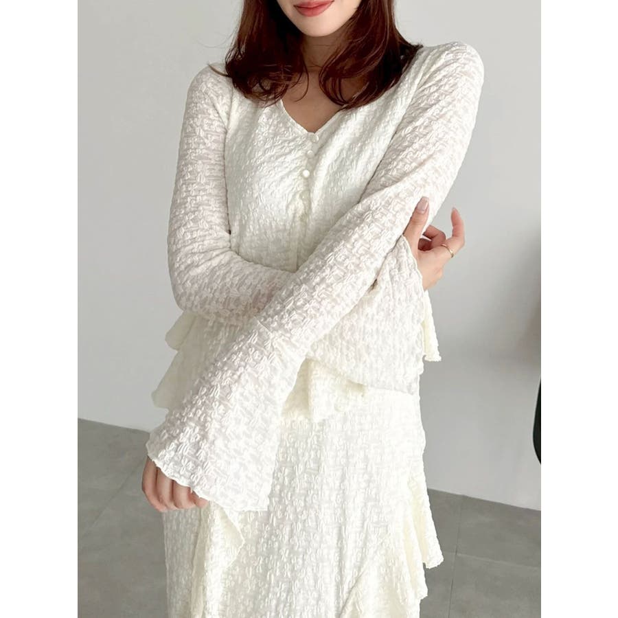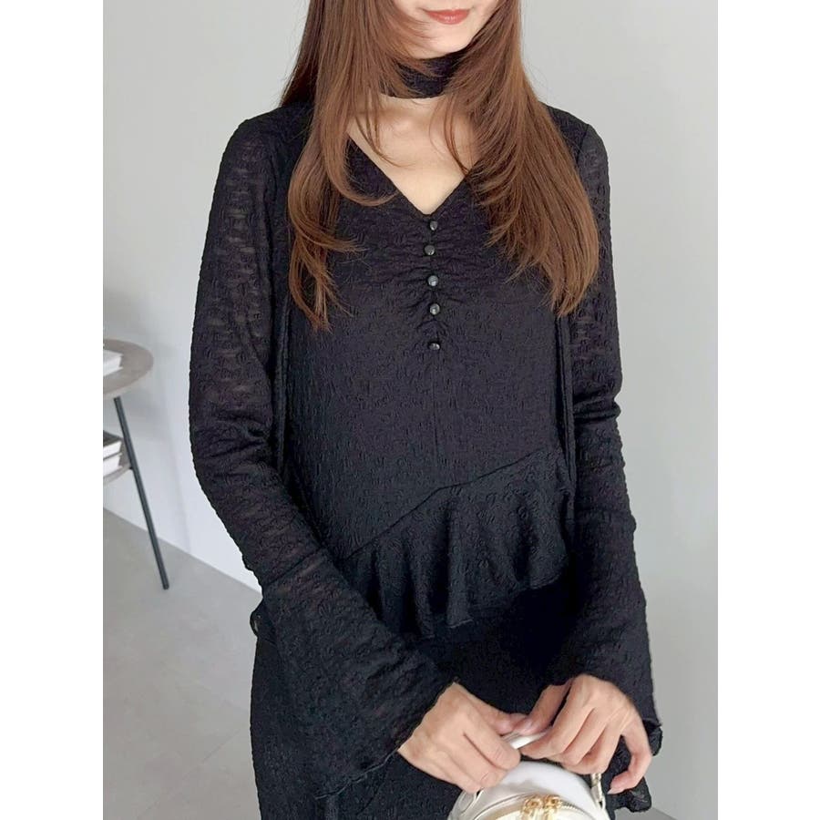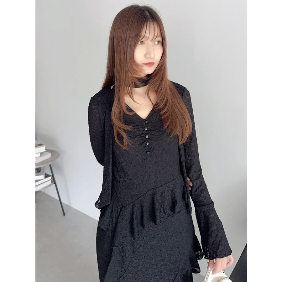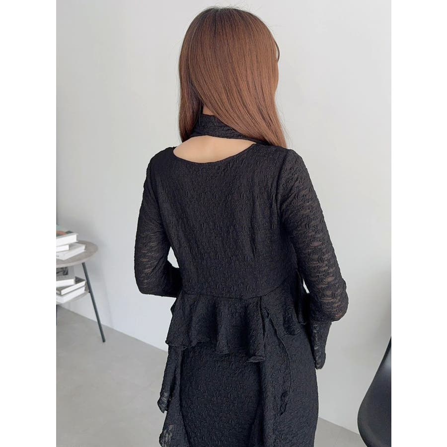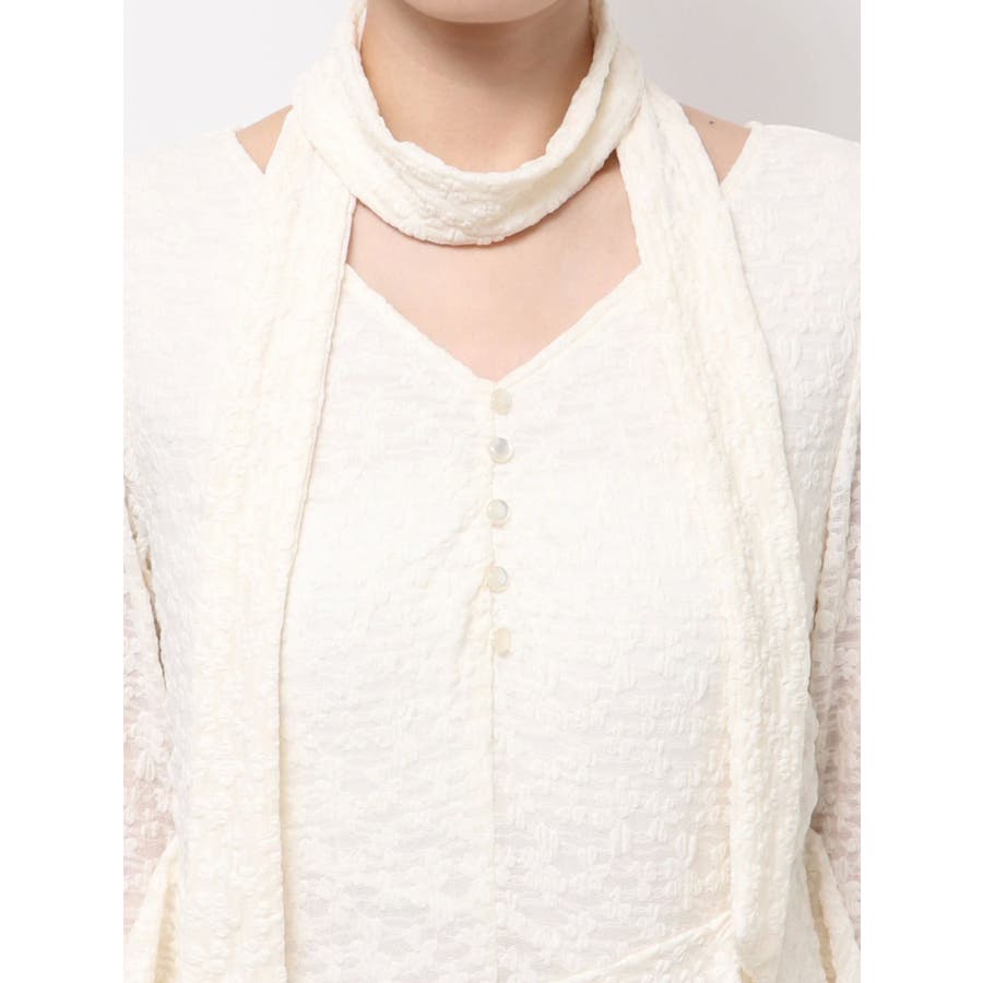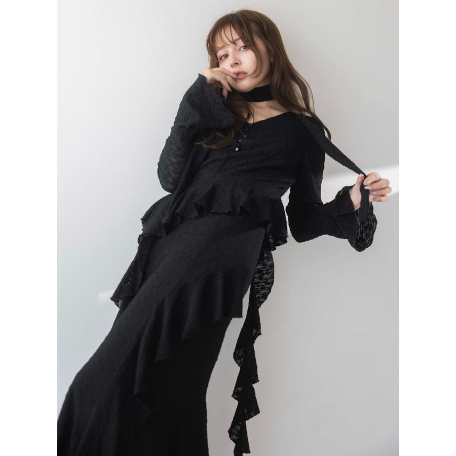 【商品】立体的な動きと繊細な素材感が魅力のワンピース。身頃全体に使用されたシュリンクレースは、柔らかく伸縮性があり、女性らしい優美なシルエットを引き立てます。ウエストの斜めのフリルが視線を縦に流し、細く見える効果があります。裾に向かって贅沢に用尺を使ったフレアラインが歩くたびに美しく揺れ、ドラマティックな存在感を放ちます。セットの同素材ネック紐もコーディネートに立体感をプラス。結び方次第で表情を変えられるのも魅力です。【スタイリング】1枚で華やかに決まる主役級アイテム。足元には、シャープな印象のショートブーツやヒールを合わせることで、裾の揺れ感を引き立てながら全体をすっきりとまとめてくれます。肌寒い季節にはロングコートを羽織ると、ドラマティックなフリルディテールがちらりと覗き、レイヤードスタイルも上品に仕上がります。※実際にお届けする商品と仕様やサイズが異なる場合がございます。また生産の都合上、お届け時期が前後する場合がございます。【商品特徴】透け感:なし伸縮性:あり生地の厚さ:普通サイズ感:普通裏地:ありポケット:なしファスナー:なし