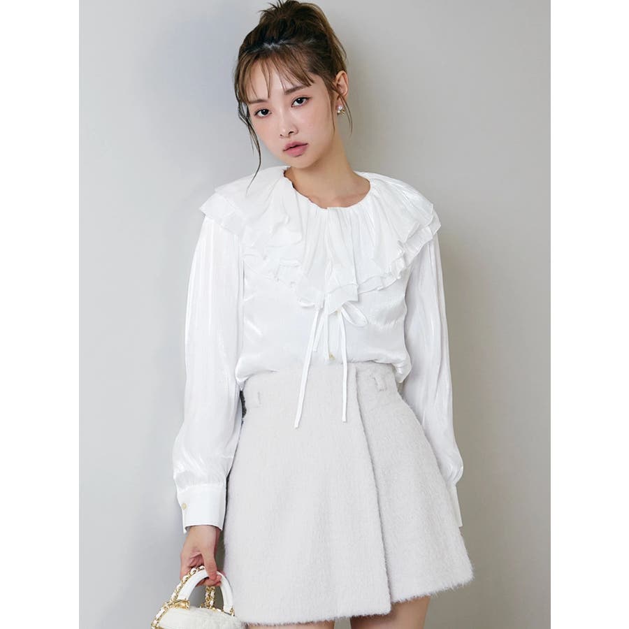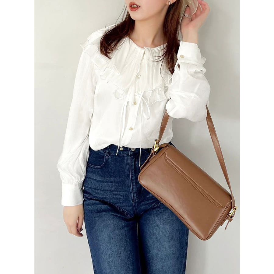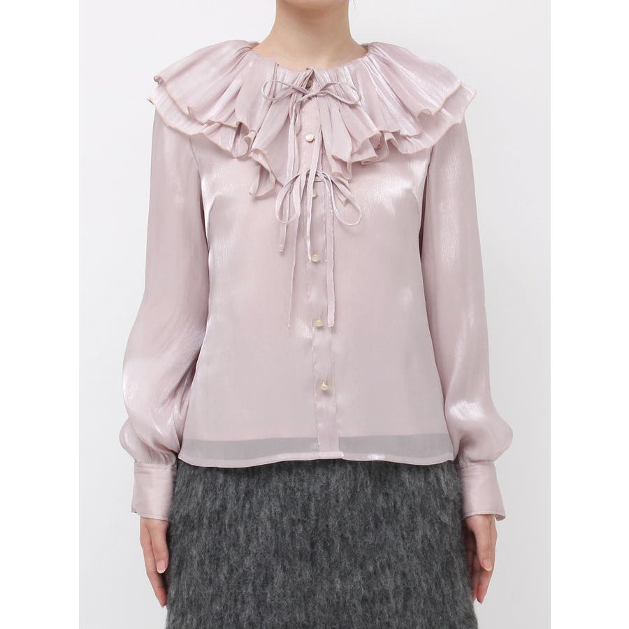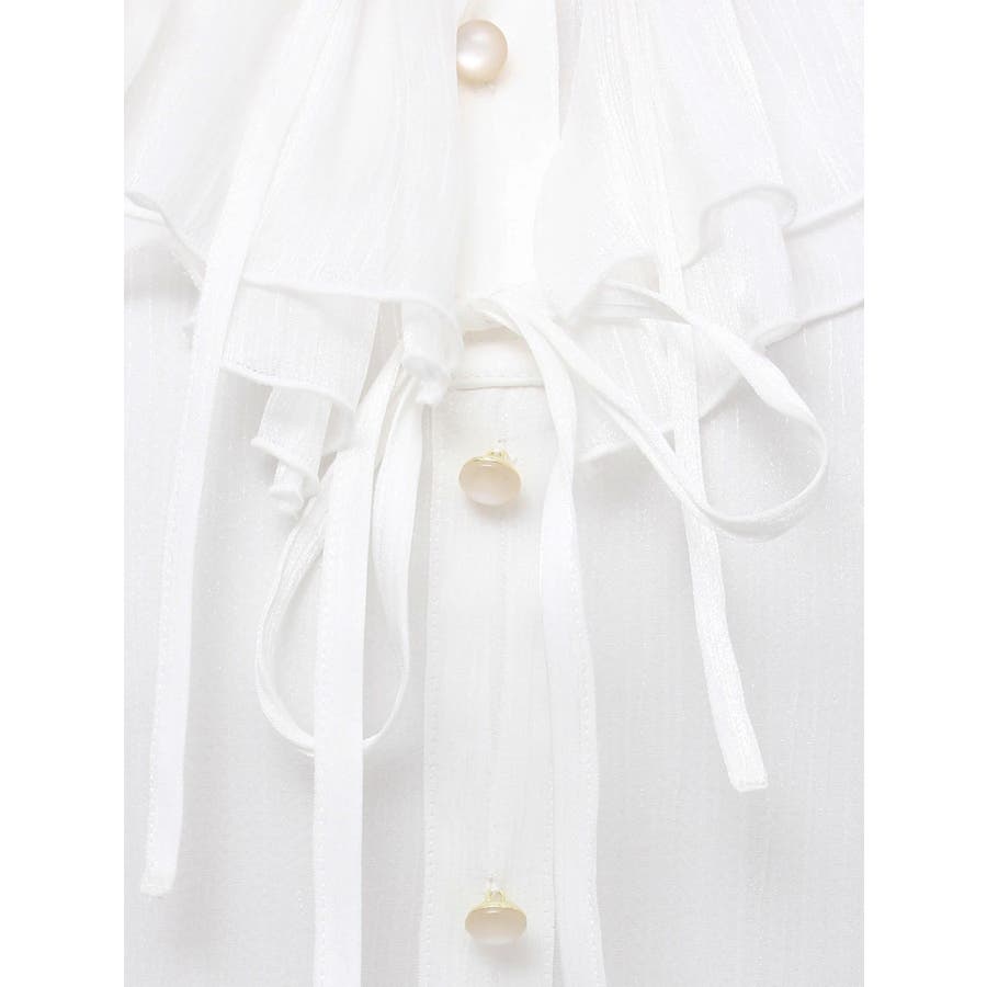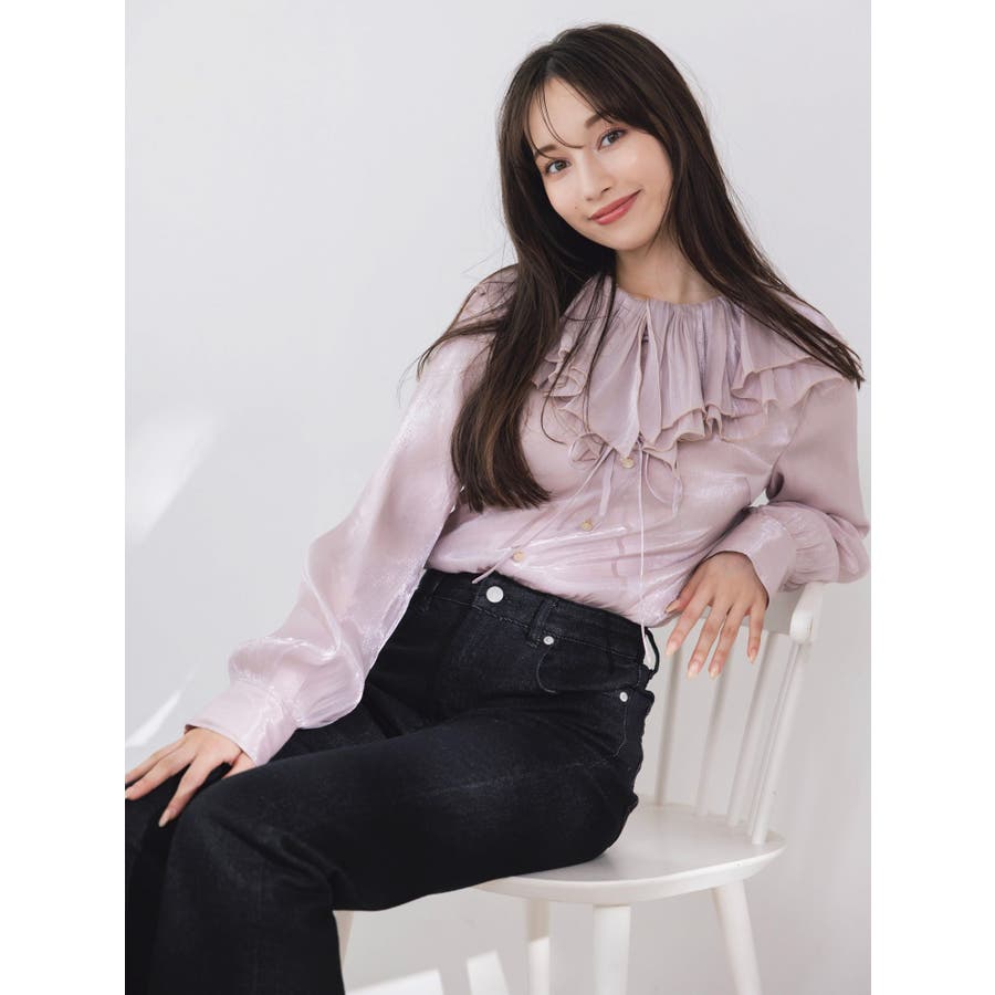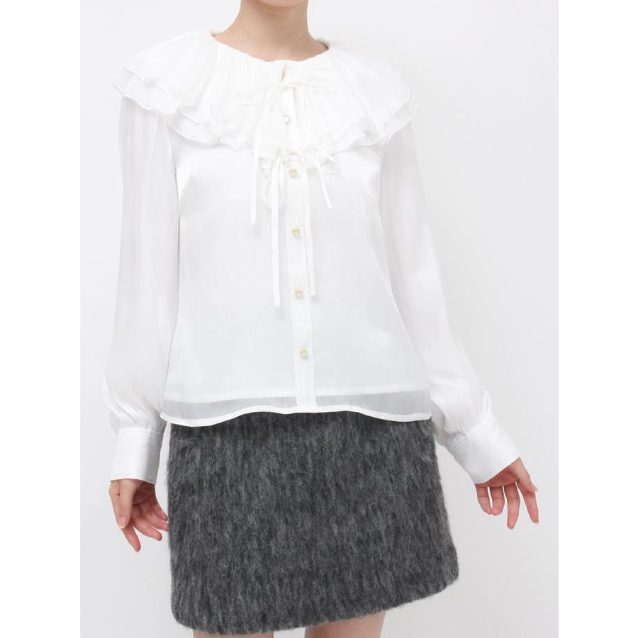 【商品】今季トレンド間違いなしのピエロカラーに、繊細なフリルを重ねたデザインが目を惹くブラウス。顔まわりに華やかさを添えるボリューム感のある襟元は、dazzlin(ダズリン)らしい甘さと品の良さを両立したポイント。素材は軽やかで張りを出しラッフルフリルを優しく仕上げました。艶のある素材で、ふんわりとしたシルエットが女性らしさを引き立てます。【スタイリング】今季はジャケットからフリルを出して華やかに着合わせるスタイリングがおすすめです。上品さがありながらもトレンド感を引き立てdazzlinらしい遊び心のあるスタイルが完成します。※実際にお届けする商品と仕様やサイズが異なる場合がございます。また生産の都合上、お届け時期が前後する場合がございます。【商品特徴】透け感:あり伸縮性:なし生地の厚さ:薄手サイズ感:普通裏地:あり毛ポケット:なし