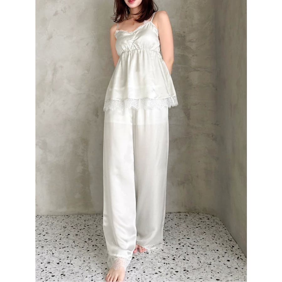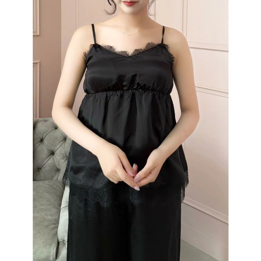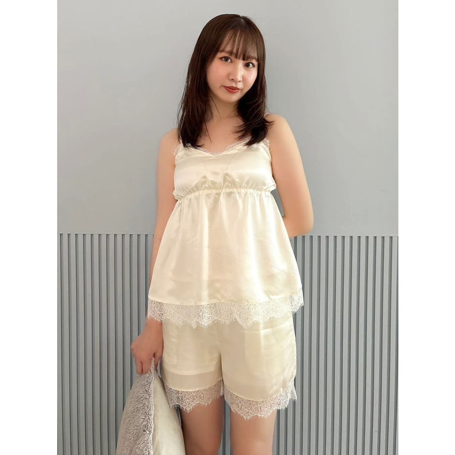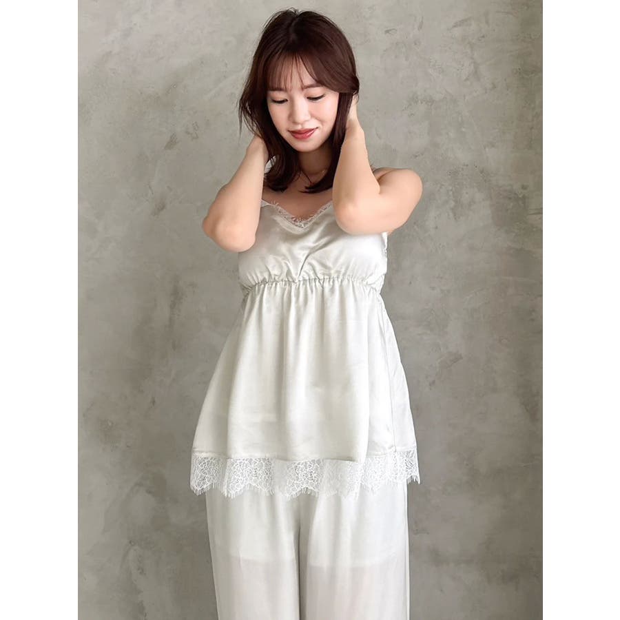 【商品】とろみ感のあるシルク素材と繊細なレースを組み合わせた、上品で色っぽい印象のカップ付きキャミソール。なめらかな質感が肌にやさしくフィットし、動きやすさと女性らしさを両立したリラックス仕様です。細めのストラップとVネックラインでデコルテをきれいに見せつつ、下着感のない抜け感デザインがポイント。カップ付きなので1枚でも安心して着用でき、ルームウェアとしてはもちろん、ちょっとしたお泊まりや旅行シーンにもぴったりです。【スタイリング】同素材のガウンやパンツとセットアップで着用すれば、統一感のある上質なおうちコーデに。肌寒い季節はニットカーディガンを羽織って、ゆるっと可愛いレイヤードスタイルもおすすめ。※実際にお届けする商品と仕様やサイズが異なる場合がございます。また生産の都合上、お届け時期が前後する場合がございます。