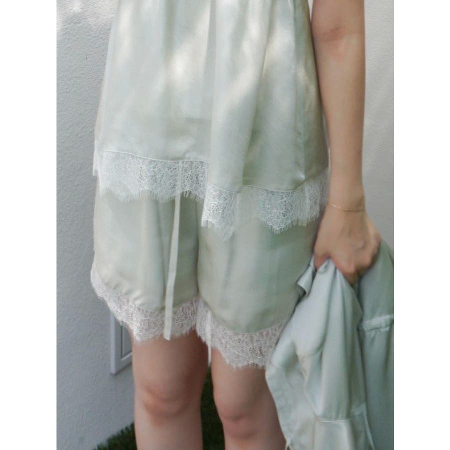 - 吉田朱里 supportted by dazzlin - akarin made.w/dazzlin アイテム第1弾 7.18 fri 12:00 PREORDER START! >>特設ページはこちら<<【アイテム】 上品なシルク素材と繊細なレースを組み合わせた、フェミニンな印象のショート丈ルームパンツ。 程よい落ち感のある素材とゆるやかなシルエットが、リラックスしながらも美脚見えを叶えてくれます。 裾からちらりとのぞくレースが軽やかで、シーズンムードを高めるポイントに。 ウエストは総ゴム仕様&リボン付きでサイズ調整もしやすく、ストレスフリーな着心地に仕上げました。 ~Cosmetic Wear~~~~~~~~~~~~~~~こちらのアイテムは『Cosmetic Wear』です。化粧品成分配合で肌にうるおいを与えます。ベクシル構造で出来たセラミド成分入りカプセルが生地に付着しております。油層が皮膚に触れると外側の油層が割れセラミド成分が塗布されます。着るたびに何層にもなった集合体からセラミド成分がお肌に塗布され、お肌の潤いを保ちます。※集合体が全て無くなった時点で効果は無くなります。※効果には個人差がございます。~~~~~~~~~~~~~~~~~~~~~~~~【スタイリング】 同素材のキャミソールやガウンと合わせたセットアップスタイルで、統一感のあるルームコーデに。 暖かい時期はタンクやカップ付きトップスと合わせるのもおすすめ。▼セットで着れるRoomWear?・【吉田朱里】シルクフードヘアカバーガウン・【吉田朱里】シルクカップインキャミソール・【吉田朱里】シルクランジェリーライクロングパンツ■dazzlin'S STAFF コメント水分を含んでいるようなサラサラ艶々な素材で、肌に触れた時にしっとりと包み込んでくれるような着心地でした。裾にレースが施されているので、安心できる丈感&程よい抜け感あるデザイン性の両方が叶うショートパンツです♪同素材のキャミトップスやガウンと合わせて着用して、旅行先のホテルで着たいです◎---------------------------------------------------- 気になるアイテムはお気に入り登録がおすすめ 入荷情報やラスト1点、お得なプライスダウンの情報をいち早くお届け! ぜひご登録ください◎ ---------------------------------------------------- ※実際にお届けする商品と仕様やサイズが異なる場合がございます。 また生産の都合上、お届け時期が前後する場合がございます。