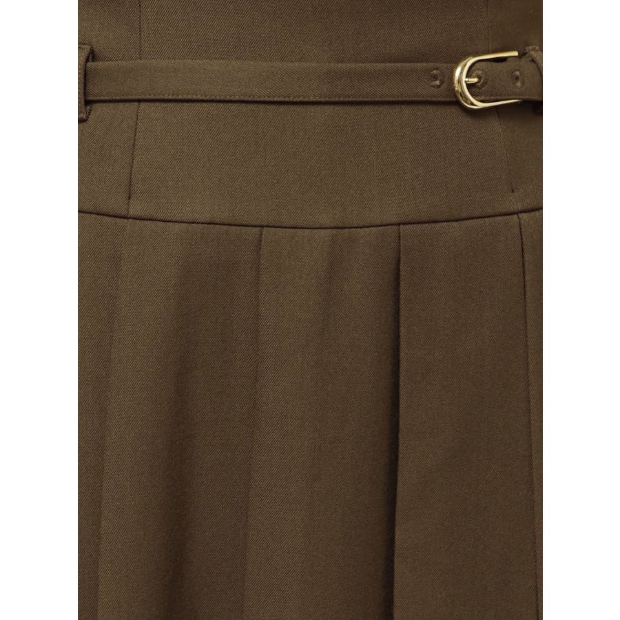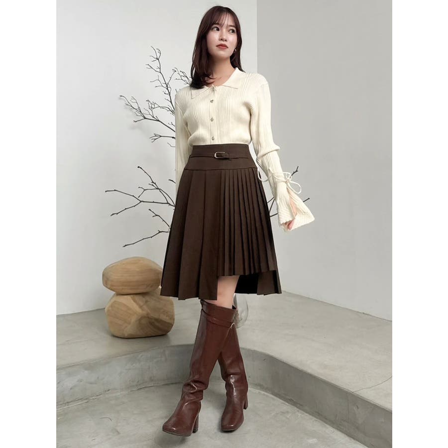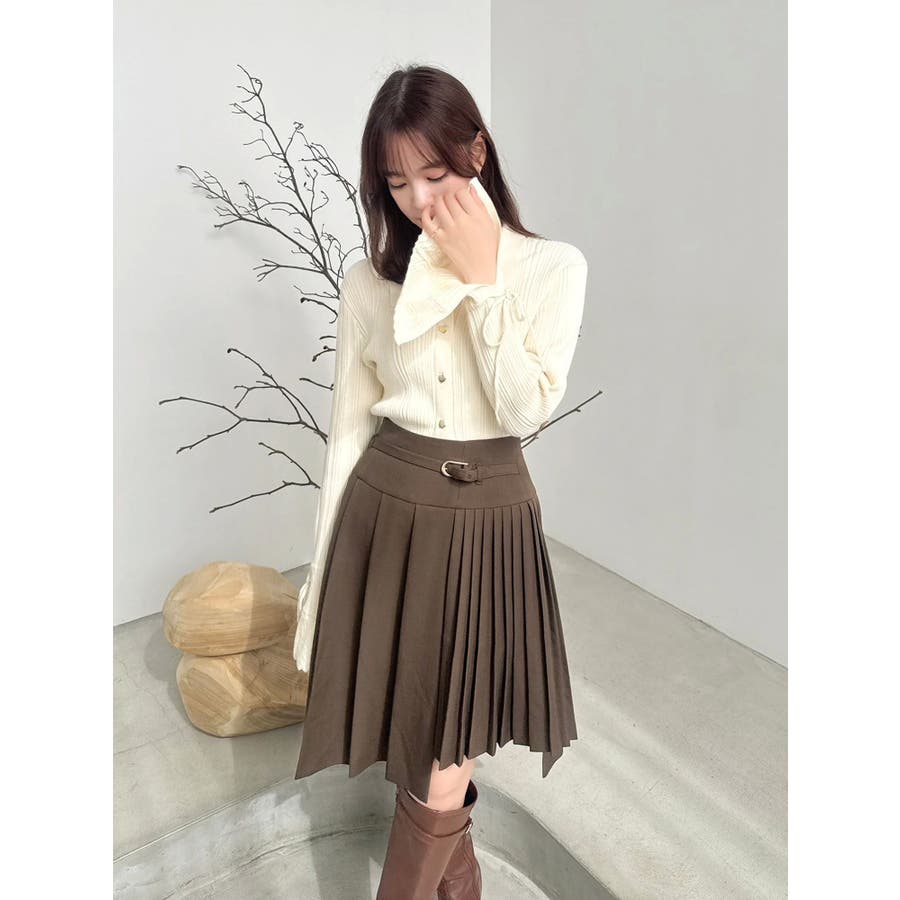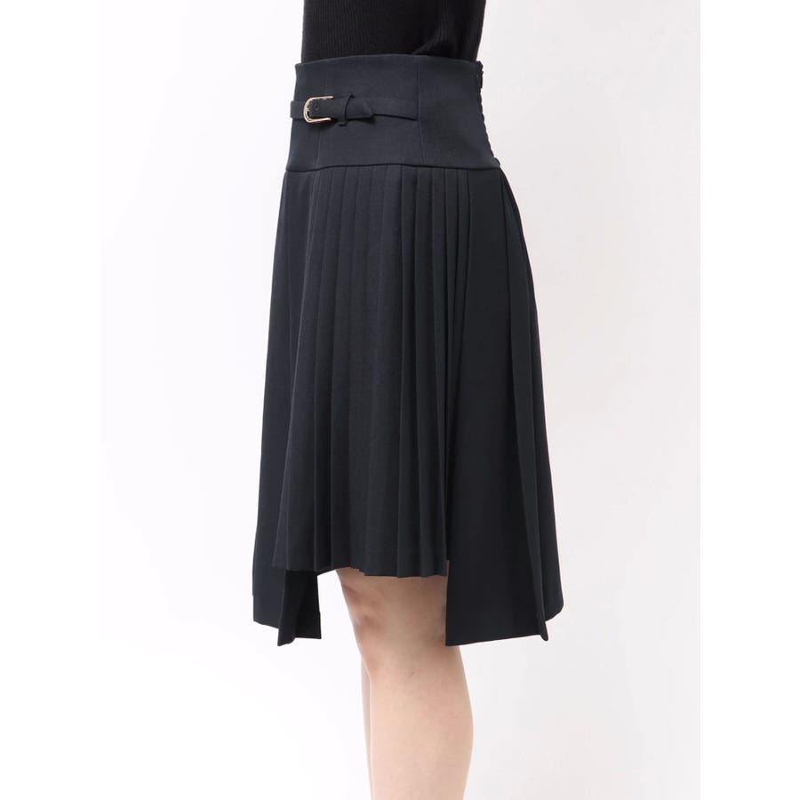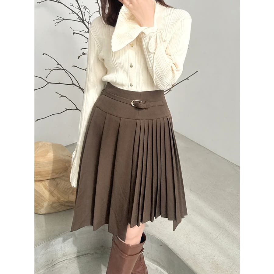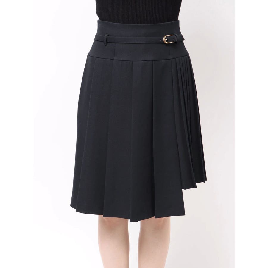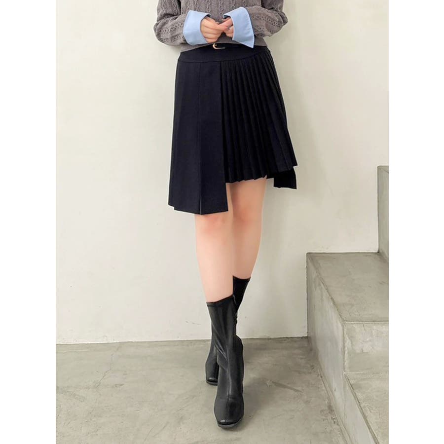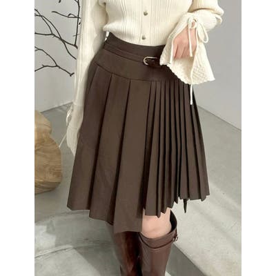 【商品】ミディ丈で大人の抜け感を演出する、プリーツデザインのスカート。左右で異なるプリーツ幅を組み合わせたアシンメトリーなディテールが、遊び心とファッション感度の高さを演出します。さらに、サイドにかけて少し短めの丈感に仕上げており、足元に軽さを出しつつ脚長効果も◎。ウエストには華奢なベルトを配して、ウエストマークとアクセントを両立。1枚で着映えする、デザイン性の高いスカートです。【スタイリング】トップスにはシンプルなリブニットやシャツを合わせて、スカートのデザイン性を際立たせるのが正解。足元はブーツやローファーでクラシカルにまとめると、上品な秋冬スタイルに仕上がります。クロップド丈のトップスと合わせると、ウエストのベルトが引き立ち、スタイルアップも叶います。同系色のアウターを羽織ってワントーンコーデにするのもおすすめ。※実際にお届けする商品と仕様やサイズが異なる場合がございます。また生産の都合上、お届け時期が前後する場合がございます。【商品特徴】透け感:なし伸縮性:なし生地の厚さ:普通サイズ感:普通裏地:ありポケット:なし
