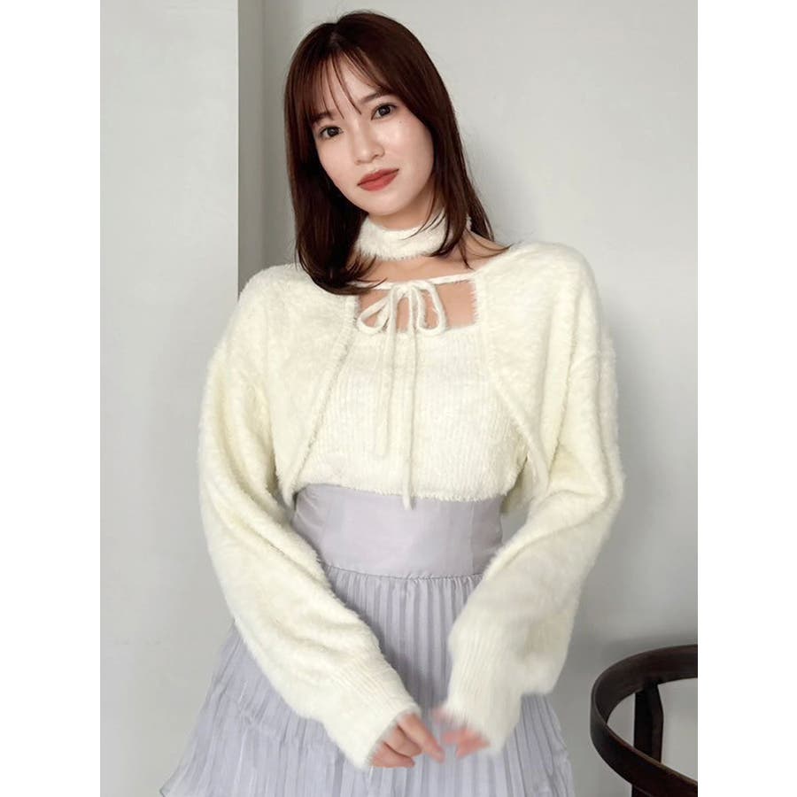 【商品】ふんわりとしたミニシャギー素材が目を惹く、肌ざわりも着映え感も抜群なアイテム。デコルテを華やかに彩るチョーカーデザインは、取り外し可能で気分に合わせて2WAYで楽しめます。【スタイリング】同素材のボレロとのアンサンブルコーデはdazzlin(ダズリン)イチオシ。単体でシャツやシアートップスのレイヤードにもおすすめです。タイトなナロースカートやマーメイドスカートと合わせれば、大人のレディスタイルに。デニムパンツ合わせで引き算しても可愛いです。※実際にお届けする商品と仕様やサイズが異なる場合がございます。また生産の都合上、お届け時期が前後する場合がございます。【商品特徴】透け感:なし伸縮性:あり生地の厚さ:普通サイズ感:細身裏地:なしポケット:なし