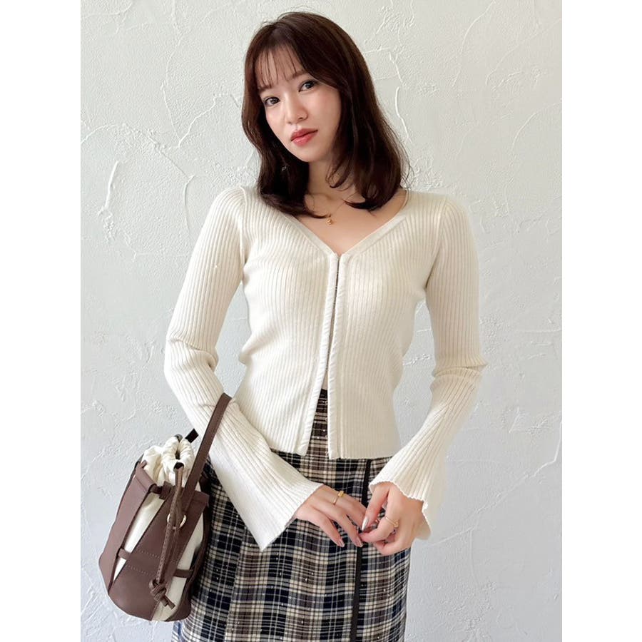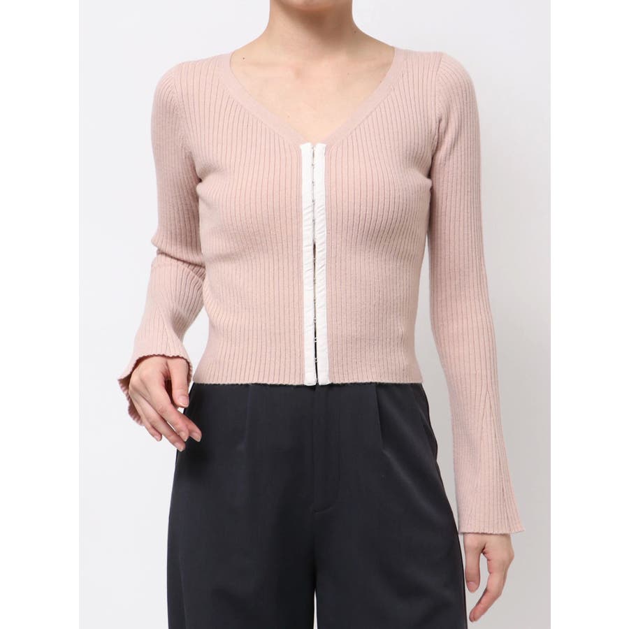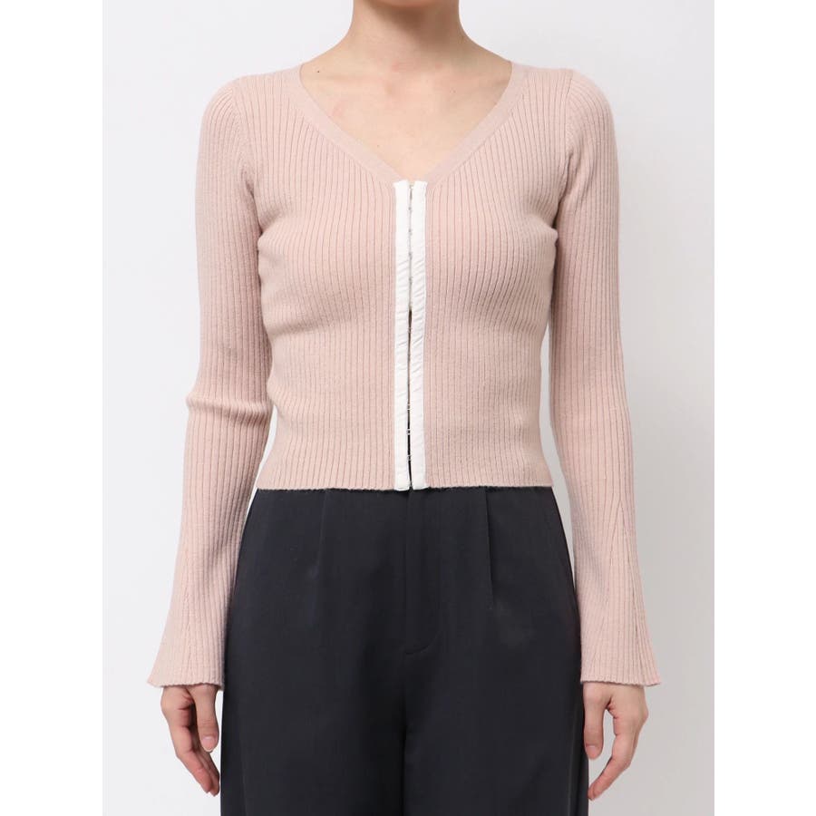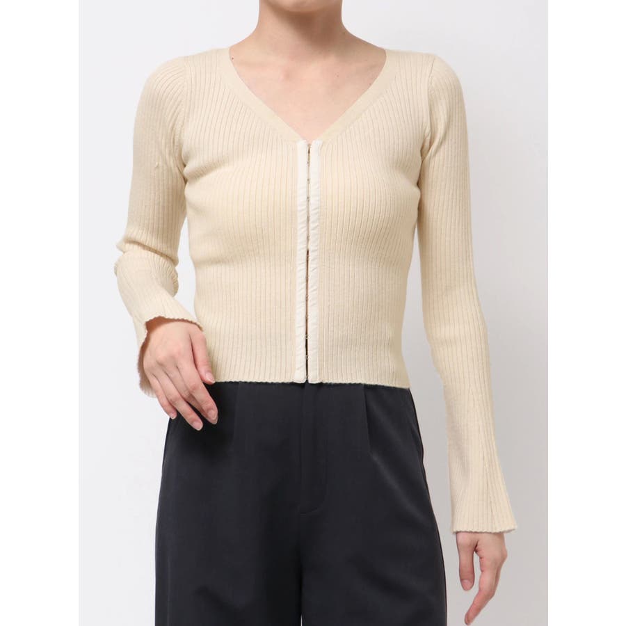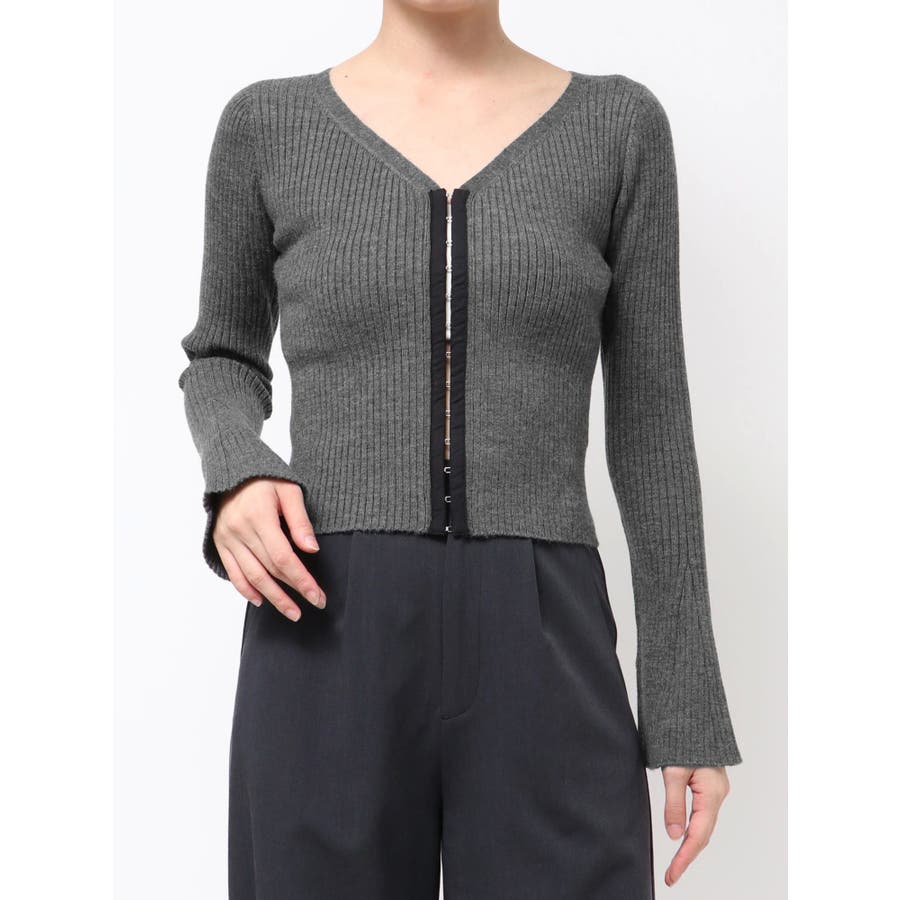 【商品】フロントにホックディテールをドッキングすることで古着ライクなエッジを効かせたニットカーデトップス。ハートネックライクな衿ぐりにウエストをフィットさせ、コルセット調のシルエットで女性らしく仕上げました。【スタイリング】インナーは、シャツやブラウスをレイヤードさせて軽やかに見せるのが今季ポイント。裾はアウトでホックを開けて、アンニュイに、こなれ感のあるスタイリングがおすすめです。※実際にお届けする商品と仕様やサイズが異なる場合がございます。また生産の都合上、お届け時期が前後する場合がございます。【商品特徴】透け感:なし伸縮性:あり生地の厚さ:普通サイズ感:普通裏地:なしポケット:なし