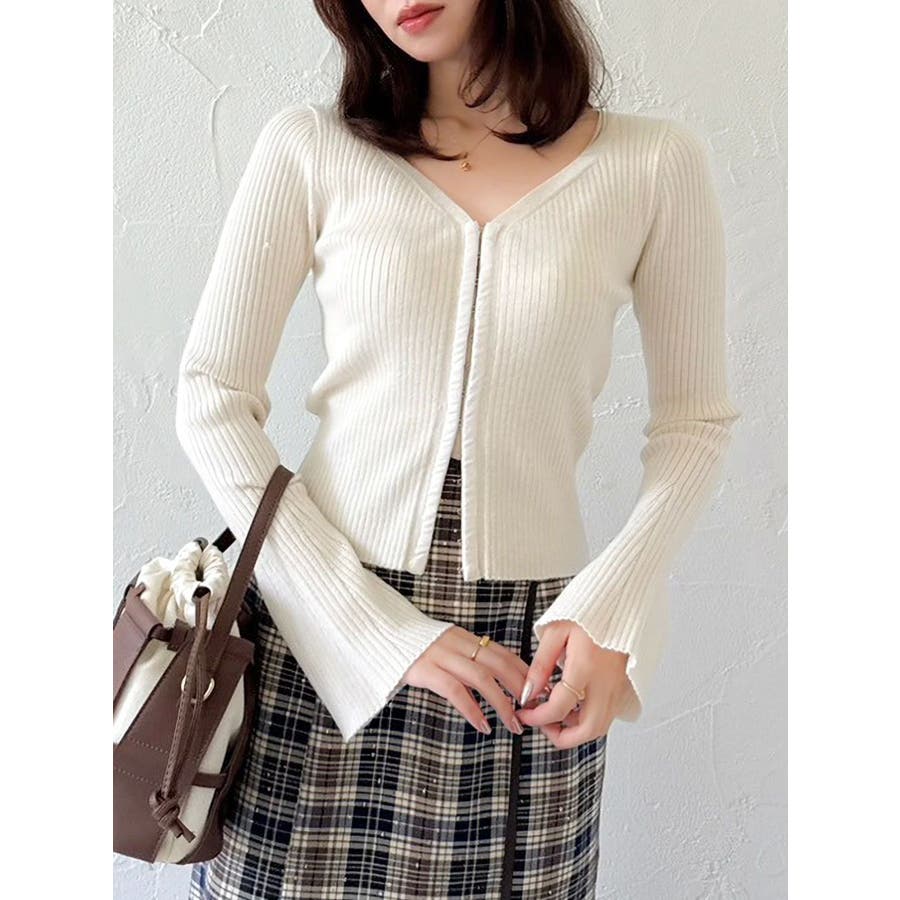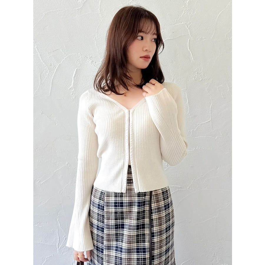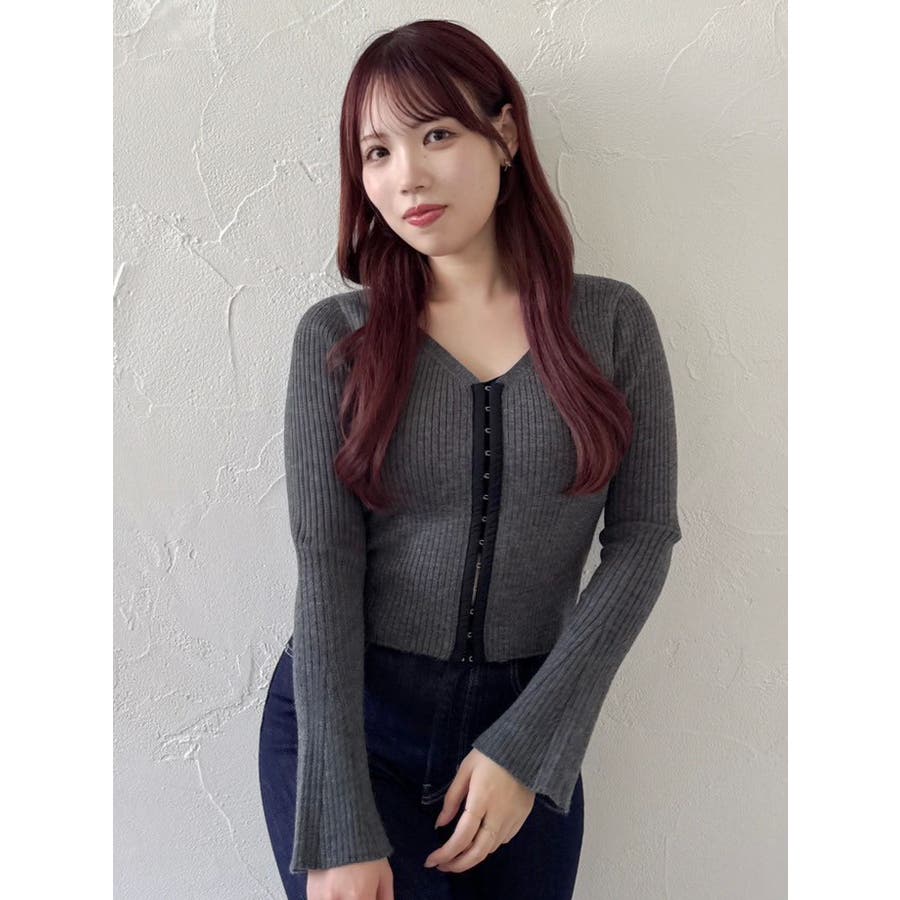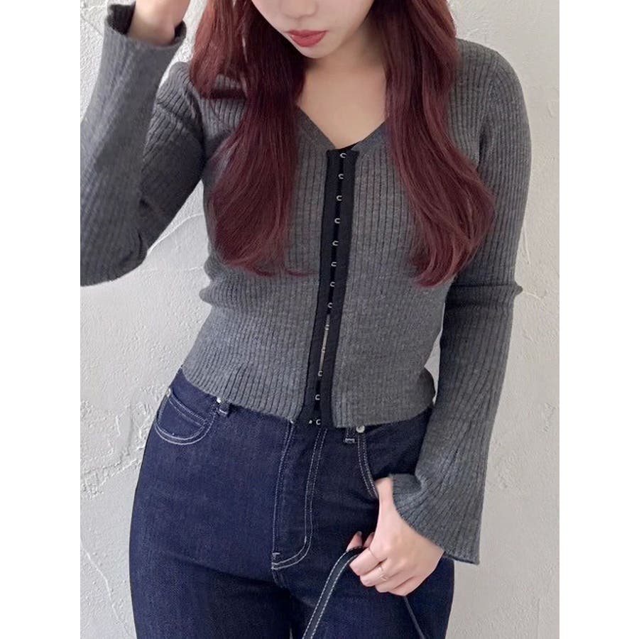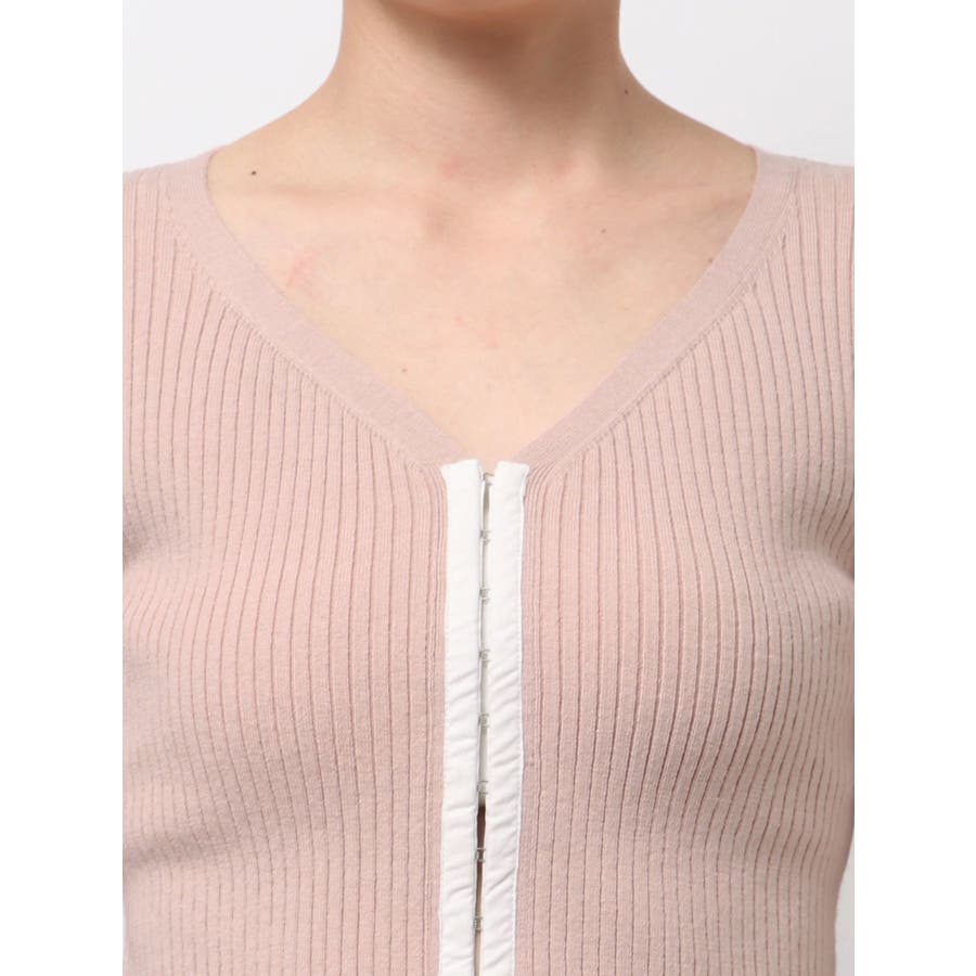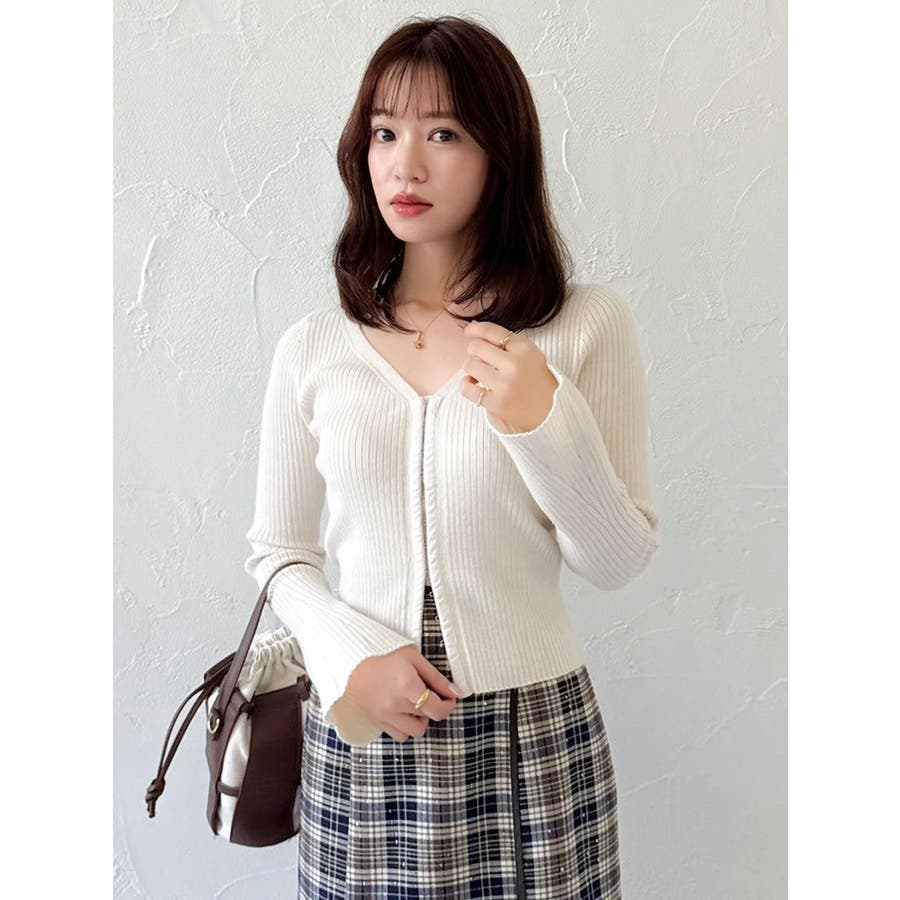 【商品】フロントにホックディテールをドッキングすることで古着ライクなエッジを効かせたニットカーデトップス。ハートネックライクな衿ぐりにウエストをフィットさせ、コルセット調のシルエットで女性らしく仕上げました。【スタイリング】インナーは、シャツやブラウスをレイヤードさせて軽やかに見せるのが今季ポイント。裾はアウトでホックを開けて、アンニュイに、こなれ感のあるスタイリングがおすすめです。※実際にお届けする商品と仕様やサイズが異なる場合がございます。また生産の都合上、お届け時期が前後する場合がございます。【商品特徴】透け感:なし伸縮性:あり生地の厚さ:普通サイズ感:普通裏地:なしポケット:なし