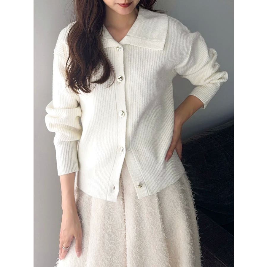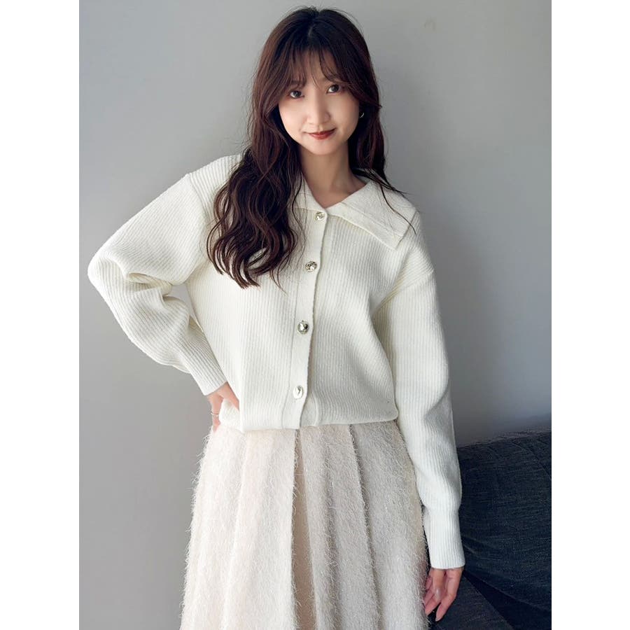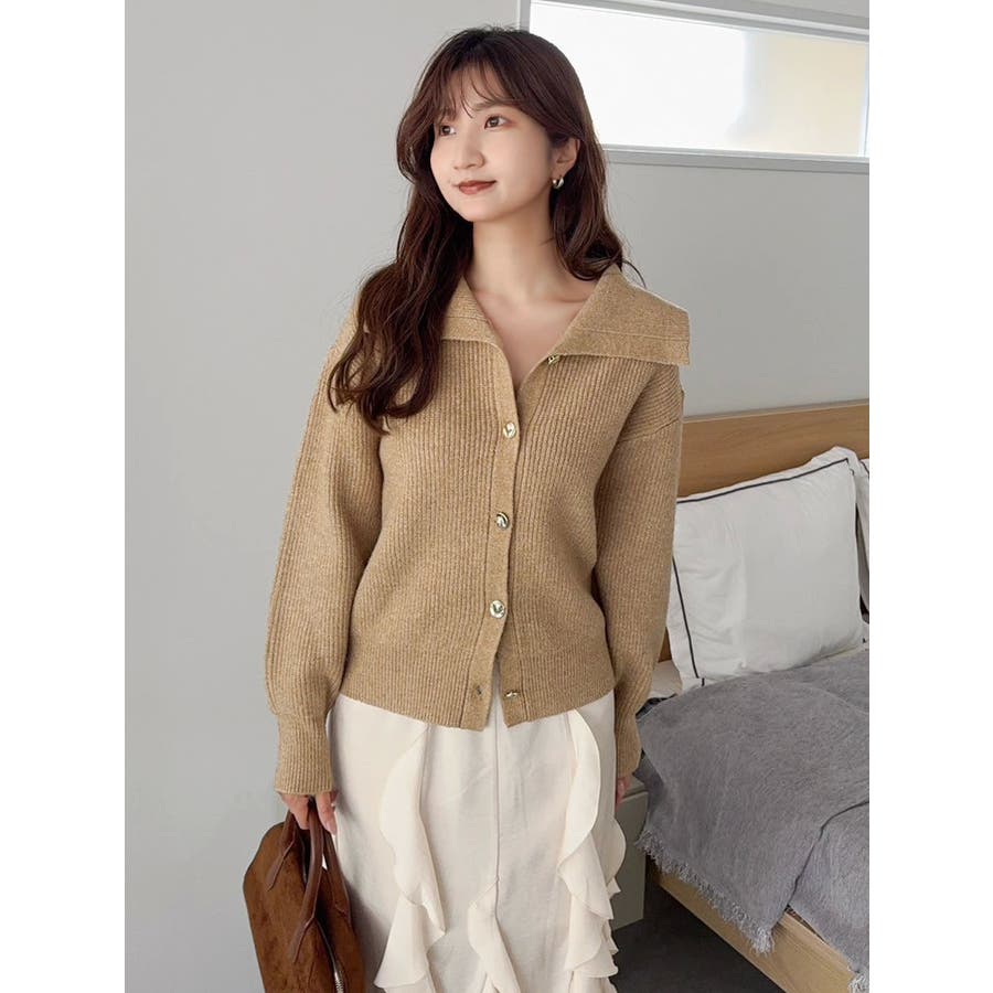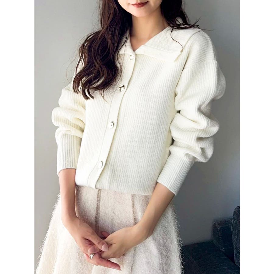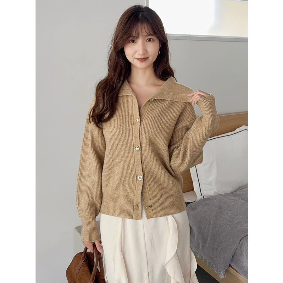 【商品】トレンド感溢れるビッグカラーが目を惹くニットカーディガン。柔らかな起毛感ある糸で着心地も抜群。程よい厚みがあり、ロングシーズン活躍します。小顔効果も高く、シンプルながらも存在感のある一枚。袖口と裾にはリブを施し、シルエットにメリハリを持たせています。【スタイリング】1枚で主役級のデザインなので、ボトムはシンプルにまとめるのがおすすめ。デニムと合わせてカジュアルダウンすれば、甘すぎない大人フェミニンスタイルに。ミニスカートやワイドパンツと合わせれば、トレンド感のあるバランスコーデが完成。羽織りとしても、トップスとしても使える万能アイテムで、着回し力も抜群です。※実際にお届けする商品と仕様やサイズが異なる場合がございます。 また生産の都合上、お届け時期が前後する場合がございます。【商品特徴】透け感:なし伸縮性:あり生地の厚さ:普通サイズ感:普通裏地:なしポケット:なし