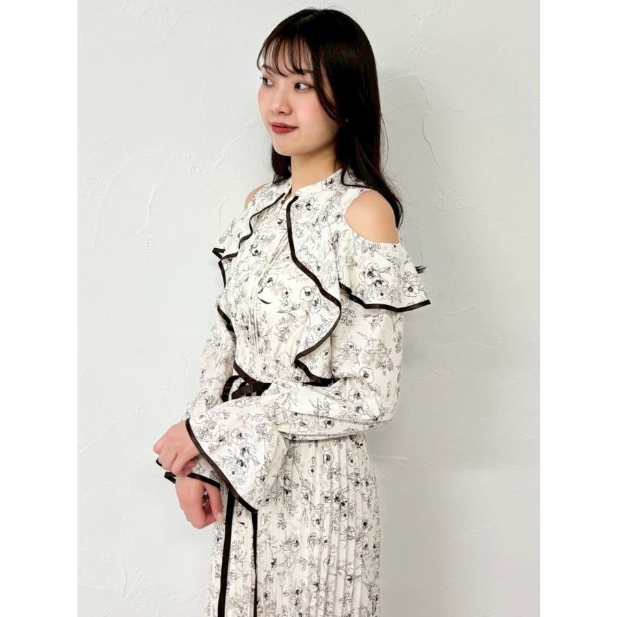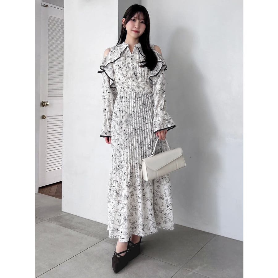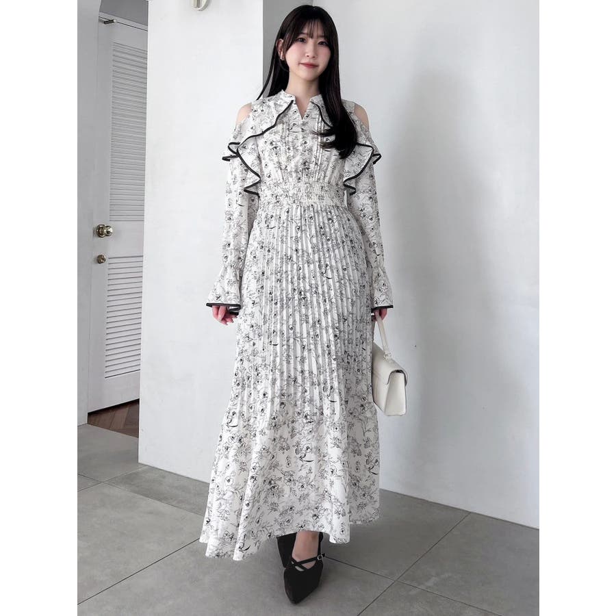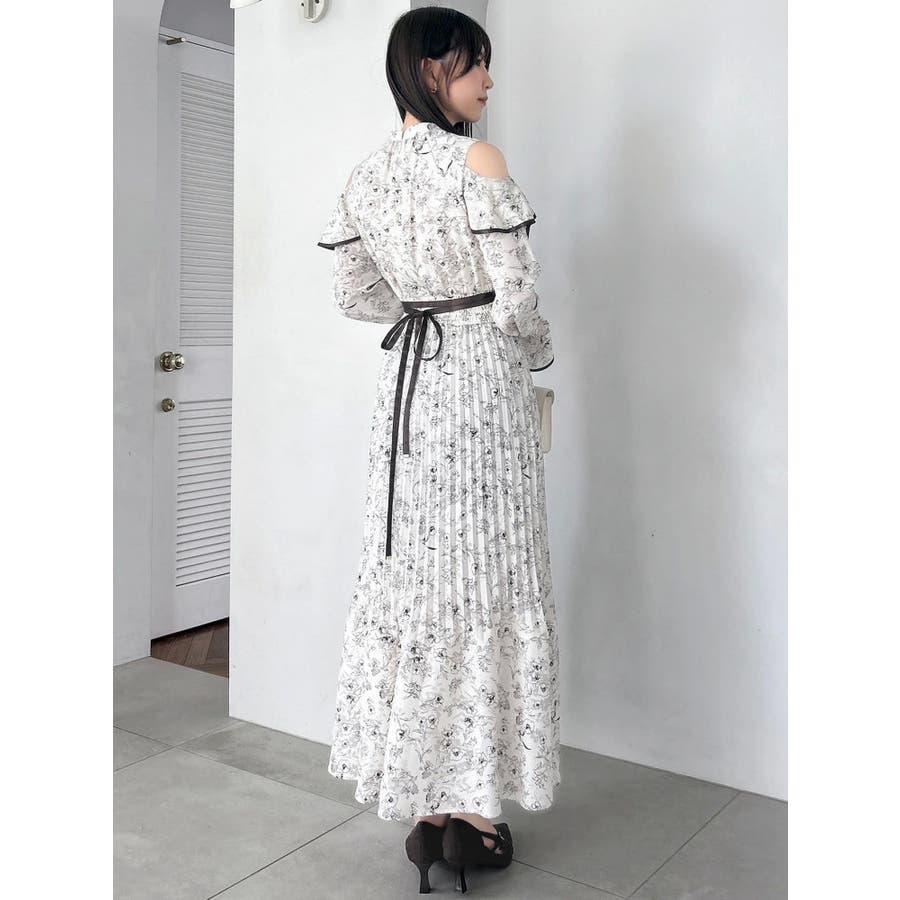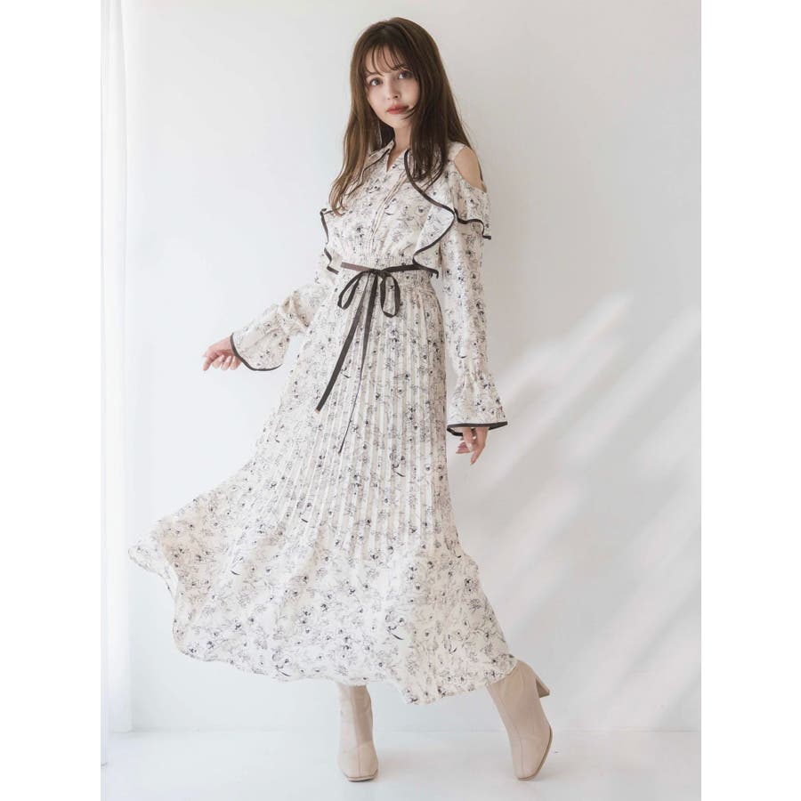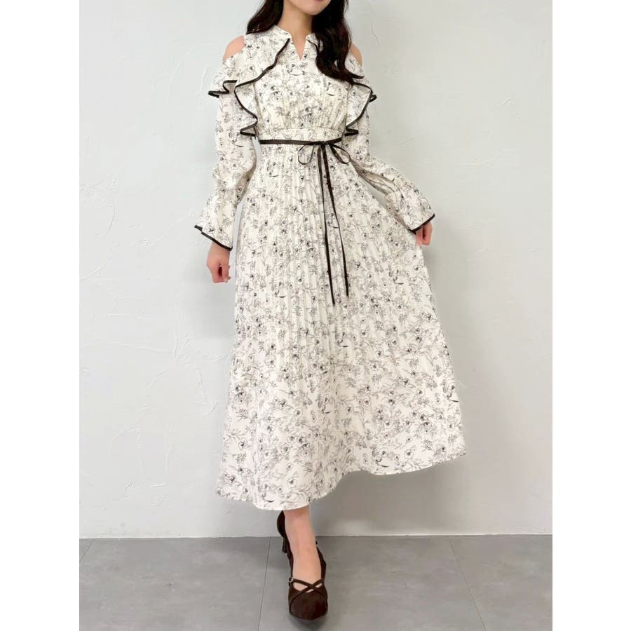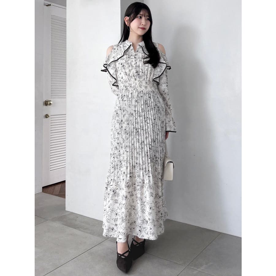 オープンショルダーフラワープリーツワンピース