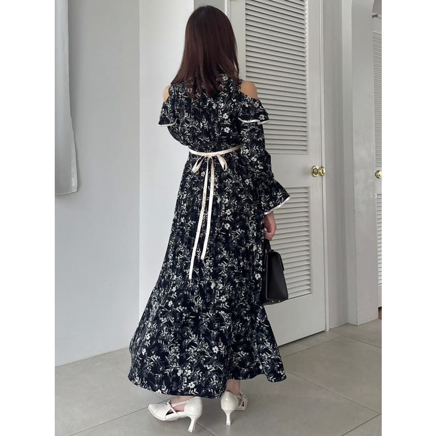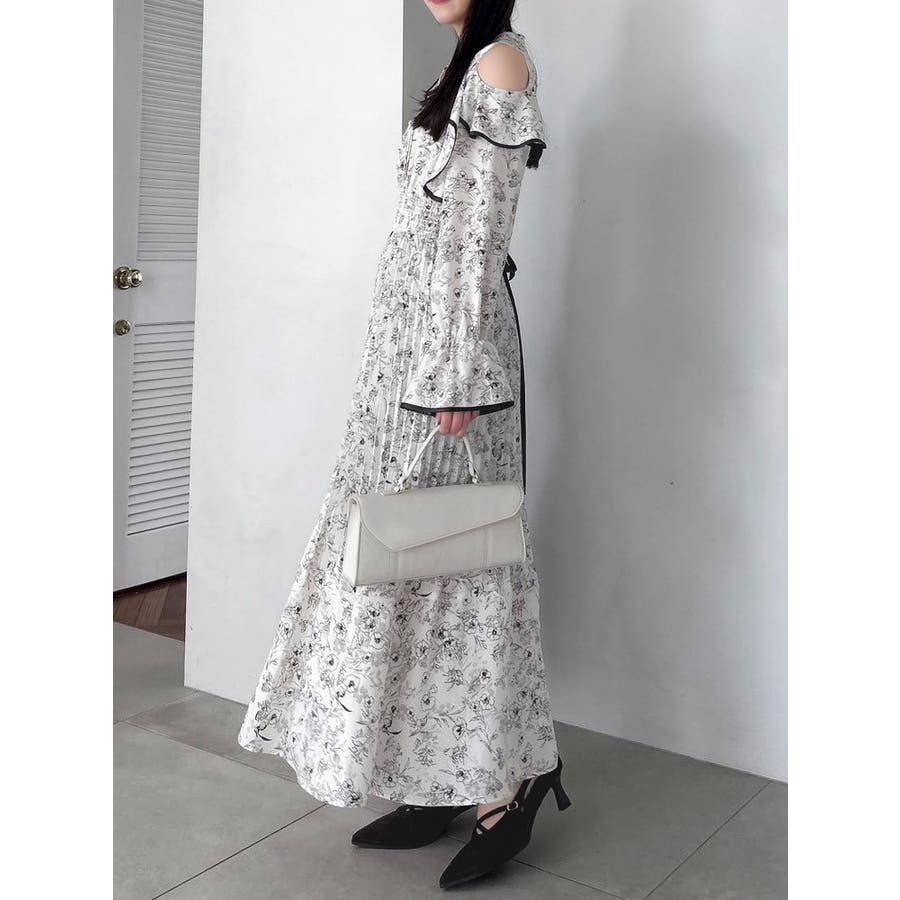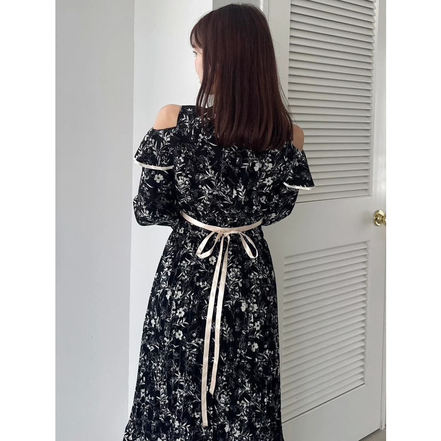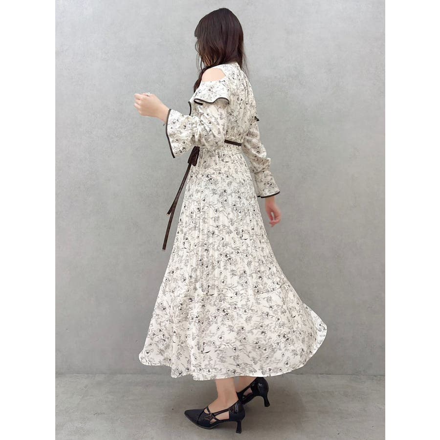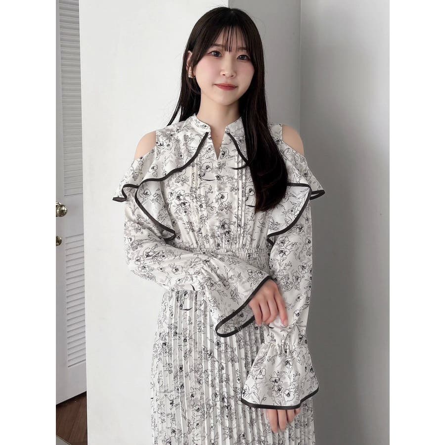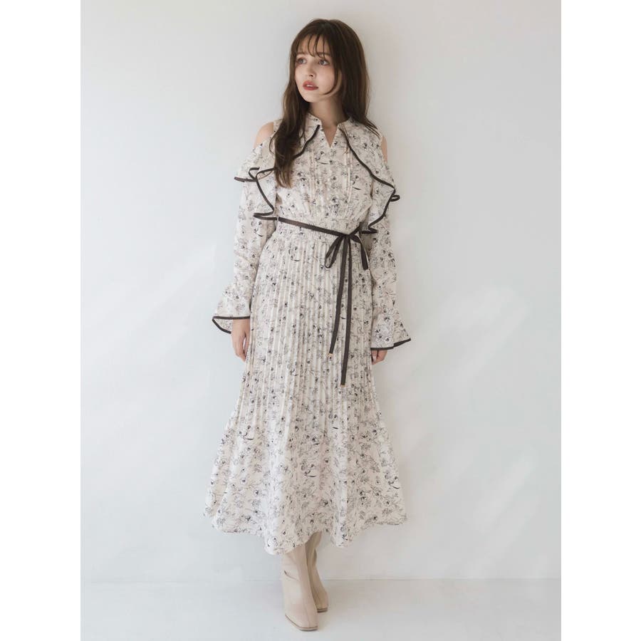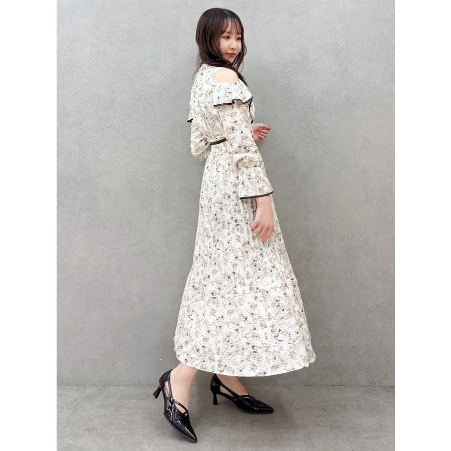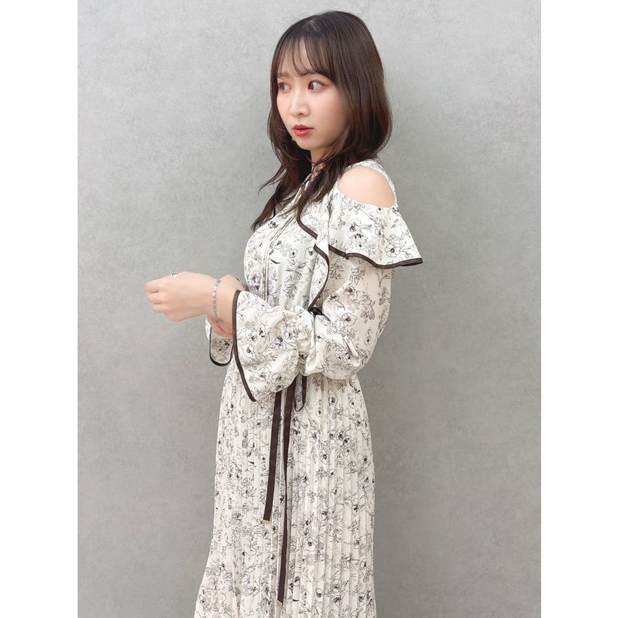 オープンショルダーフラワープリーツワンピース