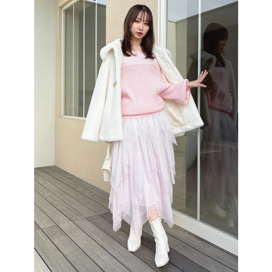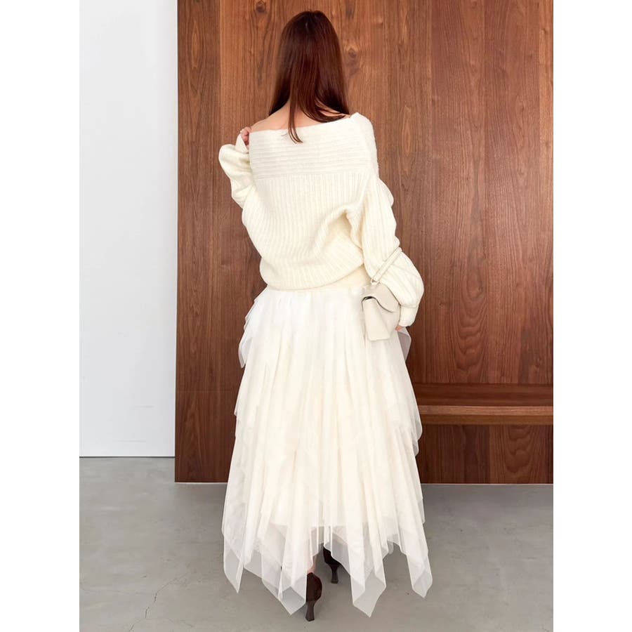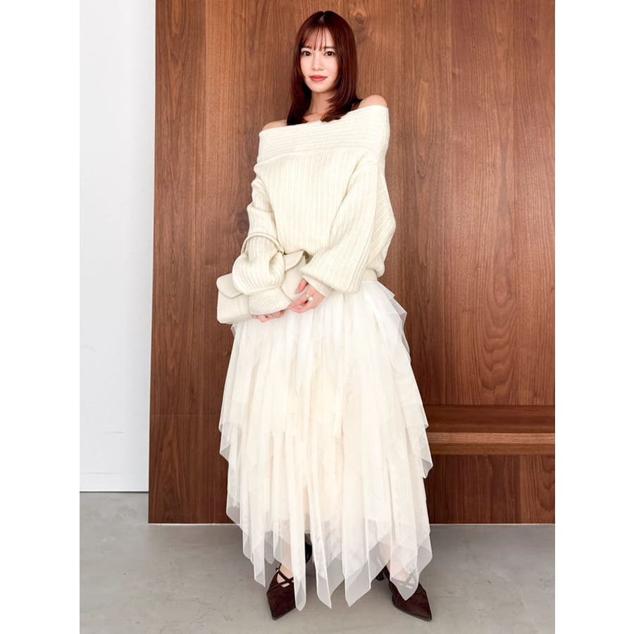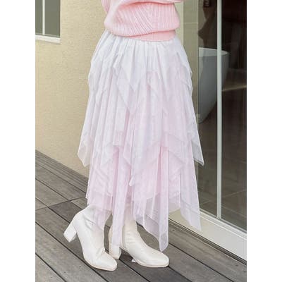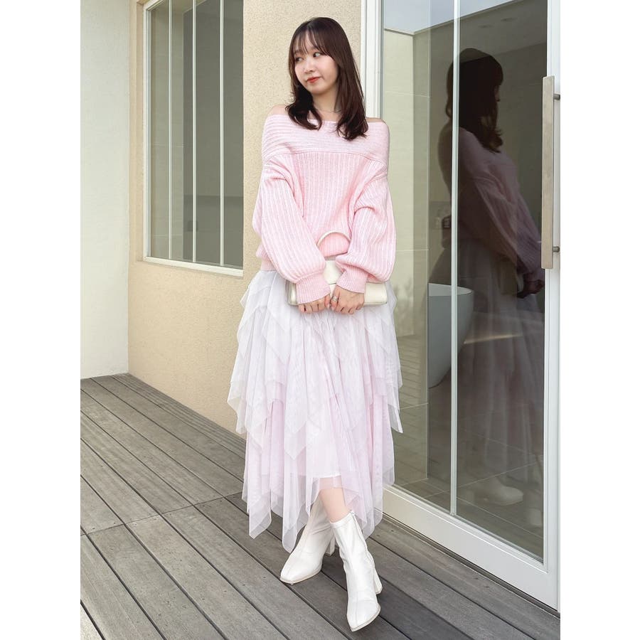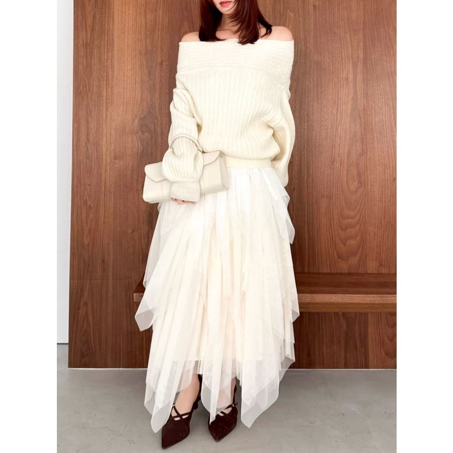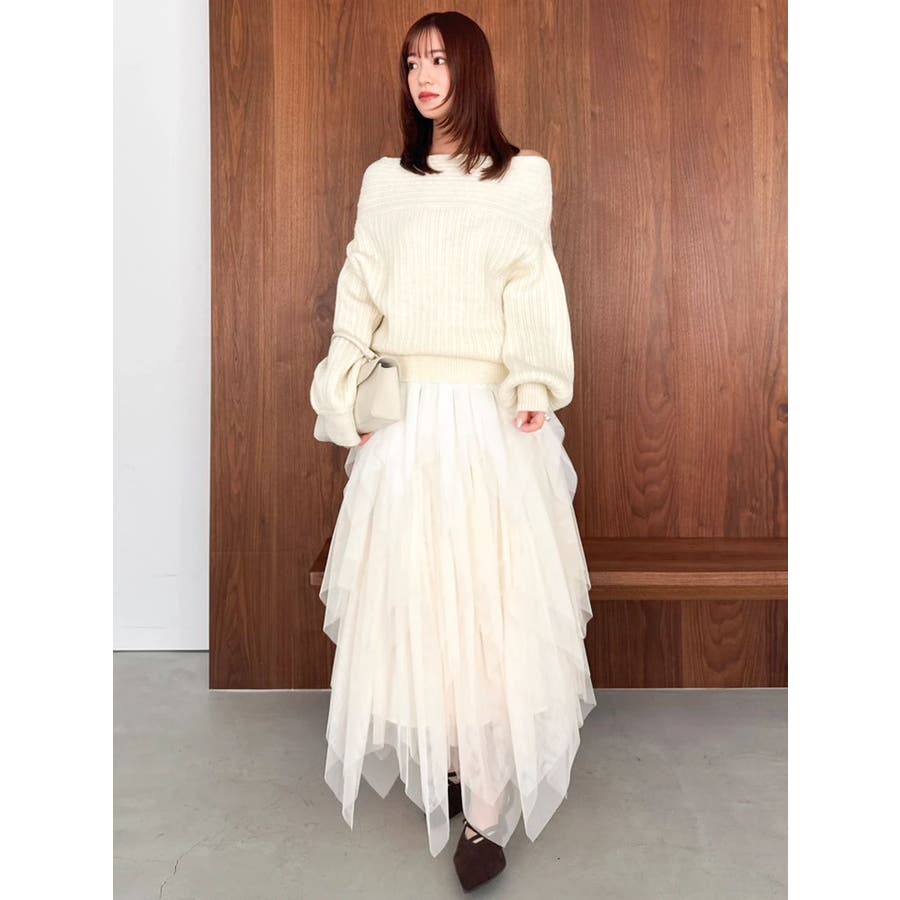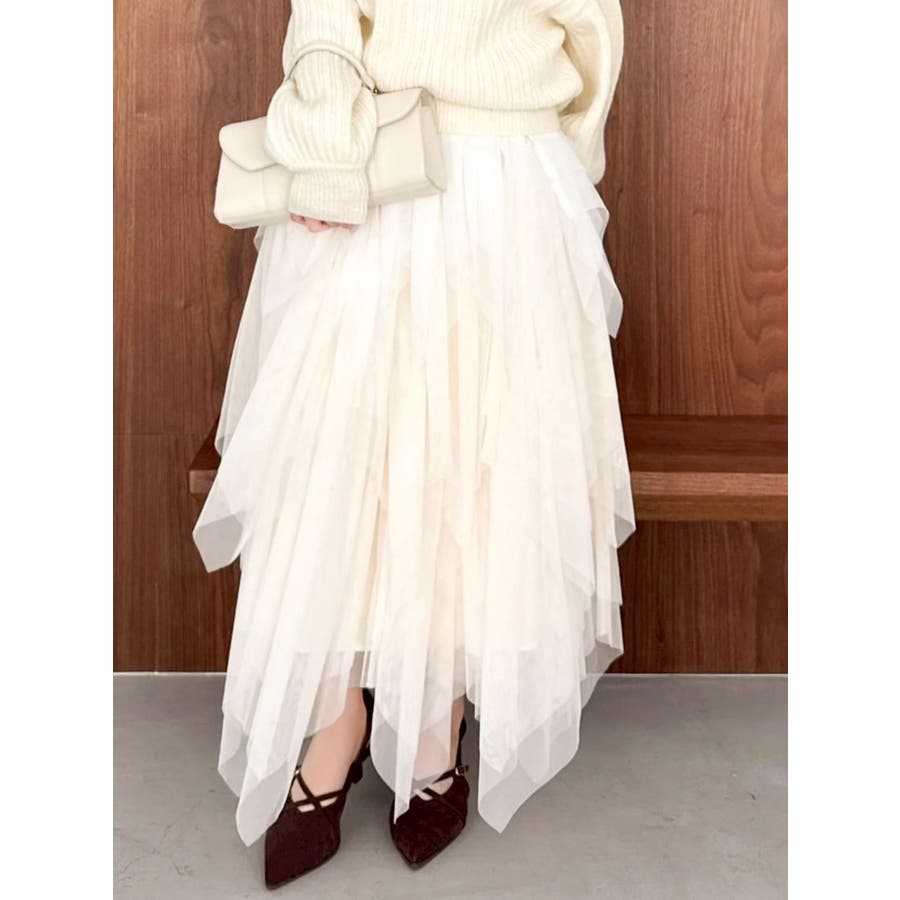 【商品】裾に向かって美しく広がる、ボリュームたっぷりのヘムティアードチュールスカート。繊細なチュールを3段重ねにティアードしたデザインで、上から下へと段々と色の濃さが変化するグラデーション風の仕上がりが、他にはない幻想的な存在感を放ちます。動くたびにふんわり揺れる柔らかなチュールが、ロマンチックで夢見心地なムードを演出し、女性らしさと可愛さを兼ね備えた1着に仕上がっています。【スタイリング】毛足感のあるニットトップスをアウトで合わせると、甘さを抑えた大人フェミニンな印象に。コンパクトなリブニットやツイードカーディガンと組み合わせれば、より可愛らしいスタイルに仕上がります。足元はショートブーツでトレンド感を、スニーカーならカジュアルで愛らしい雰囲気が楽しめます。※実際にお届けする商品と仕様やサイズが異なる場合がございます。また生産の都合上、お届け時期が前後する場合がございます。【商品特徴】透け感:あり伸縮性:なし生地の厚さ:薄手サイズ感:普通裏地:ありポケット:なし