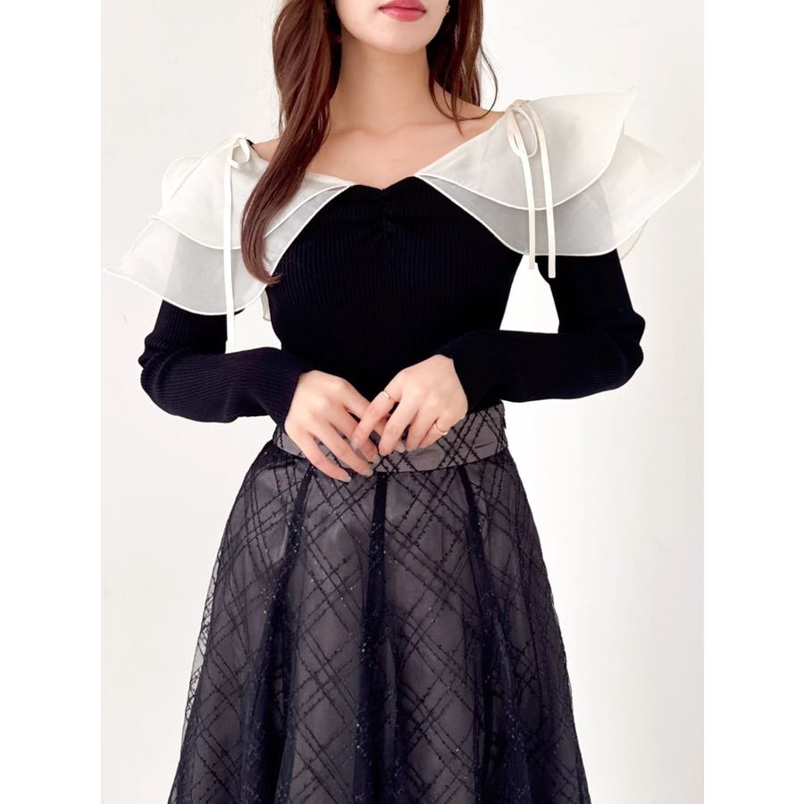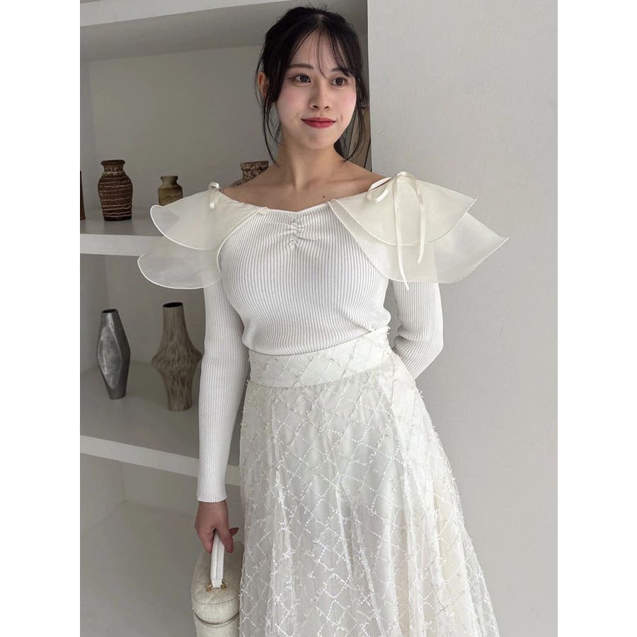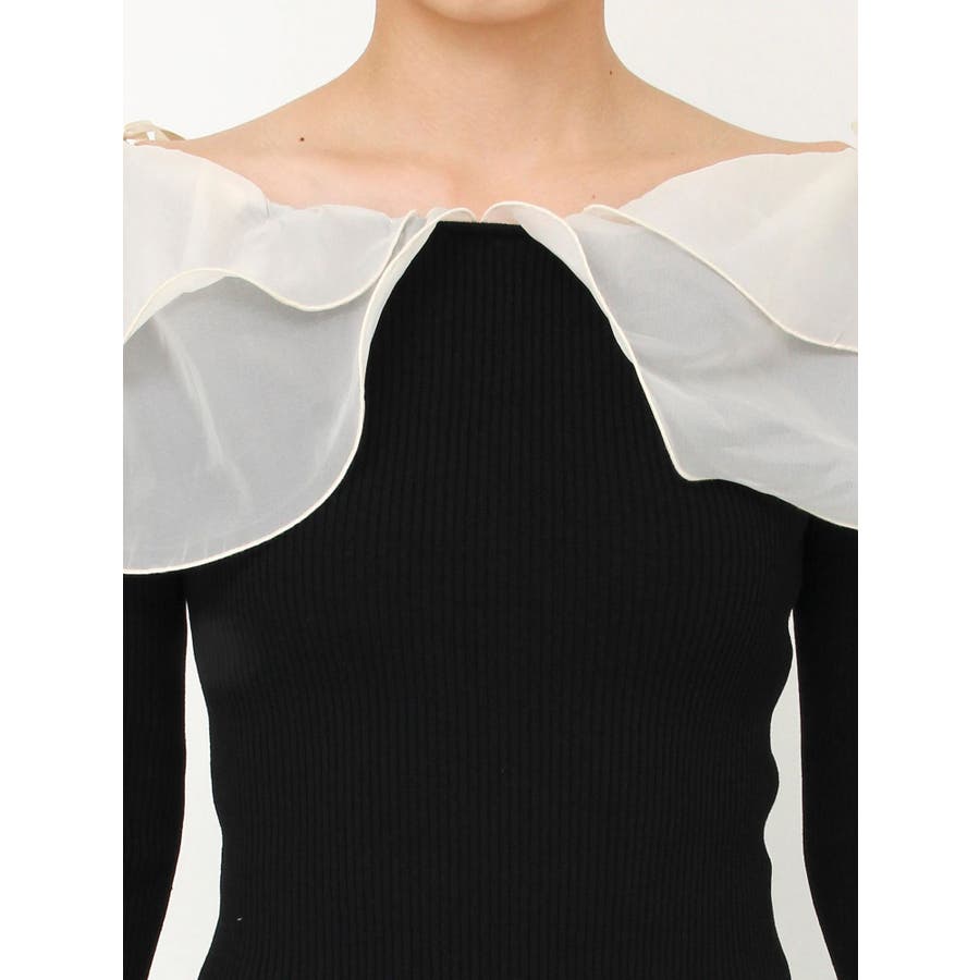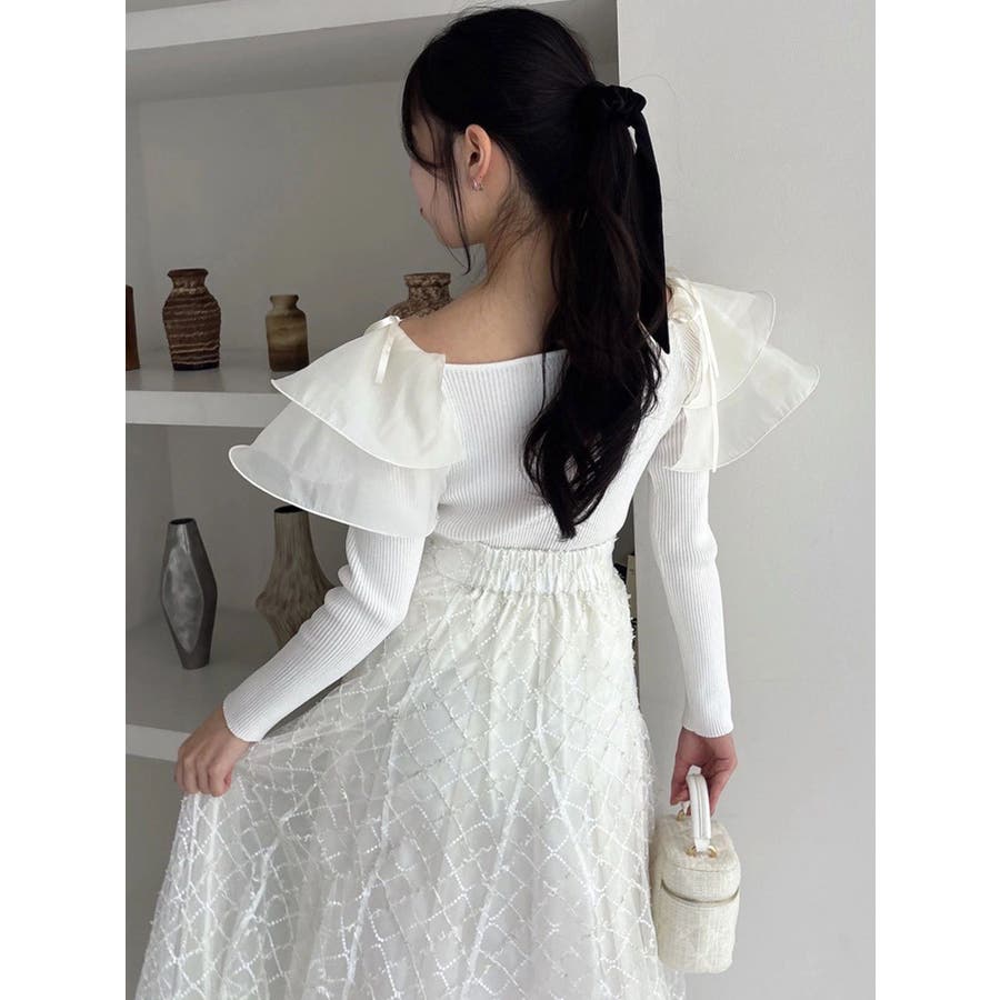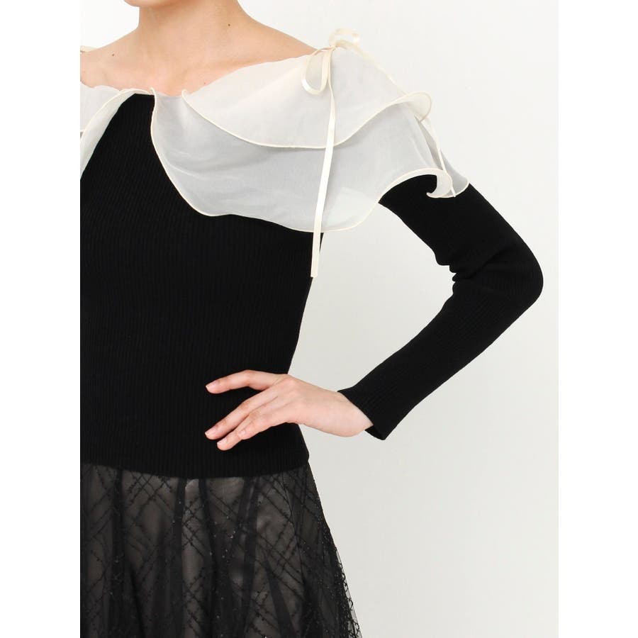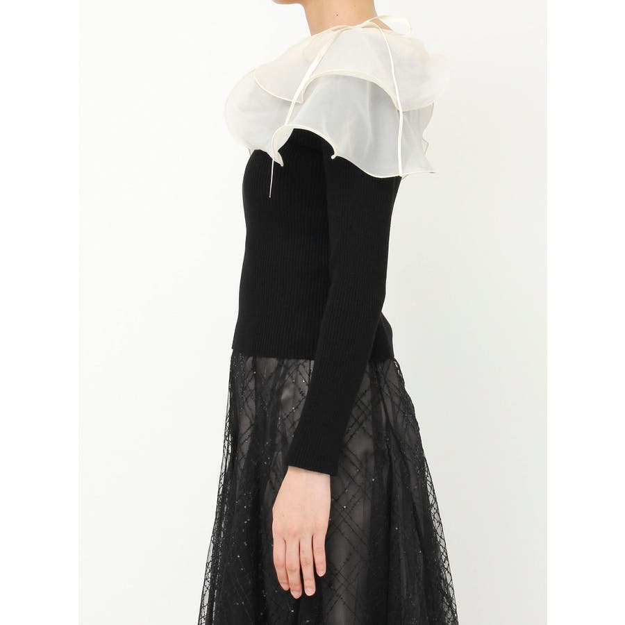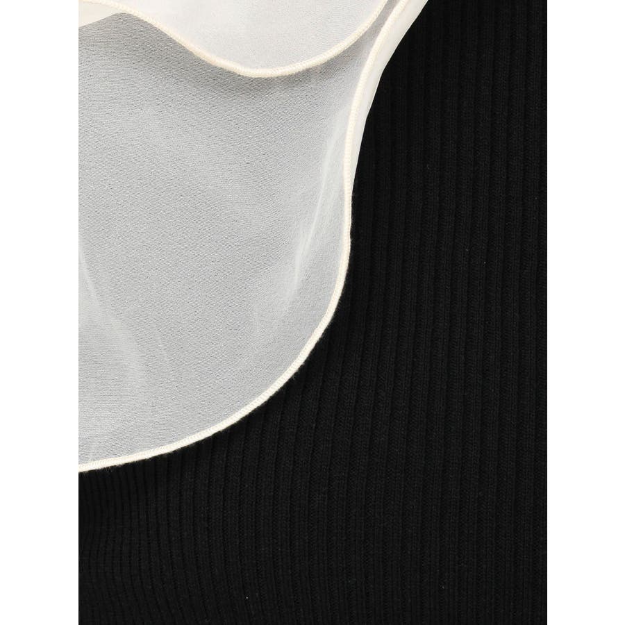 【商品】リブ編みでボディラインを引き締め、立体感のあるラッフルフリルを大胆に重ねたフェミニンニット。デコルテ~肩まわりをふんわり包むフリルが、二の腕をさりげなくカバーしつつ華奢見えを叶えてくれます。シアーの素材も軽やかで風が舞ったような軽やかなデザインがポイントです。【スタイリング】意匠素材スカートは勿論、今季トレンドのトレンチスカートなどもおすすめです。ハイウエストデザインとの組み合わせは特に美しいドレスシルエットを叶えてくれます。 ※実際にお届けする商品と仕様やサイズが異なる場合がございます。また生産の都合上、お届け時期が前後する場合がございます。【商品特徴】透け感:なし伸縮性:あり生地の厚さ:薄手サイズ感:普通裏地:なしポケット:なし