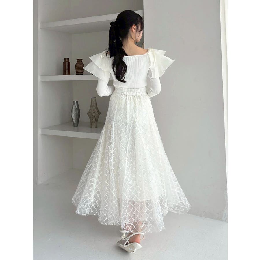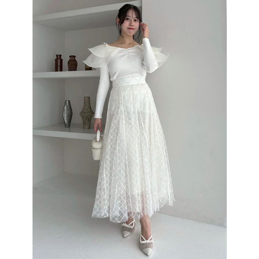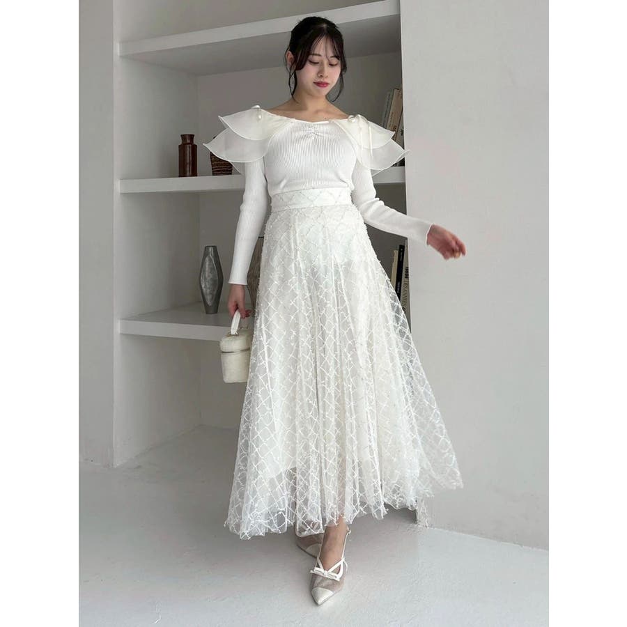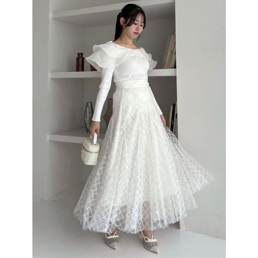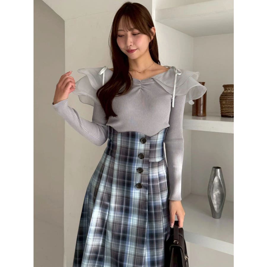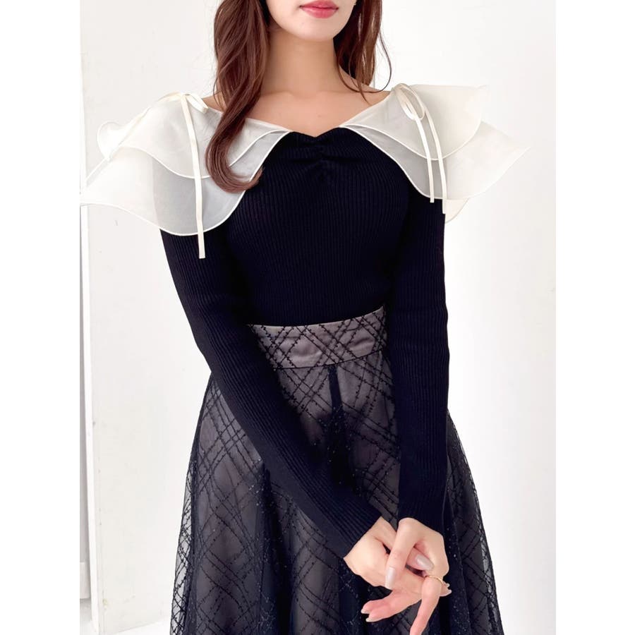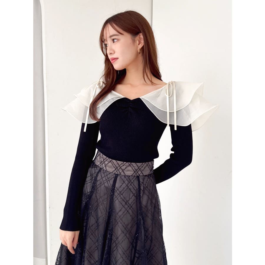 【商品】リブ編みでボディラインを引き締め、立体感のあるラッフルフリルを大胆に重ねたフェミニンニット。デコルテ~肩まわりをふんわり包むフリルが、二の腕をさりげなくカバーしつつ華奢見えを叶えてくれます。シアーの素材も軽やかで風が舞ったような軽やかなデザインがポイントです。【スタイリング】意匠素材スカートは勿論、今季トレンドのトレンチスカートなどもおすすめです。ハイウエストデザインとの組み合わせは特に美しいドレスシルエットを叶えてくれます。 ※実際にお届けする商品と仕様やサイズが異なる場合がございます。また生産の都合上、お届け時期が前後する場合がございます。【商品特徴】透け感:なし伸縮性:あり生地の厚さ:薄手サイズ感:普通裏地:なしポケット:なし