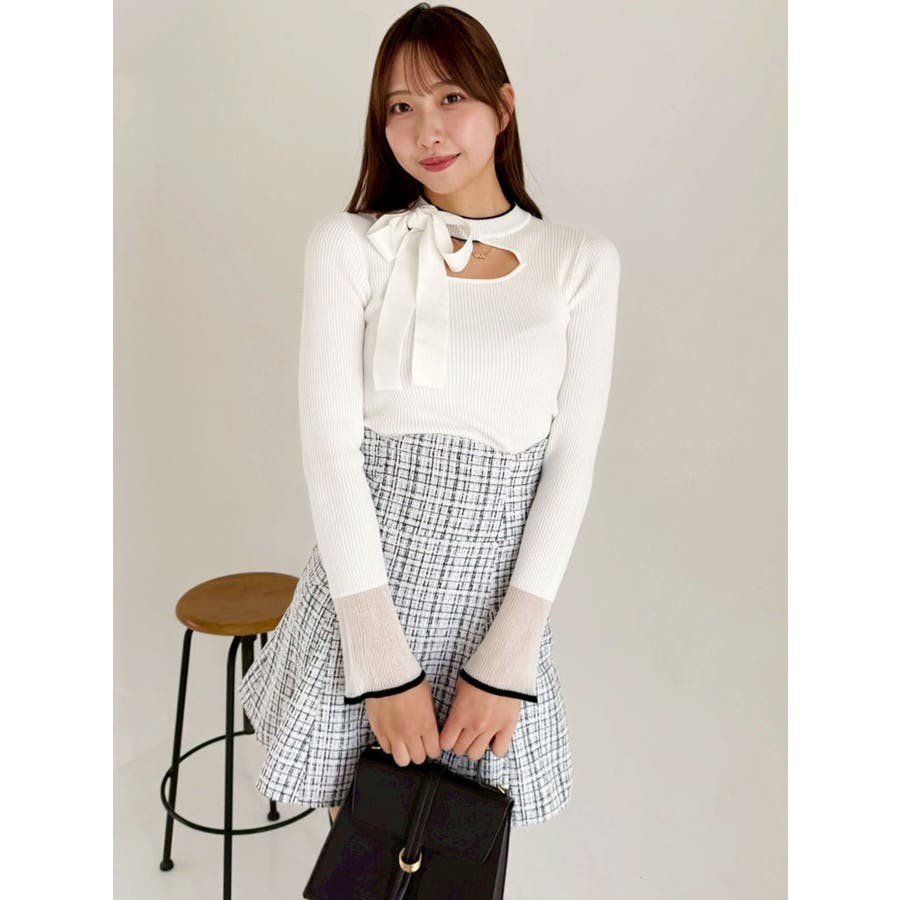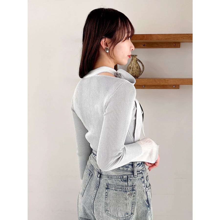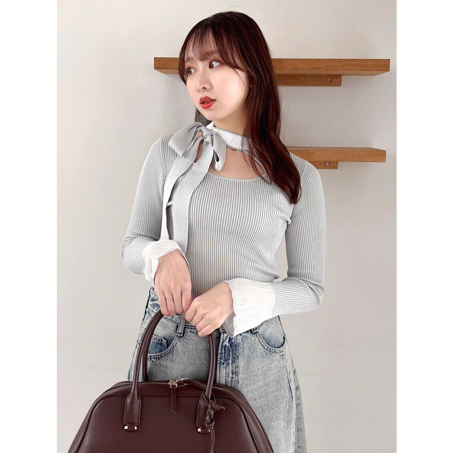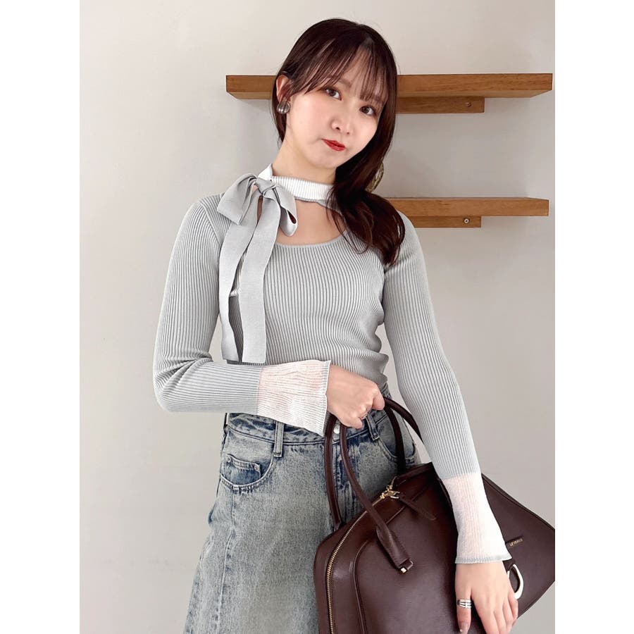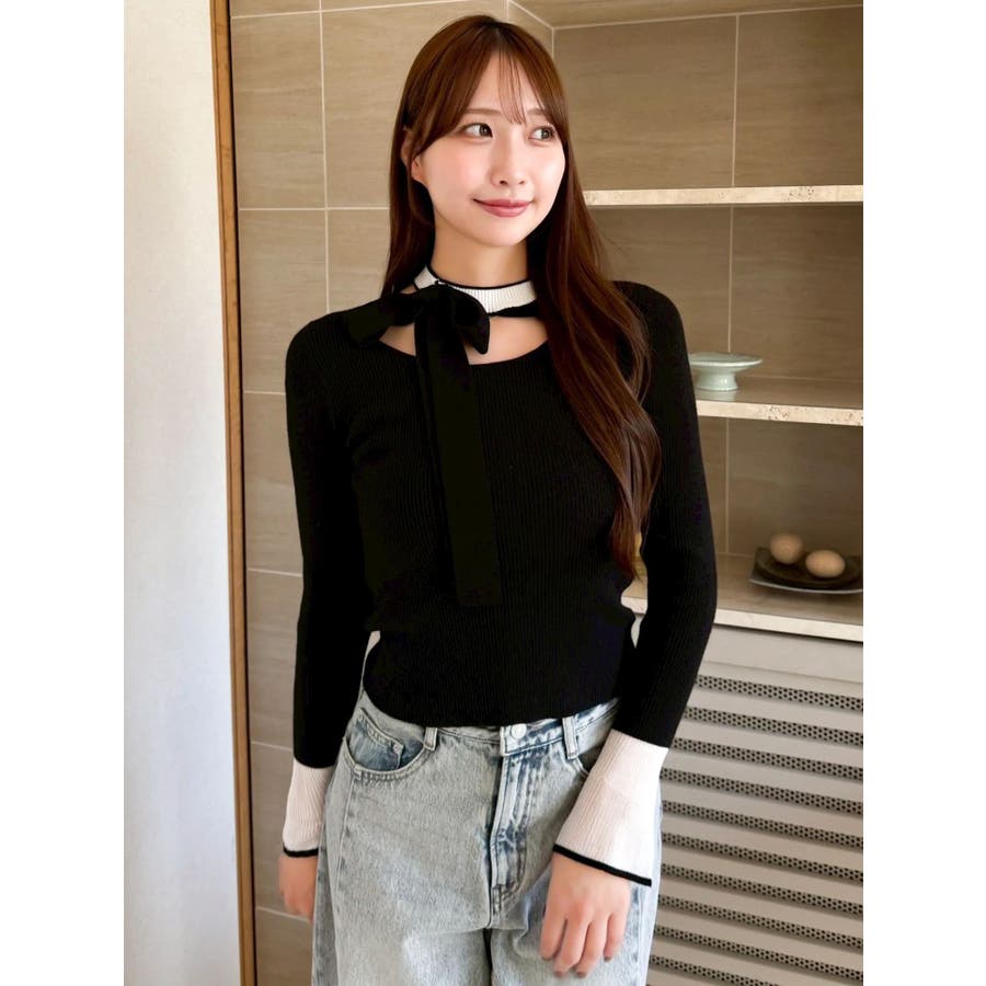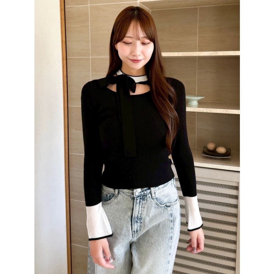 【商品】襟とカフスに配色デザインを効かせたニットトップス。襟元には華やかなビッグリボンをあしらい、顔まわりを印象的に見せてくれます。袖口は透け感のあるシアー素材で切り替え、女性らしさをプラス。程よくフィットするリブ編みで、すっきり見えしながらも着心地は快適です。 【スタイリング】ロングフレアスカートを合わせれば、上品でフェミニンな着こなしに。アウターはウールジャケットやロングコートで、上品な大人コーディネートが完成します。※実際にお届けする商品と仕様やサイズが異なる場合がございます。また生産の都合上、お届け時期が前後する場合がございます。【商品特徴】透け感:(アイボリー)あり透け感:(その他カラー) なし伸縮性:あり生地の厚さ:普通サイズ感:細身裏地:なしポケット:なし