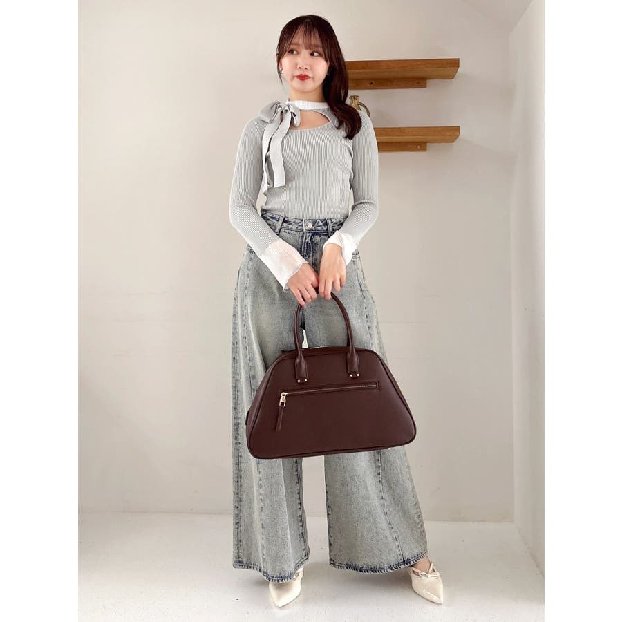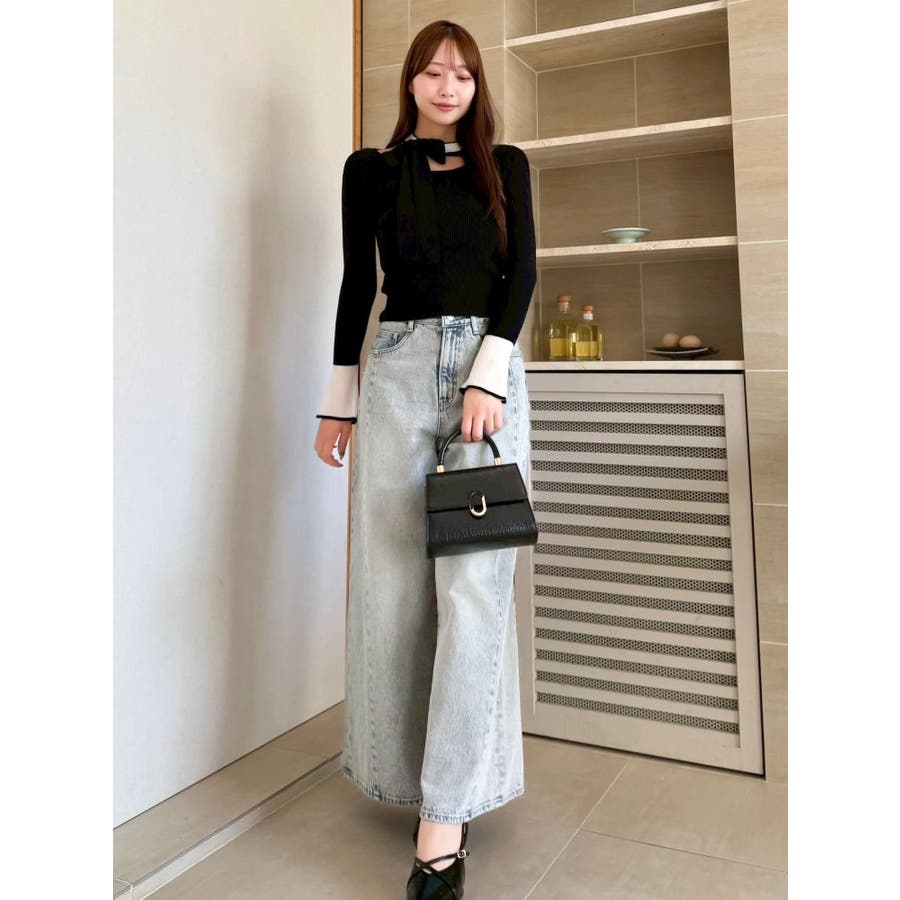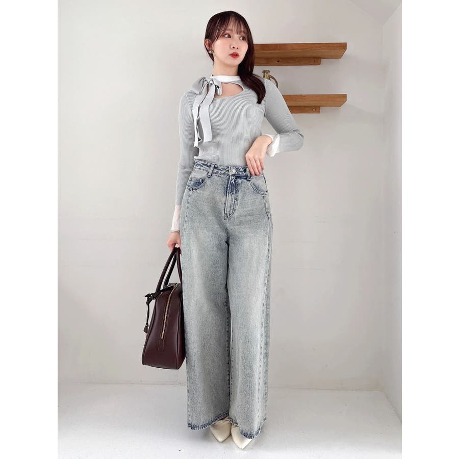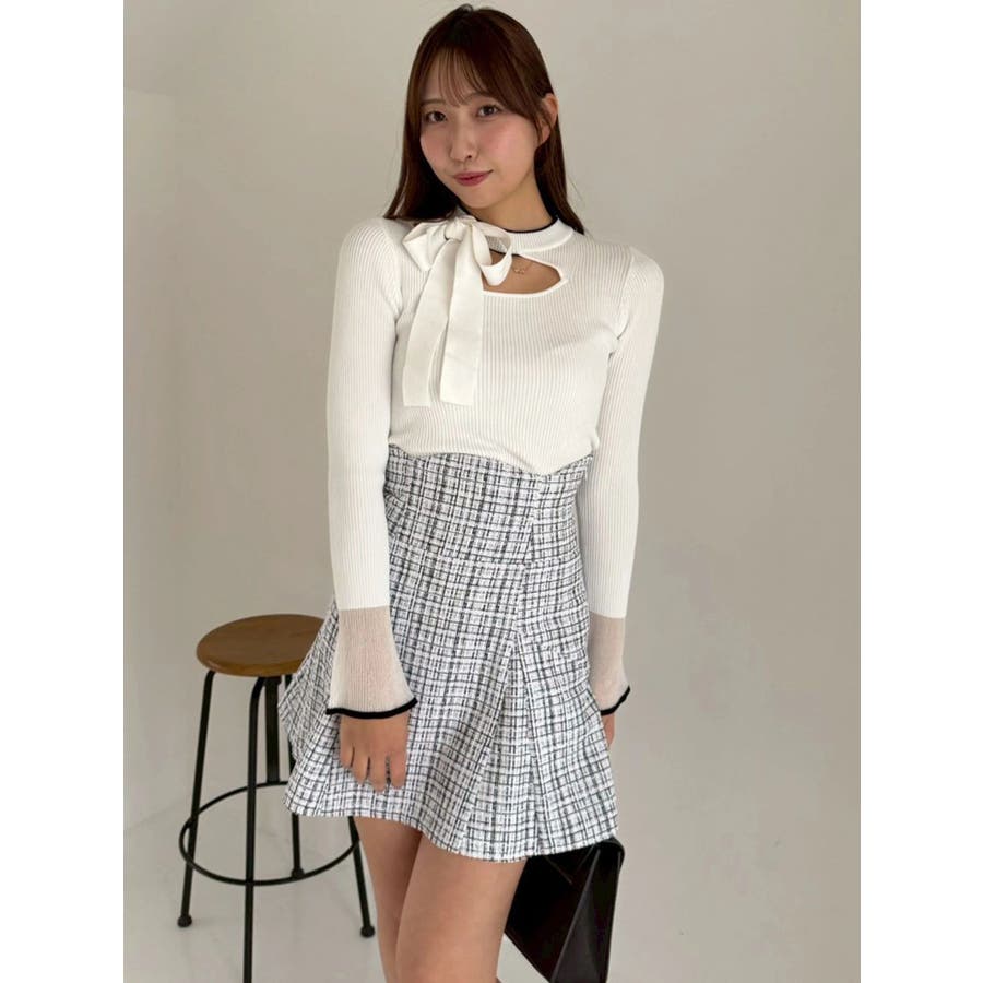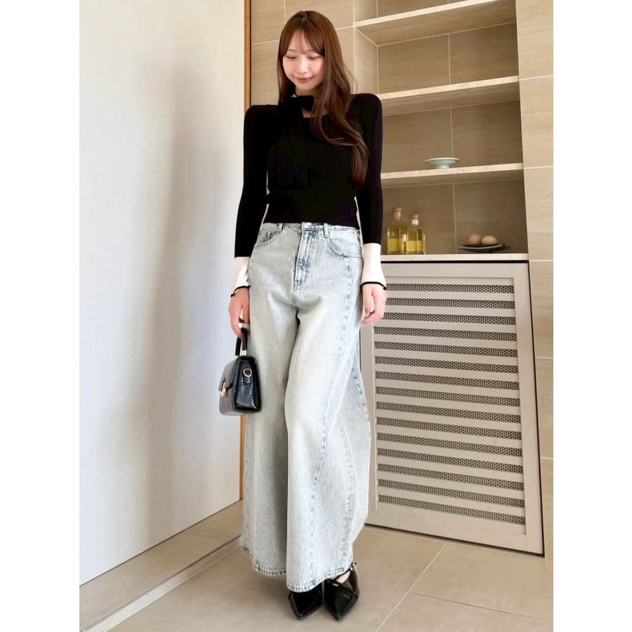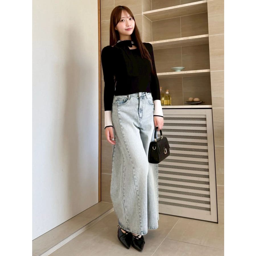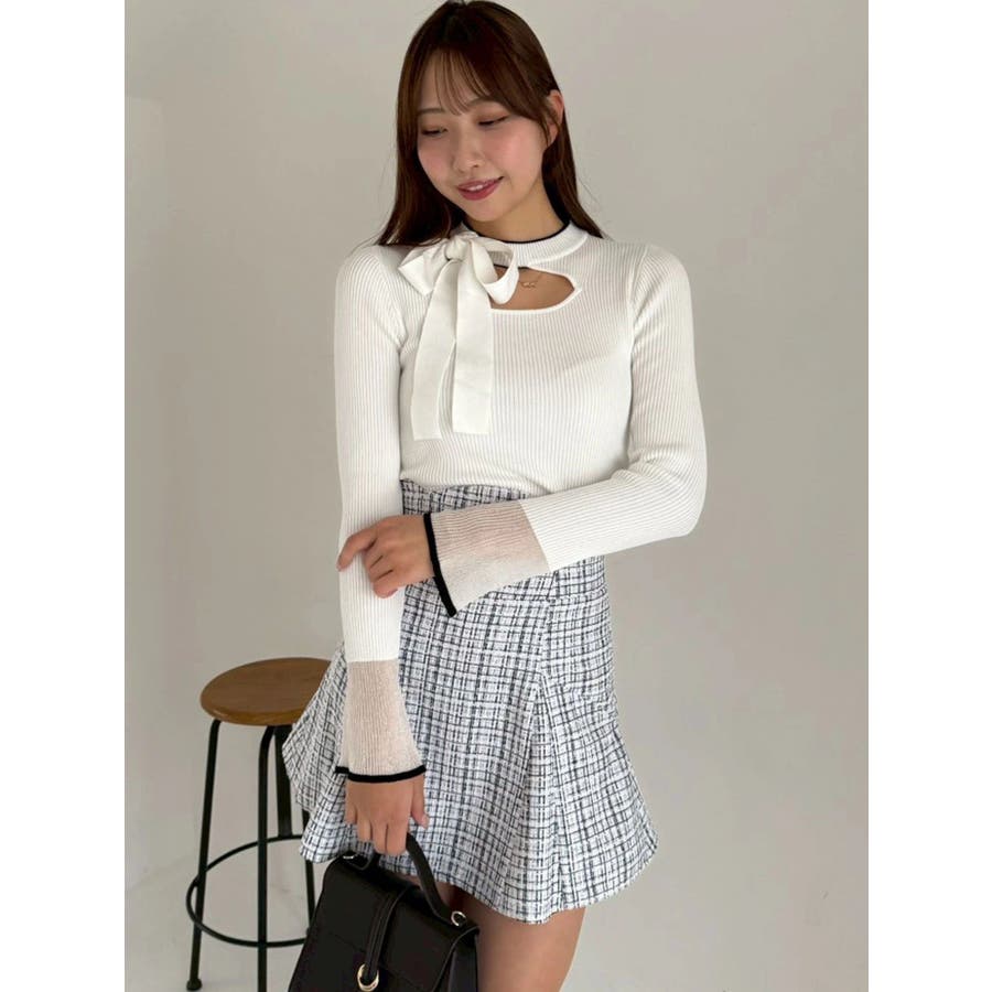 【商品】襟とカフスに配色デザインを効かせたニットトップス。襟元には華やかなビッグリボンをあしらい、顔まわりを印象的に見せてくれます。袖口は透け感のあるシアー素材で切り替え、女性らしさをプラス。程よくフィットするリブ編みで、すっきり見えしながらも着心地は快適です。 【スタイリング】ロングフレアスカートを合わせれば、上品でフェミニンな着こなしに。アウターはウールジャケットやロングコートで、上品な大人コーディネートが完成します。※実際にお届けする商品と仕様やサイズが異なる場合がございます。また生産の都合上、お届け時期が前後する場合がございます。【商品特徴】透け感:(アイボリー)あり透け感:(その他カラー) なし伸縮性:あり生地の厚さ:普通サイズ感:細身裏地:なしポケット:なし